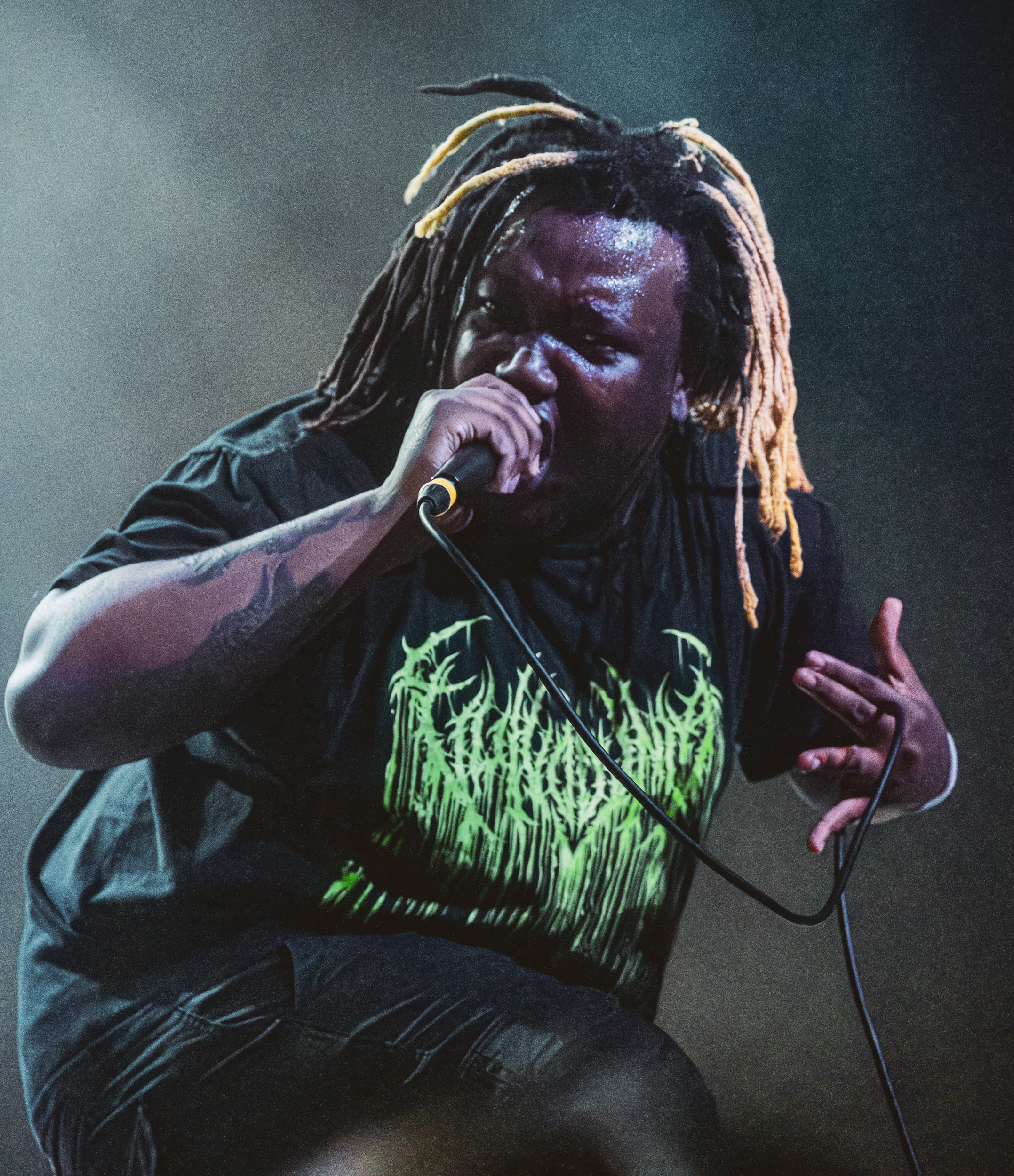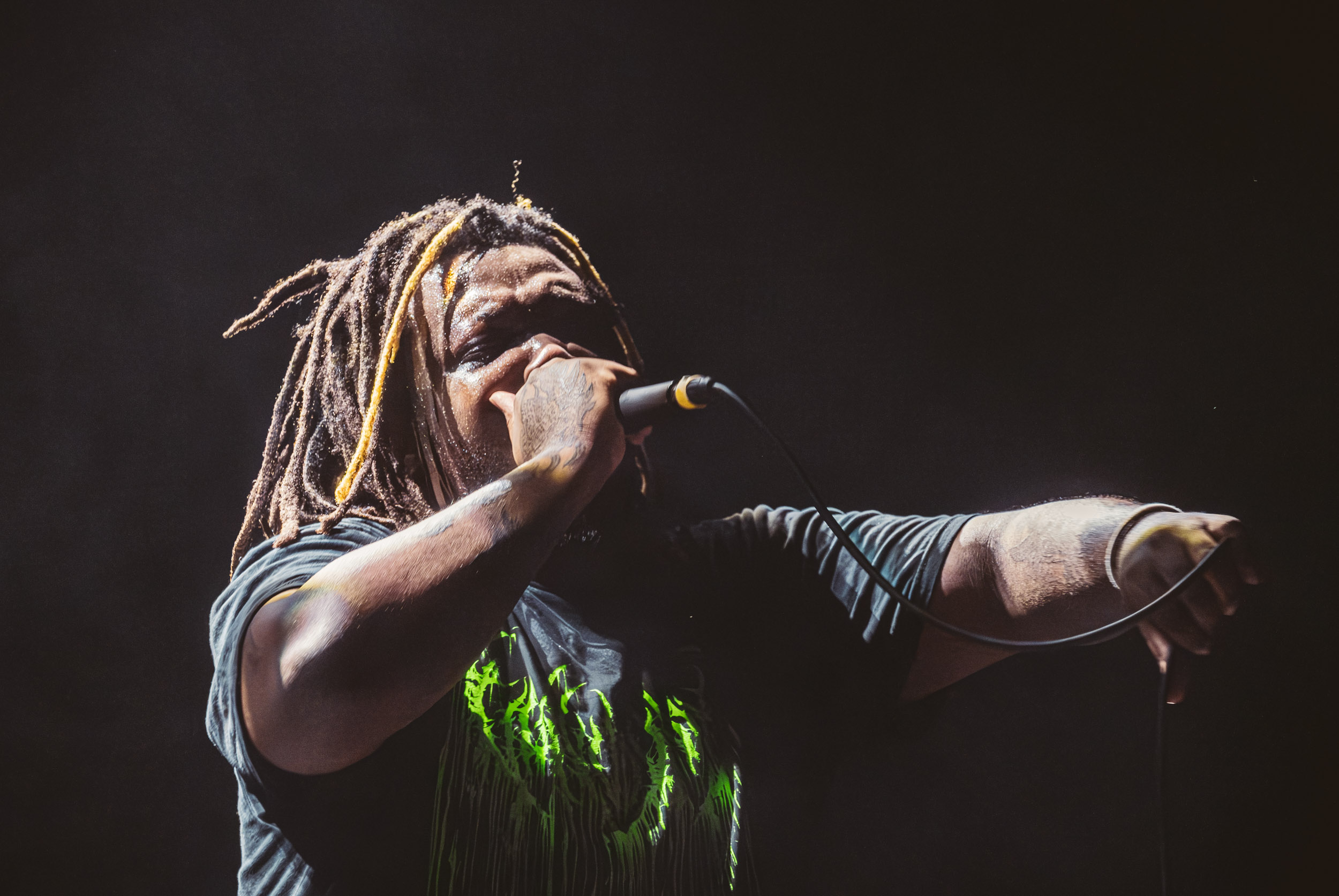 Il se fait encore tôt, 18 h 30 plus précisément, lorsque vient le moment pour Vulvodynia d’ouvrir les sanglantes hostilités. Dès l’introduction de son set, le groupe sud-africain démontre d’emblée un certain sens de l’humour, faisant son entrée en scène sur fond de la musique du Roi lion, petit hommage décalé au continent dont il est originaire. Un décalage qui se retrouve chez le bassiste Nate Gilbert, qui débarque sourire jusqu’aux oreilles et en chemise hawaïenne et short, son micro étant en plus agrémenté d’un collier de fleurs assorti ! Après quoi et une demi-heure durant, c’est un apéritif pour le moins épicé que sert le quintet aux spectateurs déjà présents, apéritif qui prend la forme d’un mix slam/deathcore très codifié, mais non moins efficace au vu de des réactions alentours. Il ne faut en effet pas longtemps aux spectateurs les plus aguerris pour se lancer dans les premiers circle pits de la soirée, harangués pour cela, bien comme il faut, par le frontman aux dreadlocks d’or Lwandile Prusent ; celui qui a encore récemment troqué sa guitare contre un micro montre par la même une grande aisance dans ce nouveau rôle. De même, les instrumentistes ne sont pas en reste et démontrent une maîtrise au poil de leurs instruments. Seul bémol au niveau sonore : la grosse caisse triggée, certes typique du genre mais un tantinet trop synthétique. Dans tous les cas, avec sa reprise de la scène couplée à la sortie de son album Entabeni l’année dernière, Vulvodynia montre qu’il a très bien su se relever de sa séparation brutale avec son fondateur et ancien frontman Duncan Bentley et révèle un bon capital sympathie… en tout cas plus important que ce que son nom évoquant une maladie sanglante laisse imaginer !
