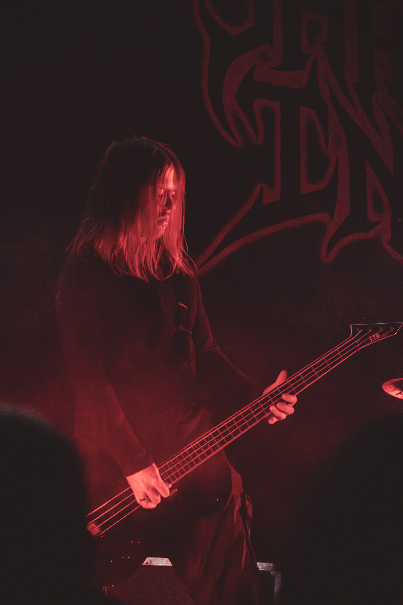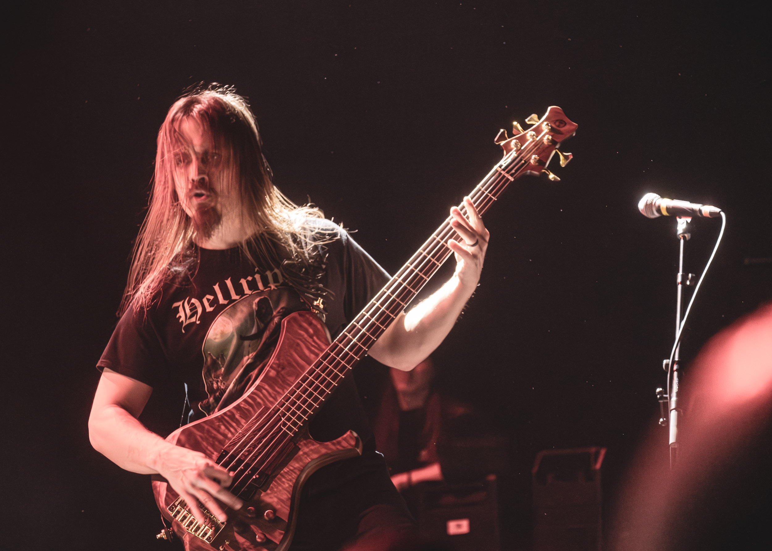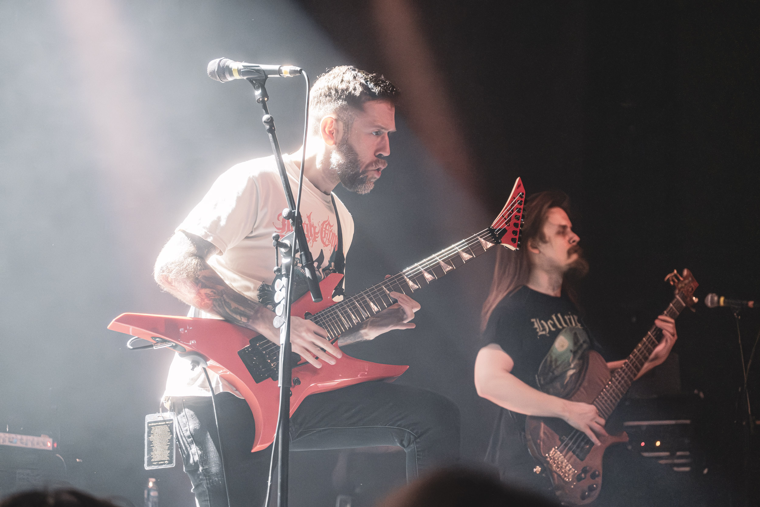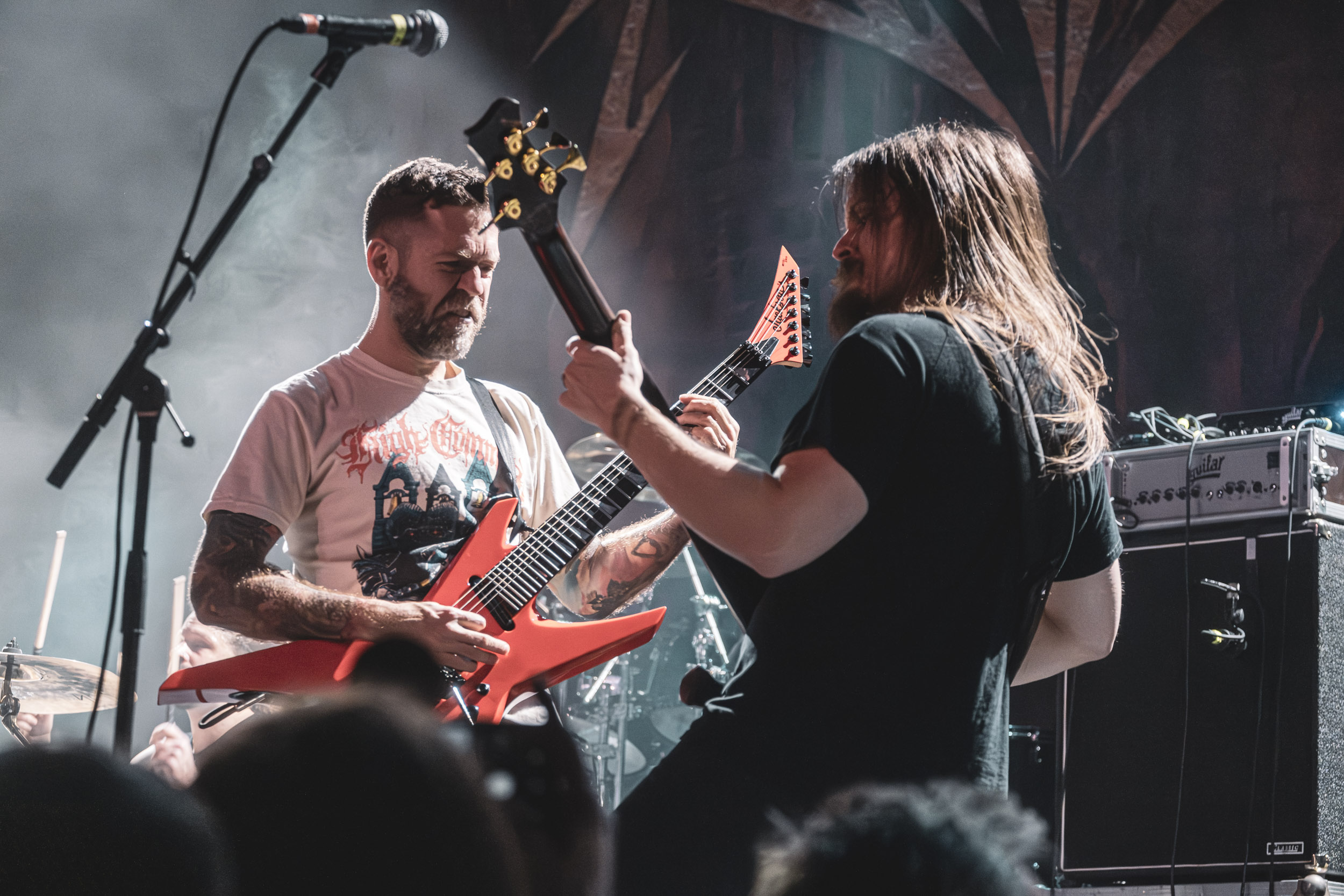 Très efficaces dans leur mise en place et leurs balances, les Américains de Revocation se permettent de démarrer leur set avec dix minutes d’avance. Efficaces, les quatre musiciens démontrent qu’ils le sont sur tous les plans, à commencer par celui de la technicité, qui donne son cachet au mélange entre thrash et death metal assez sombre, teinté çà et là de quelques accents heavy metal old-school, tel que le groupe le pratique depuis maintenant plus de vingt ans ; tout du moins dans le cas du fondateur et meneur David Davidson. Au centre de l’attention depuis sa place en première ligne, ce dernier se distingue par la façon dont il vit ses soli de guitare, se montrant habité par ces derniers au point que ses expressions en deviennent mélancoliques, contrastant de manière incongrue avec celles qu’il affiche au micro, relevant quant à elle d’un registre plus comique… Dans la même lignée, il fait montre d’un sens de l’humour certain lors de ses interventions entre les morceaux, humour qui crée là aussi un contraste amusant avec l’ambiance sombre et apocalyptique du set. J’en veux pour exemple le plus parlant le moment où David crie à l’adresse du public « Faites du bruit pour Cattle Decapitation ! » en prenant une voix aiguë et nasillarde, boutade faisant référence à certains extrêmes vocaux du frontman du groupe… Quand on parle de Travis Ryan, ce dernier a récemment collaboré avec Revocation sur le single Confines of Infinity, sorti officiellement la veille du concert, et qui trouve sa place au milieu de la setlist entre deux extraits des récents albums Netherheavens (2022) et The Outer Ones (2018). En revanche, le chanteur de Cattle Decapitation ne vient pas rejoindre Revocation sur scène pour interpréter le titre avec le groupe, petit regret pour moi qui l’espérais. Du côté des musiciens, Alex Weber et Harry Lannon apportent un appui vocal solide et bénéficient d’un bon calibrage sonore, tout comme Ash Pearson. Bien qu’un peu calmes, les spectateurs se montrent tout de même réceptifs, certains se lançant une nouvelle fois dans des circle pits, et réservent à Revocation l’accueil respectueux qui lui est dû.