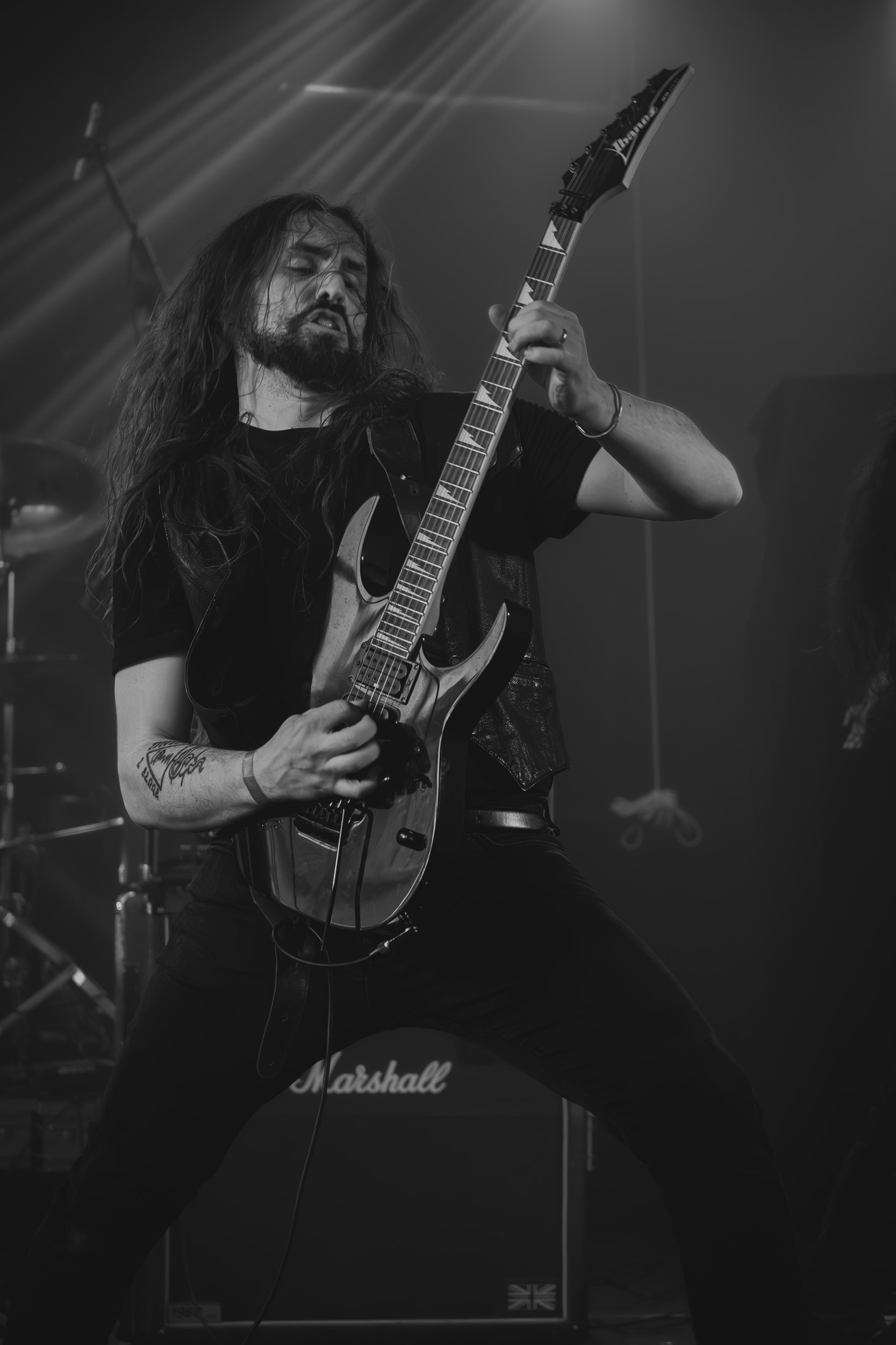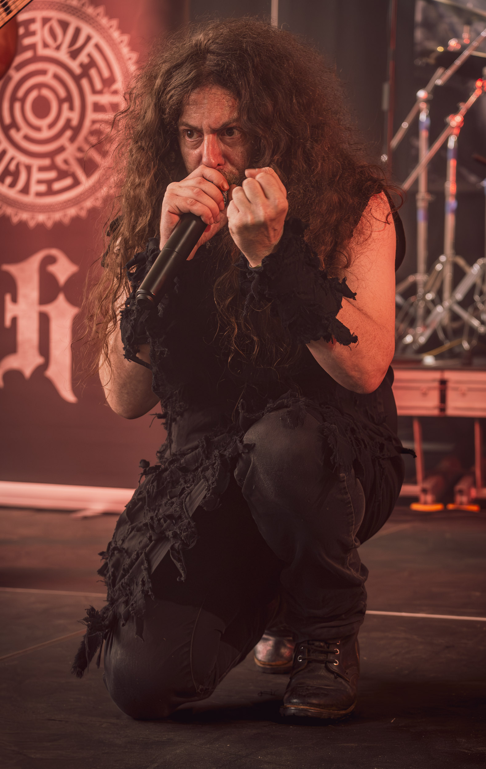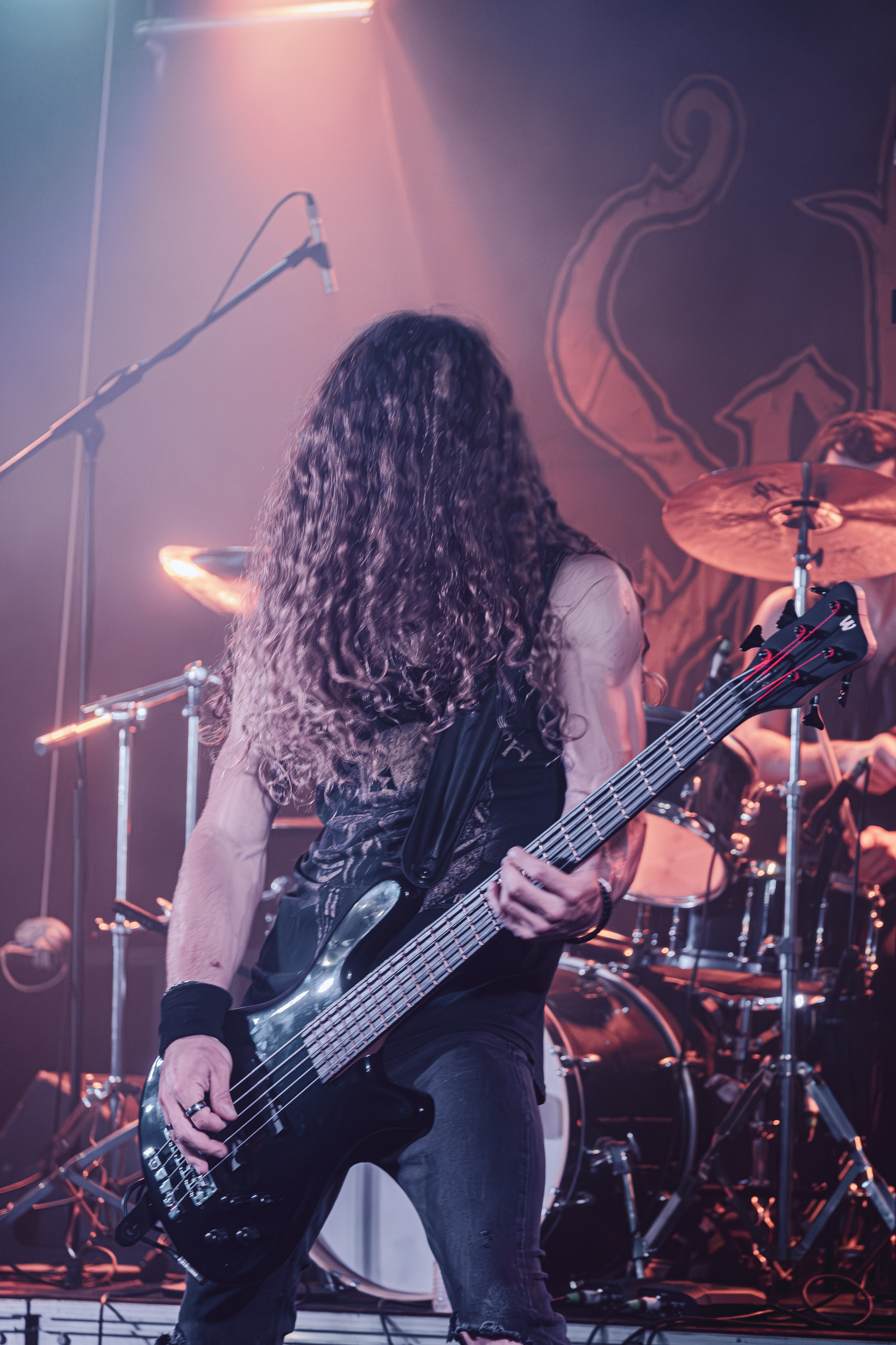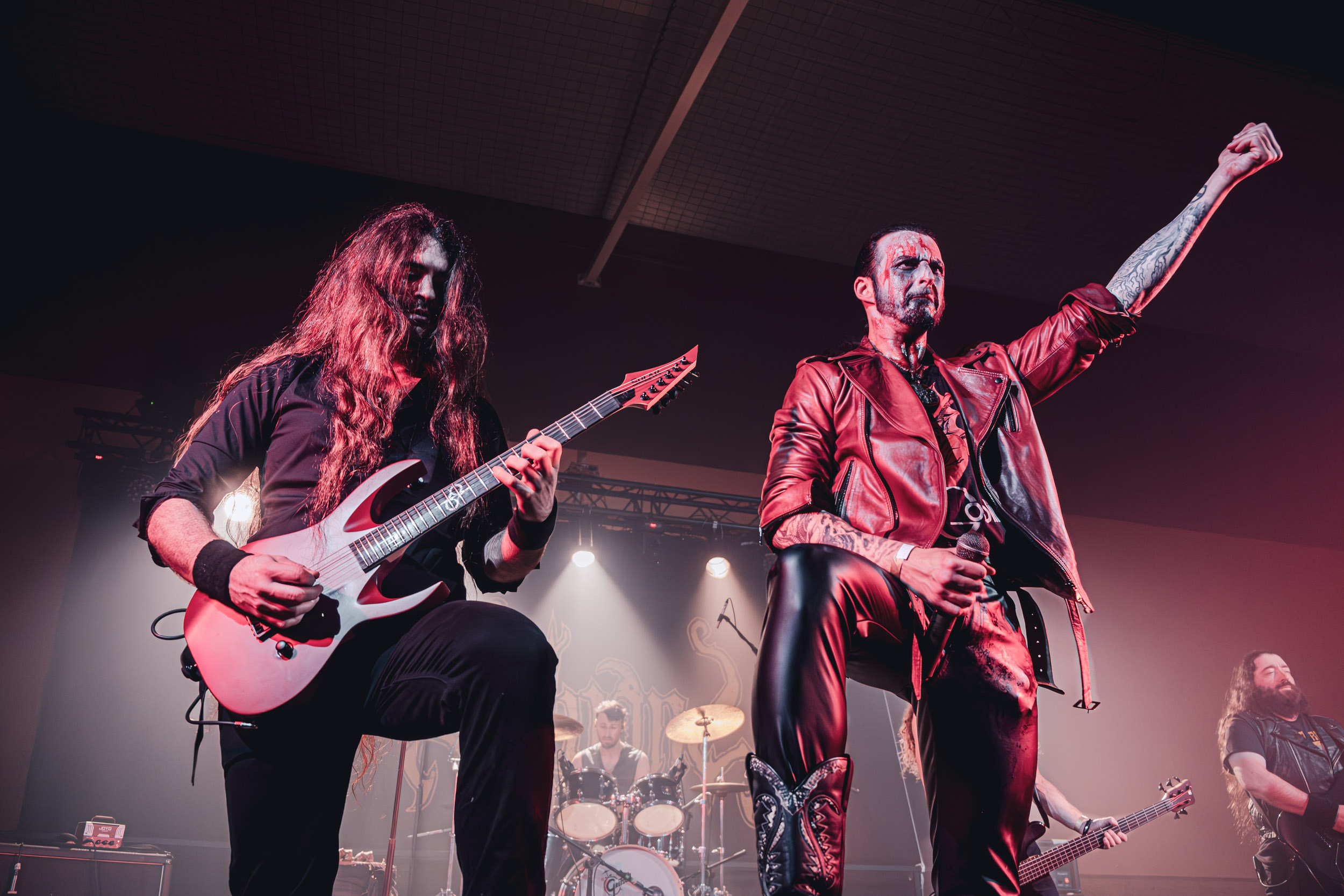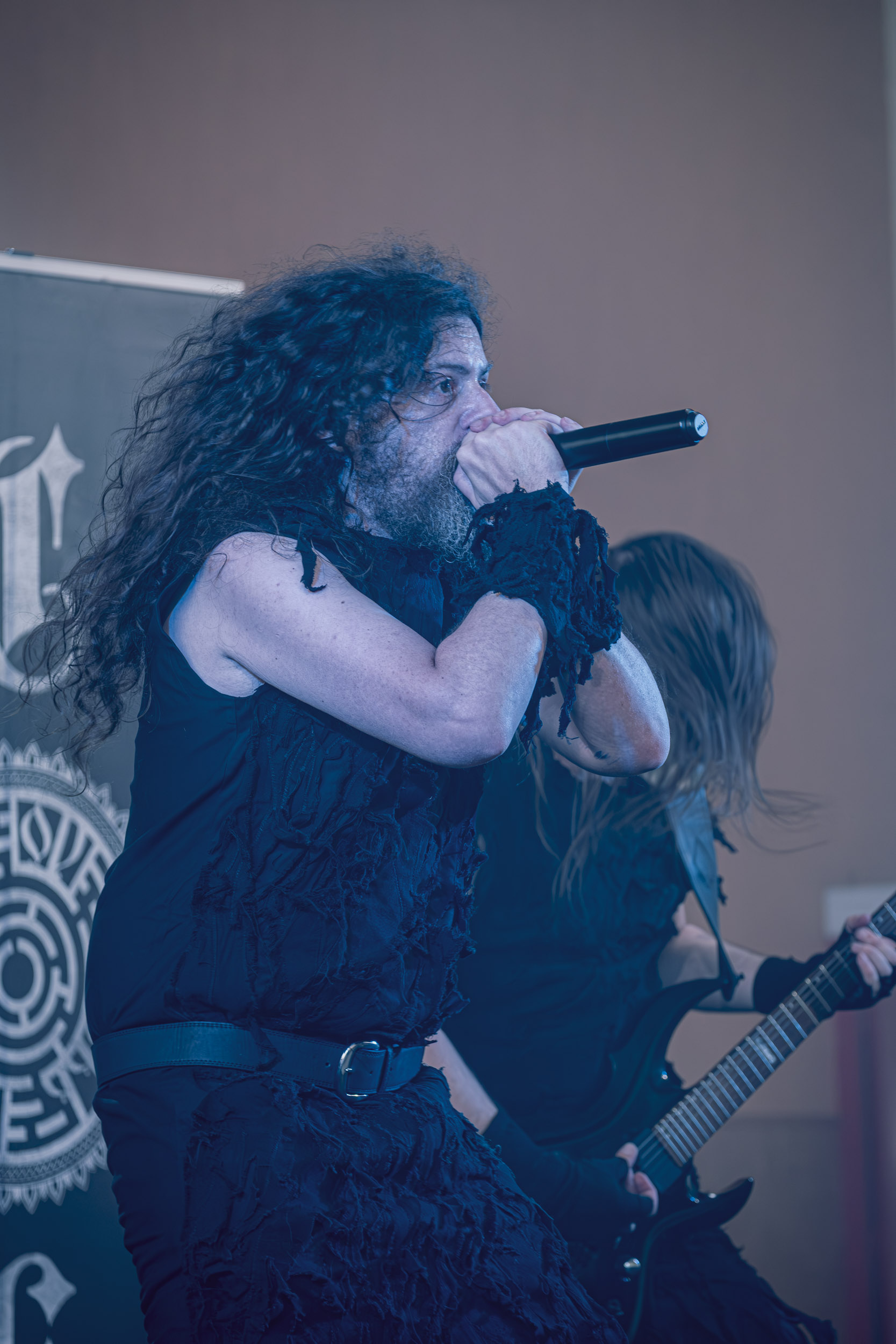 Après une prestation ayant marqué les esprits au Dark Medieval Fest de 2022, d’après les échos que j’en ai eu, Selvans fait son retour cette année, cette fois-ci en tant que tête d’affiche. Ce retour prend toutefois un goût un peu particulier, doux-amer, puisqu’il s’agit là de la dernière date française du groupe, son fondateur Luca Del Re a.k.a Selvans Haruspex ayant mis un point final à la trilogie d’albums au cœur du projet et par la même à celui-ci. Pour autant, l’heure n’est pas à verser des larmes ; plutôt à célébrer tous ensemble le folklore italien dans ses aspects les plus ténébreux. Au vu de cette thématique et, encore une fois, des retours, voilà un show qui promet d’être très théâtral… ce qui se vérifie très rapidement lorsque Selvans, l’artiste, déboule comme un fou sur la scène toutes cornes dehors, arborant fièrement maquillage cadavérique, veste en cuir rouge et santiags et poussant des cris si éraillés que l’on croirait un oiseau de proie ! Ces atouts, couplés à une présence scénique de tous les instants, font de l’Italien aux allures de seigneur vampire des temps modernes un véritable showman qui sait occuper l’espace scénique et porte le concert de bout en bout. Rien d’étonnant pour qui sait que le gentleman exerce aussi en tant qu’acteur dans des comédies musicales ! Ses comparses instrumentistes, bien qu’en retrait, ne font pas pour autant de la figuration. Bien au contraire, ils savent montrer leur joie d’être là, en plus de tous exceller sur leurs instruments respectifs. Acheron, guitariste lead à l’instrument rouge, déploie un shredding à la taille de son immense chevelure ; de l’autre côté de la scène, son comparse rythmique The Ancient et le bassiste Agares forment un duo inséparable, bien appuyé par Signifer en fond.