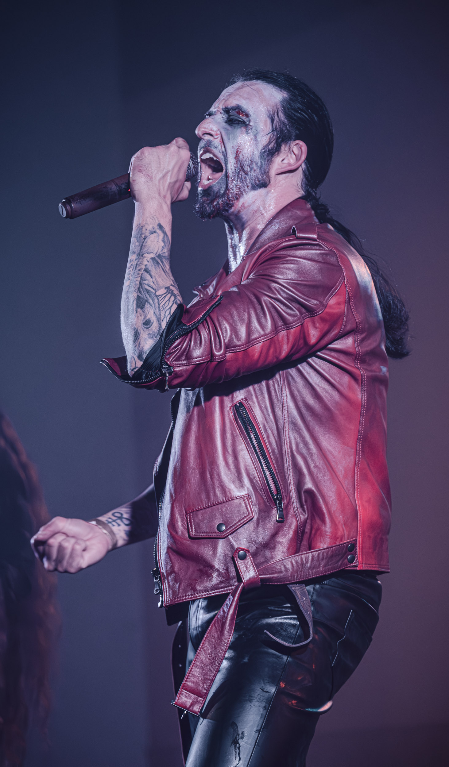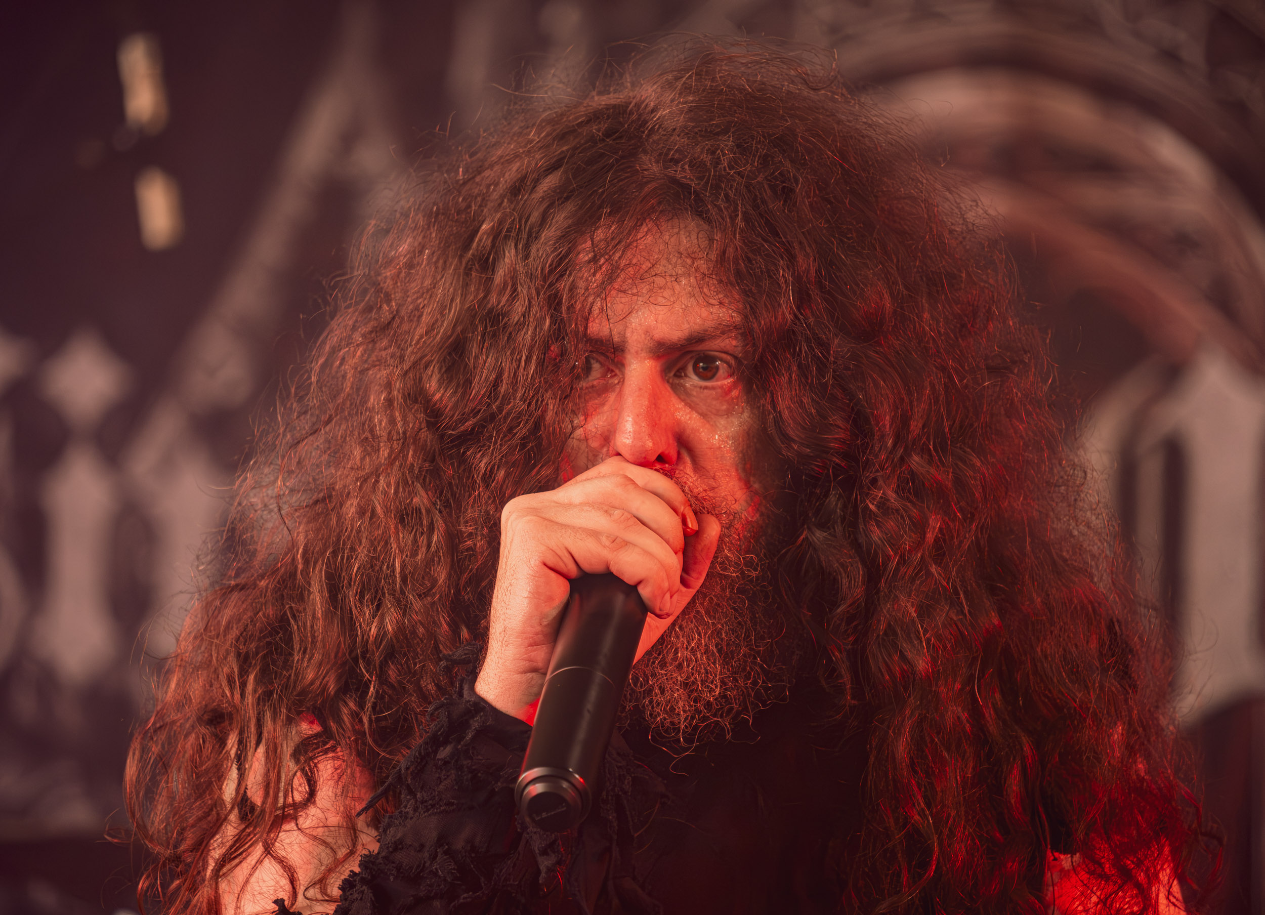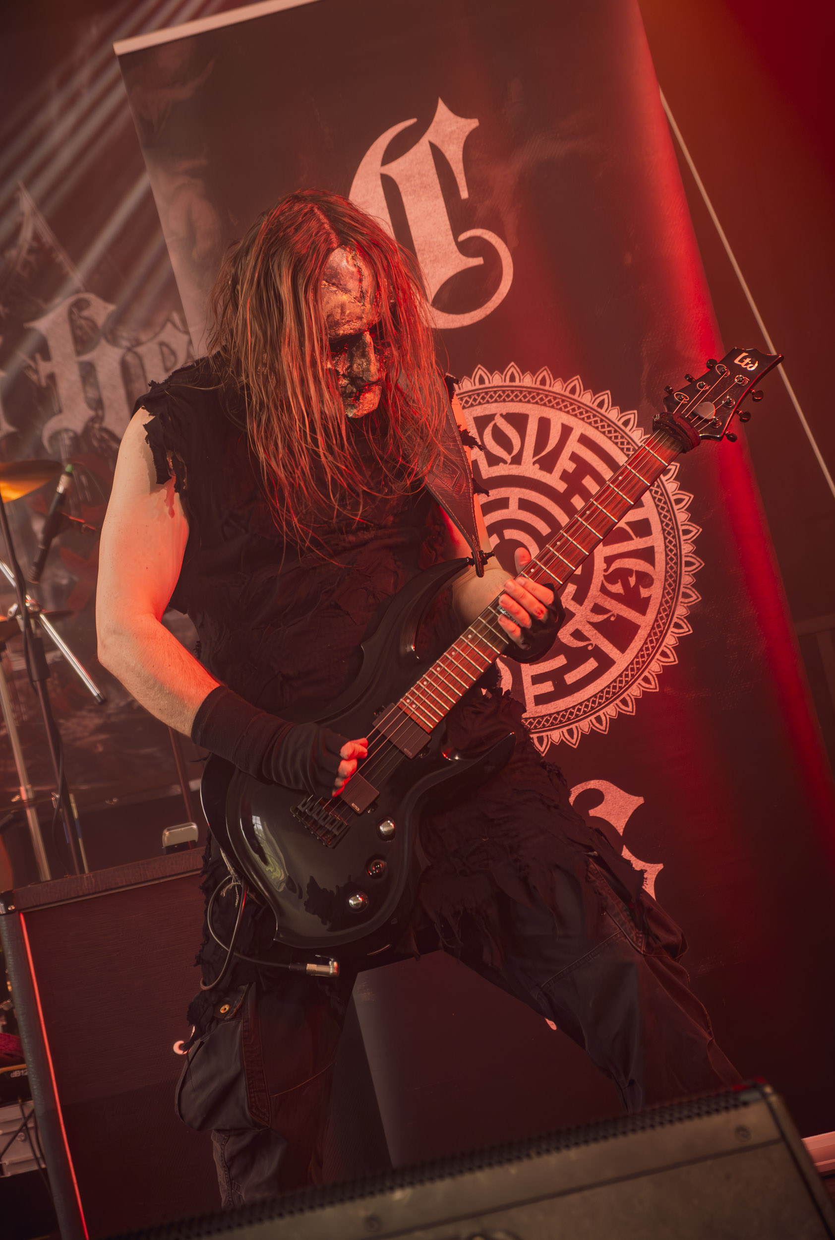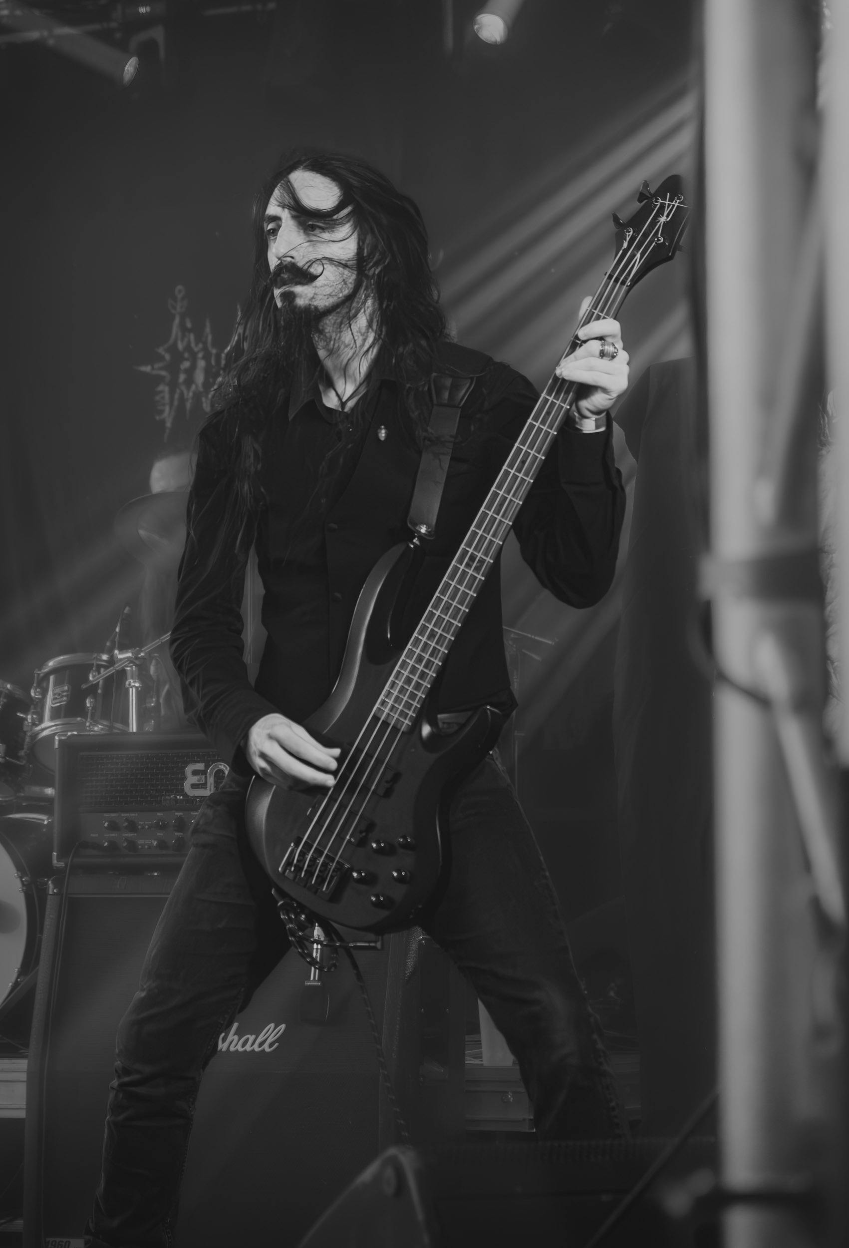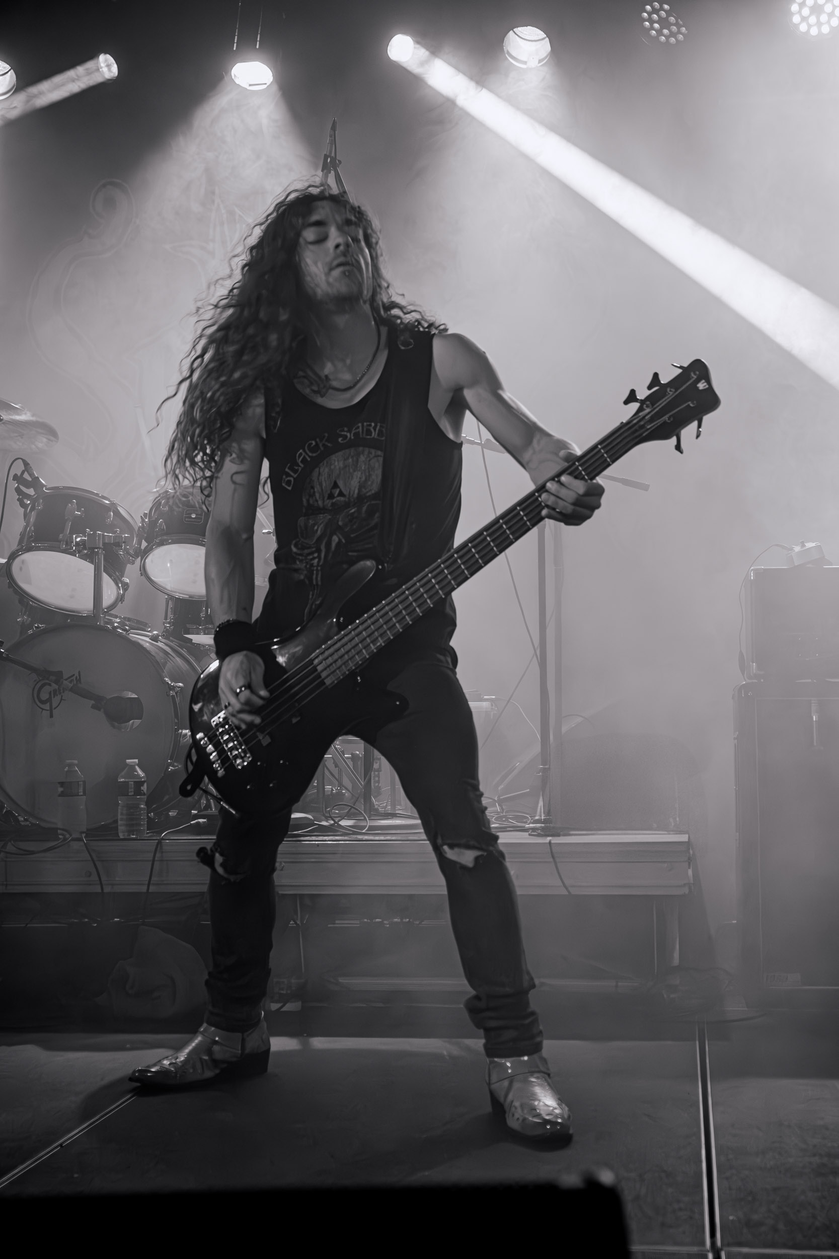 Après une prestation ayant marqué les esprits au Dark Medieval Fest de 2022, d’après les échos que j’en ai eu, Selvans fait son retour cette année, cette fois-ci en tant que tête d’affiche. Ce retour prend toutefois un goût un peu particulier, doux-amer, puisqu’il s’agit là de la dernière date française du groupe, son fondateur Luca Del Re a.k.a Selvans Haruspex ayant mis un point final à la trilogie d’albums au cœur du projet et par la même à celui-ci. Pour autant, l’heure n’est pas à verser des larmes ; plutôt à célébrer tous ensemble le folklore italien dans ses aspects les plus ténébreux. Au vu de cette thématique et, encore une fois, des retours, voilà un show qui promet d’être très théâtral… ce qui se vérifie très rapidement lorsque Selvans, l’artiste, déboule comme un fou sur la scène toutes cornes dehors, arborant fièrement maquillage cadavérique, veste en cuir rouge et santiags et poussant des cris si éraillés que l’on croirait un oiseau de proie ! Ces atouts, couplés à une présence scénique de tous les instants, font de l’Italien aux allures de seigneur vampire des temps modernes un véritable showman qui sait occuper l’espace scénique et porte le concert de bout en bout. Rien d’étonnant pour qui sait que le gentleman exerce aussi en tant qu’acteur dans des comédies musicales ! Ses comparses instrumentistes, bien qu’en retrait, ne font pas pour autant de la figuration. Bien au contraire, ils savent montrer leur joie d’être là, en plus de tous exceller sur leurs instruments respectifs. Acheron, guitariste lead à l’instrument rouge, déploie un shredding à la taille de son immense chevelure ; de l’autre côté de la scène, son comparse rythmique The Ancient et le bassiste Agares forment un duo inséparable, bien appuyé par Signifer en fond.