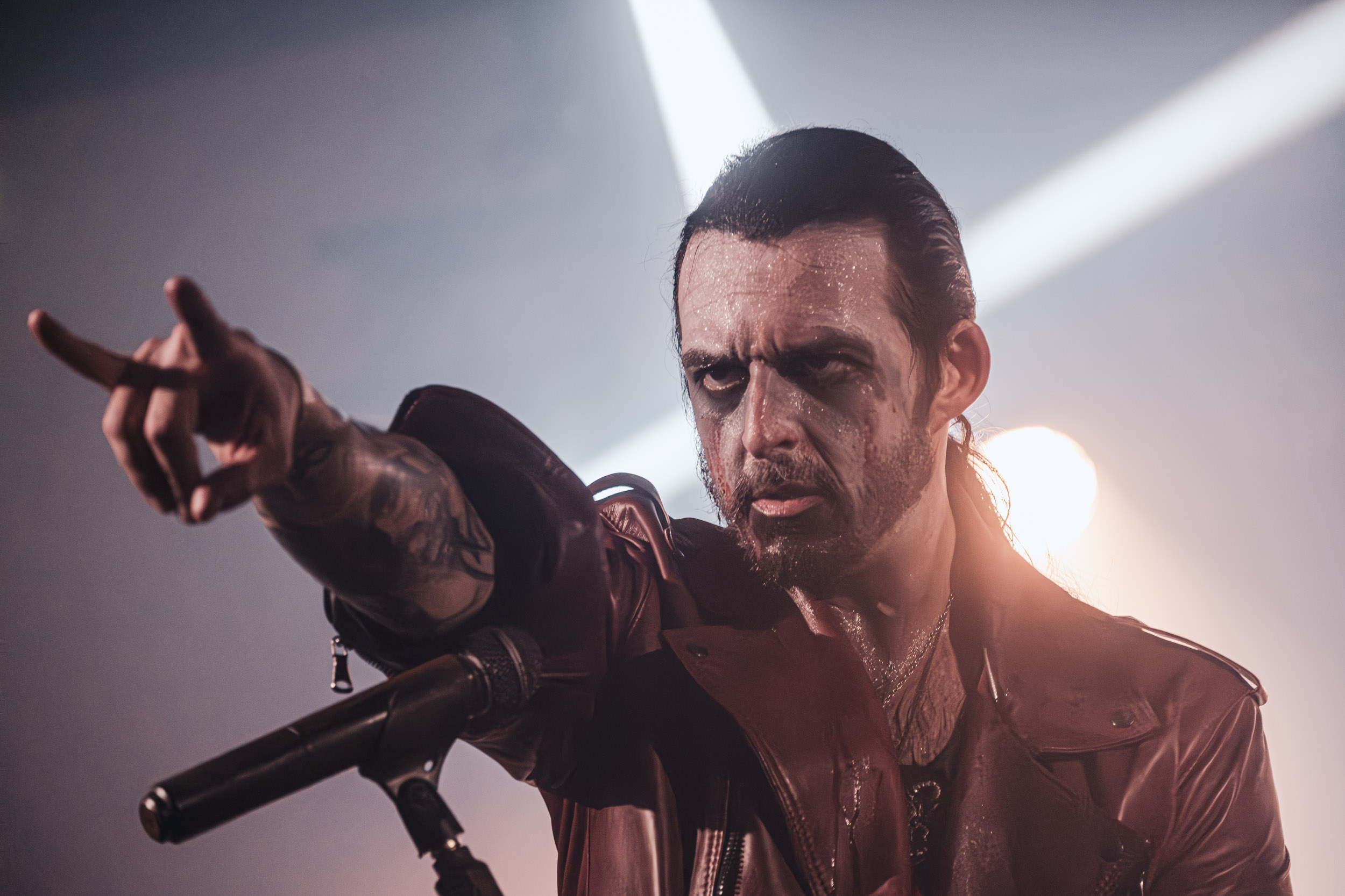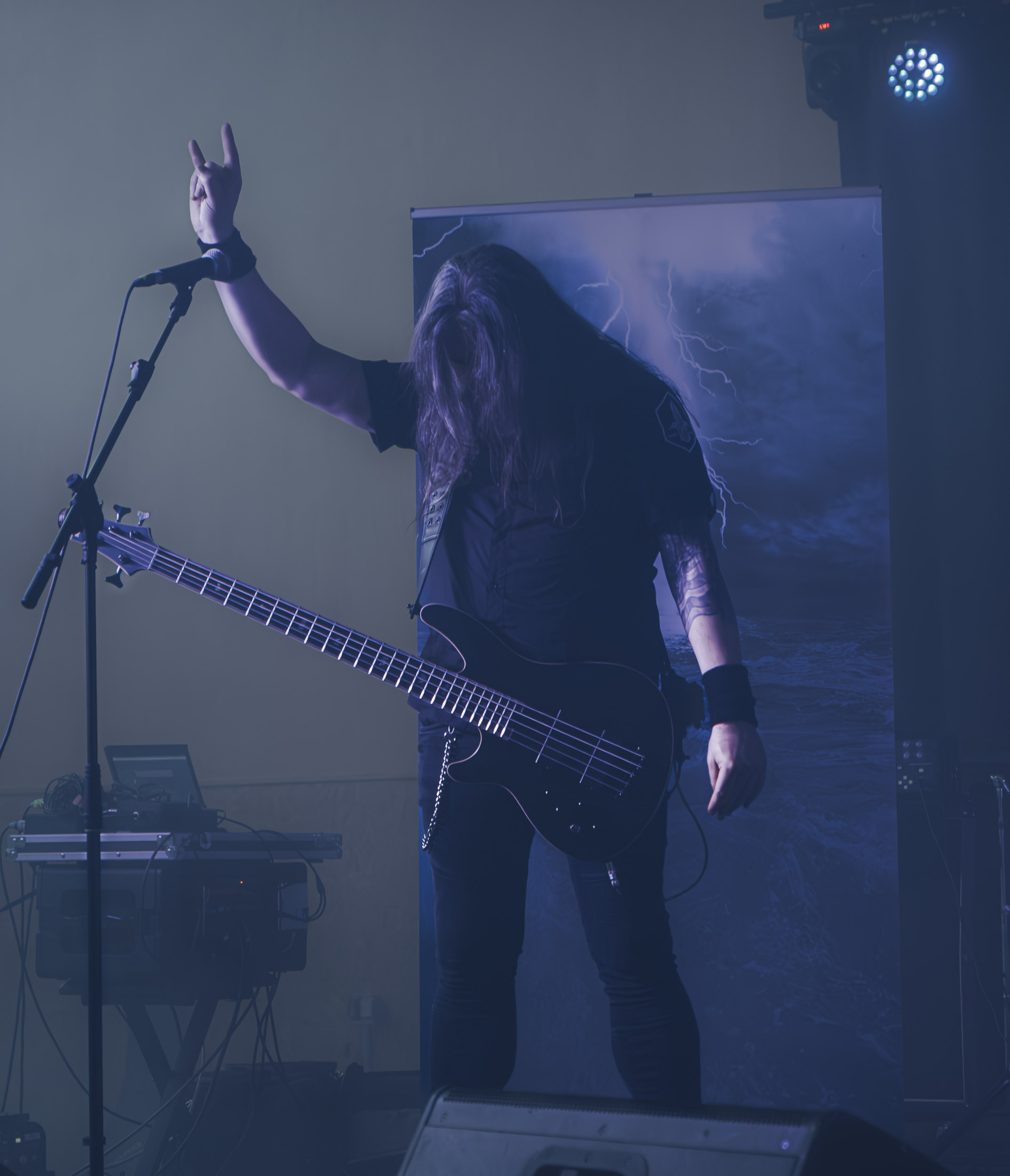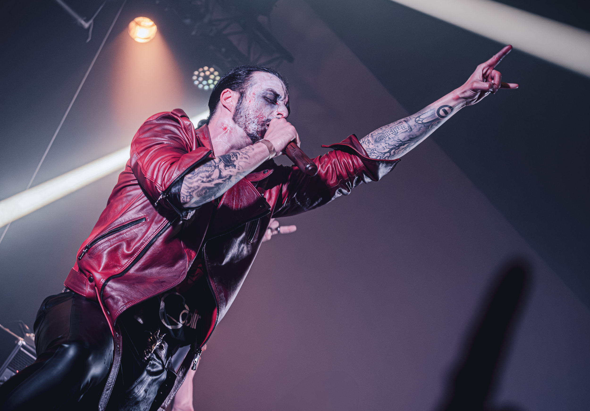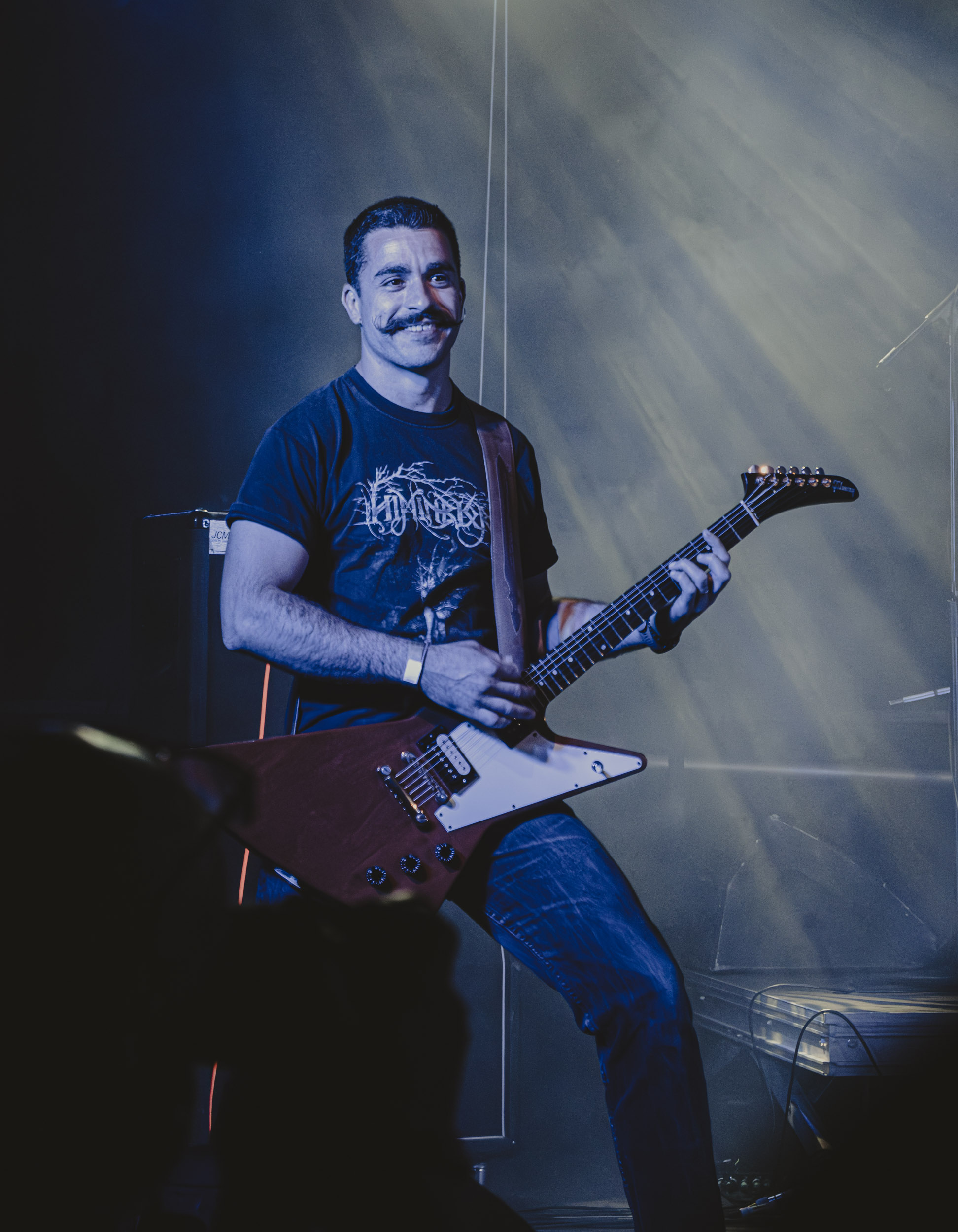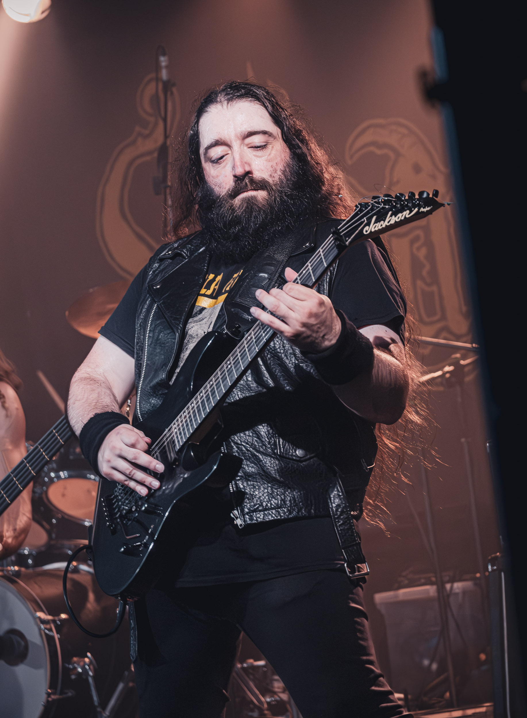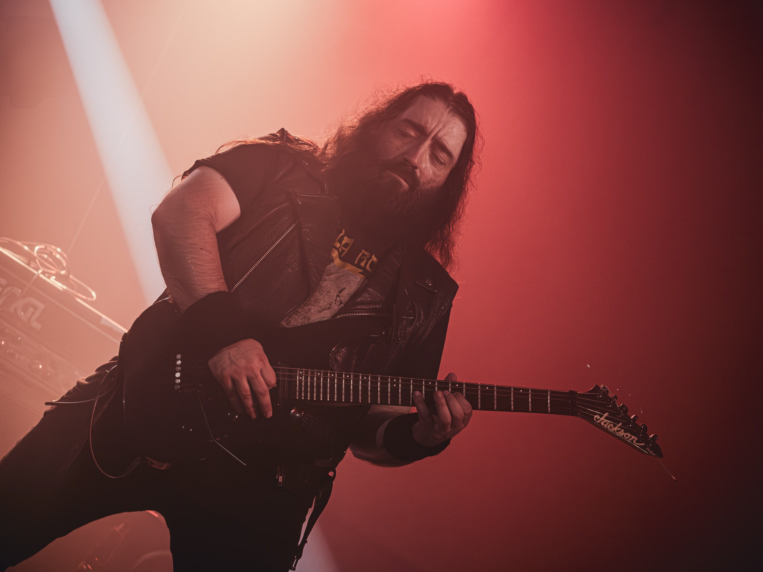 Après une prestation ayant marqué les esprits au Dark Medieval Fest de 2022, d’après les échos que j’en ai eu, Selvans fait son retour cette année, cette fois-ci en tant que tête d’affiche. Ce retour prend toutefois un goût un peu particulier, doux-amer, puisqu’il s’agit là de la dernière date française du groupe, son fondateur Luca Del Re a.k.a Selvans Haruspex ayant mis un point final à la trilogie d’albums au cœur du projet et par la même à celui-ci. Pour autant, l’heure n’est pas à verser des larmes ; plutôt à célébrer tous ensemble le folklore italien dans ses aspects les plus ténébreux. Au vu de cette thématique et, encore une fois, des retours, voilà un show qui promet d’être très théâtral… ce qui se vérifie très rapidement lorsque Selvans, l’artiste, déboule comme un fou sur la scène toutes cornes dehors, arborant fièrement maquillage cadavérique, veste en cuir rouge et santiags et poussant des cris si éraillés que l’on croirait un oiseau de proie ! Ces atouts, couplés à une présence scénique de tous les instants, font de l’Italien aux allures de seigneur vampire des temps modernes un véritable showman qui sait occuper l’espace scénique et porte le concert de bout en bout. Rien d’étonnant pour qui sait que le gentleman exerce aussi en tant qu’acteur dans des comédies musicales ! Ses comparses instrumentistes, bien qu’en retrait, ne font pas pour autant de la figuration. Bien au contraire, ils savent montrer leur joie d’être là, en plus de tous exceller sur leurs instruments respectifs. Acheron, guitariste lead à l’instrument rouge, déploie un shredding à la taille de son immense chevelure ; de l’autre côté de la scène, son comparse rythmique The Ancient et le bassiste Agares forment un duo inséparable, bien appuyé par Signifer en fond.