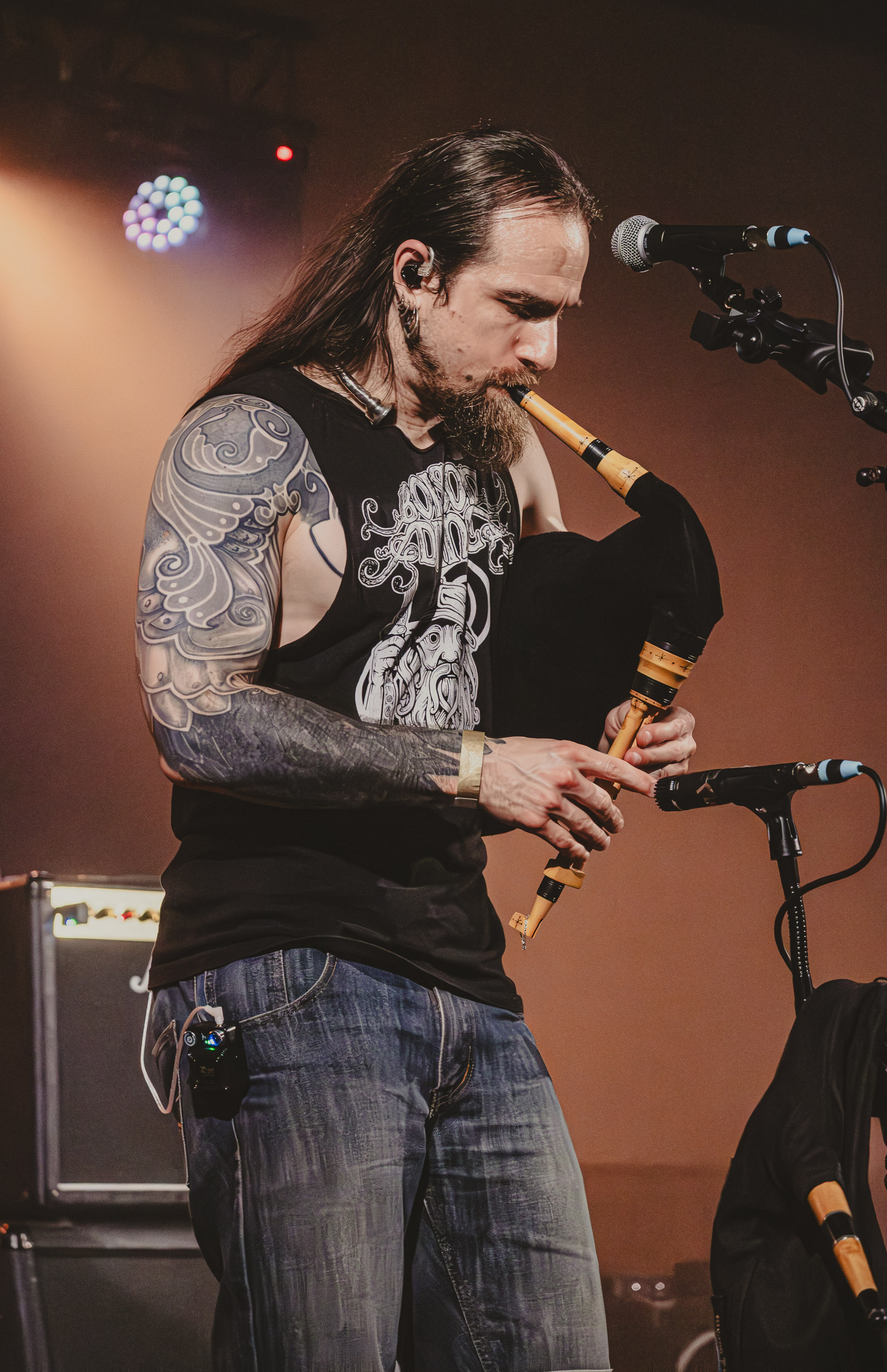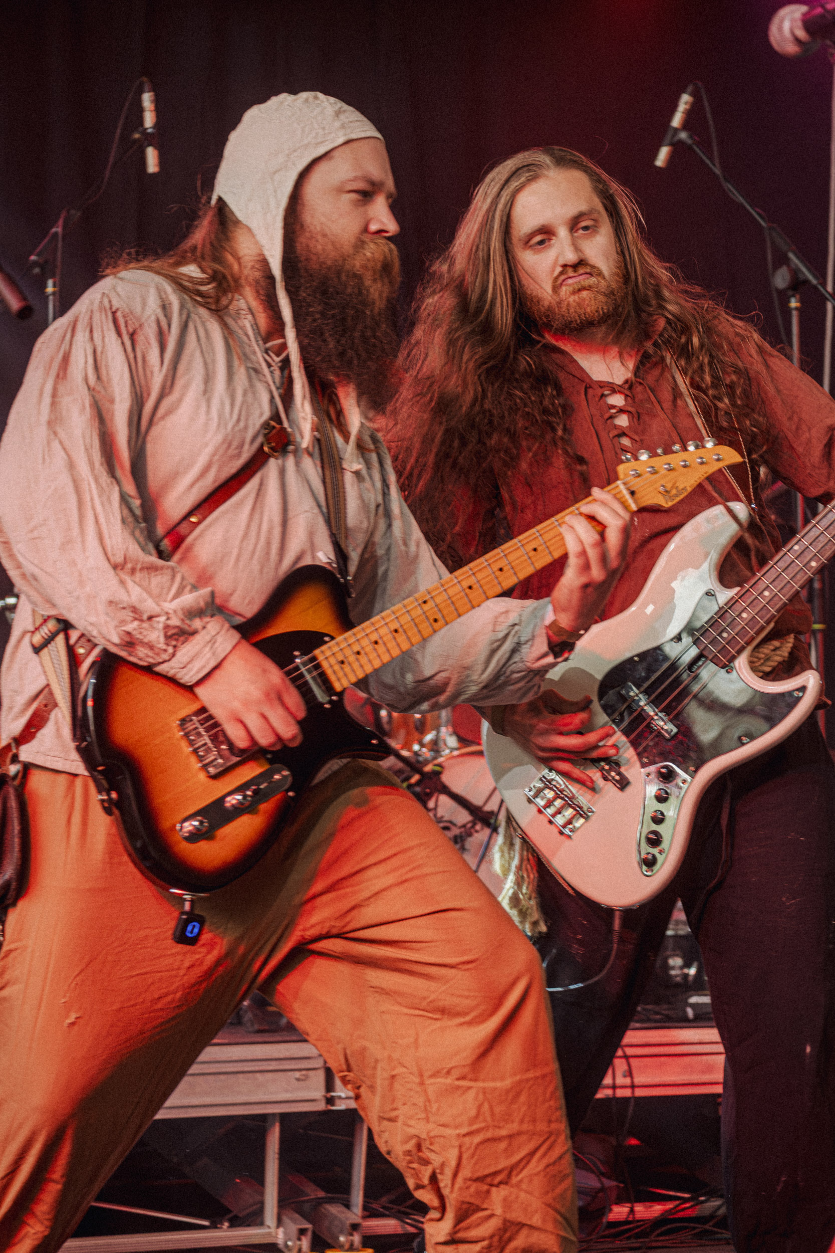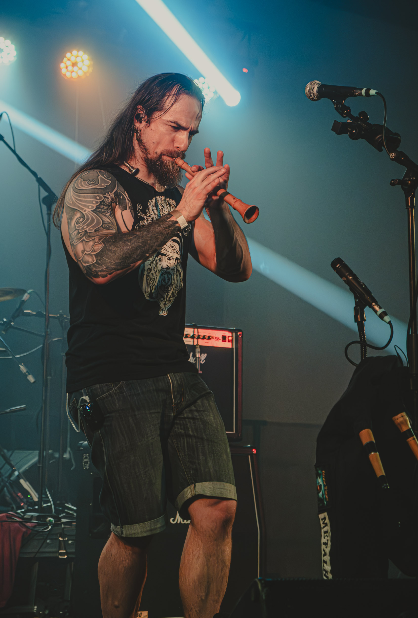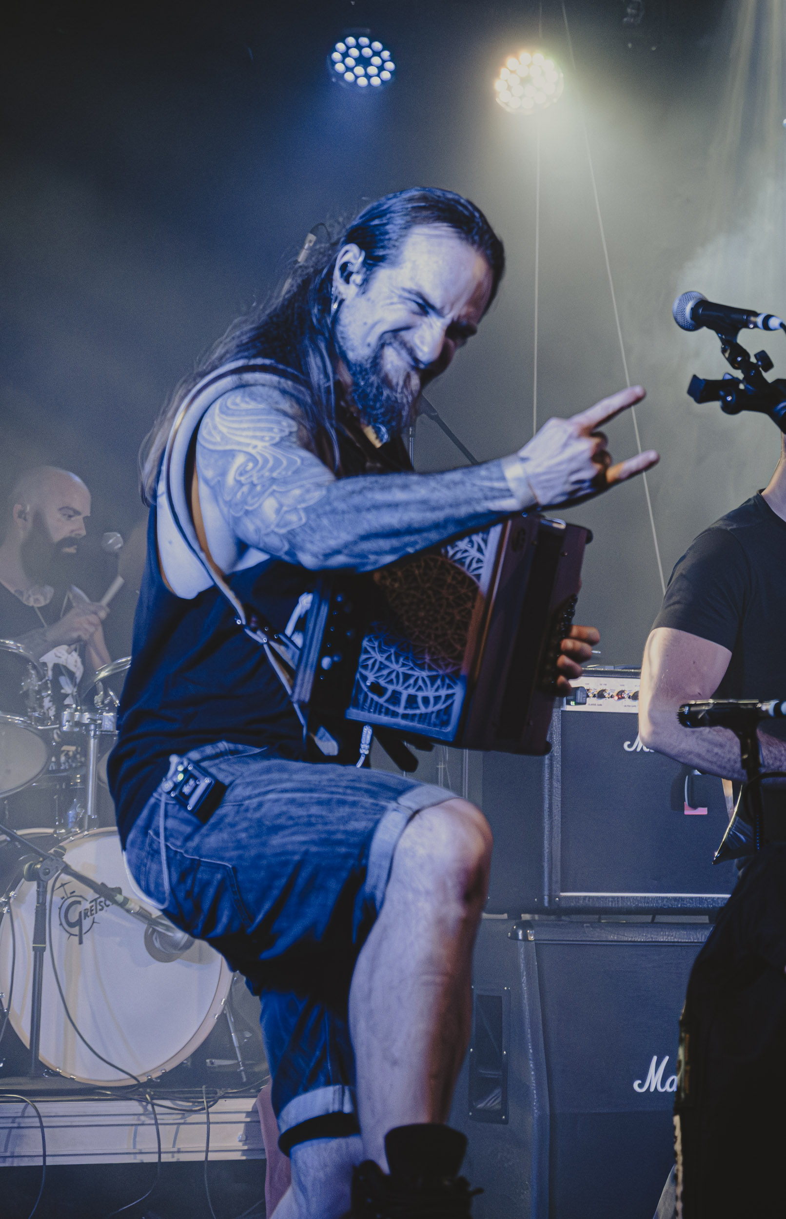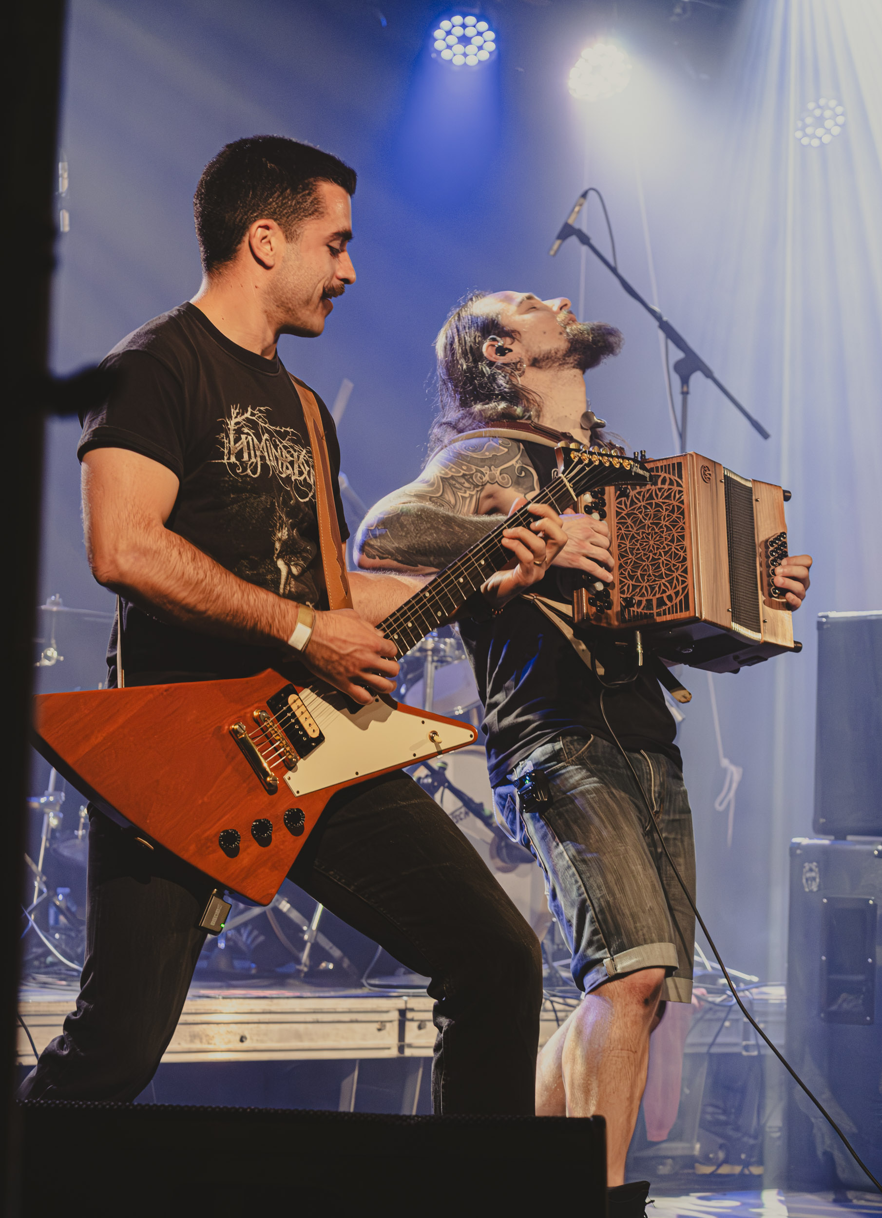 Après avoir dû annuler sa venue à l’édition 2023 du Dark Medieval Fest — son batteur ayant été à ce moment en convalescence suite à une opération —, Boisson Divine rattrape le coup cette année, venu tout droit de sa Gascogne d’origine. Peu de temps après son incursion dans le set d’Himinbjorg, voilà donc Baptiste Labenne de retour sur scène, bien accompagné de ses comparses gascons, pour nous emmener à la découverte du patrimoine folklorique de cette région du sud-ouest de la France plus connue pour son patrimoine viticole. En bons guides touristiques, les musiciens déploient leurs meilleurs atouts au programme de cette visite, à savoir : des morceaux dansants aux textes écrits dans la langue locale — l’occitan — et aux refrains chantés à l’unisson, le tout saupoudré de l’accent chantant qui va avec, beaucoup de solos de guitare, divers instruments folkloriques gérés d’une main et d’un souffle de maître par Pierre Delaporte alias Pereg ar Bagol qui se balade de l’un à l’autre et, surtout, beaucoup d’humour ! « On est désolés d’interrompre votre soirée black metal ! » s’exclame d’ailleurs Baptiste entre deux morceaux. « Et vive le Gers ! » répond à cela un spectateur tout aussi plaisantin ; ce sur quoi le groupe se lance sur le morceau suivant et la fosse dans une danse endiablée. Effectivement, au vu de son aspect festif et jovial, dire que Boisson Divine dénote par rapport aux autres groupes de l’affiche paraît un doux euphémisme ! Comment en vouloir à ces cinq-là, néanmoins, de distiller si généreusement autant de bonne humeur au milieu d’autres univers plus ou moins sombres et extrêmes ? Sur ce point, mention honorable au batteur Adrian Gilles, qui n’oublie pas de sourire à l’objectif !