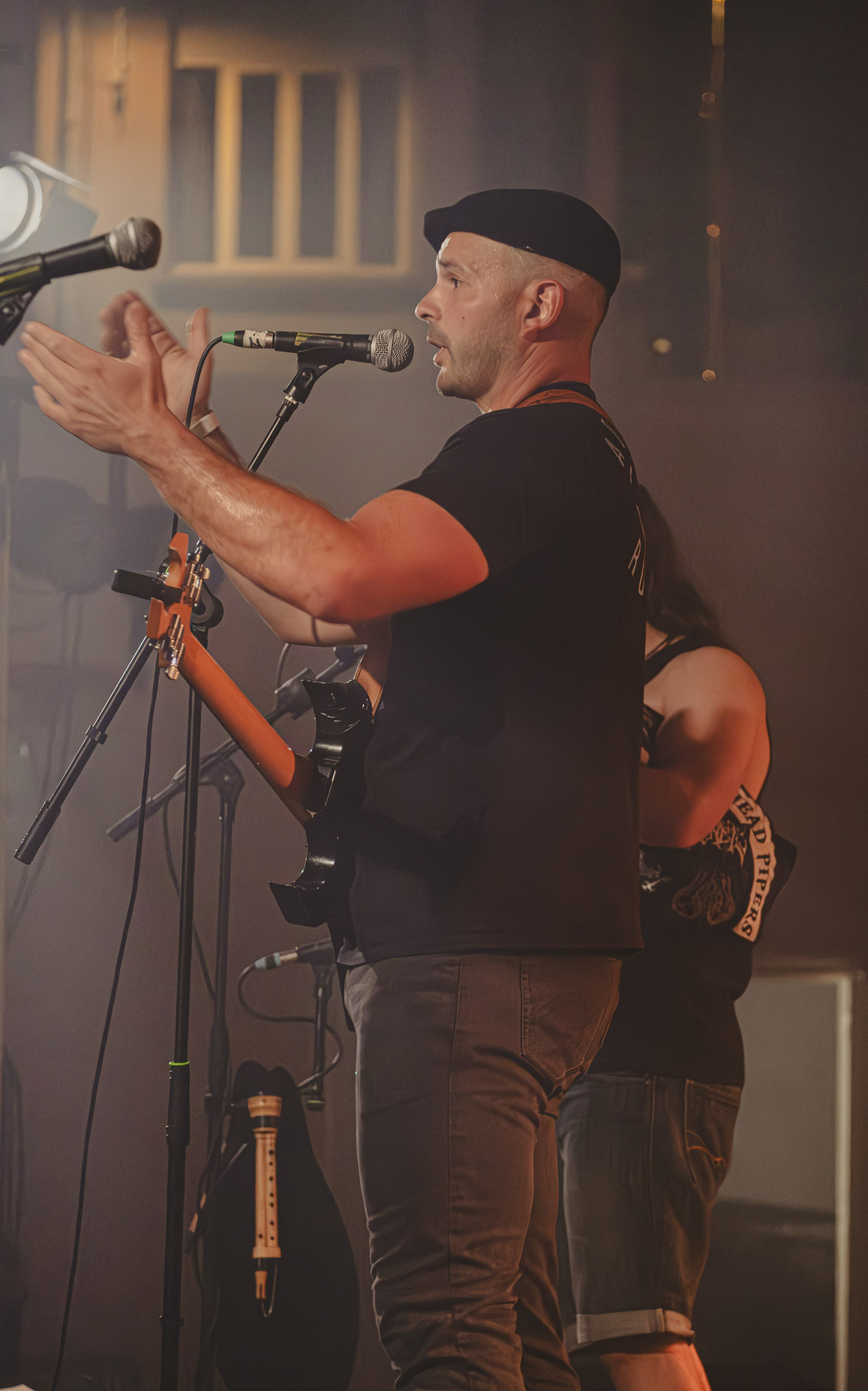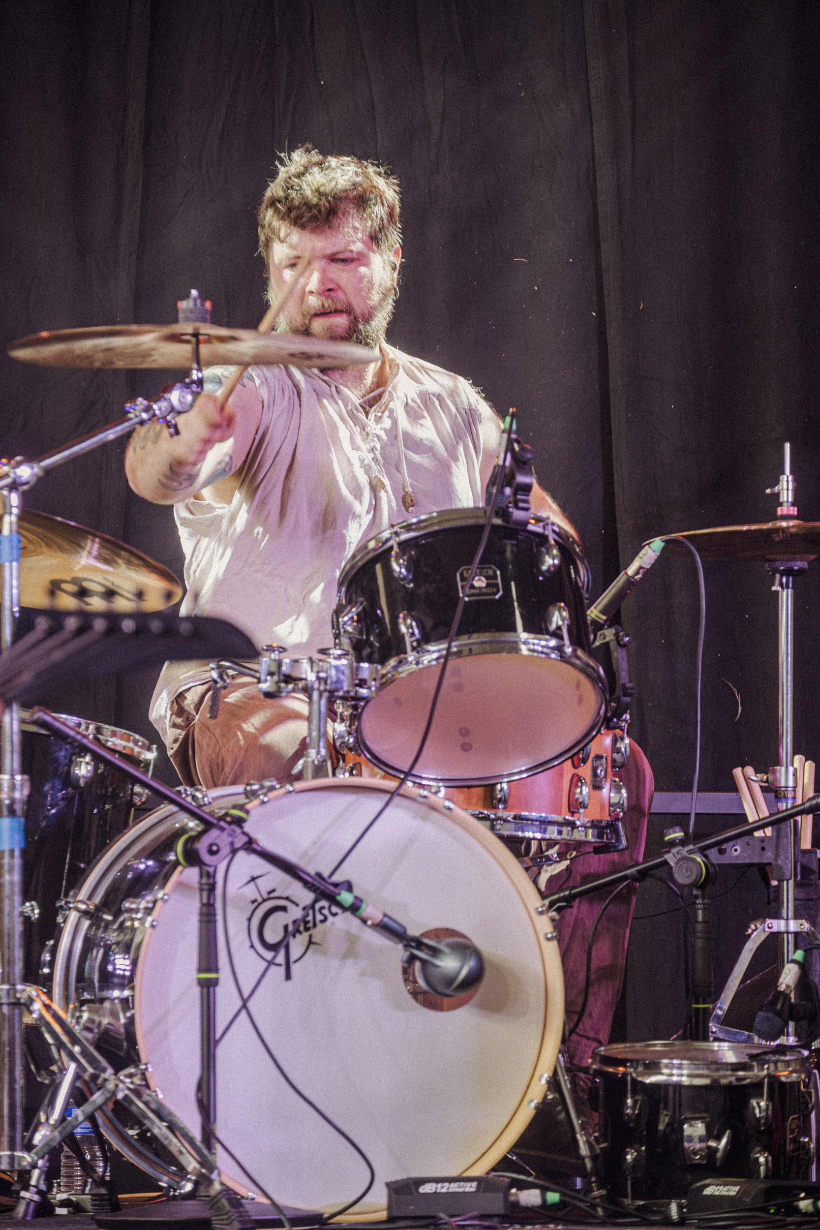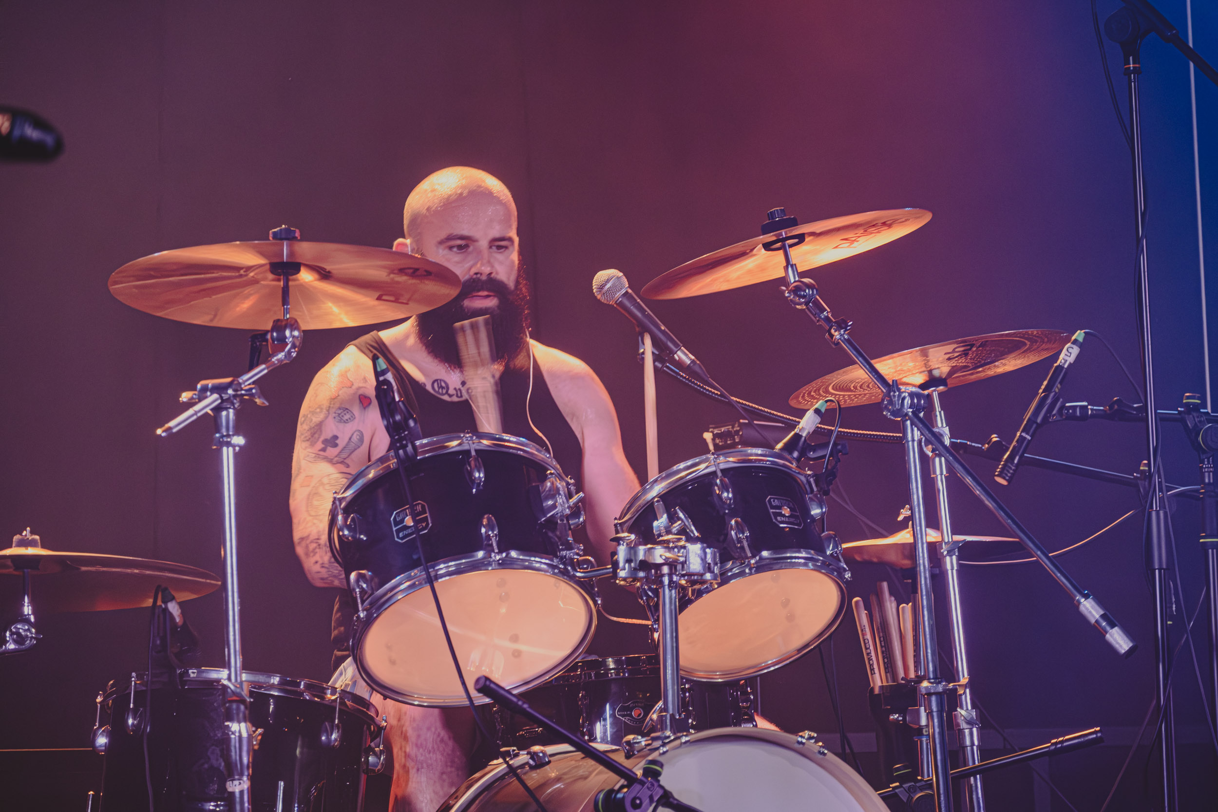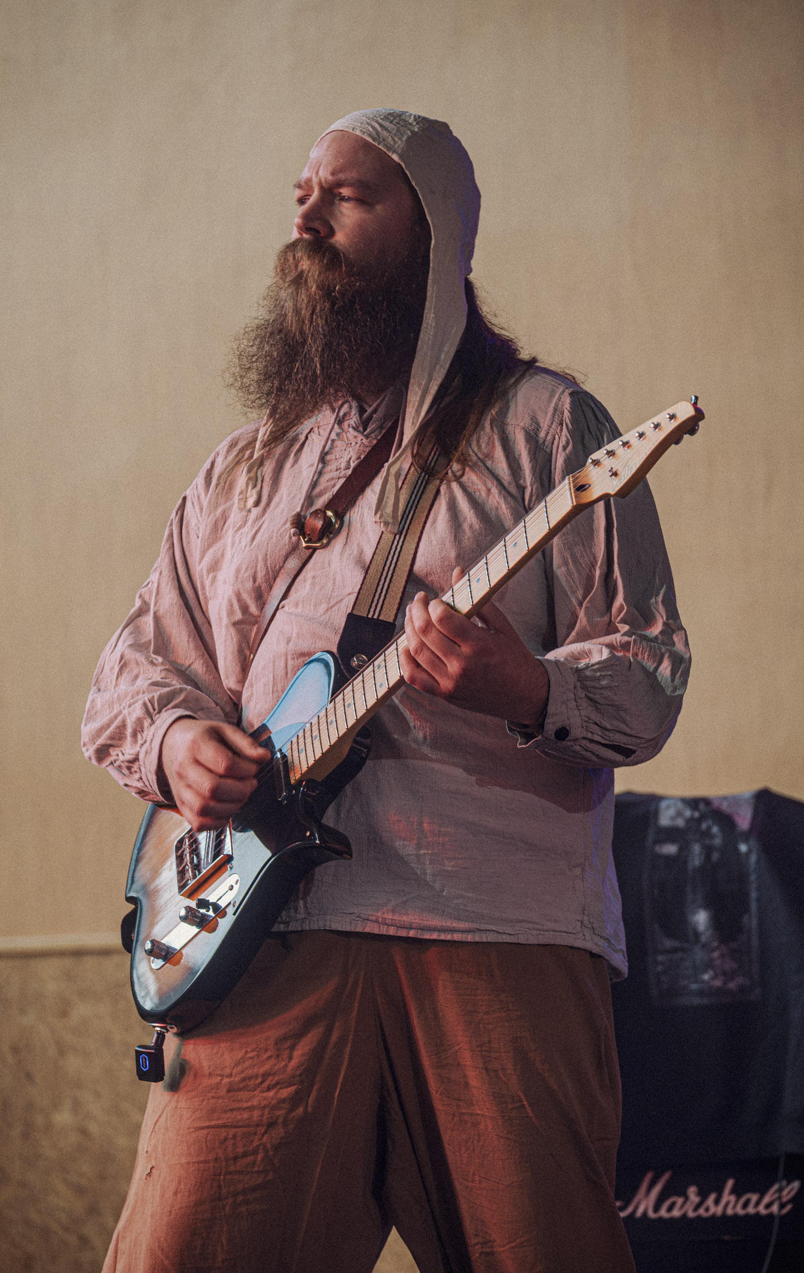Après avoir dû annuler sa venue à l’édition 2023 du Dark Medieval Fest — son batteur ayant été à ce moment en convalescence suite à une opération —, Boisson Divine rattrape le coup cette année, venu tout droit de sa Gascogne d’origine. Peu de temps après son incursion dans le set d’Himinbjorg, voilà donc Baptiste Labenne de retour sur scène, bien accompagné de ses comparses gascons, pour nous emmener à la découverte du patrimoine folklorique de cette région du sud-ouest de la France plus connue pour son patrimoine viticole. En bons guides touristiques, les musiciens déploient leurs meilleurs atouts au programme de cette visite, à savoir : des morceaux dansants aux textes écrits dans la langue locale — l’occitan — et aux refrains chantés à l’unisson, le tout saupoudré de l’accent chantant qui va avec, beaucoup de solos de guitare, divers instruments folkloriques gérés d’une main et d’un souffle de maître par Pierre Delaporte alias Pereg ar Bagol qui se balade de l’un à l’autre et, surtout, beaucoup d’humour ! « On est désolés d’interrompre votre soirée black metal ! » s’exclame d’ailleurs Baptiste entre deux morceaux. « Et vive le Gers ! » répond à cela un spectateur tout aussi plaisantin ; ce sur quoi le groupe se lance sur le morceau suivant et la fosse dans une danse endiablée. Effectivement, au vu de son aspect festif et jovial, dire que Boisson Divine dénote par rapport aux autres groupes de l’affiche paraît un doux euphémisme ! Comment en vouloir à ces cinq-là, néanmoins, de distiller si généreusement autant de bonne humeur au milieu d’autres univers plus ou moins sombres et extrêmes ? Sur ce point, mention honorable au batteur Adrian Gilles, qui n’oublie pas de sourire à l’objectif !