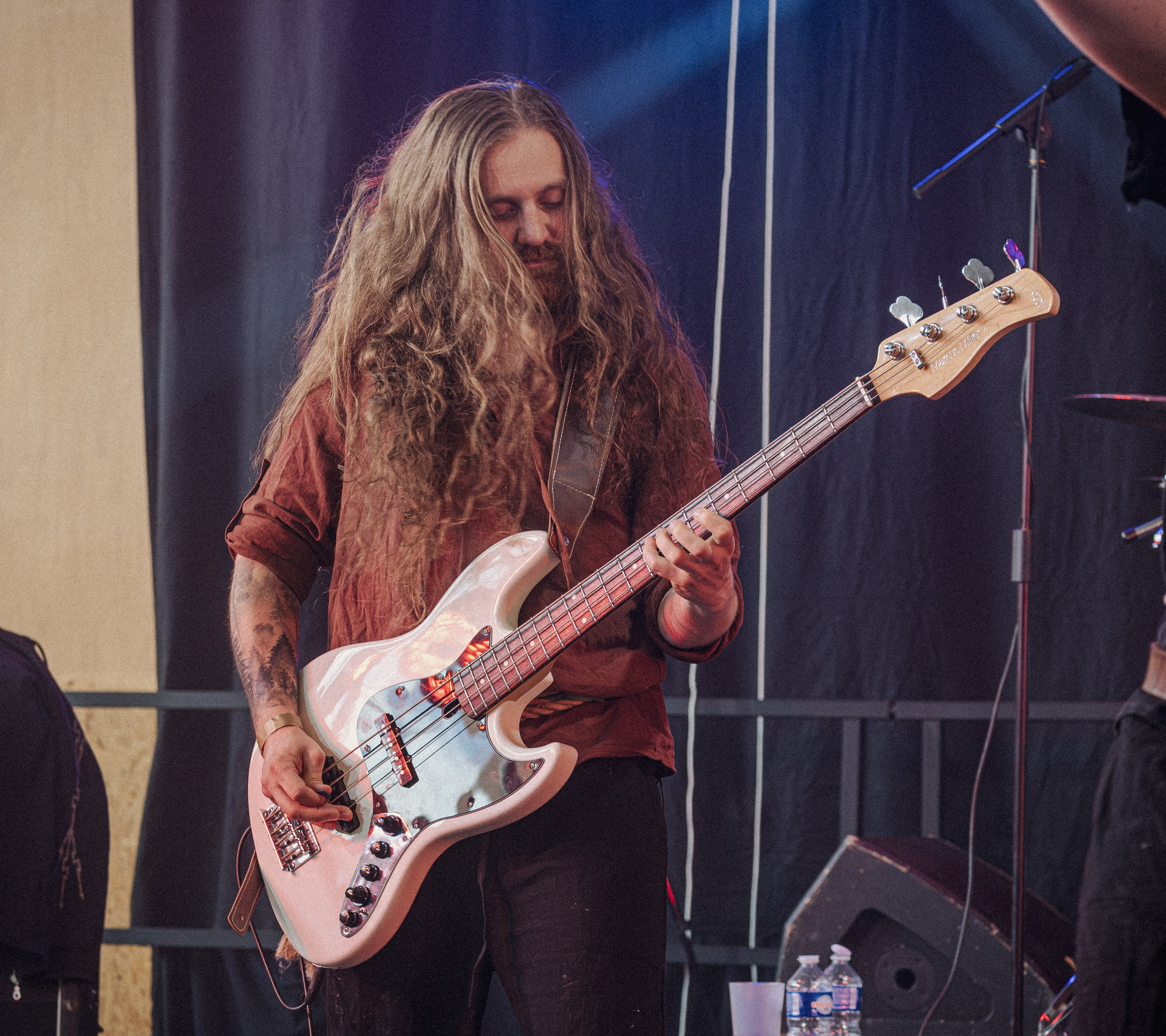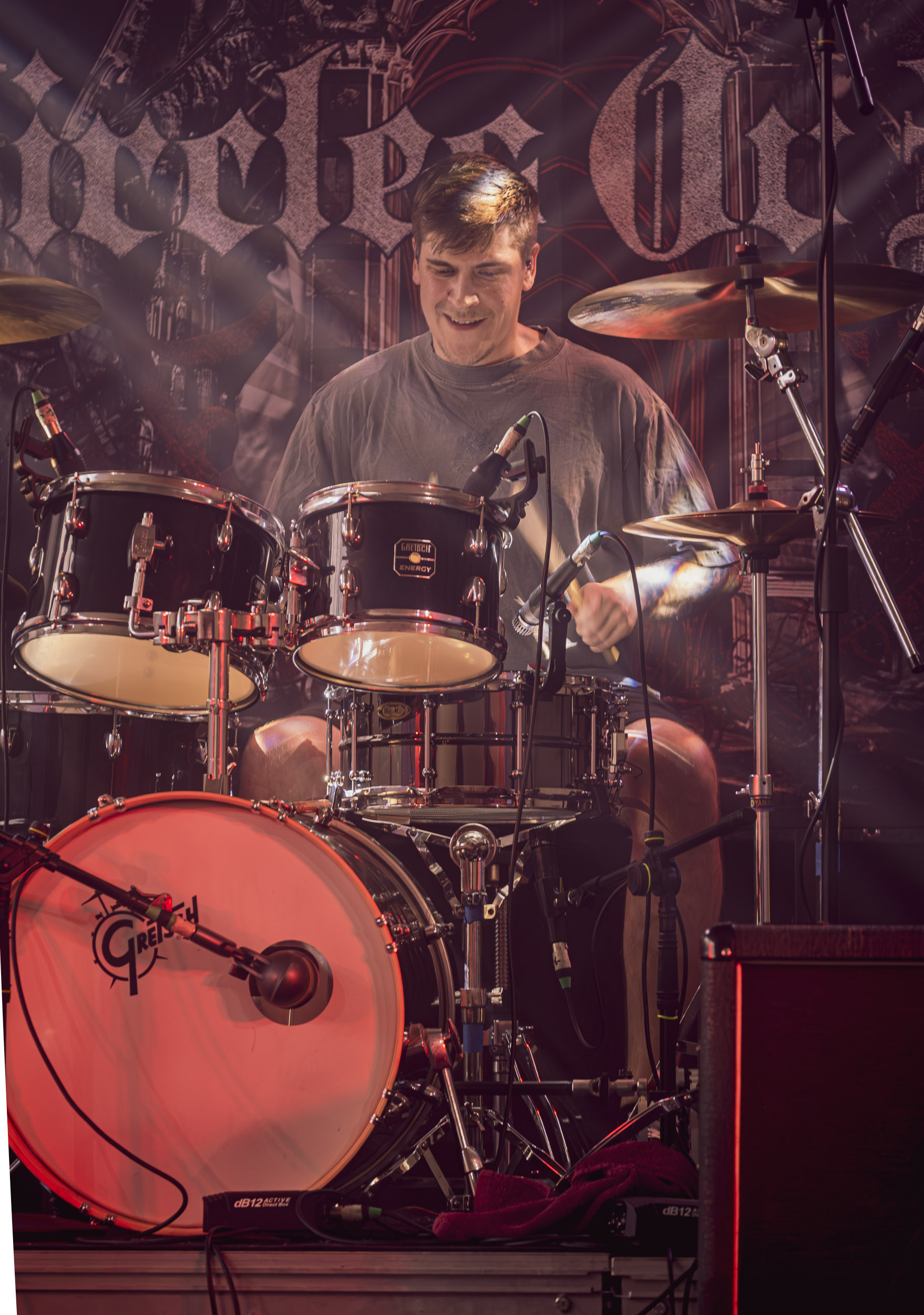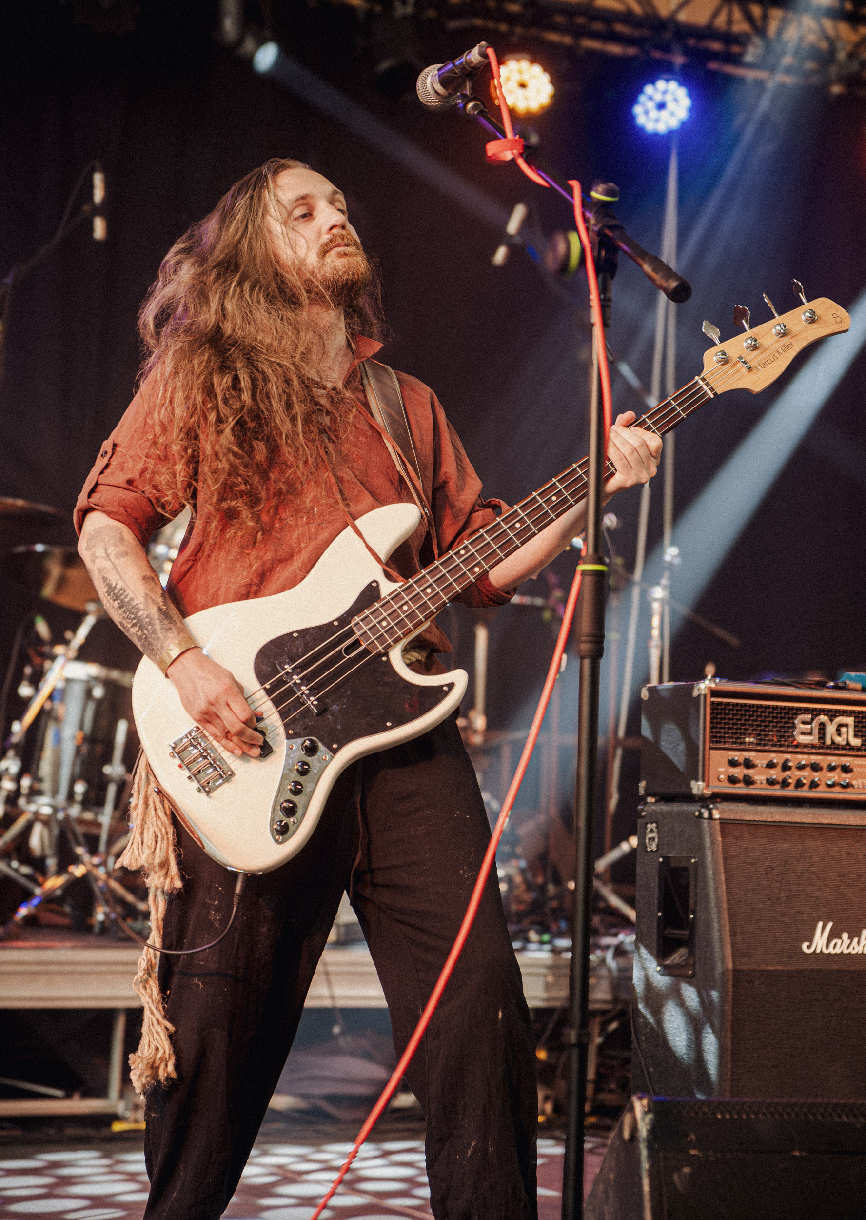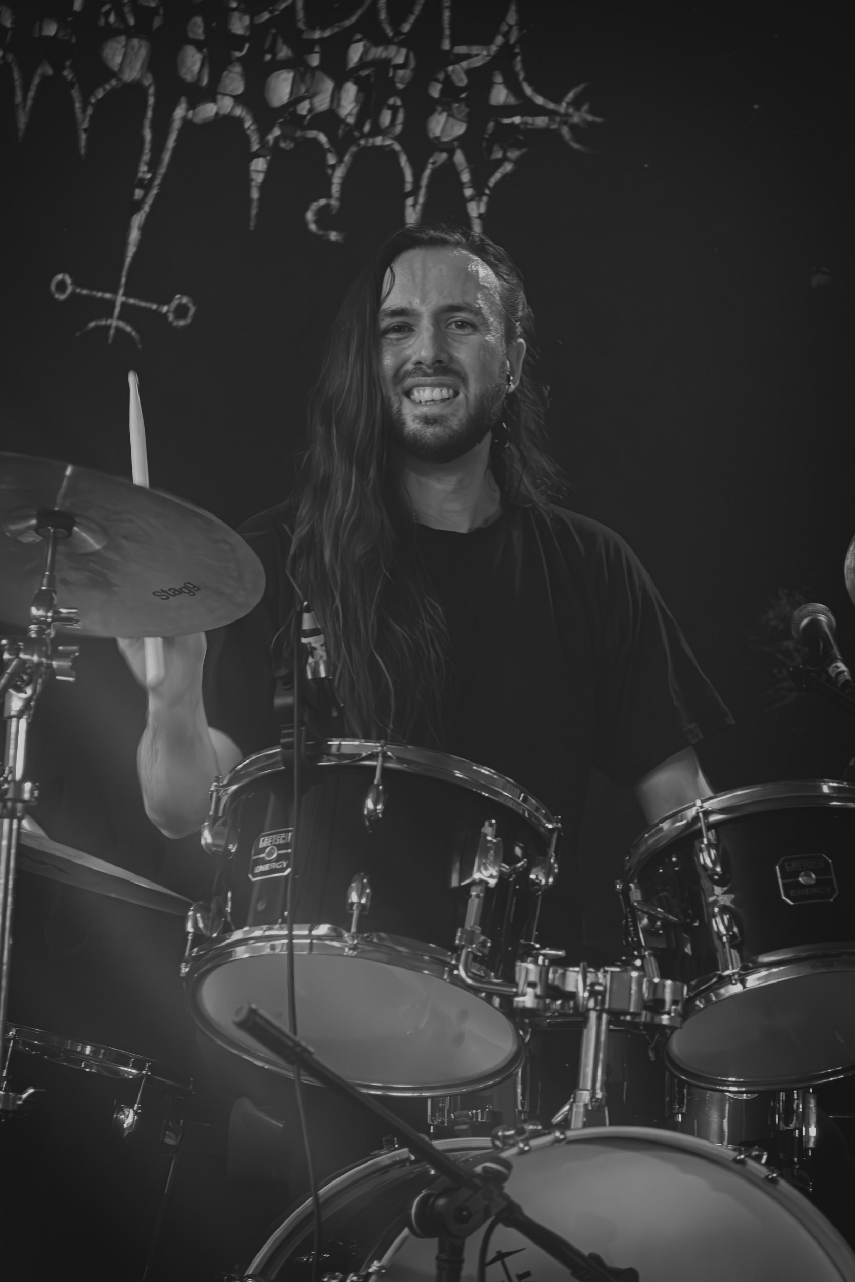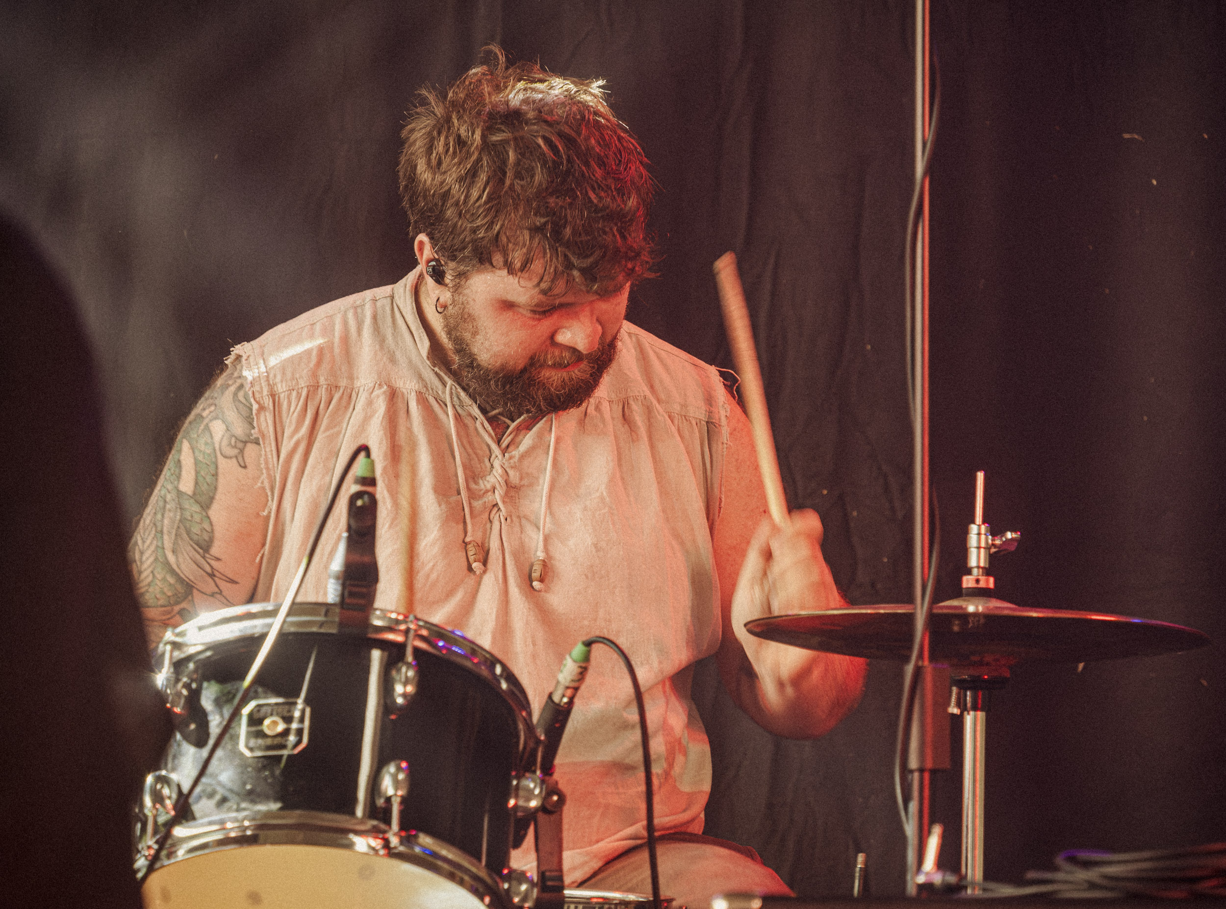 Après avoir dû annuler sa venue à l’édition 2023 du Dark Medieval Fest — son batteur ayant été à ce moment en convalescence suite à une opération —, Boisson Divine rattrape le coup cette année, venu tout droit de sa Gascogne d’origine. Peu de temps après son incursion dans le set d’Himinbjorg, voilà donc Baptiste Labenne de retour sur scène, bien accompagné de ses comparses gascons, pour nous emmener à la découverte du patrimoine folklorique de cette région du sud-ouest de la France plus connue pour son patrimoine viticole. En bons guides touristiques, les musiciens déploient leurs meilleurs atouts au programme de cette visite, à savoir : des morceaux dansants aux textes écrits dans la langue locale — l’occitan — et aux refrains chantés à l’unisson, le tout saupoudré de l’accent chantant qui va avec, beaucoup de solos de guitare, divers instruments folkloriques gérés d’une main et d’un souffle de maître par Pierre Delaporte alias Pereg ar Bagol qui se balade de l’un à l’autre et, surtout, beaucoup d’humour ! « On est désolés d’interrompre votre soirée black metal ! » s’exclame d’ailleurs Baptiste entre deux morceaux. « Et vive le Gers ! » répond à cela un spectateur tout aussi plaisantin ; ce sur quoi le groupe se lance sur le morceau suivant et la fosse dans une danse endiablée. Effectivement, au vu de son aspect festif et jovial, dire que Boisson Divine dénote par rapport aux autres groupes de l’affiche paraît un doux euphémisme ! Comment en vouloir à ces cinq-là, néanmoins, de distiller si généreusement autant de bonne humeur au milieu d’autres univers plus ou moins sombres et extrêmes ? Sur ce point, mention honorable au batteur Adrian Gilles, qui n’oublie pas de sourire à l’objectif !