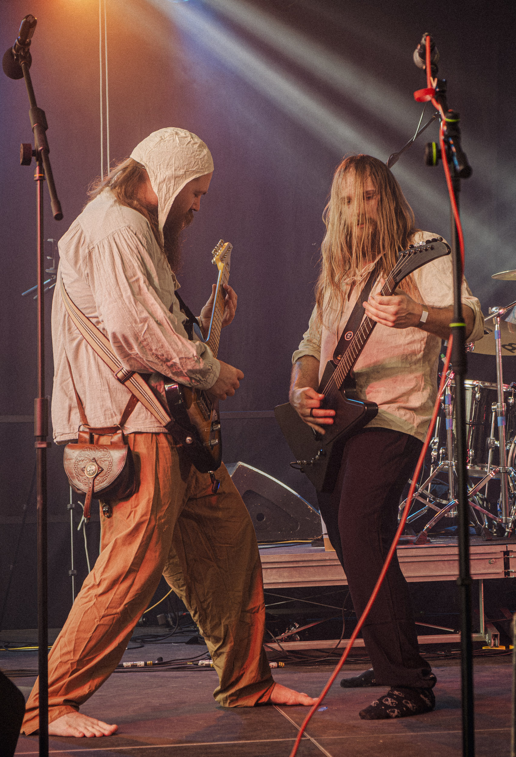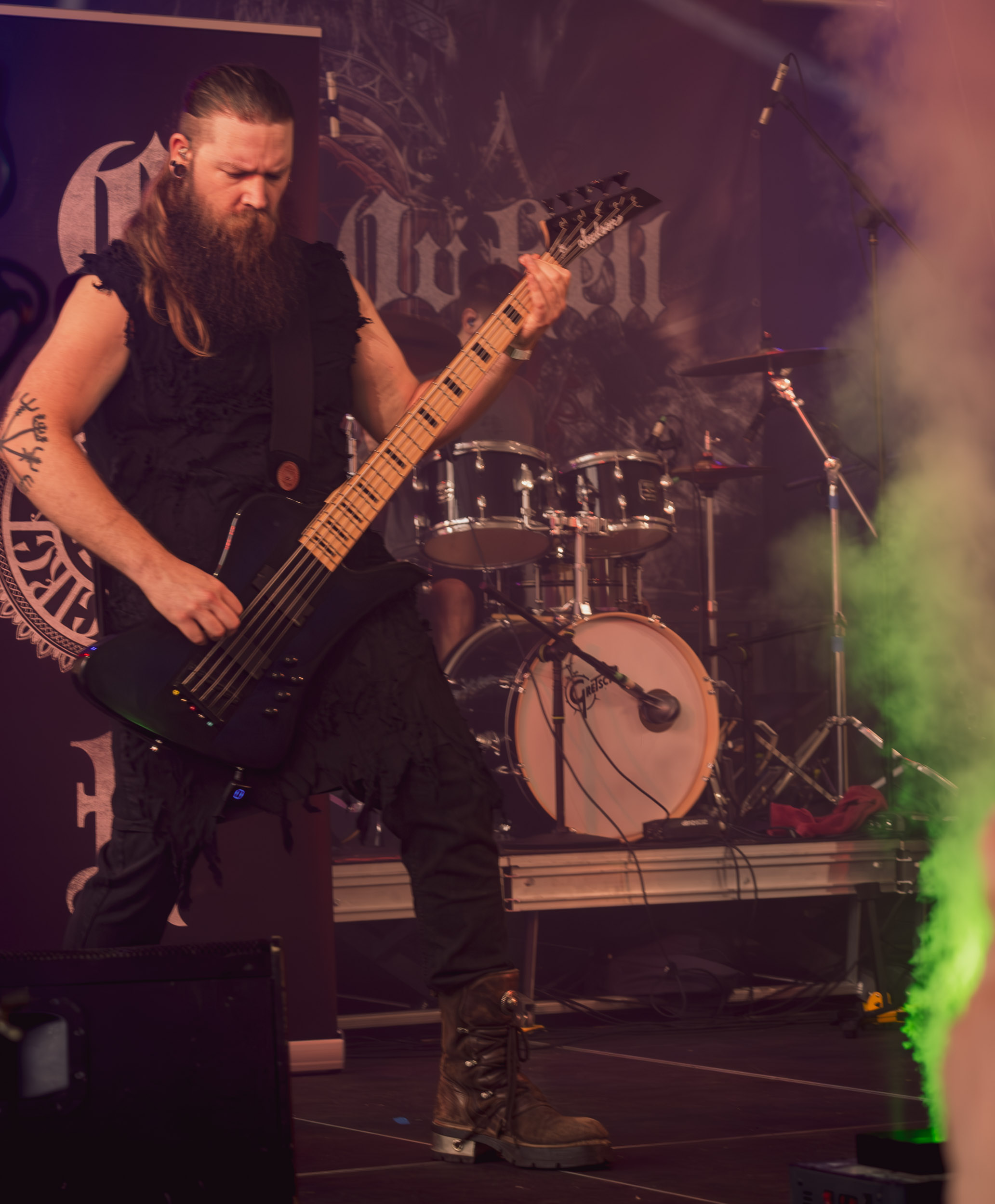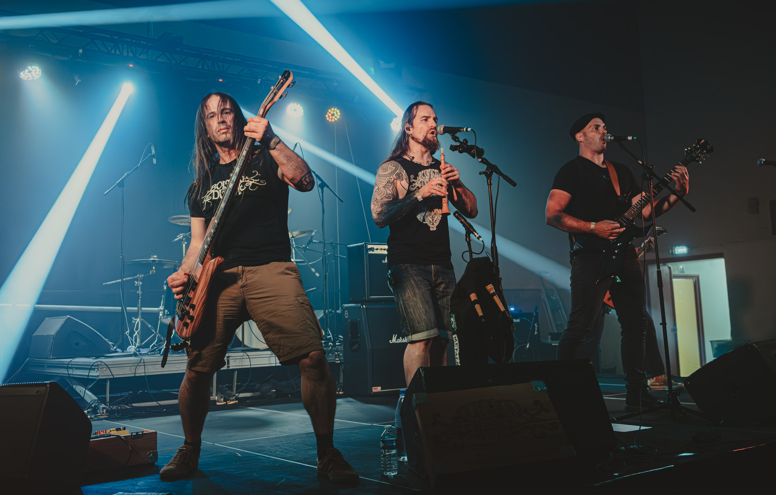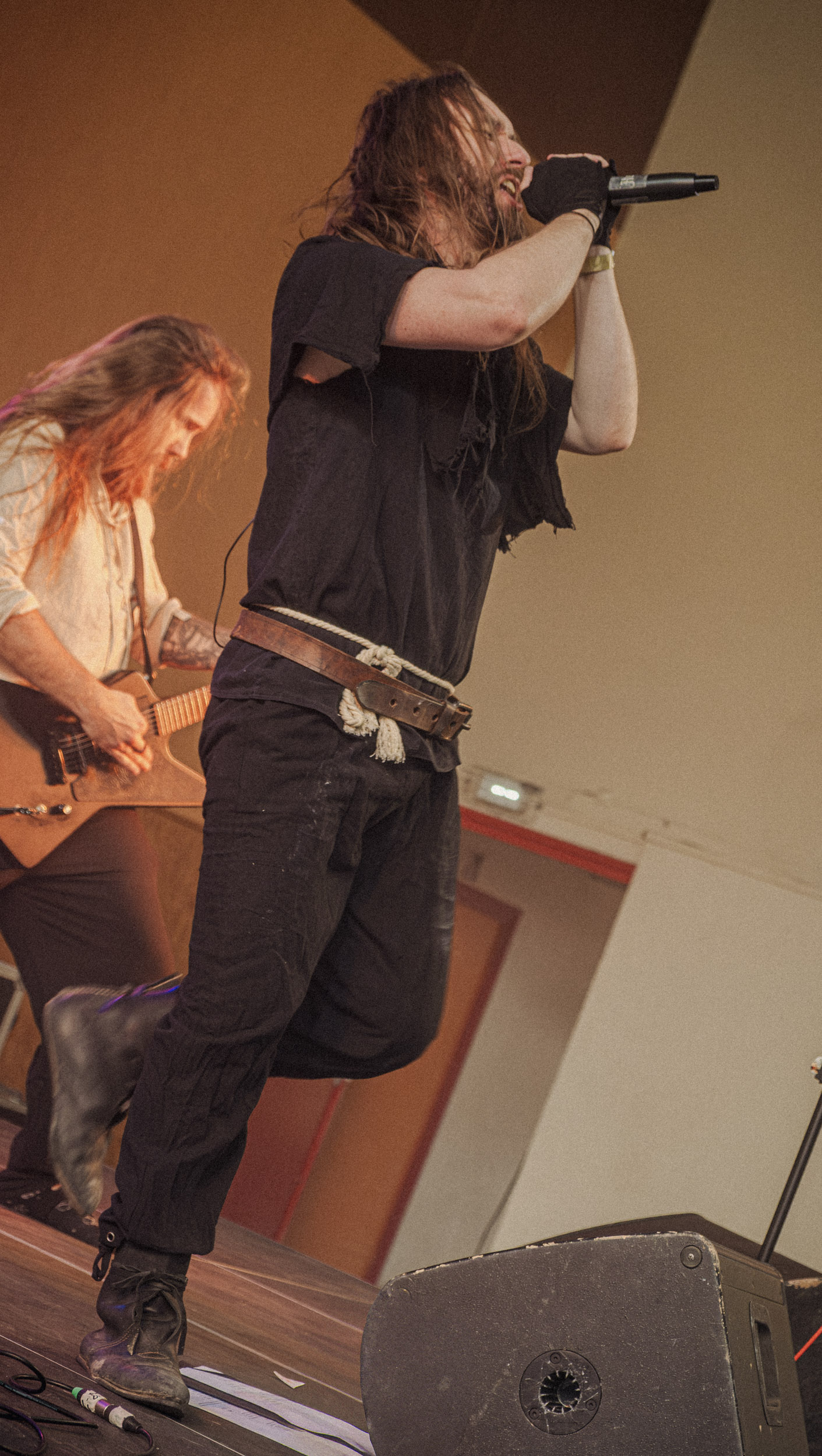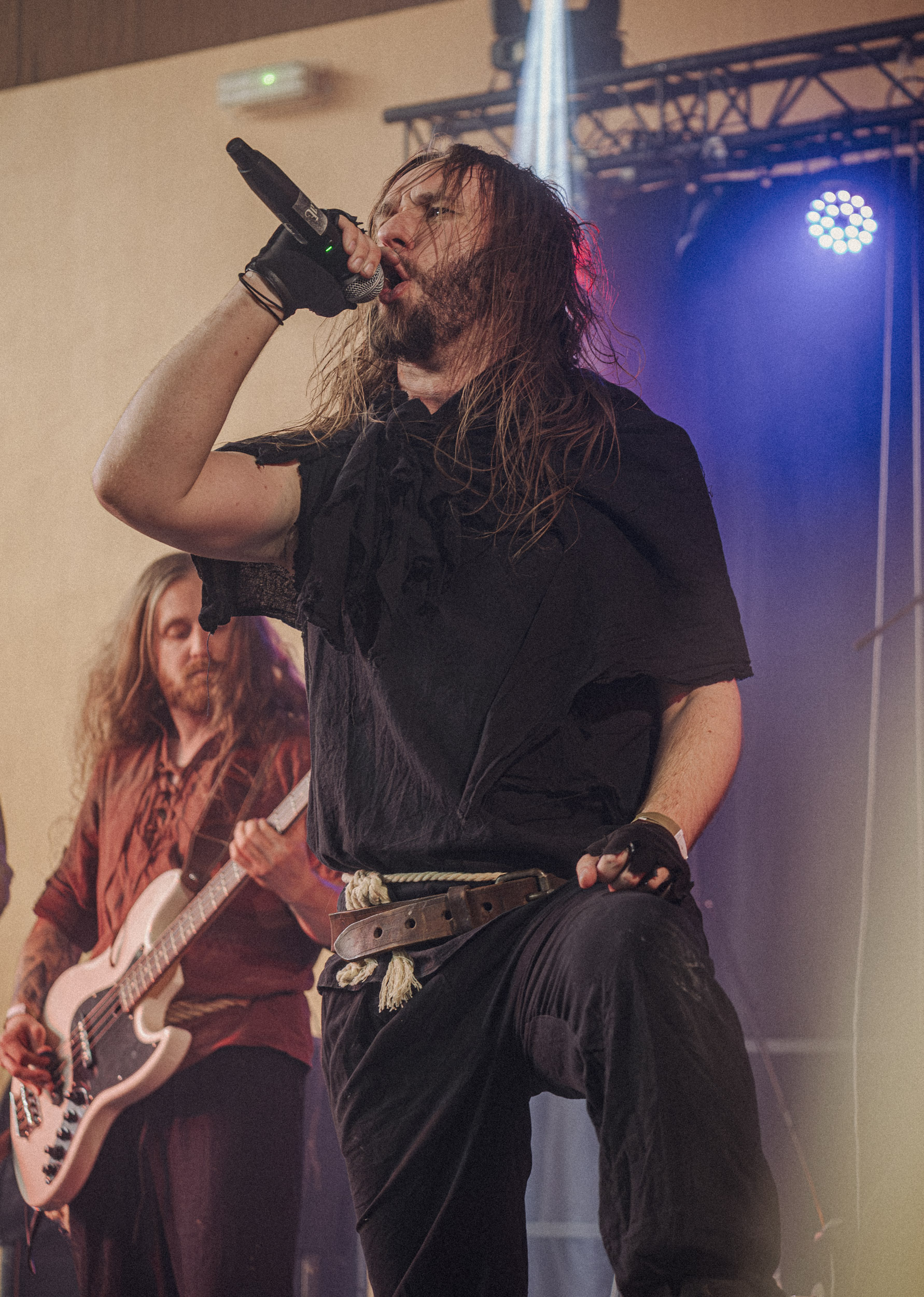 Pour bien des groupes, se retrouver privé d’un de ses membres à quelques semaines d’un concert constitue une bonne raison d’annuler sa prestation — ce qui est tout à fait compréhensible. Tel est à la fois le cas et pas le cas pour Nydvind, qui, face au retrait de son batteur de session deux semaines plus tôt, a décidé malgré cela de maintenir sa présence au Dark Medieval Fest. En dépit de cette fâcheuse déconvenue, le groupe compte bien assurer la promotion de son nouvel et quatrième album sorti en mars dernier, Tetramental II – Telluria, le meneur Richard Loudin se voulant rassurant. « On fait au mieux ! » assure-t-il dès le début du set, avec un sourire dissimulant tant bien que mal son embarras… Il annonce ensuite que les trois morceaux qui vont suivre sont extraits du nouvel album. À trois sur scène, les musiciens donnent leur maximum en dépit du stress qu’induit la situation et qui se ressent… et leurs efforts paient, les spectateurs accueillant ces nouveautés avec les honneurs ! Un enthousiasme et une chaleur qui font plaisir à voir et contrastent de manière fort intéressante avec le style musical qu’il nous est donné d’entendre. Aux côtés de Nydvind, l’ambiance se prête à la rêverie et à la contemplation, se fait rafraichissante aussi, portée par un pagan metal au tempo lancinant mettant la basse à son cœur et un chant maîtrisé aussi bien en clair qu’en black. Un peu plus tard, Richard annonce un autre morceau, Son of Fire, dédié à un certain Bertrand. J’ignore si le concerné se reconnaît ; en tout cas, le public, lui, apprécie clairement !