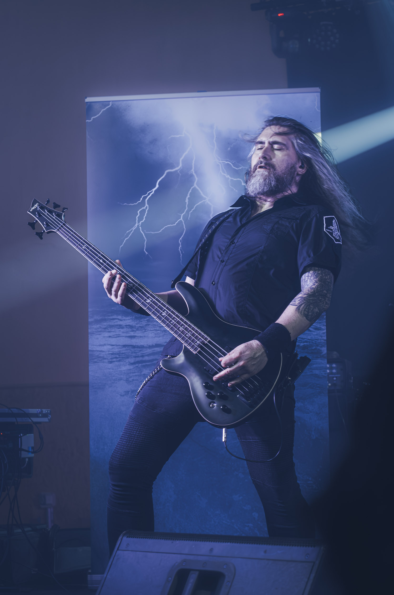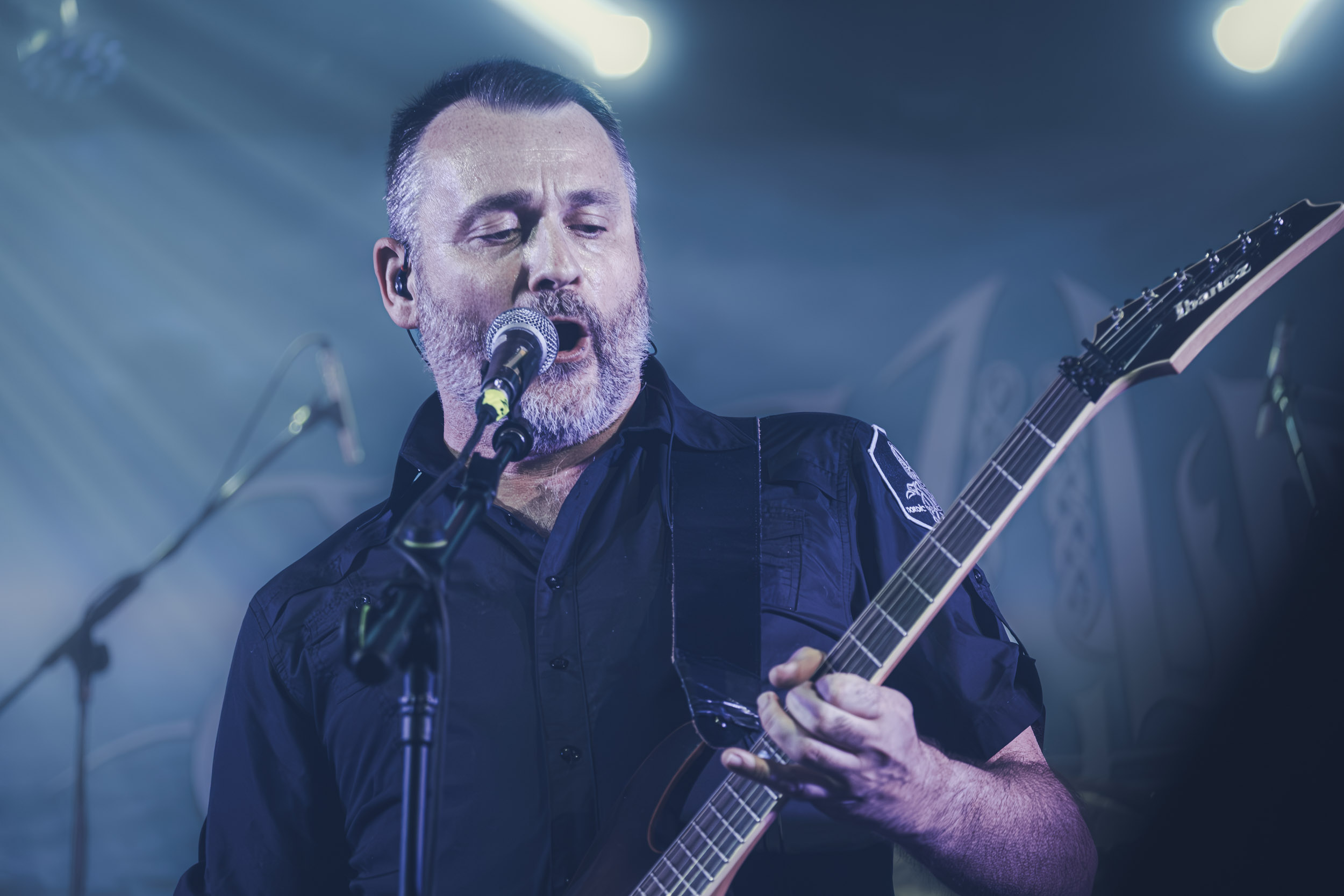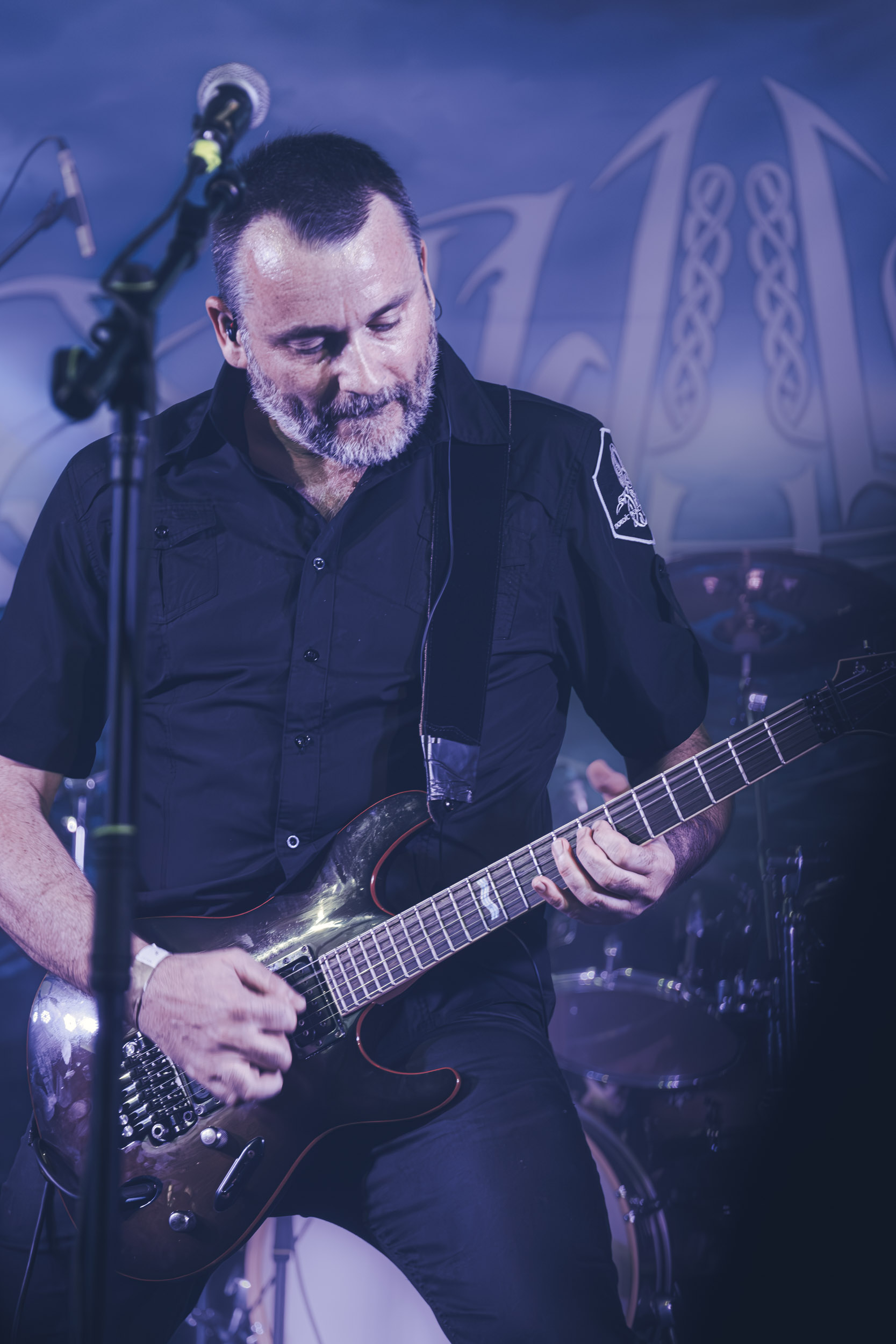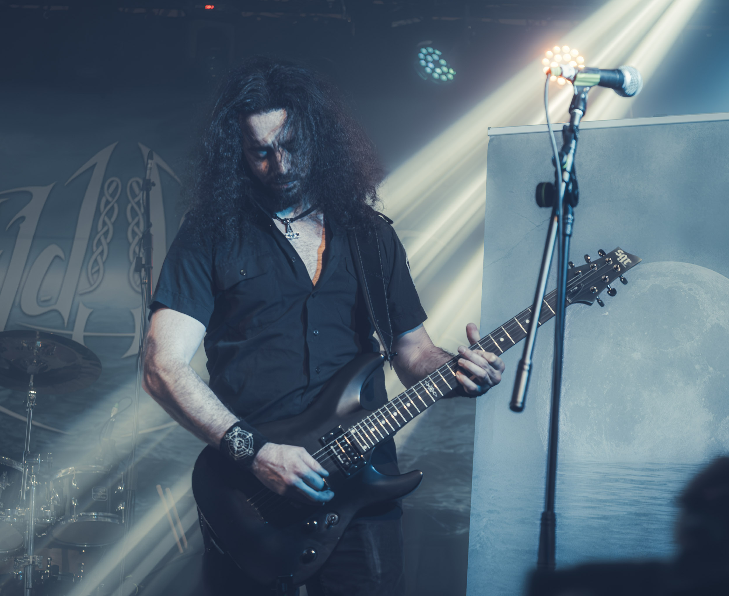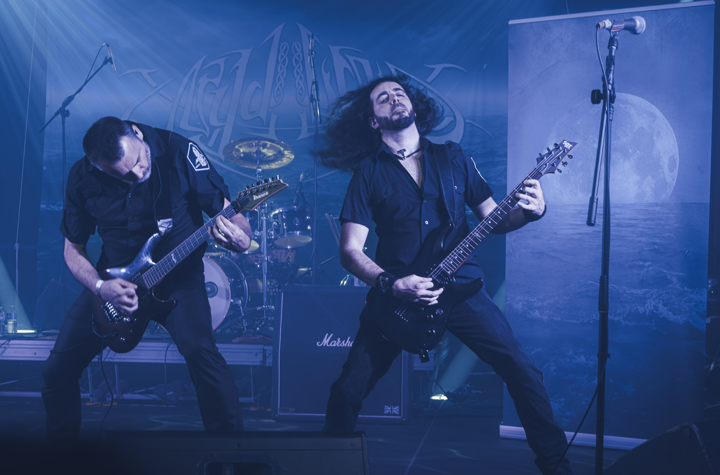 Pour bien des groupes, se retrouver privé d’un de ses membres à quelques semaines d’un concert constitue une bonne raison d’annuler sa prestation — ce qui est tout à fait compréhensible. Tel est à la fois le cas et pas le cas pour Nydvind, qui, face au retrait de son batteur de session deux semaines plus tôt, a décidé malgré cela de maintenir sa présence au Dark Medieval Fest. En dépit de cette fâcheuse déconvenue, le groupe compte bien assurer la promotion de son nouvel et quatrième album sorti en mars dernier, Tetramental II – Telluria, le meneur Richard Loudin se voulant rassurant. « On fait au mieux ! » assure-t-il dès le début du set, avec un sourire dissimulant tant bien que mal son embarras… Il annonce ensuite que les trois morceaux qui vont suivre sont extraits du nouvel album. À trois sur scène, les musiciens donnent leur maximum en dépit du stress qu’induit la situation et qui se ressent… et leurs efforts paient, les spectateurs accueillant ces nouveautés avec les honneurs ! Un enthousiasme et une chaleur qui font plaisir à voir et contrastent de manière fort intéressante avec le style musical qu’il nous est donné d’entendre. Aux côtés de Nydvind, l’ambiance se prête à la rêverie et à la contemplation, se fait rafraichissante aussi, portée par un pagan metal au tempo lancinant mettant la basse à son cœur et un chant maîtrisé aussi bien en clair qu’en black. Un peu plus tard, Richard annonce un autre morceau, Son of Fire, dédié à un certain Bertrand. J’ignore si le concerné se reconnaît ; en tout cas, le public, lui, apprécie clairement !