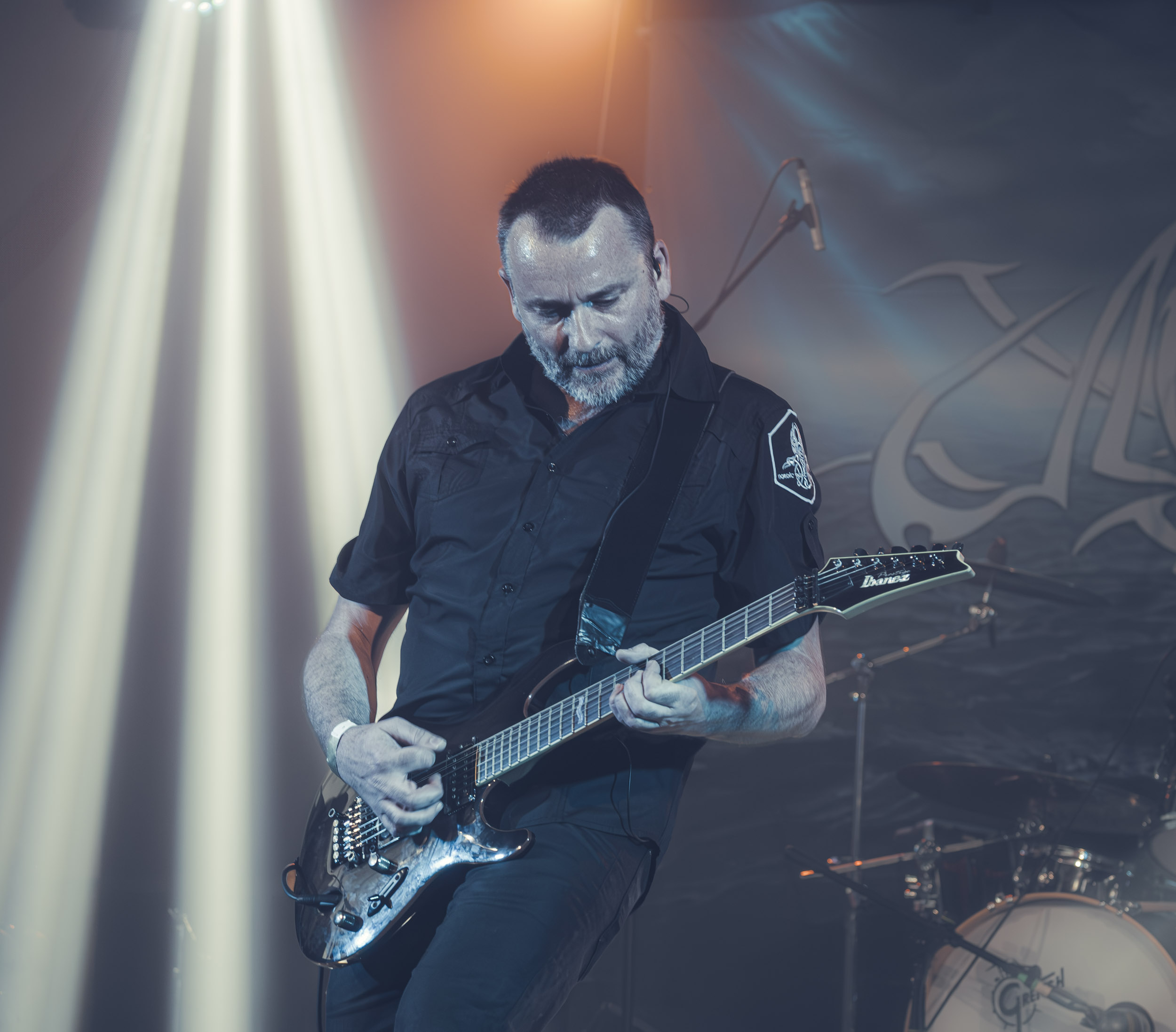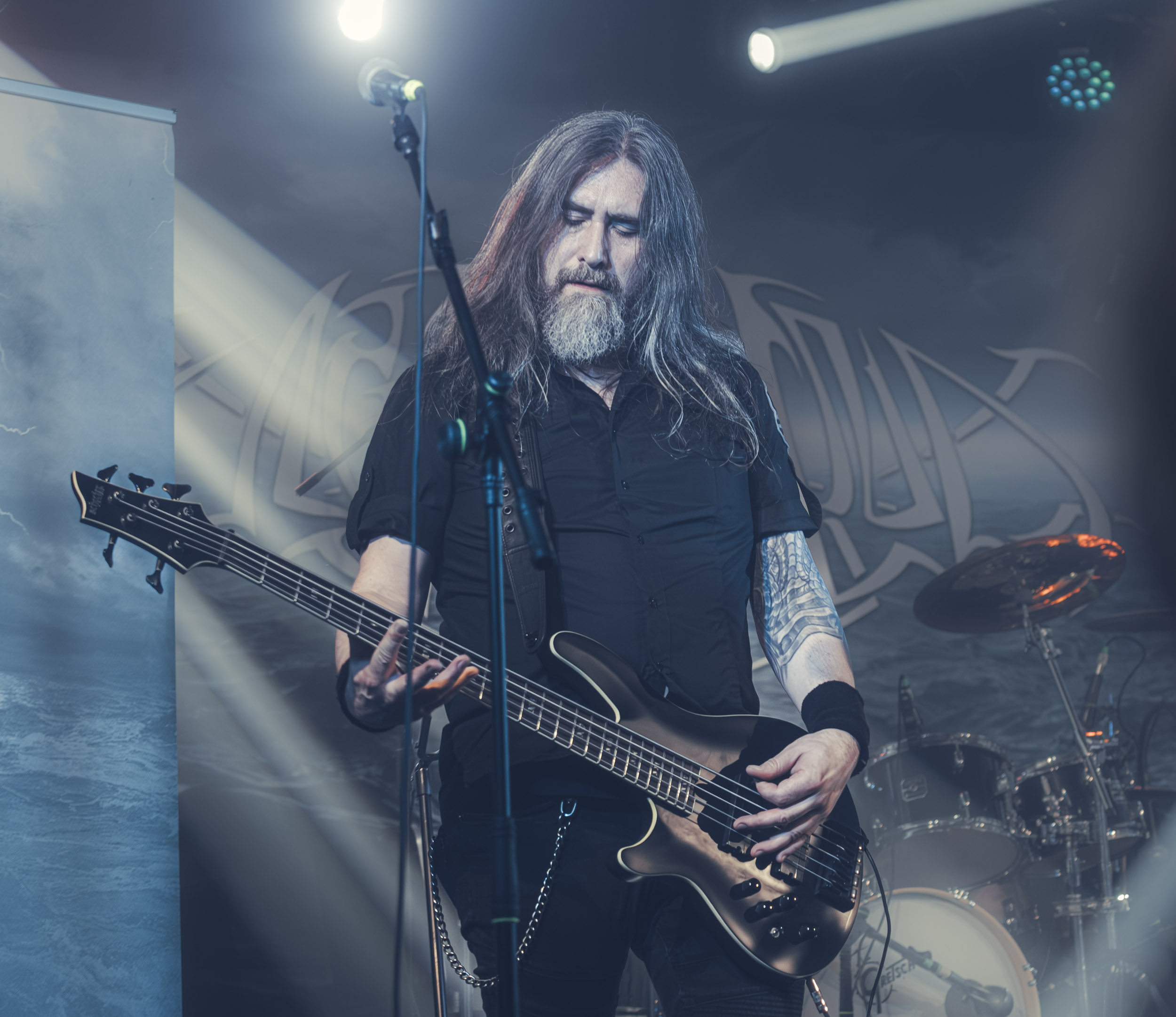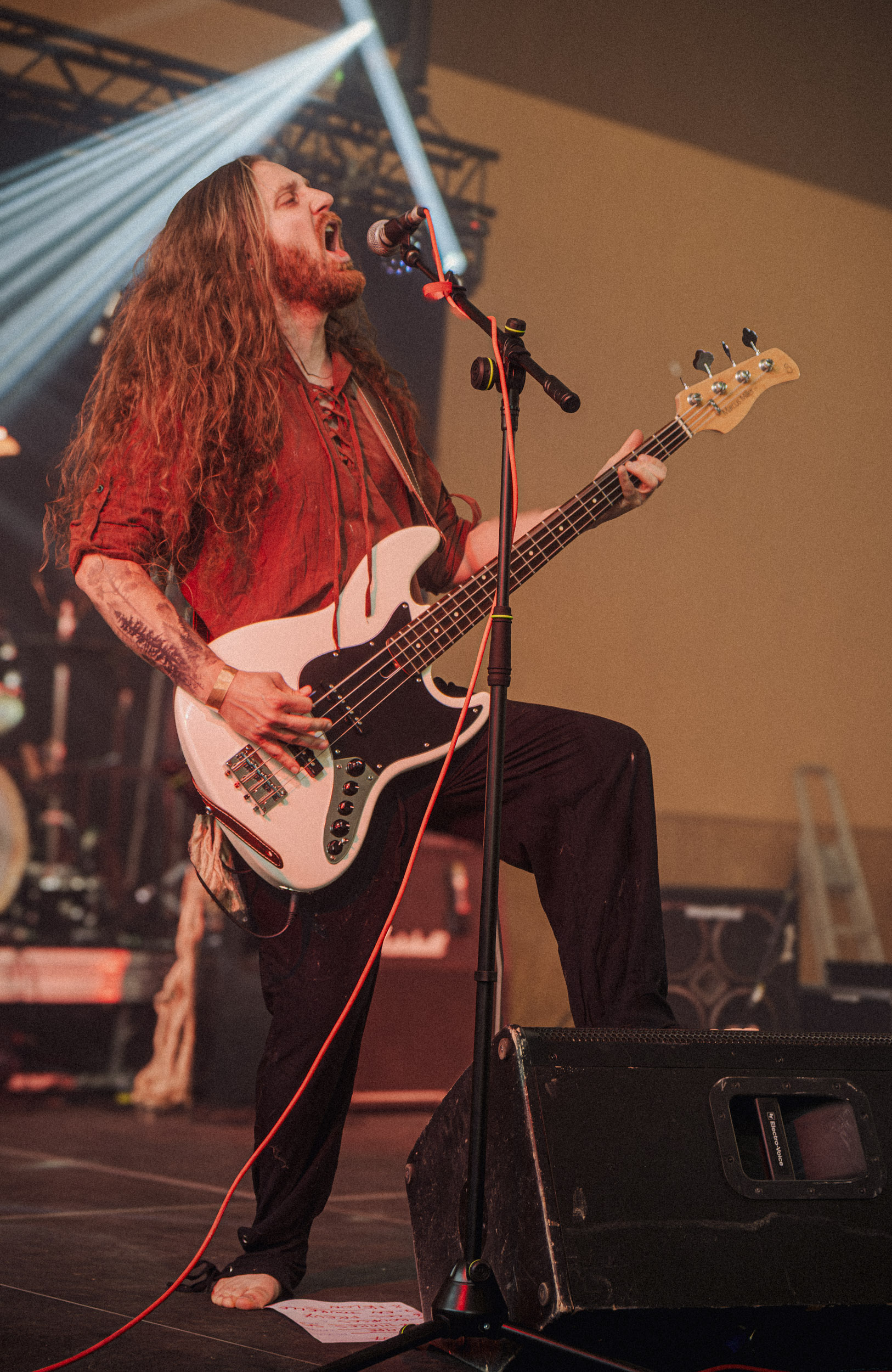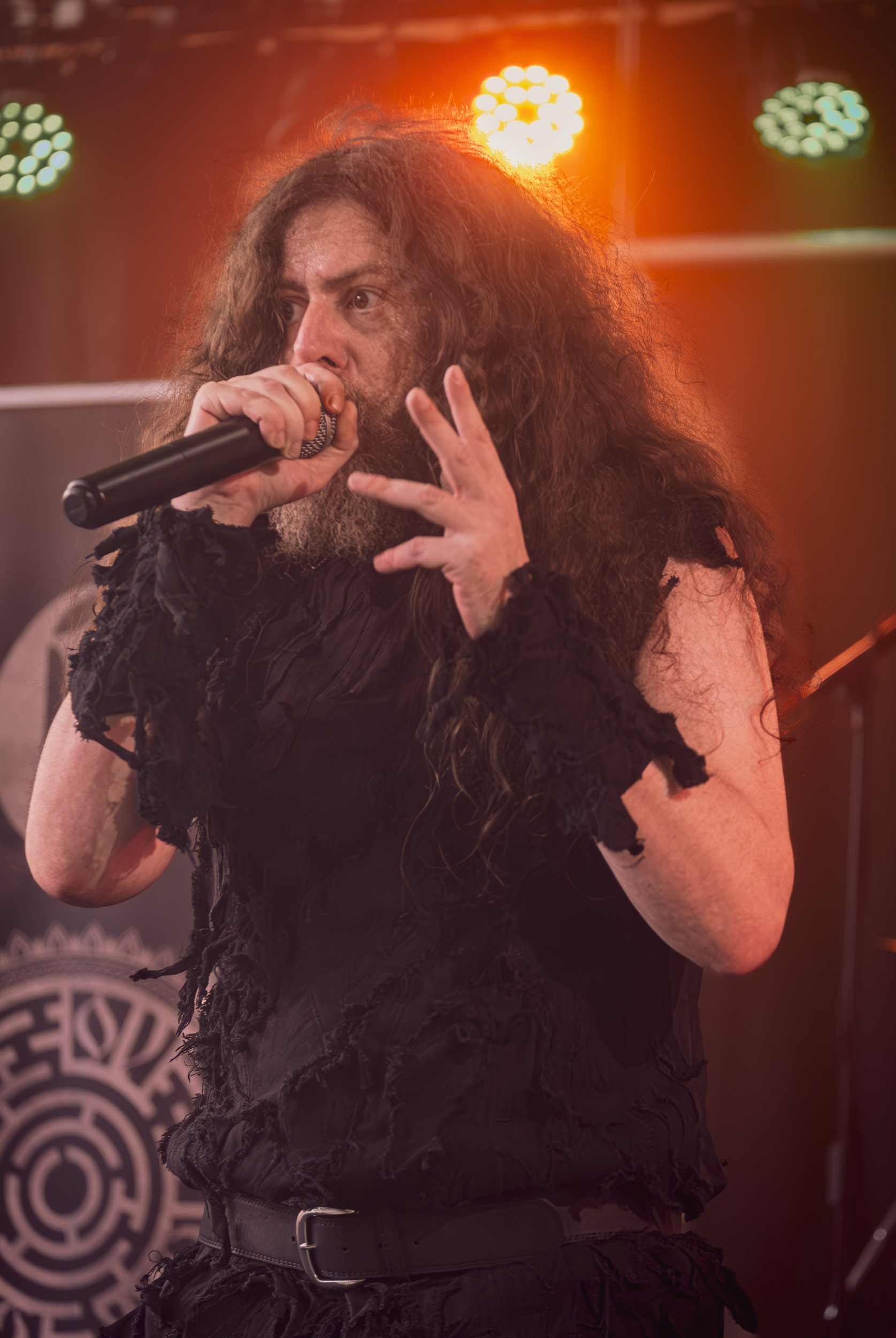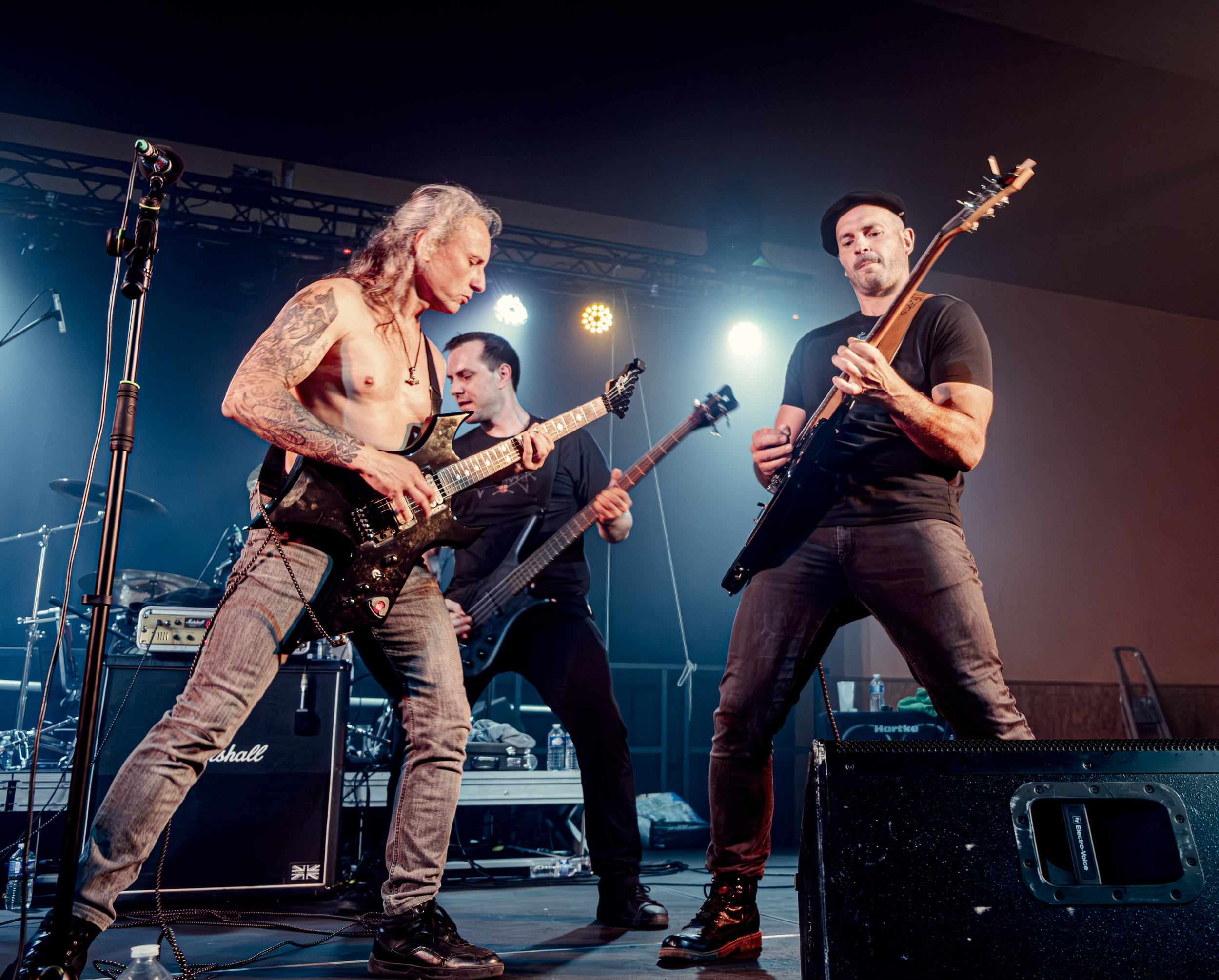 Pour bien des groupes, se retrouver privé d’un de ses membres à quelques semaines d’un concert constitue une bonne raison d’annuler sa prestation — ce qui est tout à fait compréhensible. Tel est à la fois le cas et pas le cas pour Nydvind, qui, face au retrait de son batteur de session deux semaines plus tôt, a décidé malgré cela de maintenir sa présence au Dark Medieval Fest. En dépit de cette fâcheuse déconvenue, le groupe compte bien assurer la promotion de son nouvel et quatrième album sorti en mars dernier, Tetramental II – Telluria, le meneur Richard Loudin se voulant rassurant. « On fait au mieux ! » assure-t-il dès le début du set, avec un sourire dissimulant tant bien que mal son embarras… Il annonce ensuite que les trois morceaux qui vont suivre sont extraits du nouvel album. À trois sur scène, les musiciens donnent leur maximum en dépit du stress qu’induit la situation et qui se ressent… et leurs efforts paient, les spectateurs accueillant ces nouveautés avec les honneurs ! Un enthousiasme et une chaleur qui font plaisir à voir et contrastent de manière fort intéressante avec le style musical qu’il nous est donné d’entendre. Aux côtés de Nydvind, l’ambiance se prête à la rêverie et à la contemplation, se fait rafraichissante aussi, portée par un pagan metal au tempo lancinant mettant la basse à son cœur et un chant maîtrisé aussi bien en clair qu’en black. Un peu plus tard, Richard annonce un autre morceau, Son of Fire, dédié à un certain Bertrand. J’ignore si le concerné se reconnaît ; en tout cas, le public, lui, apprécie clairement !