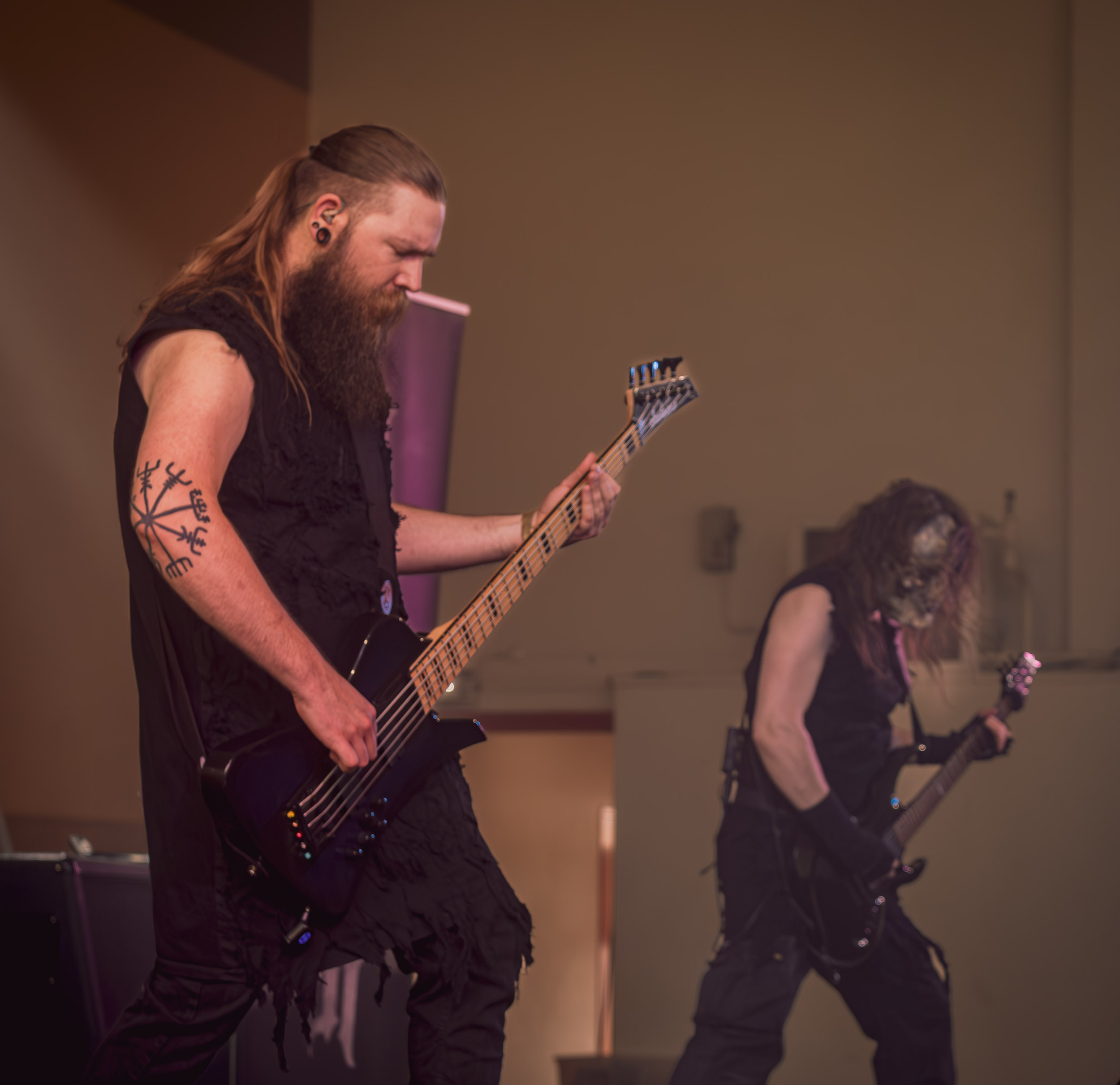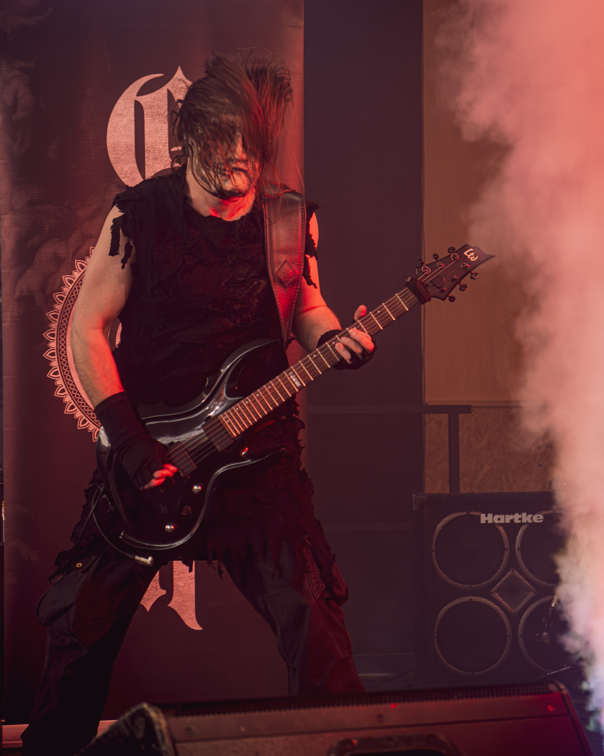 Himinbjorg succède sur les planches, second représentant de la région Rhône-Alpes et dont je sais de sources sûres qu’il constitue la principale raison pour de nombreux spectateurs parmi ceux présents d’assister à cette édition du Dark Medieval Fest. Les fans les plus fidèles du groupe ont d’emblée la surprise d’observer un petit changement dans sa configuration, le meneur Zahaah ayant troqué son habituelle basse pour une guitare. Une autre nouveauté, plus conséquente celle-ci, réside dans la sortie en septembre 2024 d’un nouvel et dixième album, The Fall of Valhalla, dont le premier extrait intégrant la setlist, Dogma, passe l’épreuve du live avec les honneurs. Ceci, après un début de set plutôt calme, rythmé par les encouragements de quelques festivaliers familiers du groupe — et, visiblement, en particulier de son batteur Kahos. Qui cela étonne-t-il, de la part d’une valeur aussi sûre que l’est Himinbjorg au sein de la scène black/pagan rhônalpine ? Tirant sa force de ce style qu’il pratique dans un registre guerrier, le groupe montre qu’il la tient aussi du professionnalisme de ses membres, qui mettent autant de minutie dans l’exécution que dans les balances, qui ont d’ailleurs pris un certain temps pour cette raison. Ils ne font pour autant pas rimer rigueur avec rigidité ; j’en veux pour preuve le sens de l’humour dont fait montre Zahaah à tout bout de champ, comme lorsqu’il part dans un rire démoniaque au milieu d’un morceau ou lors de ses interactions avec le public rythmées par ses plaisanteries. Parmi elles, une concernant sa guitare vieille de plus de trente ans, qui commencerait à se désaccorder au motif qu’il n’en aurait « rien à branler »… Ces intermèdes humoristiques apparaissent comme des escales ponctuant le voyage dans le passé dans lequel Himinbjorg nous emmène. Ce passé est autant celui de la Scandinavie, dont le groupe a fait sa marque de fabrique, que le sien propre, au travers de morceaux plus ou moins anciens de sa carrière. Parmi eux, citons Death of a King, issu de Golden Age dont le vingtième anniversaire n’est encore pas si loin derrière, ou encore Rising, sorti en 2000 sur l’album In the Raven’s Shadow. Autant dire que ces « vieux » titres ont vieilli comme du bon vin !