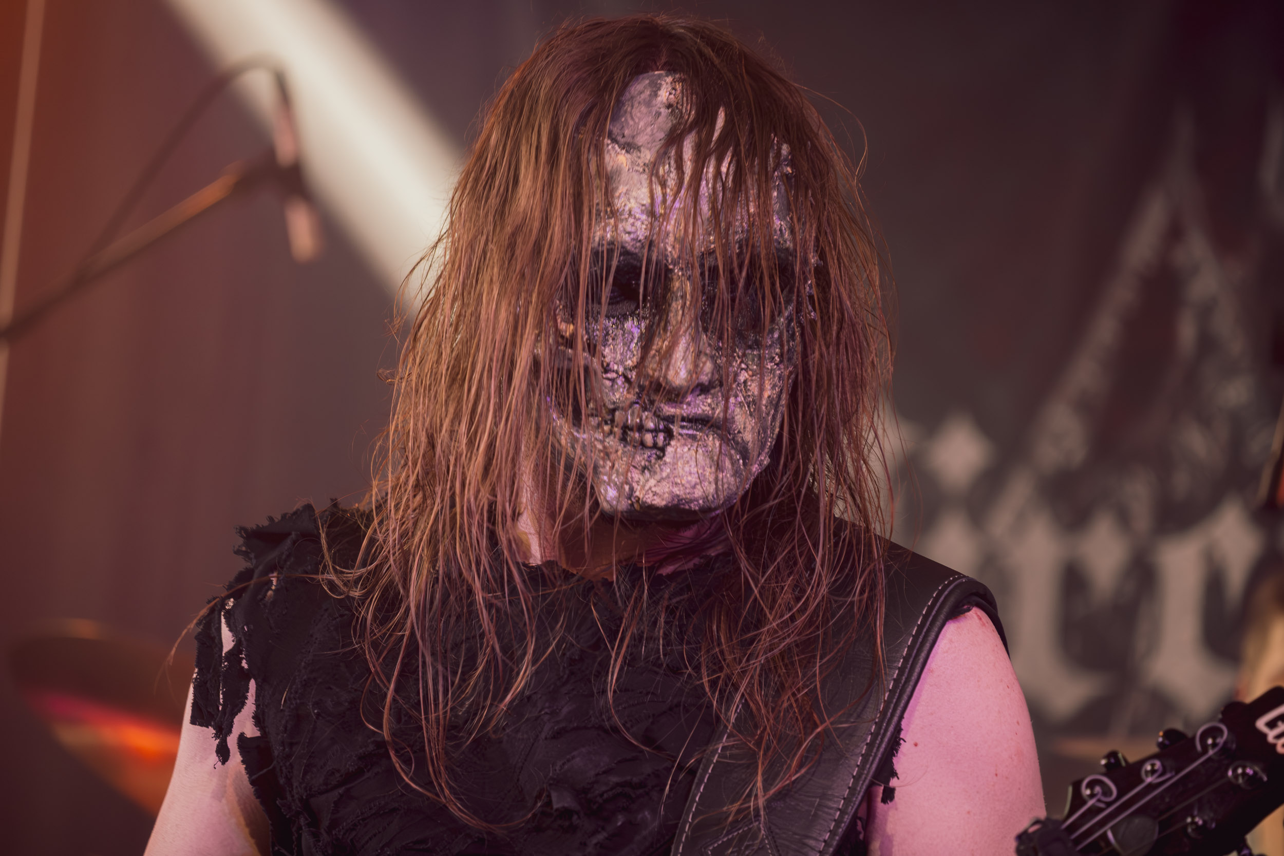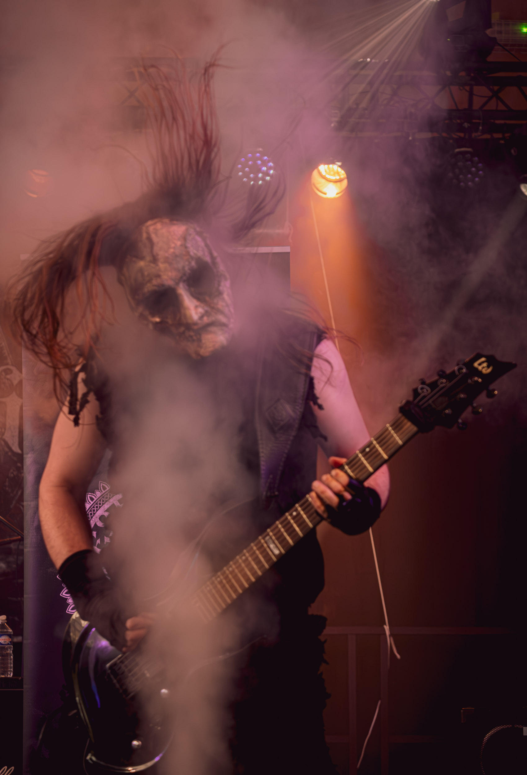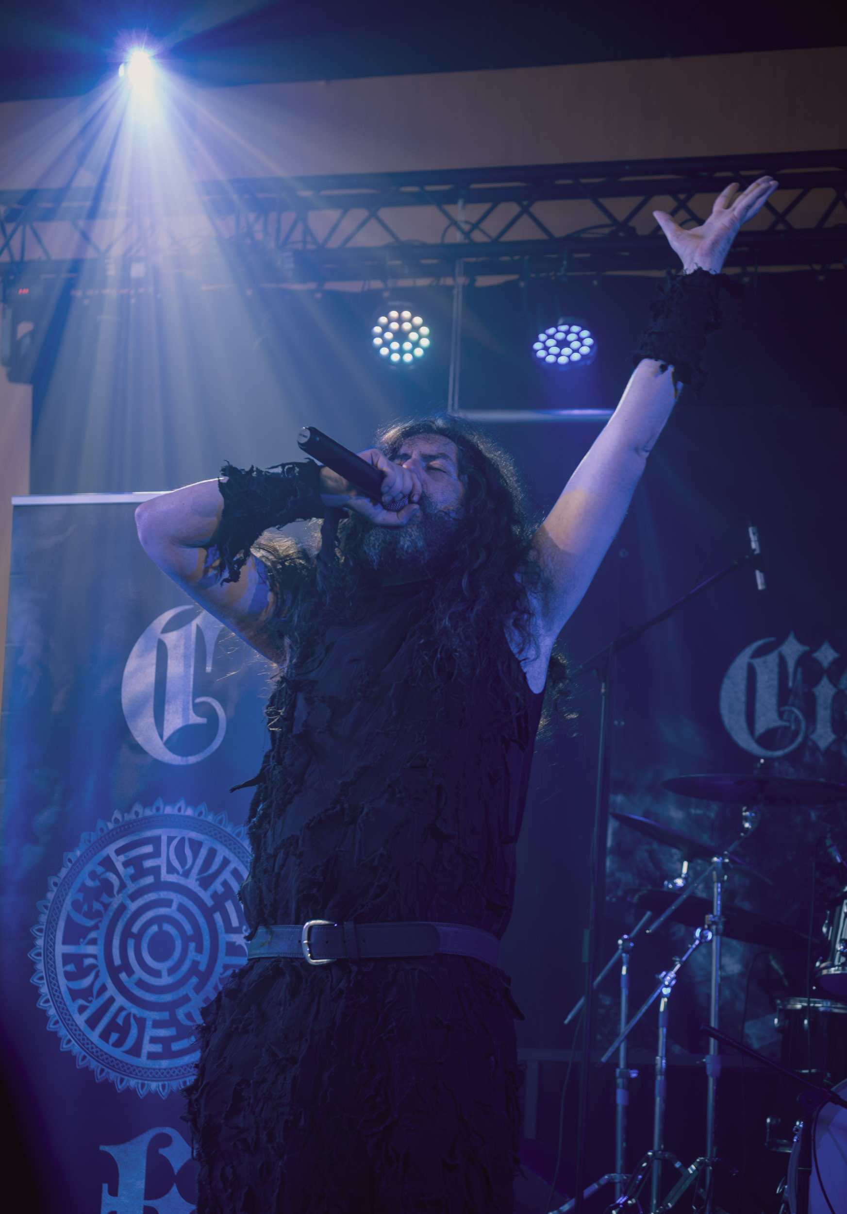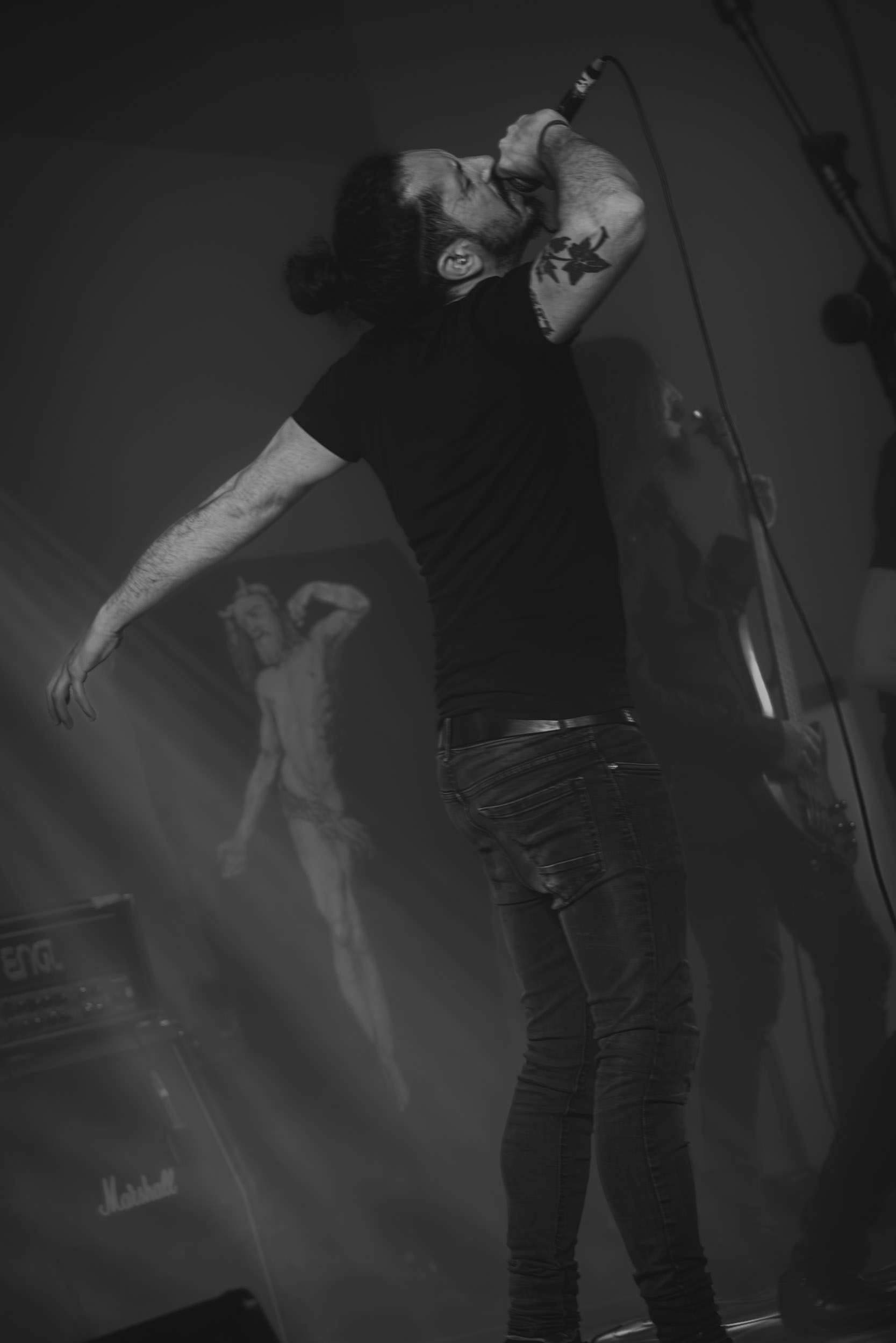 Le Dark Medieval Fest se poursuit sous des augures toujours aussi sombres, voire monte d’un cran à ce niveau, avec Circles ov Hell, second groupe issu du roaster du label Heart of Metal. C’est ainsi qu’une poignée d’heures après la prestation de Vils Gueux, les deux fondateurs, Damien Prunier et Nicolas Foucault, sont de retour sur scène, le premier officiant cette fois-ci à la basse et le second prenant la guitare, laissant le rôle de frontman à William Wendling alias Kratos Aurion. De même, le black folko-punk appuyant un humour décalé et grossier laisse place à un metal extrême symphonique basé sur la Divine Comédie de Dante Alighieri, la partie consacrée aux Enfers bien évidemment. Autant dire que l’on a ici affaire à une musique très cinématique et dense… peut-être un peu trop pour les capacités sonores d’une salle pluraliste pas forcément adaptée à ce genre de concert, ou même pour les oreilles de certains auditeurs non avertis, un tel style étant par définition peu accessible. Qu’à cela ne tienne, les quatre membres du groupe mettent toute leur application à retranscrire divers chapitres de cette histoire (oc)culte, à commencer par Kratos. Bien que loin de posséder la carrure du dieu de la guerre vidéoludique que ce nom évoque, l’homme à l’épaisse et royale chevelure tient néanmoins de la puissance de son homonyme dans sa voix rauque et éraillée, parfaite pour narrer des contes infernaux… quoi qu’elle semble un peu ténue. Signe d’un état de santé en berne ou d’un mixage trop faible ? Quoi qu’il en soit, on ne peut retirer au frontman la force et la théâtralité de sa performance. De leur côté, les musiciens se font plus discrets — notamment Nicolas, dissimulé derrière un masque et un maquillage noir qui lui donnent une allure de démon —, mais non moins efficaces et impliqués. Le jeune homme à la batterie, musicien de session que je reconnais pour l’avoir vu jouer avec Vosegus lors de l’édition de l’an dernier, montre une fois de plus qu’il a de la hargne à revendre derrière les fûts.