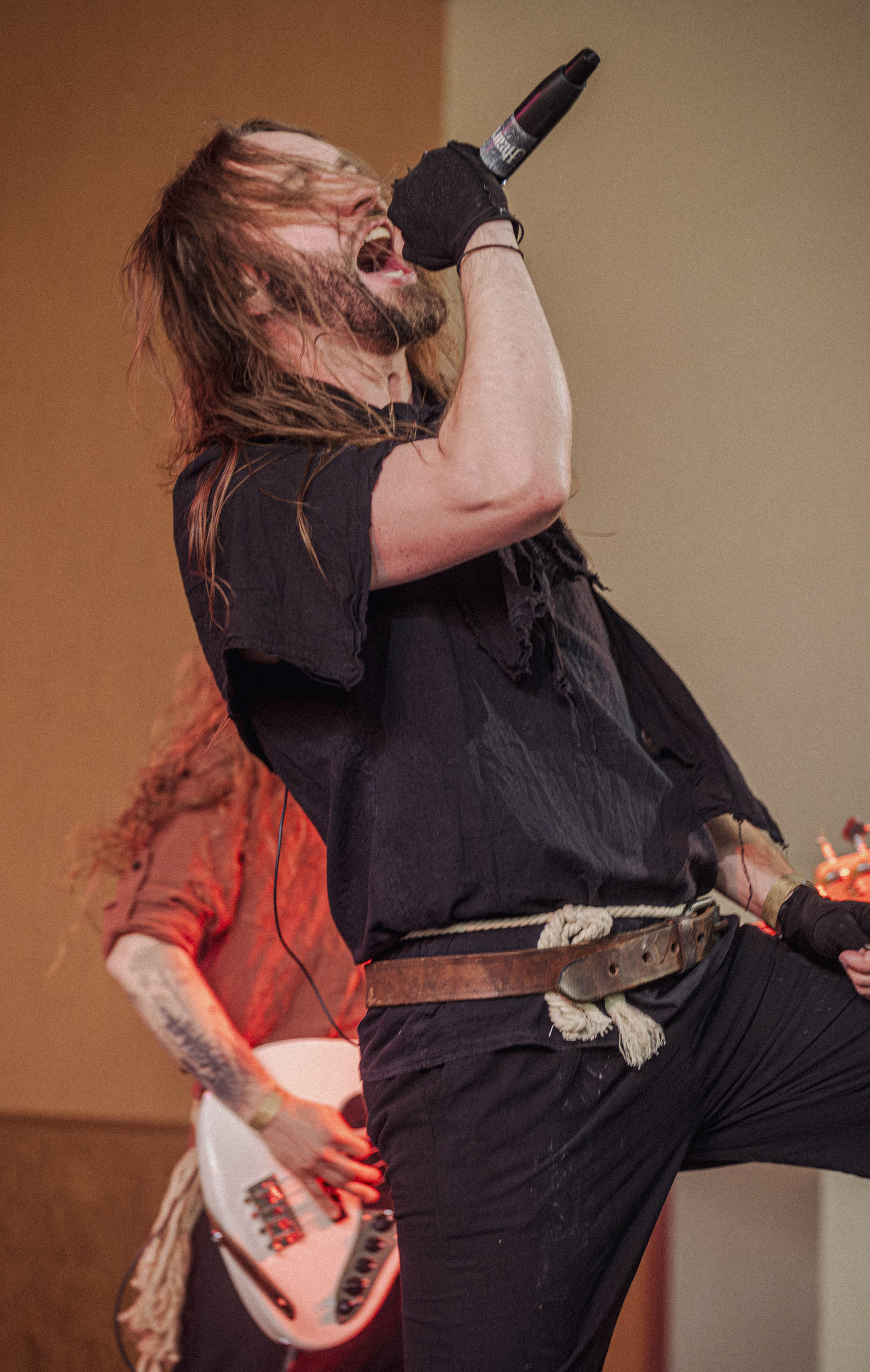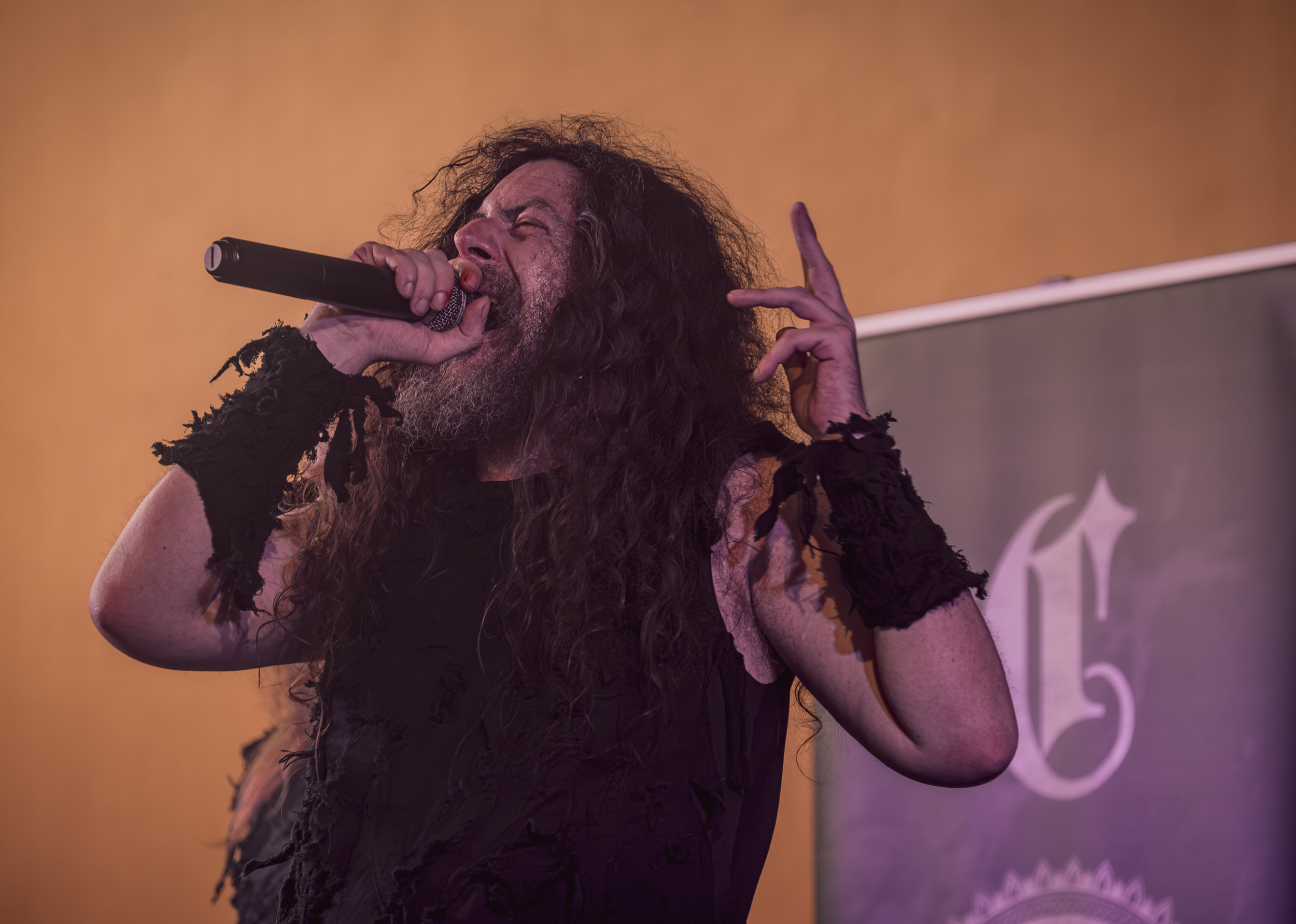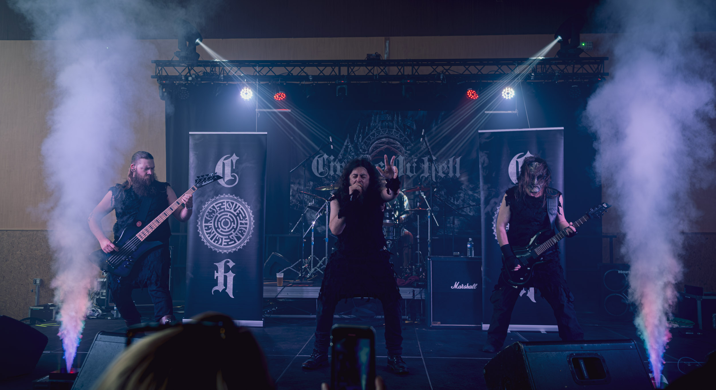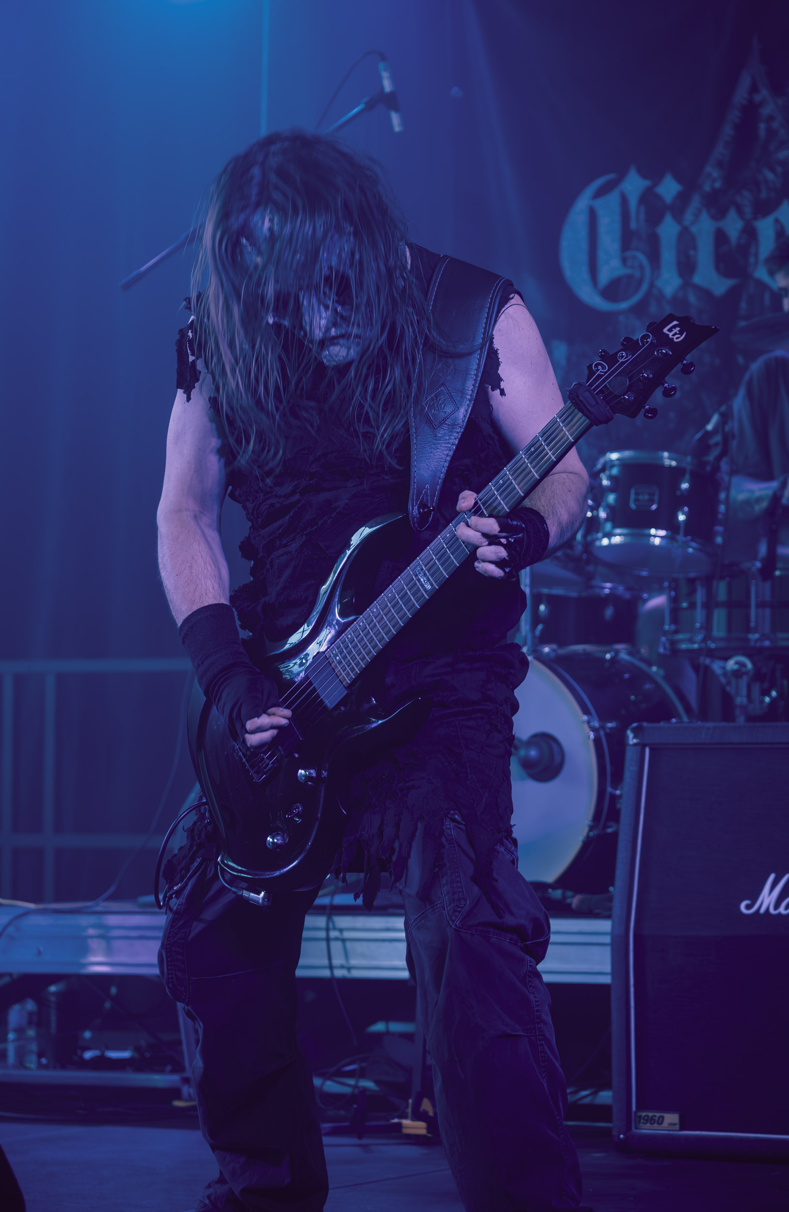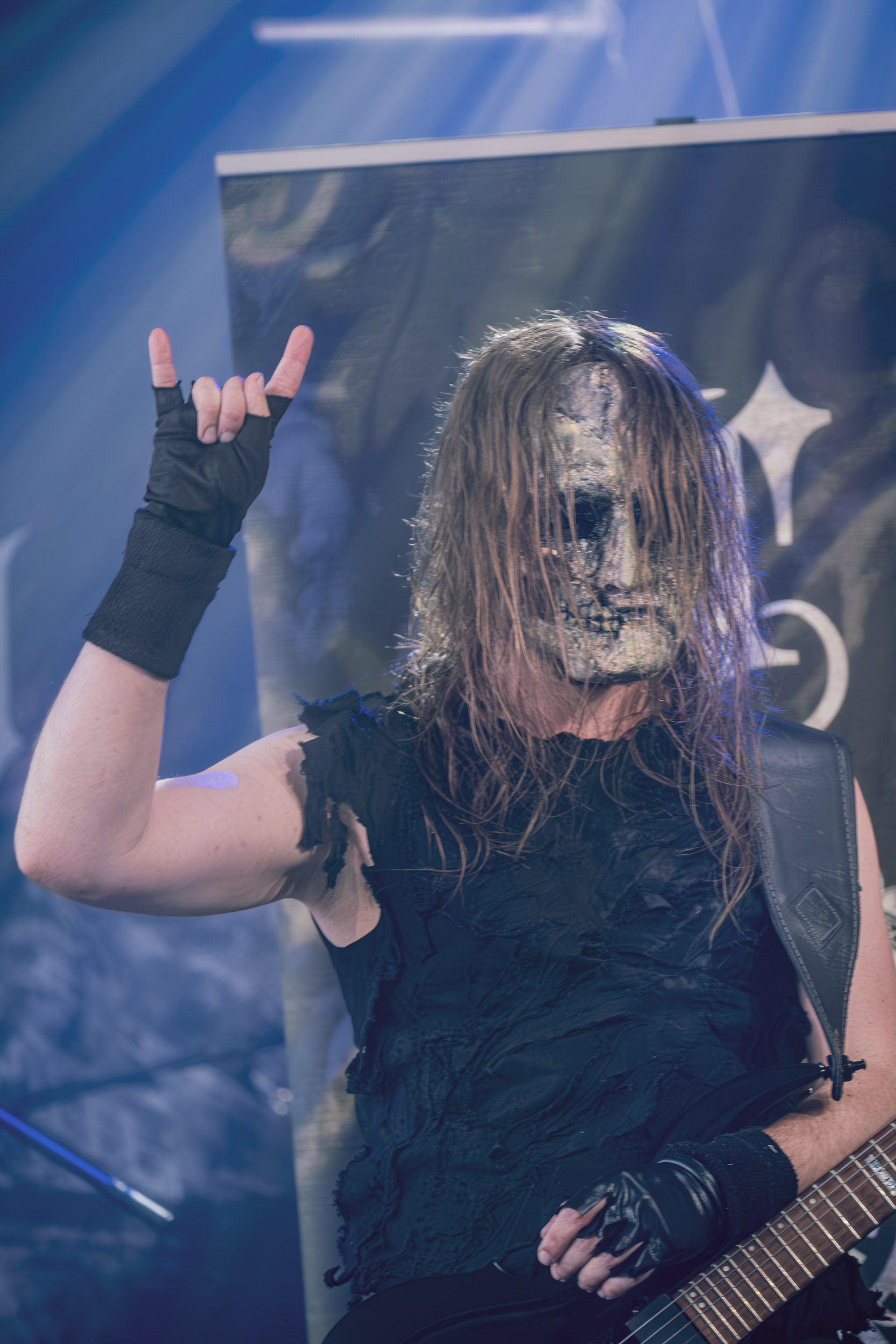 Le Dark Medieval Fest se poursuit sous des augures toujours aussi sombres, voire monte d’un cran à ce niveau, avec Circles ov Hell, second groupe issu du roaster du label Heart of Metal. C’est ainsi qu’une poignée d’heures après la prestation de Vils Gueux, les deux fondateurs, Damien Prunier et Nicolas Foucault, sont de retour sur scène, le premier officiant cette fois-ci à la basse et le second prenant la guitare, laissant le rôle de frontman à William Wendling alias Kratos Aurion. De même, le black folko-punk appuyant un humour décalé et grossier laisse place à un metal extrême symphonique basé sur la Divine Comédie de Dante Alighieri, la partie consacrée aux Enfers bien évidemment. Autant dire que l’on a ici affaire à une musique très cinématique et dense… peut-être un peu trop pour les capacités sonores d’une salle pluraliste pas forcément adaptée à ce genre de concert, ou même pour les oreilles de certains auditeurs non avertis, un tel style étant par définition peu accessible. Qu’à cela ne tienne, les quatre membres du groupe mettent toute leur application à retranscrire divers chapitres de cette histoire (oc)culte, à commencer par Kratos. Bien que loin de posséder la carrure du dieu de la guerre vidéoludique que ce nom évoque, l’homme à l’épaisse et royale chevelure tient néanmoins de la puissance de son homonyme dans sa voix rauque et éraillée, parfaite pour narrer des contes infernaux… quoi qu’elle semble un peu ténue. Signe d’un état de santé en berne ou d’un mixage trop faible ? Quoi qu’il en soit, on ne peut retirer au frontman la force et la théâtralité de sa performance. De leur côté, les musiciens se font plus discrets — notamment Nicolas, dissimulé derrière un masque et un maquillage noir qui lui donnent une allure de démon —, mais non moins efficaces et impliqués. Le jeune homme à la batterie, musicien de session que je reconnais pour l’avoir vu jouer avec Vosegus lors de l’édition de l’an dernier, montre une fois de plus qu’il a de la hargne à revendre derrière les fûts.