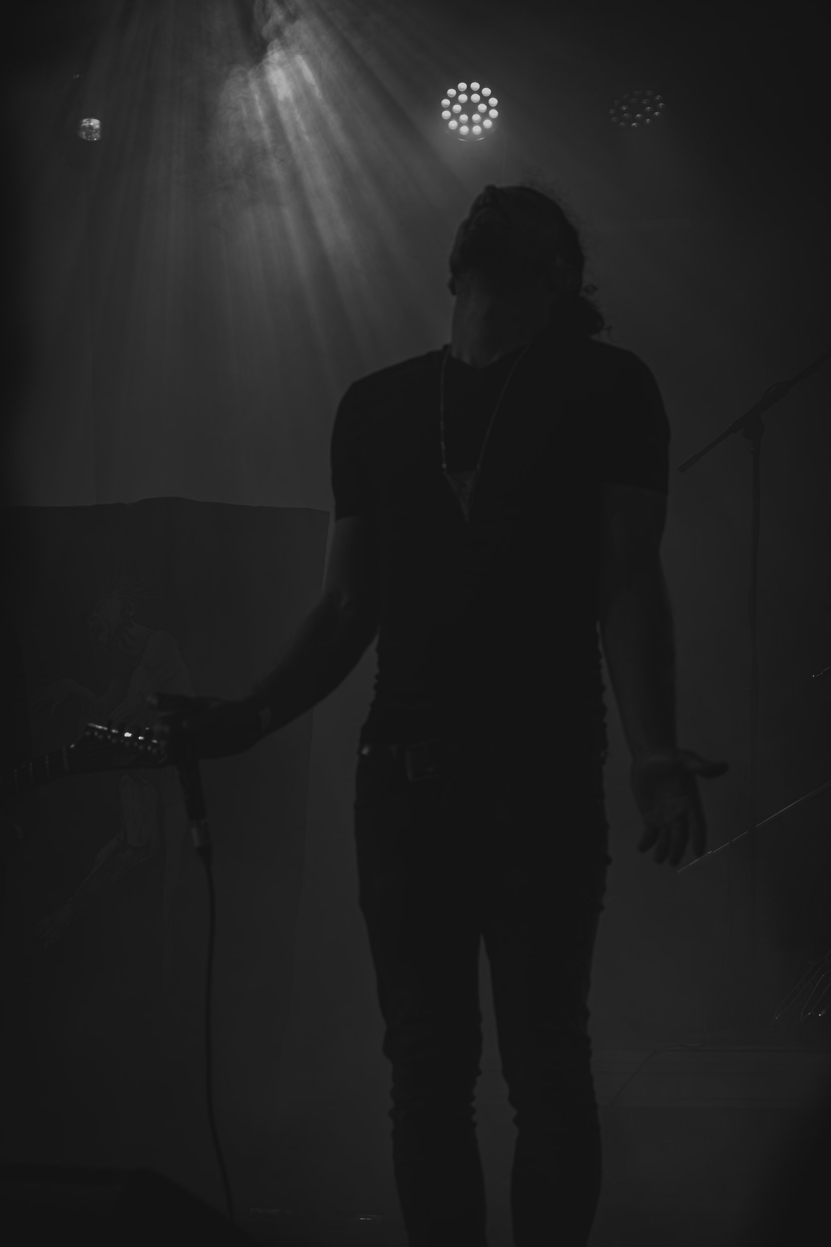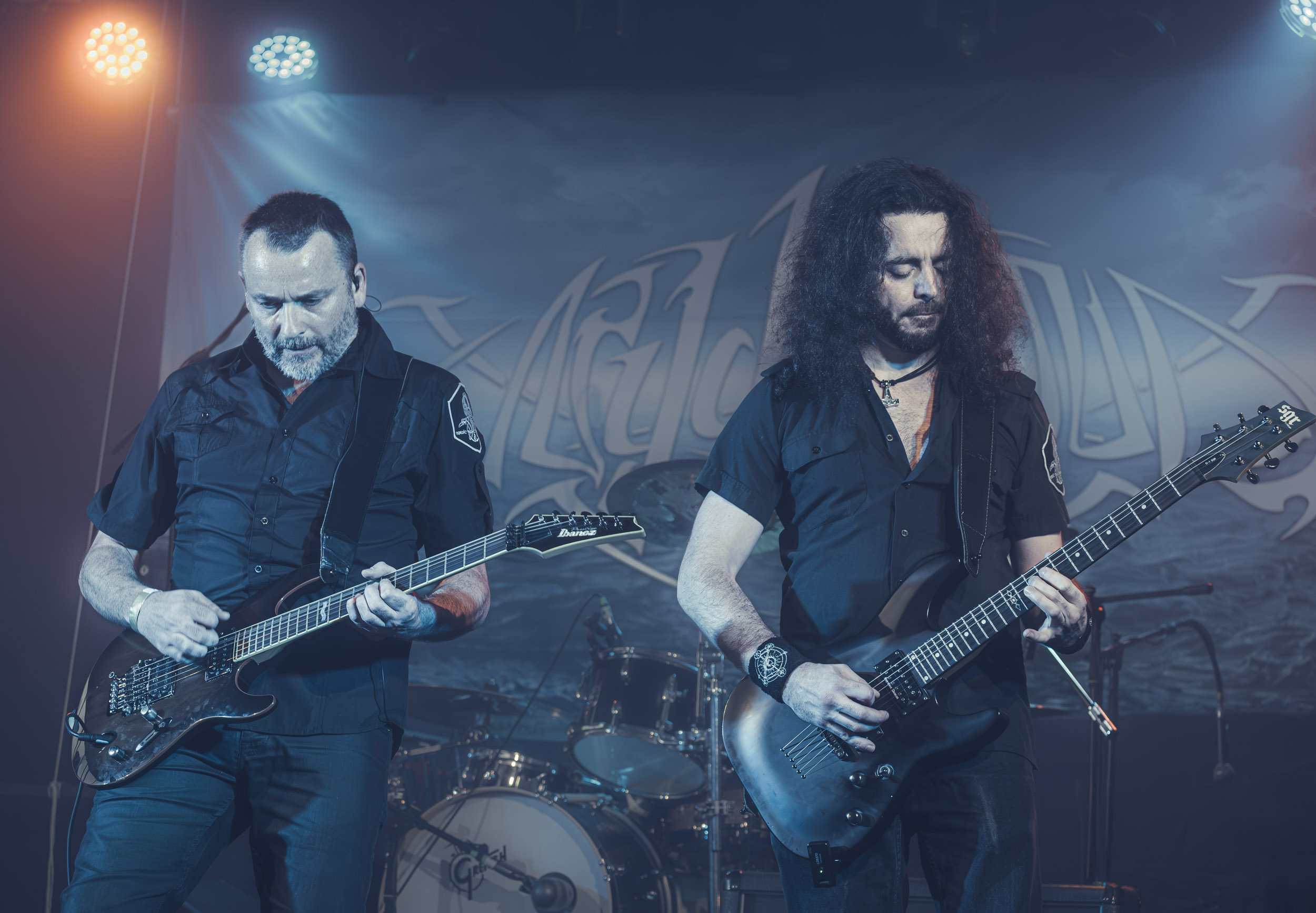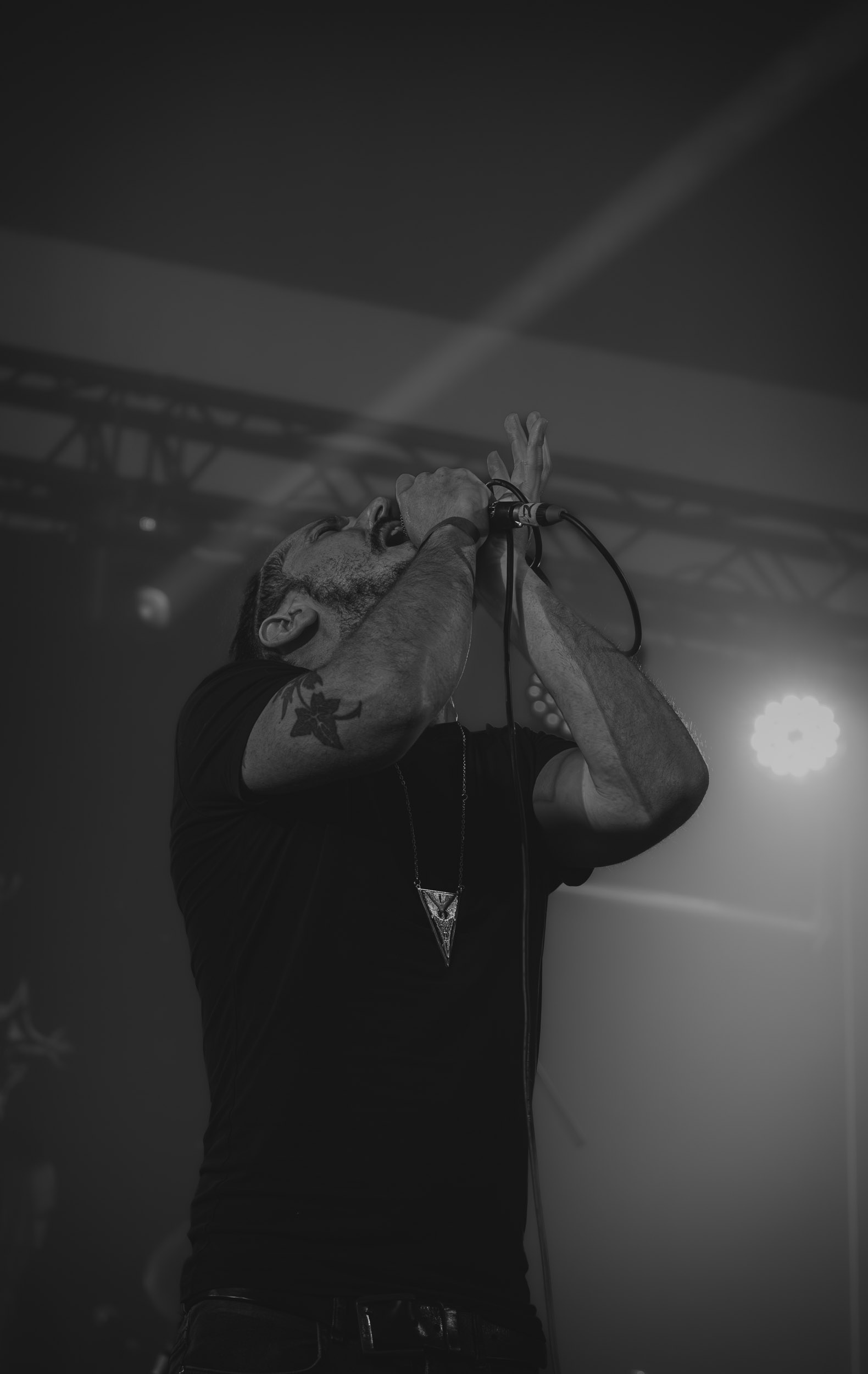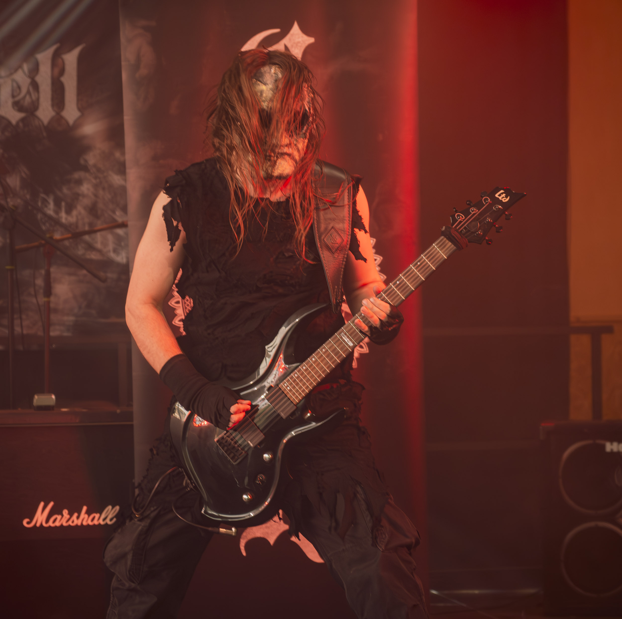 Le Dark Medieval Fest se poursuit sous des augures toujours aussi sombres, voire monte d’un cran à ce niveau, avec Circles ov Hell, second groupe issu du roaster du label Heart of Metal. C’est ainsi qu’une poignée d’heures après la prestation de Vils Gueux, les deux fondateurs, Damien Prunier et Nicolas Foucault, sont de retour sur scène, le premier officiant cette fois-ci à la basse et le second prenant la guitare, laissant le rôle de frontman à William Wendling alias Kratos Aurion. De même, le black folko-punk appuyant un humour décalé et grossier laisse place à un metal extrême symphonique basé sur la Divine Comédie de Dante Alighieri, la partie consacrée aux Enfers bien évidemment. Autant dire que l’on a ici affaire à une musique très cinématique et dense… peut-être un peu trop pour les capacités sonores d’une salle pluraliste pas forcément adaptée à ce genre de concert, ou même pour les oreilles de certains auditeurs non avertis, un tel style étant par définition peu accessible. Qu’à cela ne tienne, les quatre membres du groupe mettent toute leur application à retranscrire divers chapitres de cette histoire (oc)culte, à commencer par Kratos. Bien que loin de posséder la carrure du dieu de la guerre vidéoludique que ce nom évoque, l’homme à l’épaisse et royale chevelure tient néanmoins de la puissance de son homonyme dans sa voix rauque et éraillée, parfaite pour narrer des contes infernaux… quoi qu’elle semble un peu ténue. Signe d’un état de santé en berne ou d’un mixage trop faible ? Quoi qu’il en soit, on ne peut retirer au frontman la force et la théâtralité de sa performance. De leur côté, les musiciens se font plus discrets — notamment Nicolas, dissimulé derrière un masque et un maquillage noir qui lui donnent une allure de démon —, mais non moins efficaces et impliqués. Le jeune homme à la batterie, musicien de session que je reconnais pour l’avoir vu jouer avec Vosegus lors de l’édition de l’an dernier, montre une fois de plus qu’il a de la hargne à revendre derrière les fûts.