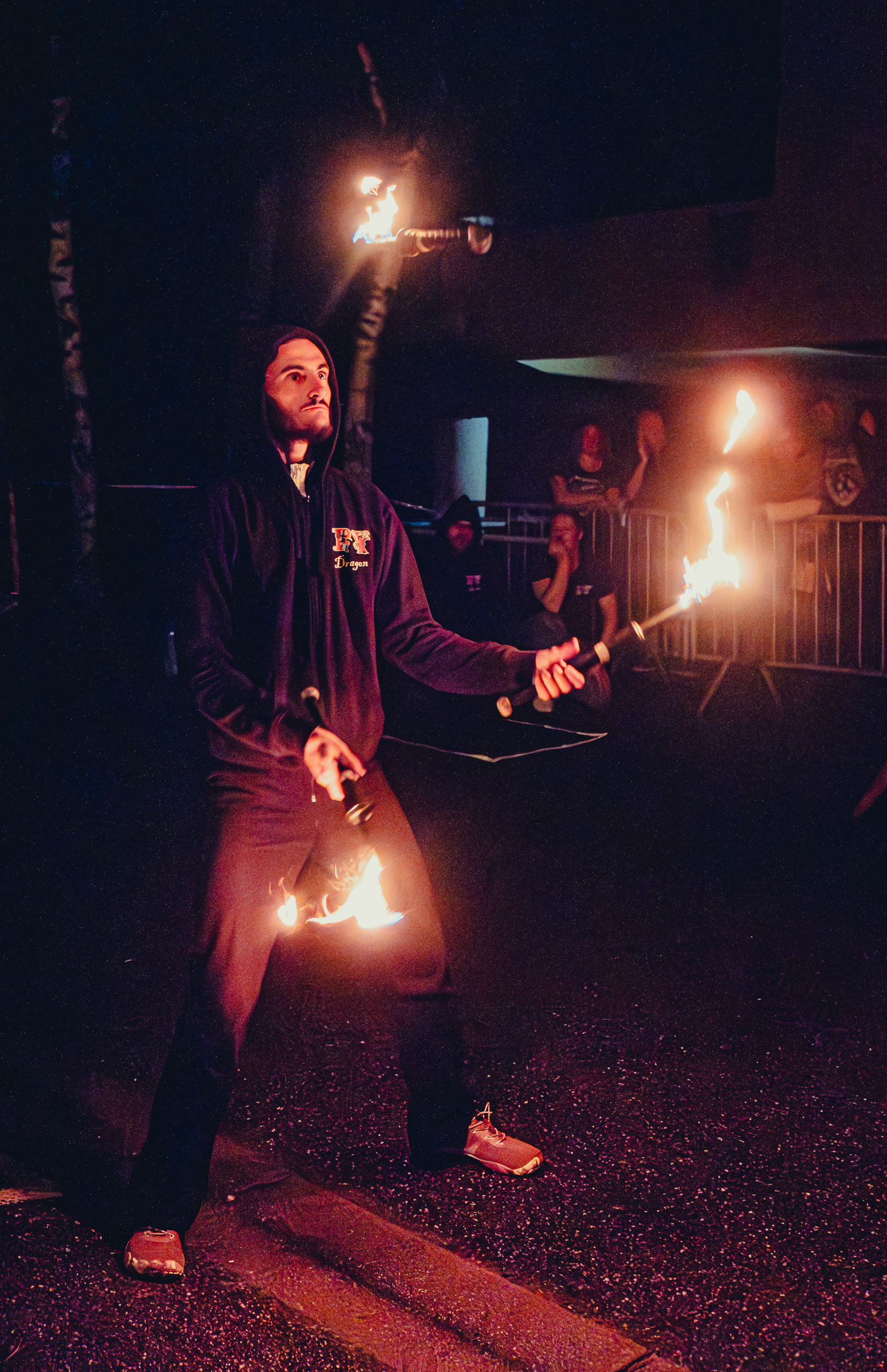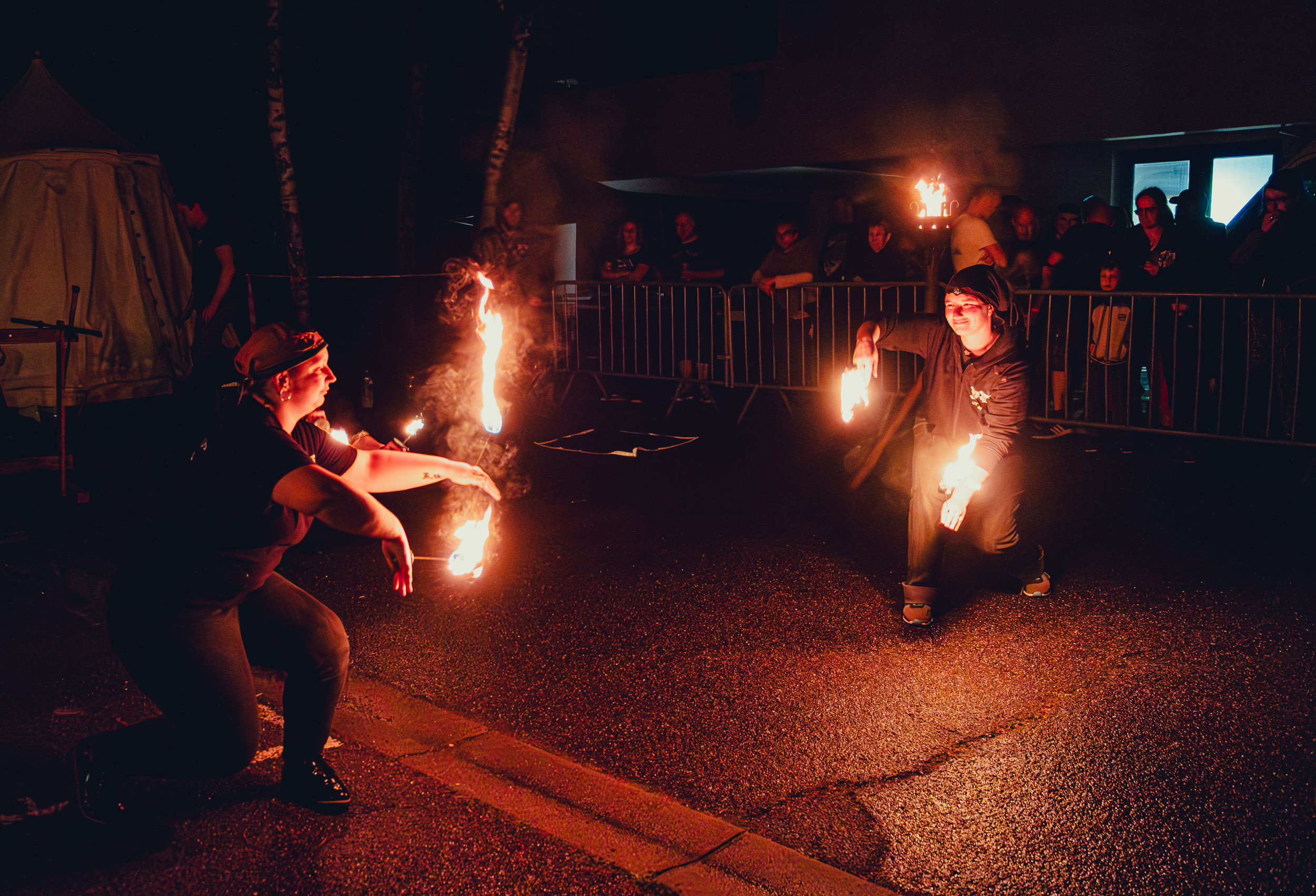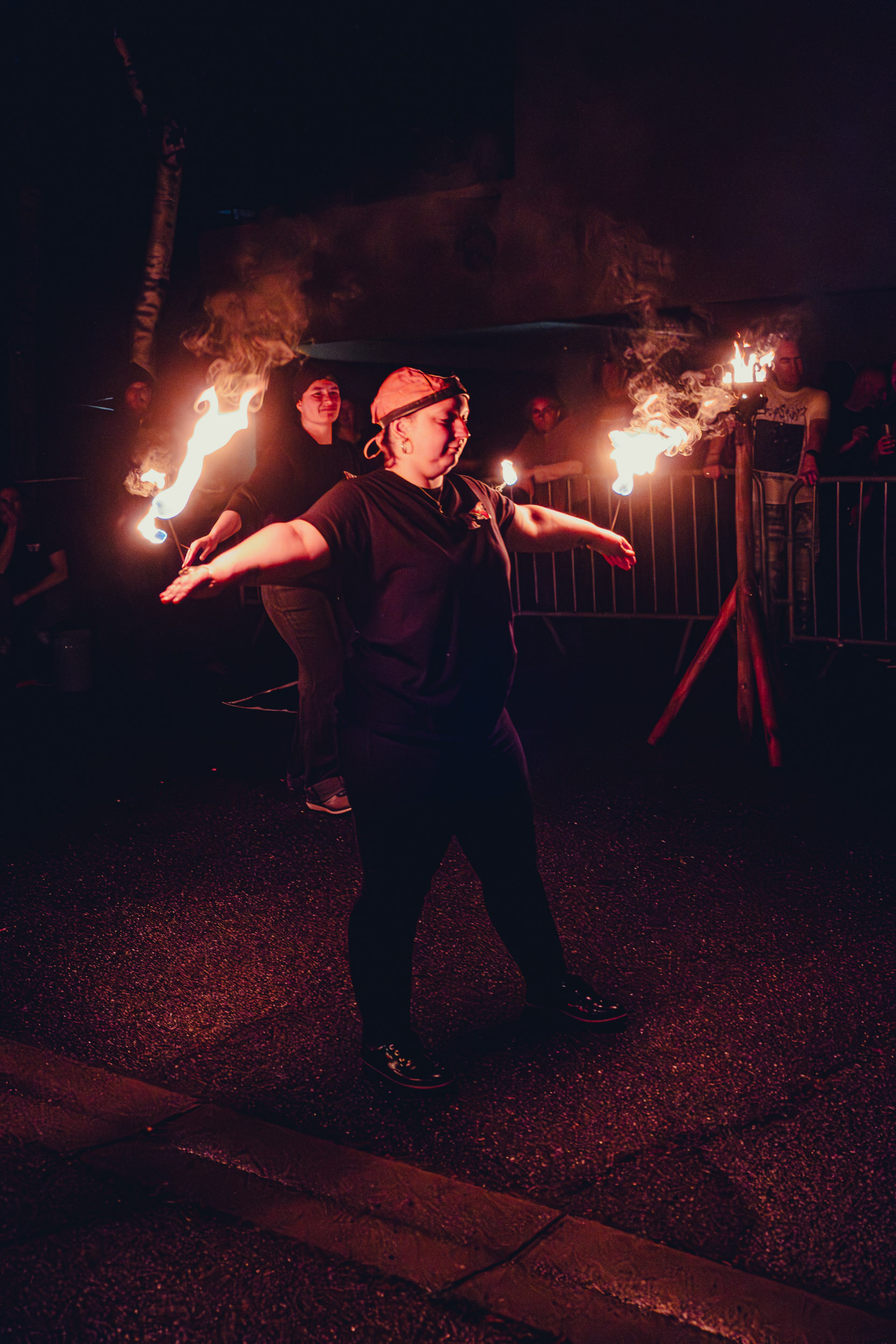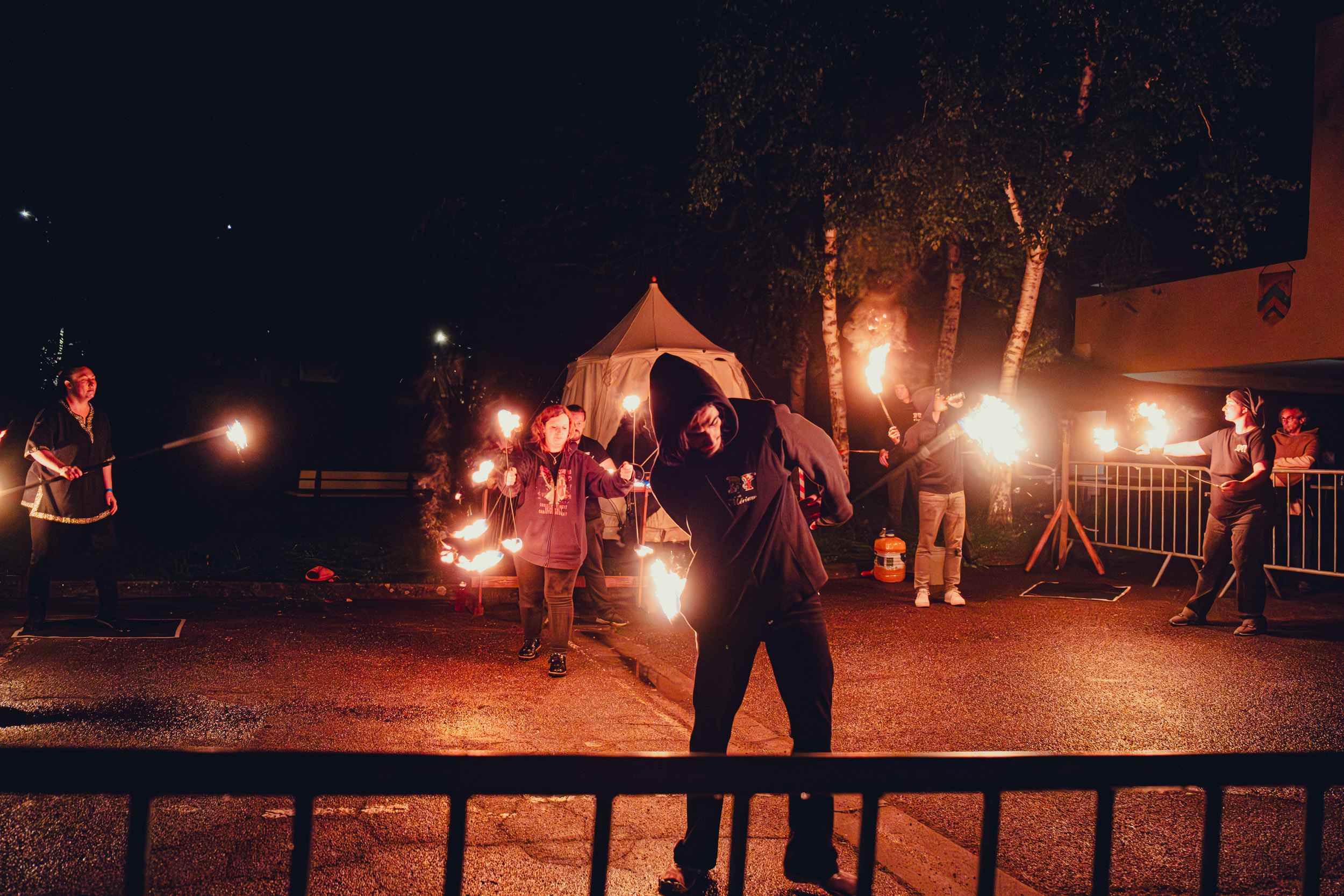En attendant l’arrivée de la tête d’affiche de ce soir, les curieux et amateurs de pyrotechnie peuvent assister à une prestation par Les Pérégrins d’Ycelieu, qui mettent la barre du spectaculaire un cran plus haut que l’an dernier et nous offrent un bouquet final en forme de performance en groupe.
