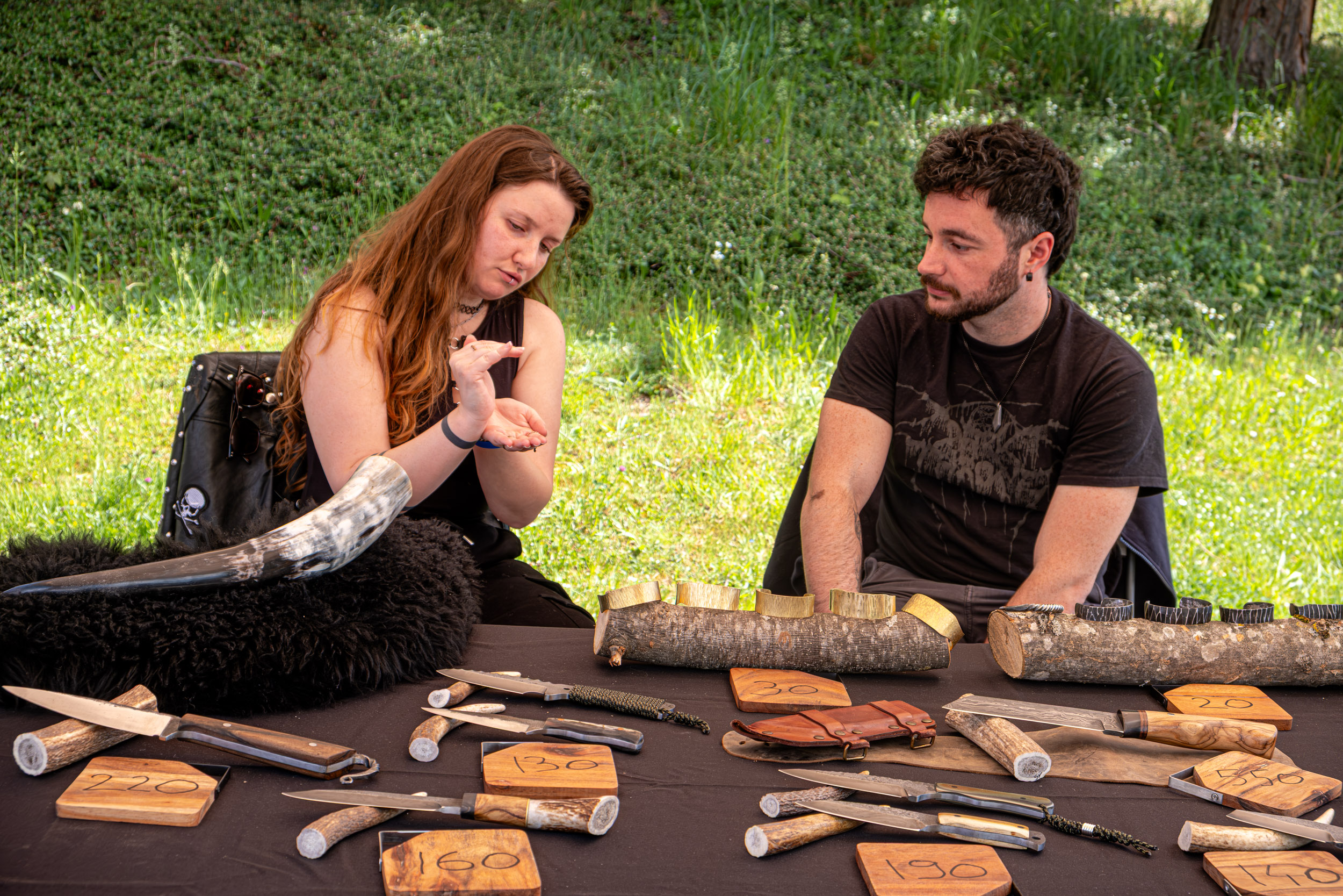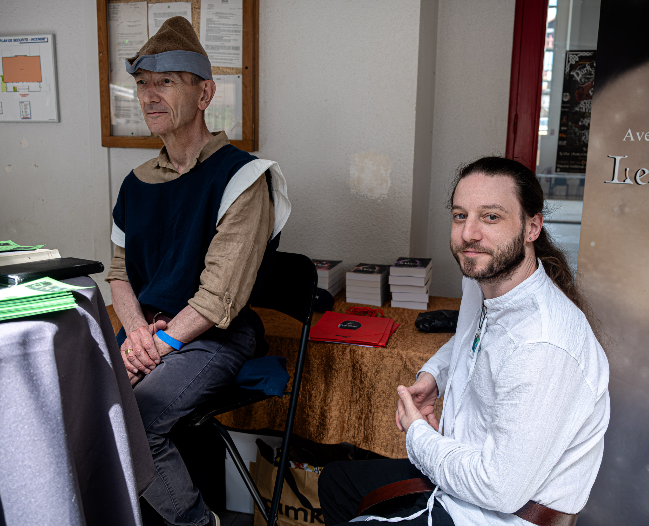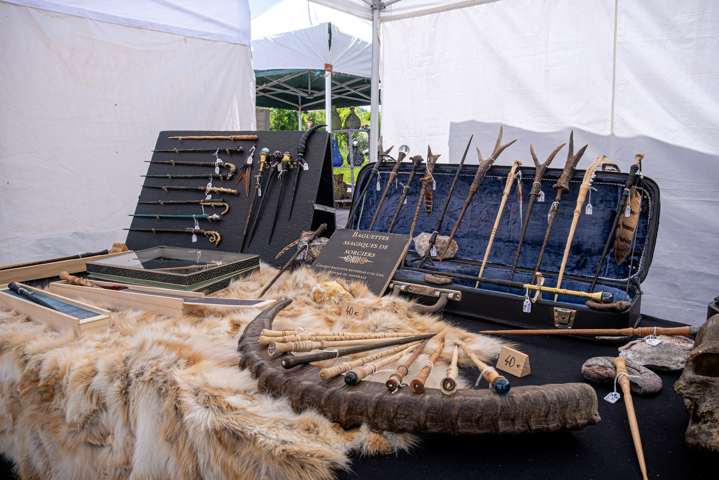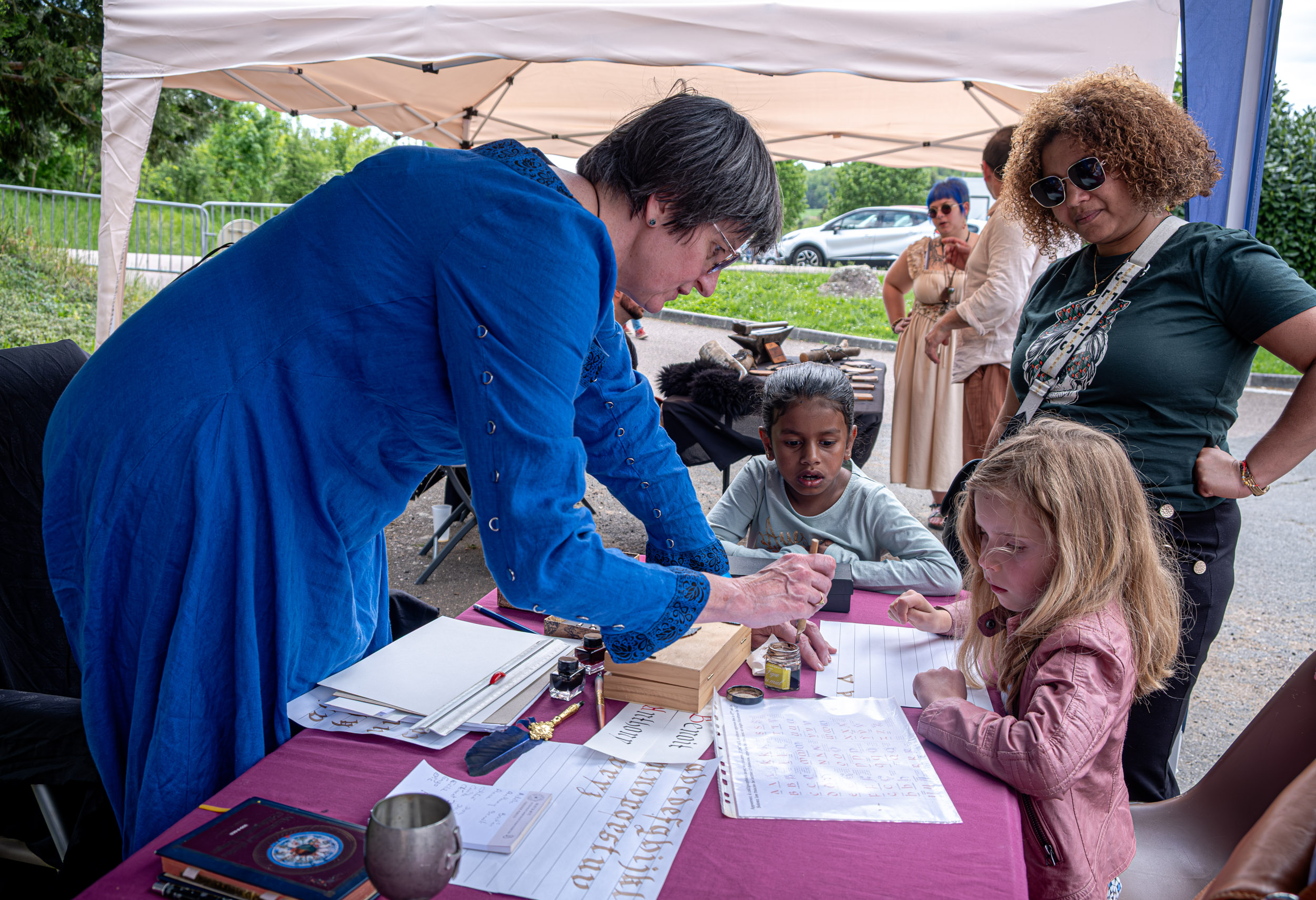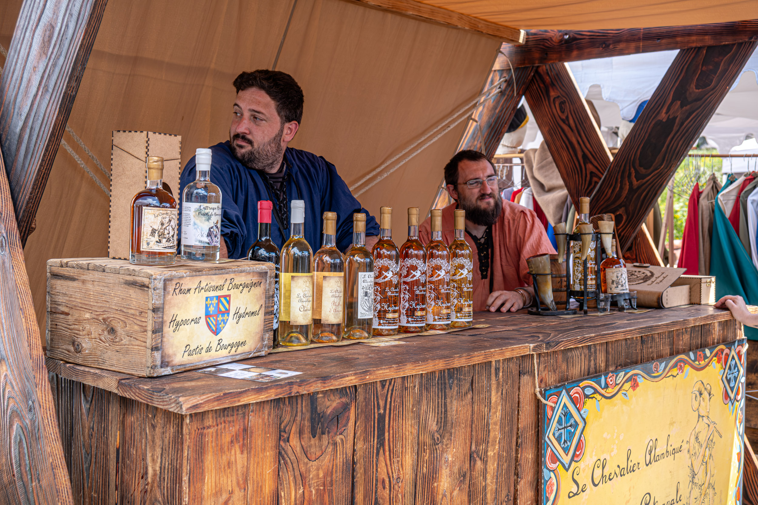 Ce nouveau marché propose à boire et à manger, au sens figuré comme littéral de l’expression. Ainsi, en attendant l’ouverture des portes prévues pour 15 h 30, festivaliers comme visiteurs venus du patelin de Lamure-sur-Azergues peuvent déambuler dans les allées à la rencontre de tous ces exposants — pour certains venus d’Italie —, pour se restaurer, acheter un souvenir ou accompagner les enfants qui veulent essayer l’initiation à la calligraphie que propose l’association locale Les Compagnons Médiévistes d’Azergues, nouvelle venue parmi les partenaires du fest. Les associations Les Lamhes du Val d’Azergues et Les Pérégrins d’Ycelieu font également leur retour, avec leurs démonstrations d’escrime et de performances saltimbanques, toujours aussi impressionnantes !
