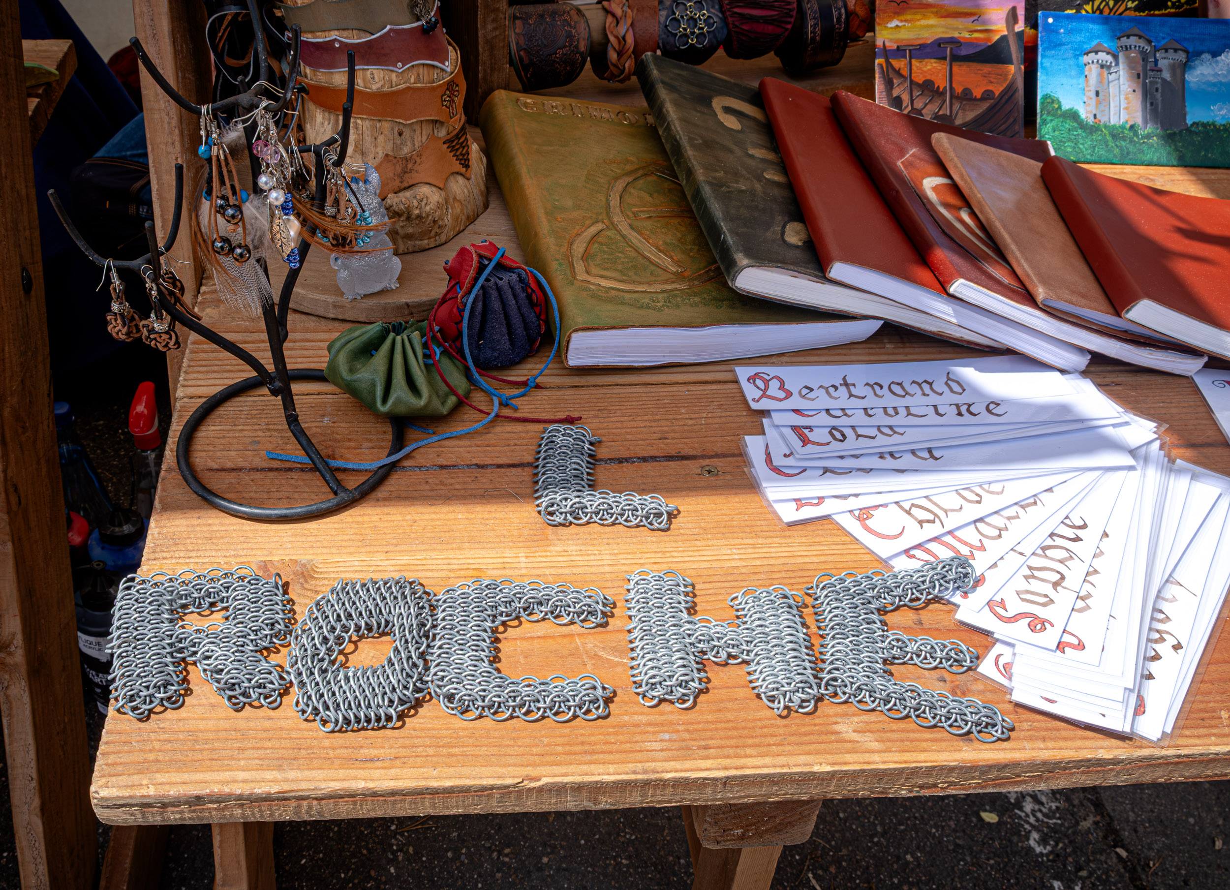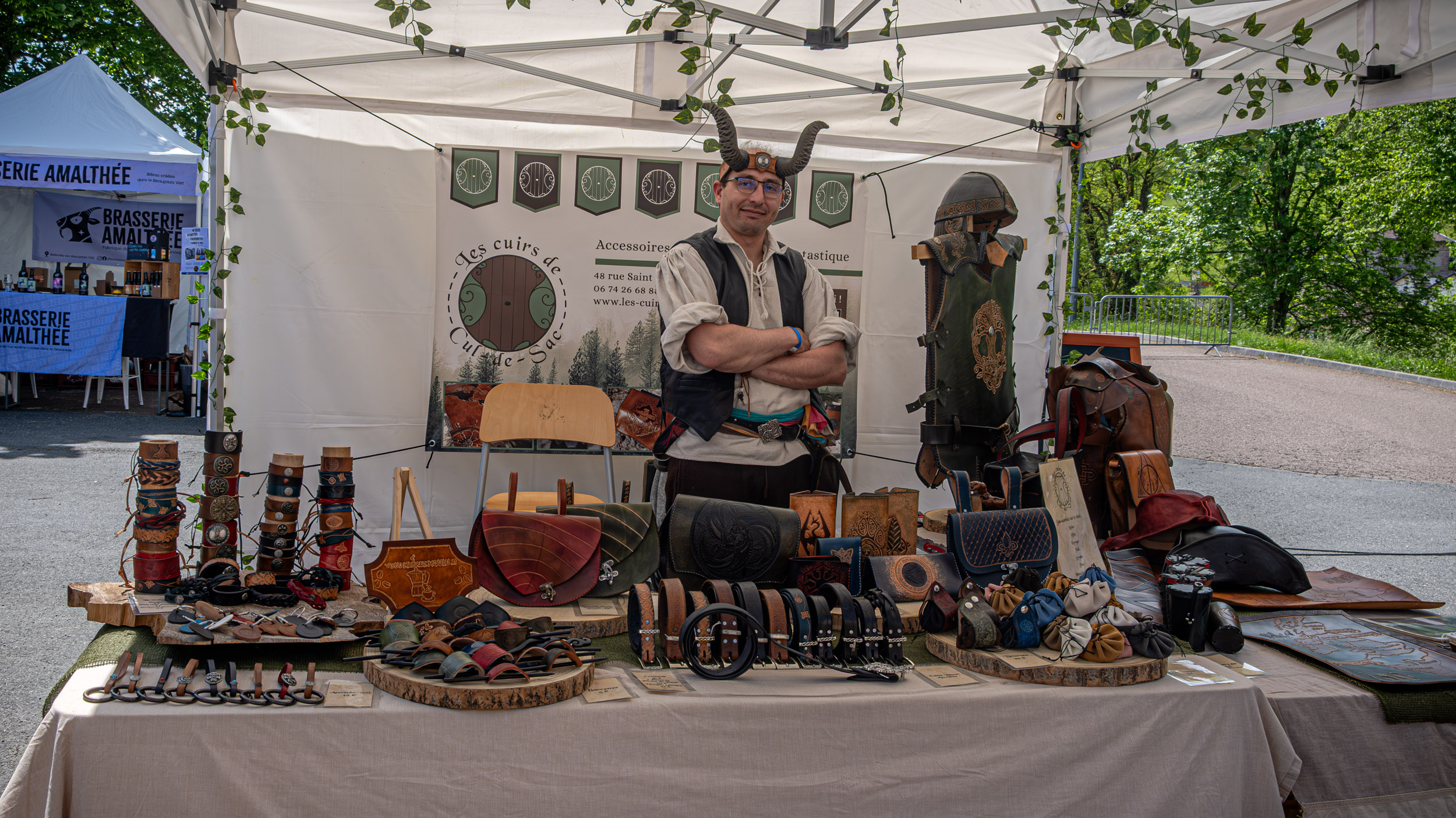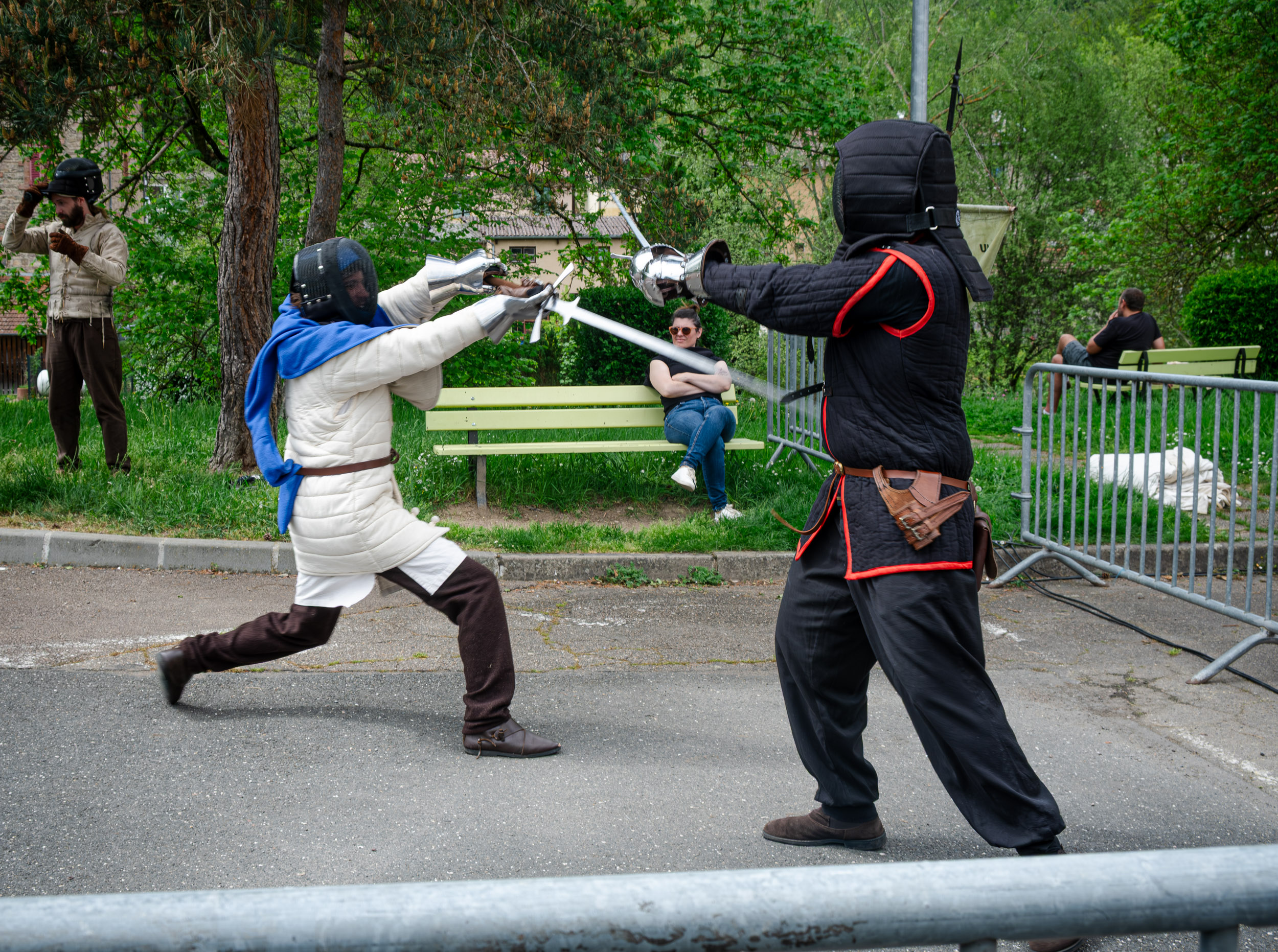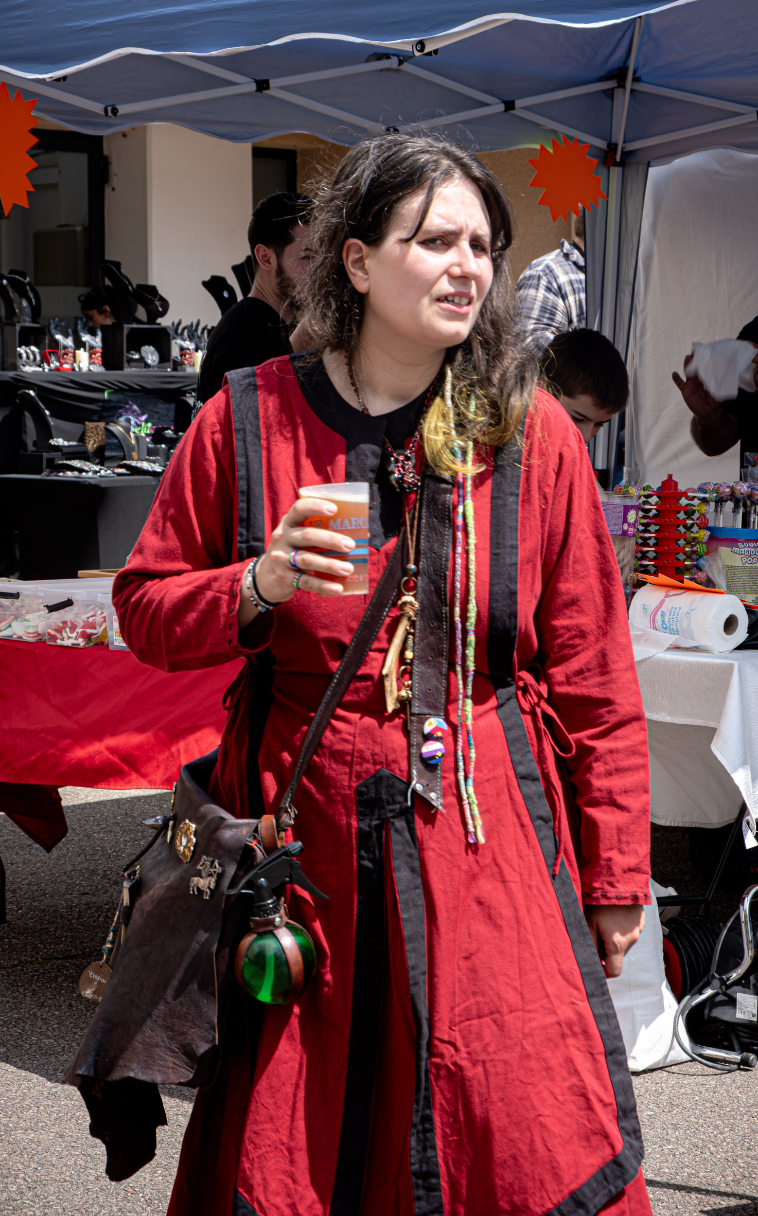 Ce nouveau marché propose à boire et à manger, au sens figuré comme littéral de l’expression. Ainsi, en attendant l’ouverture des portes prévues pour 15 h 30, festivaliers comme visiteurs venus du patelin de Lamure-sur-Azergues peuvent déambuler dans les allées à la rencontre de tous ces exposants — pour certains venus d’Italie —, pour se restaurer, acheter un souvenir ou accompagner les enfants qui veulent essayer l’initiation à la calligraphie que propose l’association locale Les Compagnons Médiévistes d’Azergues, nouvelle venue parmi les partenaires du fest. Les associations Les Lamhes du Val d’Azergues et Les Pérégrins d’Ycelieu font également leur retour, avec leurs démonstrations d’escrime et de performances saltimbanques, toujours aussi impressionnantes !