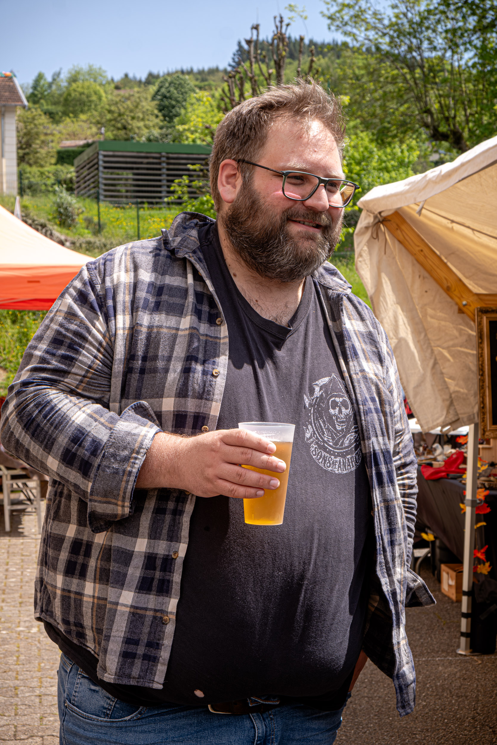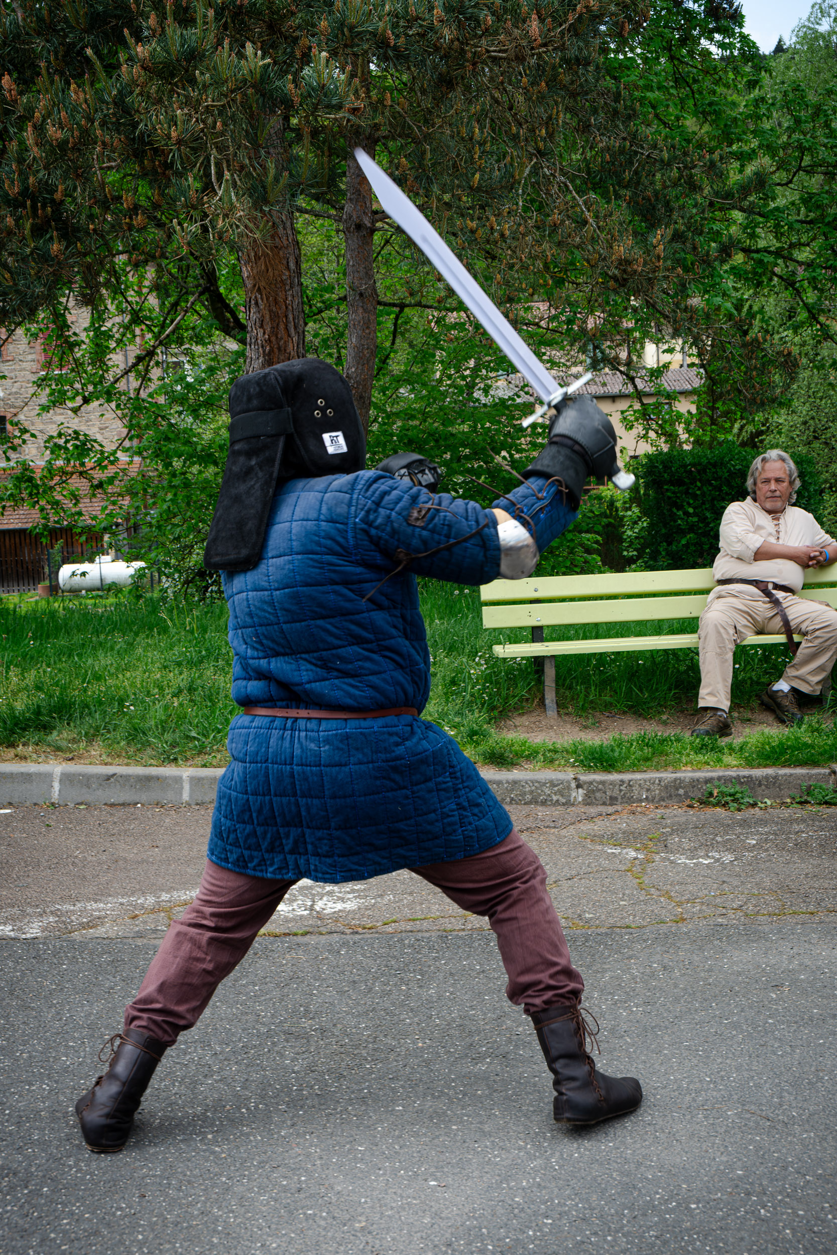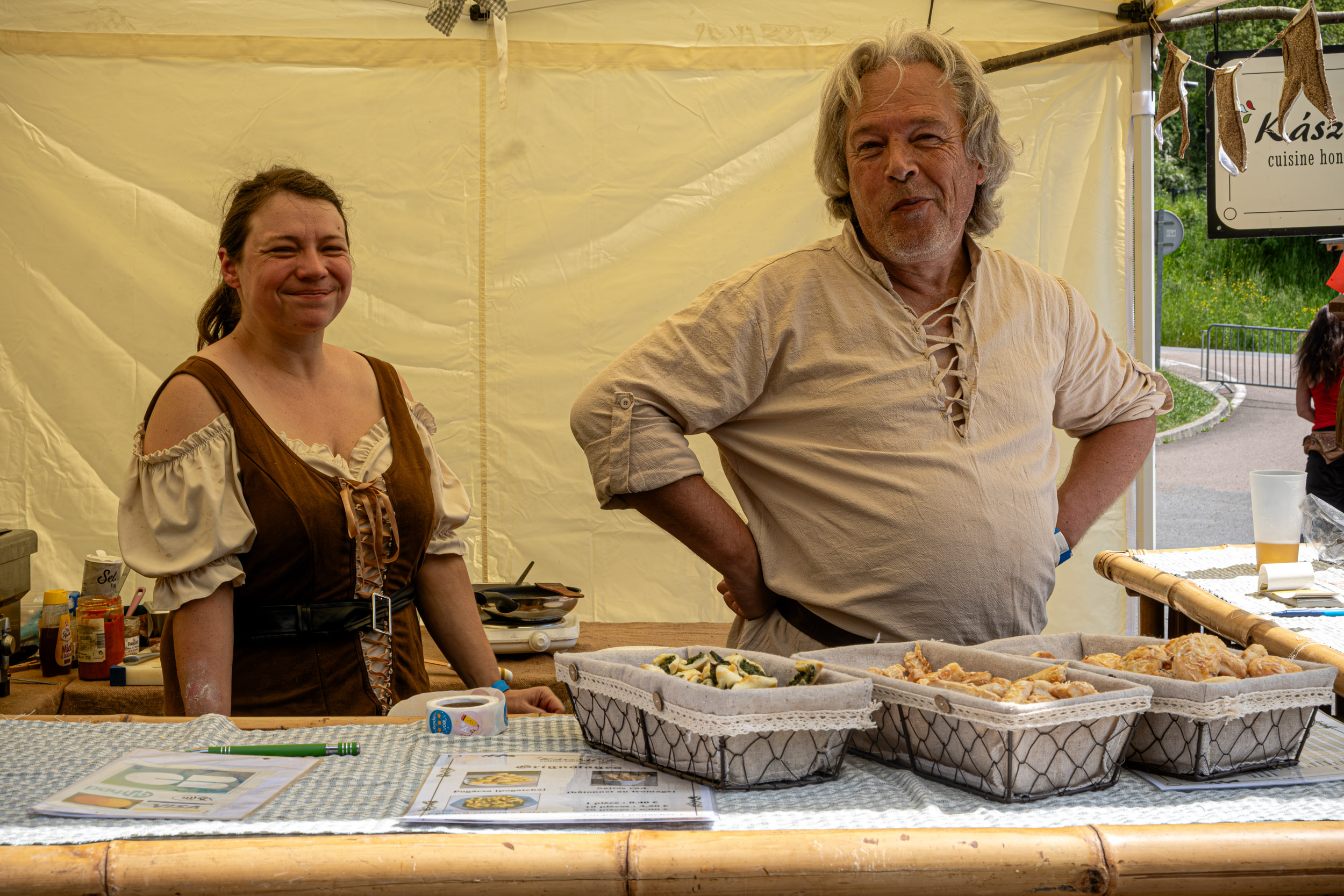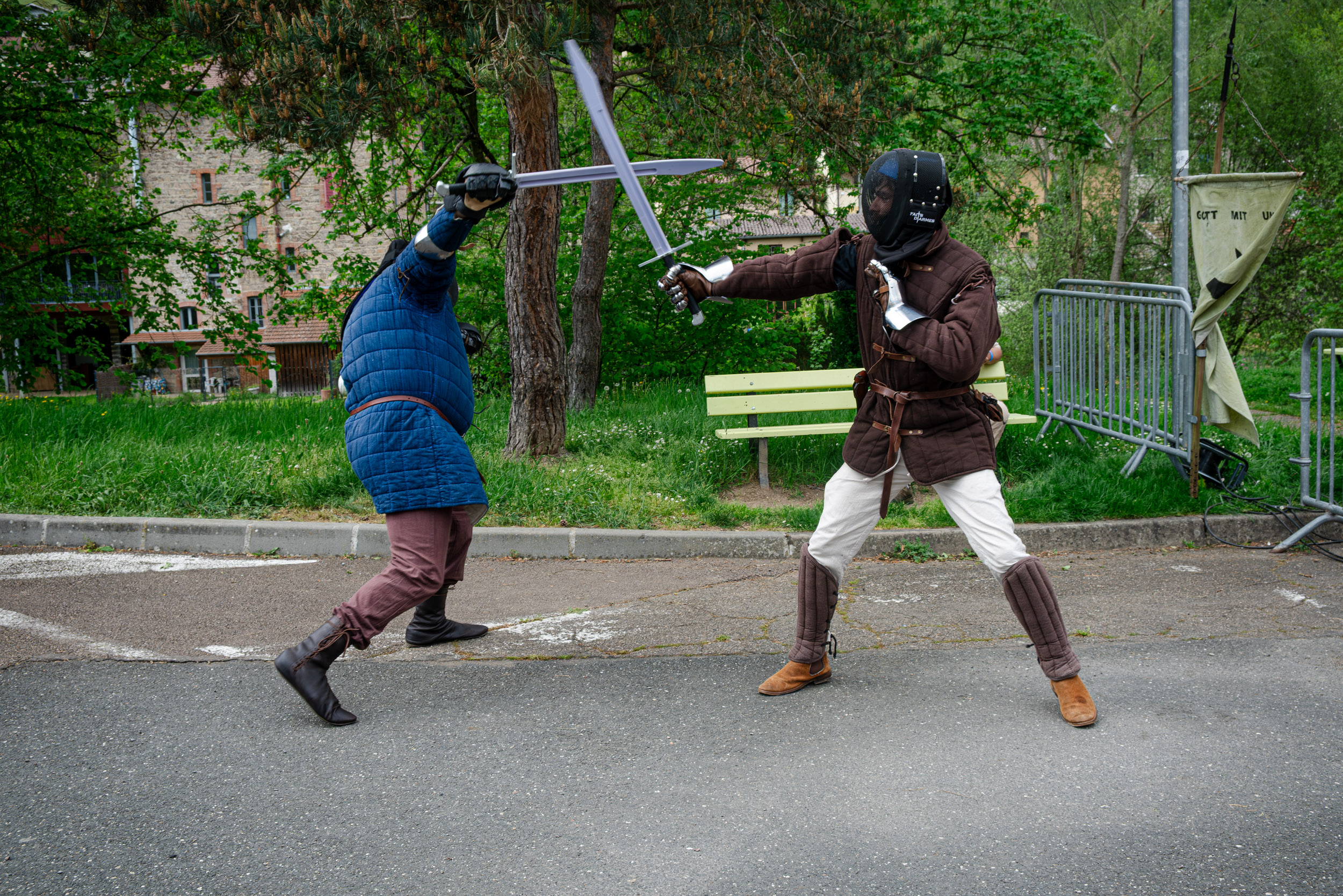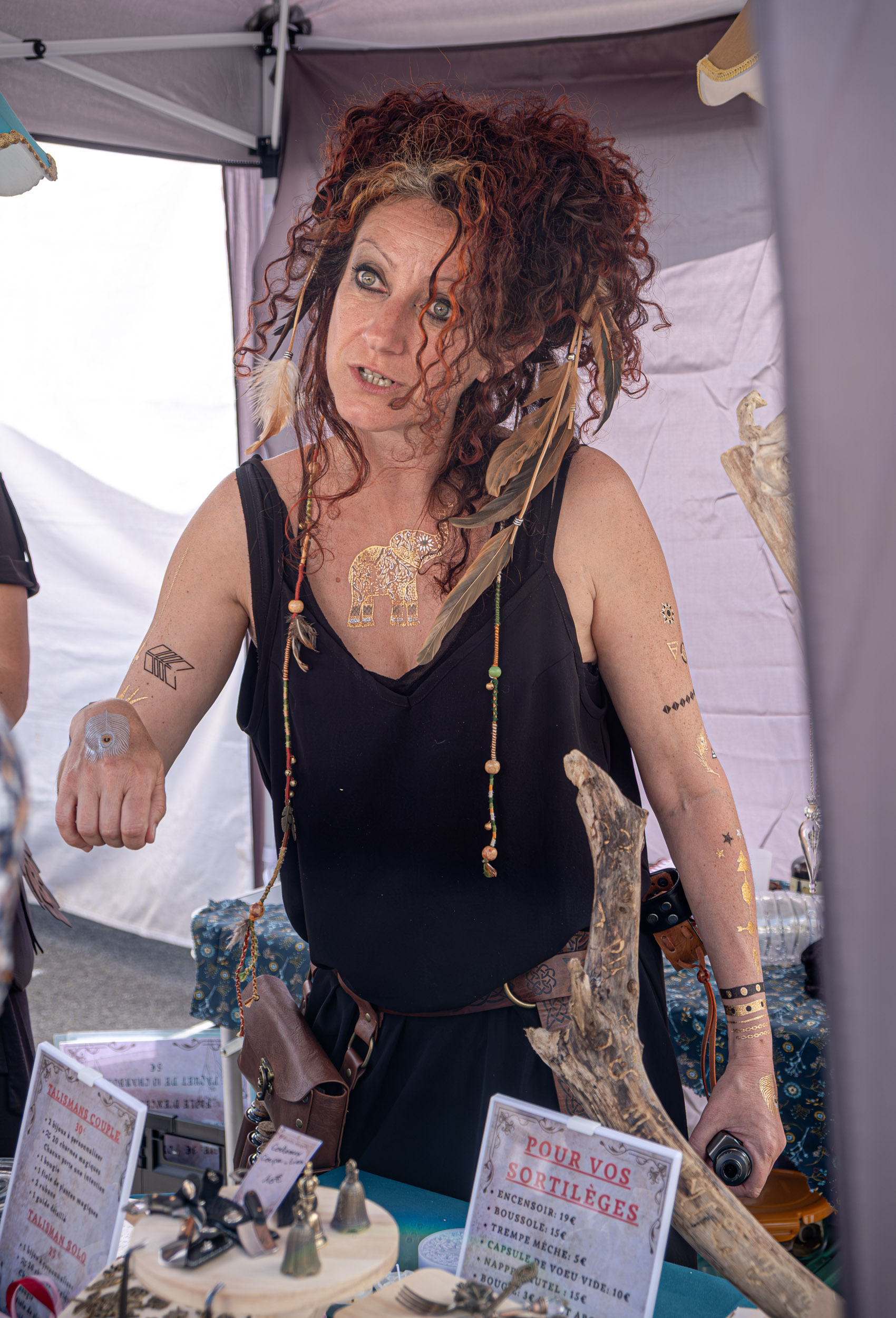 Ce nouveau marché propose à boire et à manger, au sens figuré comme littéral de l’expression. Ainsi, en attendant l’ouverture des portes prévues pour 15 h 30, festivaliers comme visiteurs venus du patelin de Lamure-sur-Azergues peuvent déambuler dans les allées à la rencontre de tous ces exposants — pour certains venus d’Italie —, pour se restaurer, acheter un souvenir ou accompagner les enfants qui veulent essayer l’initiation à la calligraphie que propose l’association locale Les Compagnons Médiévistes d’Azergues, nouvelle venue parmi les partenaires du fest. Les associations Les Lamhes du Val d’Azergues et Les Pérégrins d’Ycelieu font également leur retour, avec leurs démonstrations d’escrime et de performances saltimbanques, toujours aussi impressionnantes !