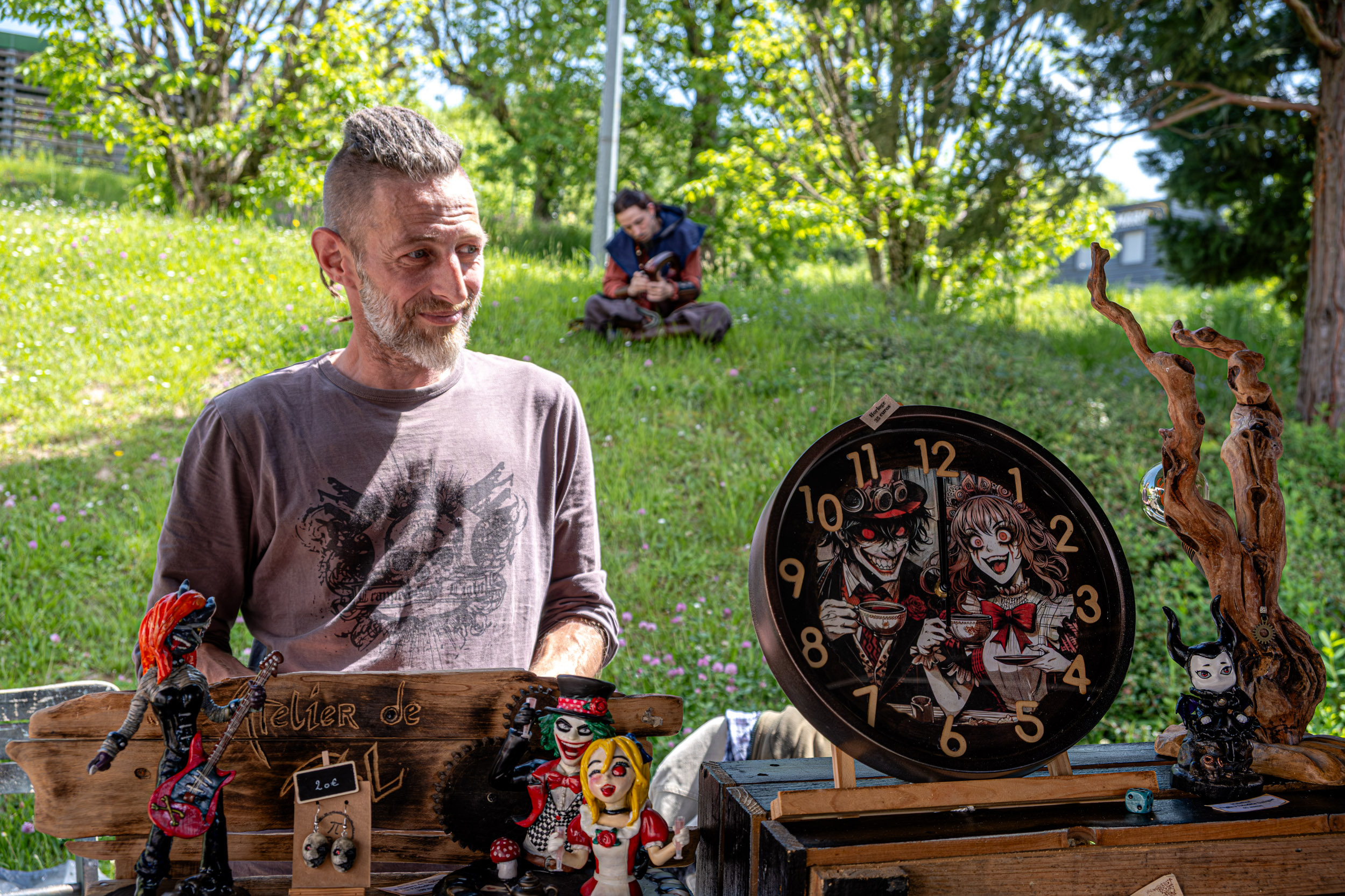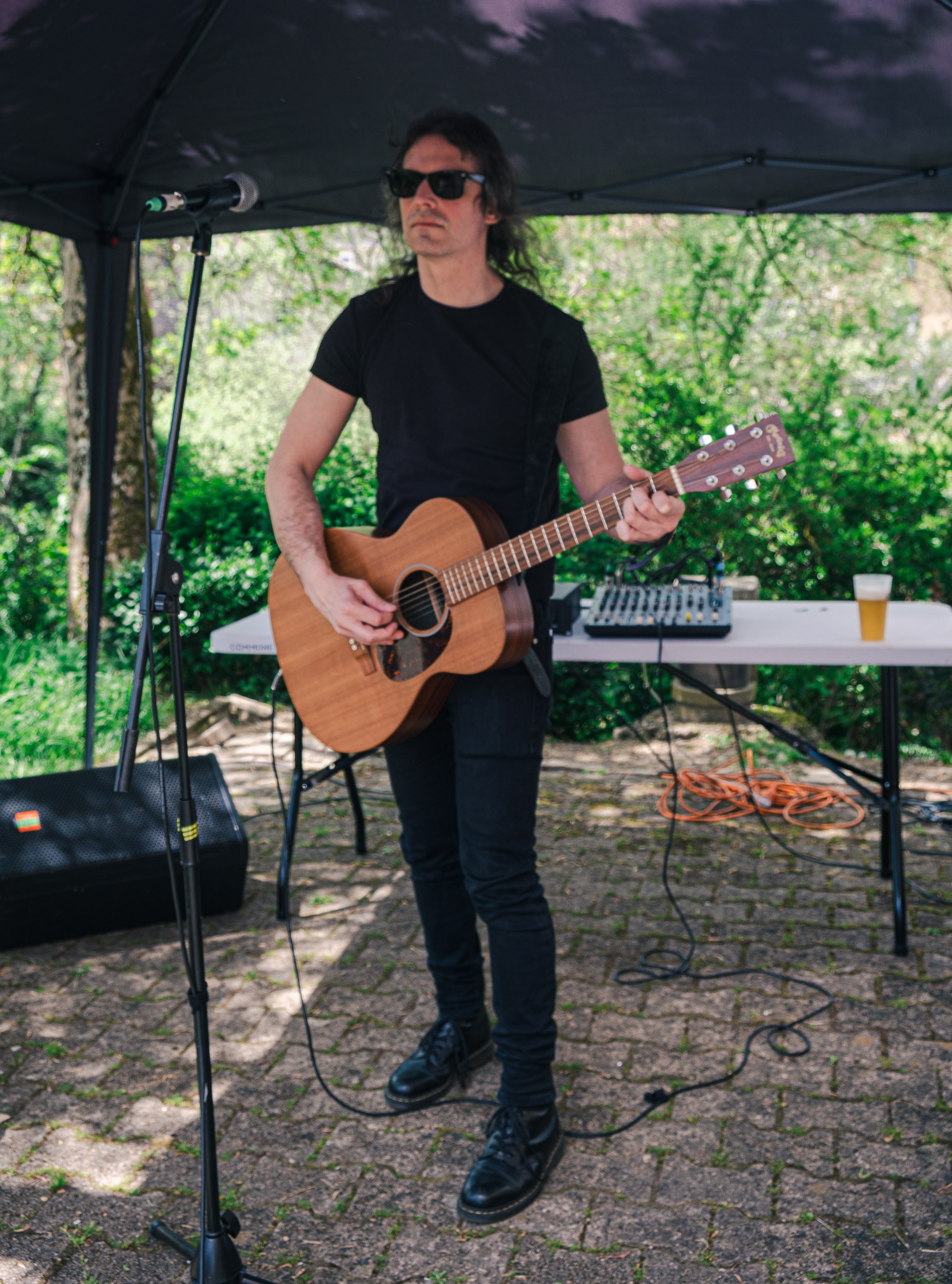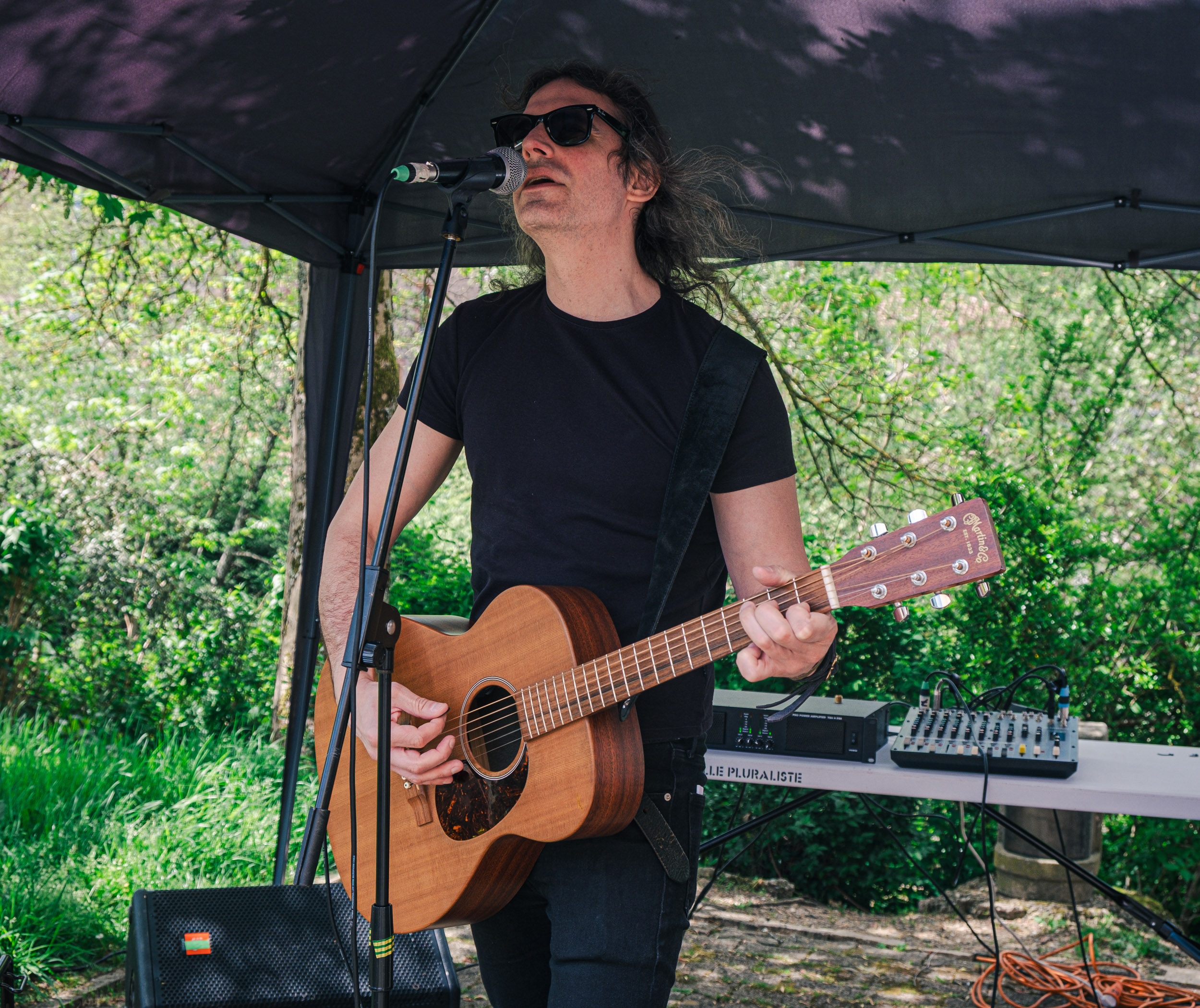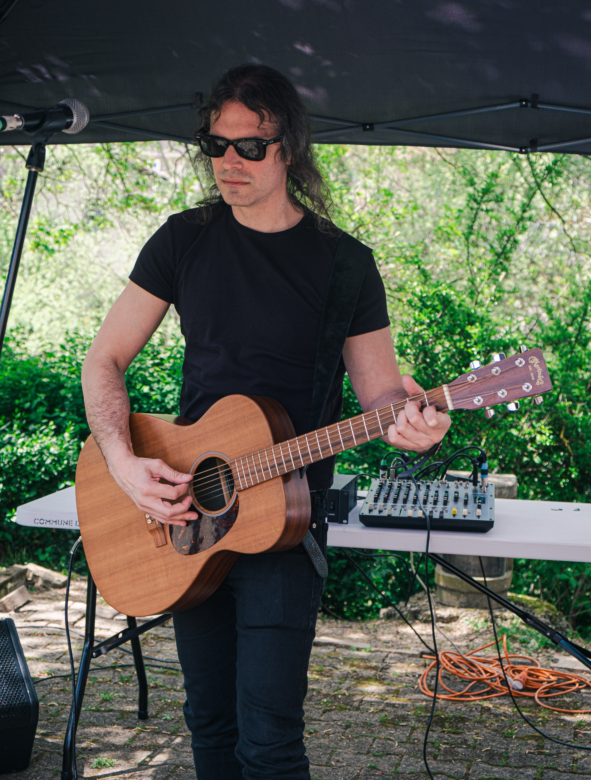 Terre d’origine de certains artisans du marché, l’Italie est aussi celle du musicien se produisant quelques mètres plus loin. Ceux qui ont déjà assisté à un concert de Frostmoon Eclipse n’auront eu aucun mal à reconnaître le fondateur du groupe, Claudio Alcara, venu de La Spezia présenter quelques morceaux de son projet acoustique dark folk Stroszek. D’allure mystérieuse derrière ses lunettes noires, armé de sa guitare sèche et de sa voix grave et rocailleuse, le Ligurien livre aux visiteurs du marché une musique envoûtante et crépusculaire… à laquelle ne manque finalement que l’ambiance associée à ce temps du soir. Mais pas de souci, l’ombre des arbres au bord de l’Azergues fait bien l’affaire !
