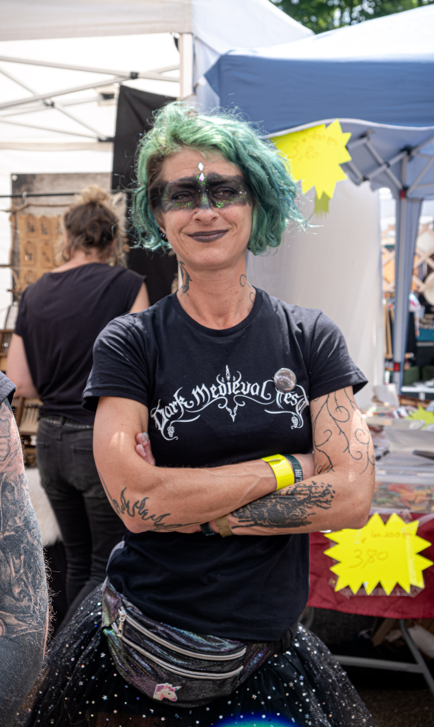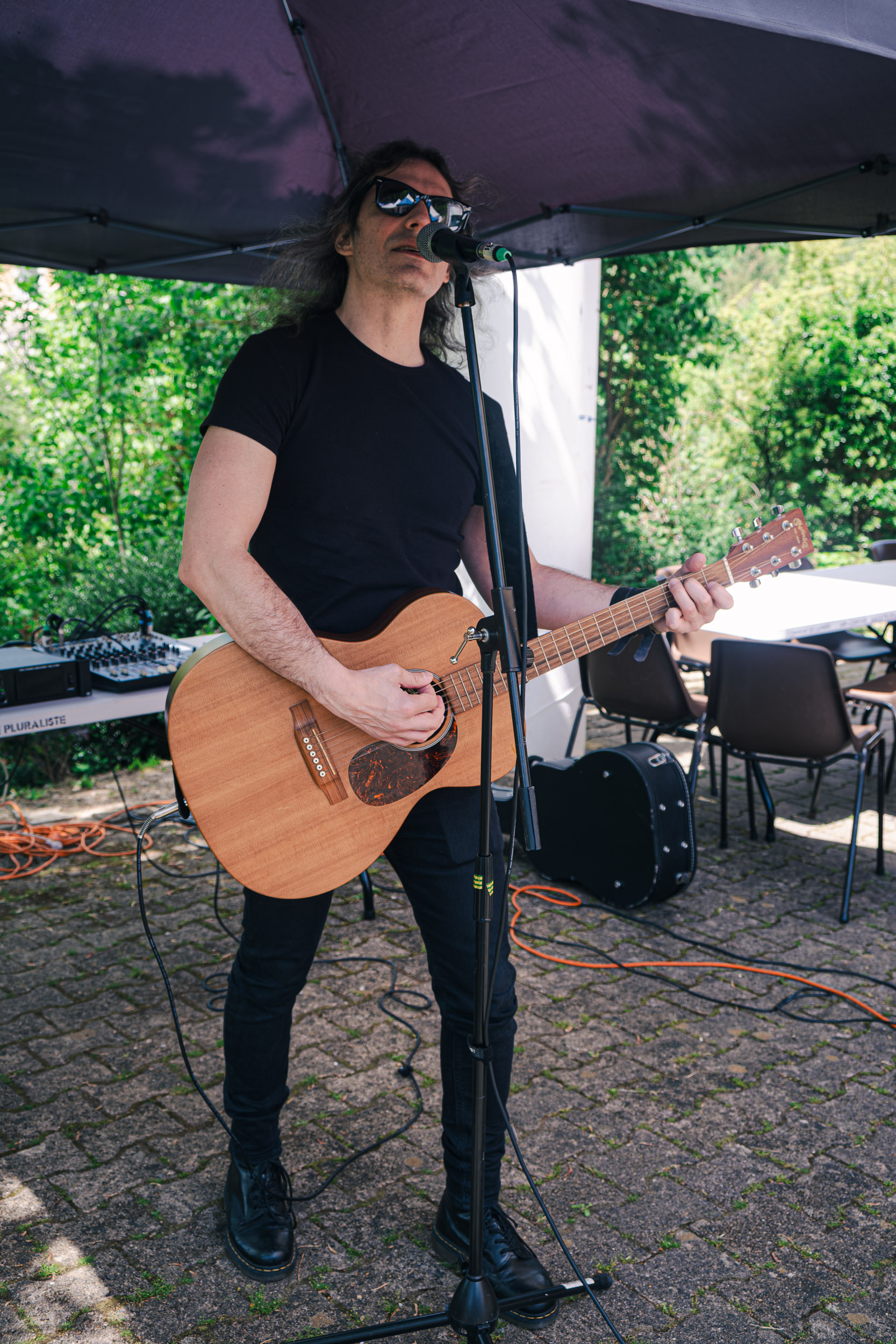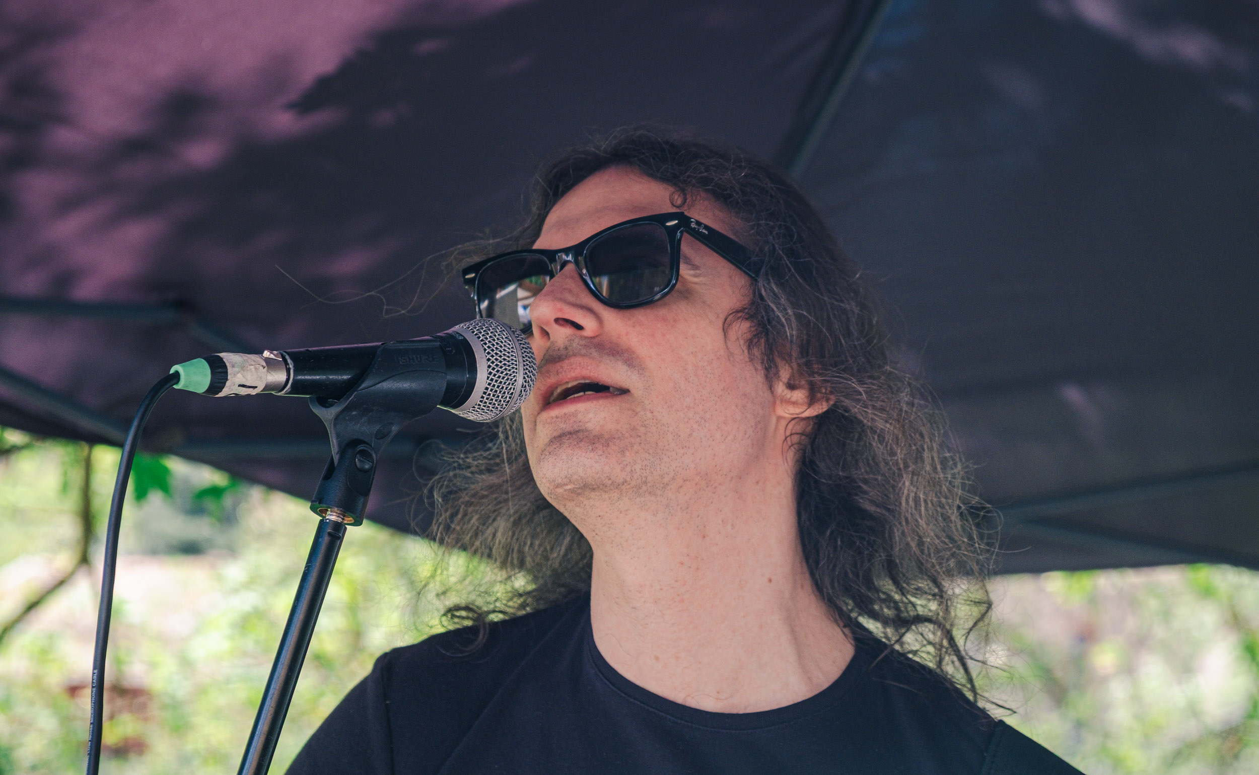 Terre d’origine de certains artisans du marché, l’Italie est aussi celle du musicien se produisant quelques mètres plus loin. Ceux qui ont déjà assisté à un concert de Frostmoon Eclipse n’auront eu aucun mal à reconnaître le fondateur du groupe, Claudio Alcara, venu de La Spezia présenter quelques morceaux de son projet acoustique dark folk Stroszek. D’allure mystérieuse derrière ses lunettes noires, armé de sa guitare sèche et de sa voix grave et rocailleuse, le Ligurien livre aux visiteurs du marché une musique envoûtante et crépusculaire… à laquelle ne manque finalement que l’ambiance associée à ce temps du soir. Mais pas de souci, l’ombre des arbres au bord de l’Azergues fait bien l’affaire !