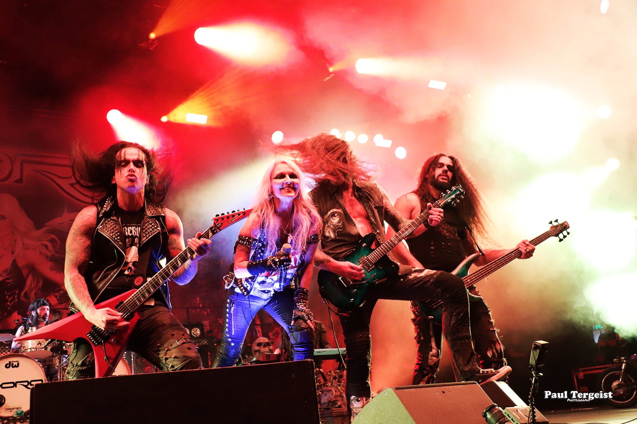 Par la suite, l’on revient en terrain plus connu avec Mille Petrozza (Kreator) et Andy Brings (ex-Sodom, notamment) sur une reprise percutante d’Ace of Spades de Motörhead, sans doute aussi une forme d’hommage à Lemmy, Doro et lui ayant été très liés. Doro n’est plus avare de reprises depuis un certain nombre d’années, et nous balancera une nouvelle fois sa relecture de Breaking the Law de Judas Priest : le démarrage se déroule tout en douceur jusqu’à la fin du premier refrain, moment propice pour commencer à envoyer la purée. Le classique des classiques de Warlock, All We Are, donne l’occasion à tous les invités, auxquels se joint Chris Boltendahl, le chanteur de Grave Digger, de rejoindre la scène avant un premier baisser de rideau.