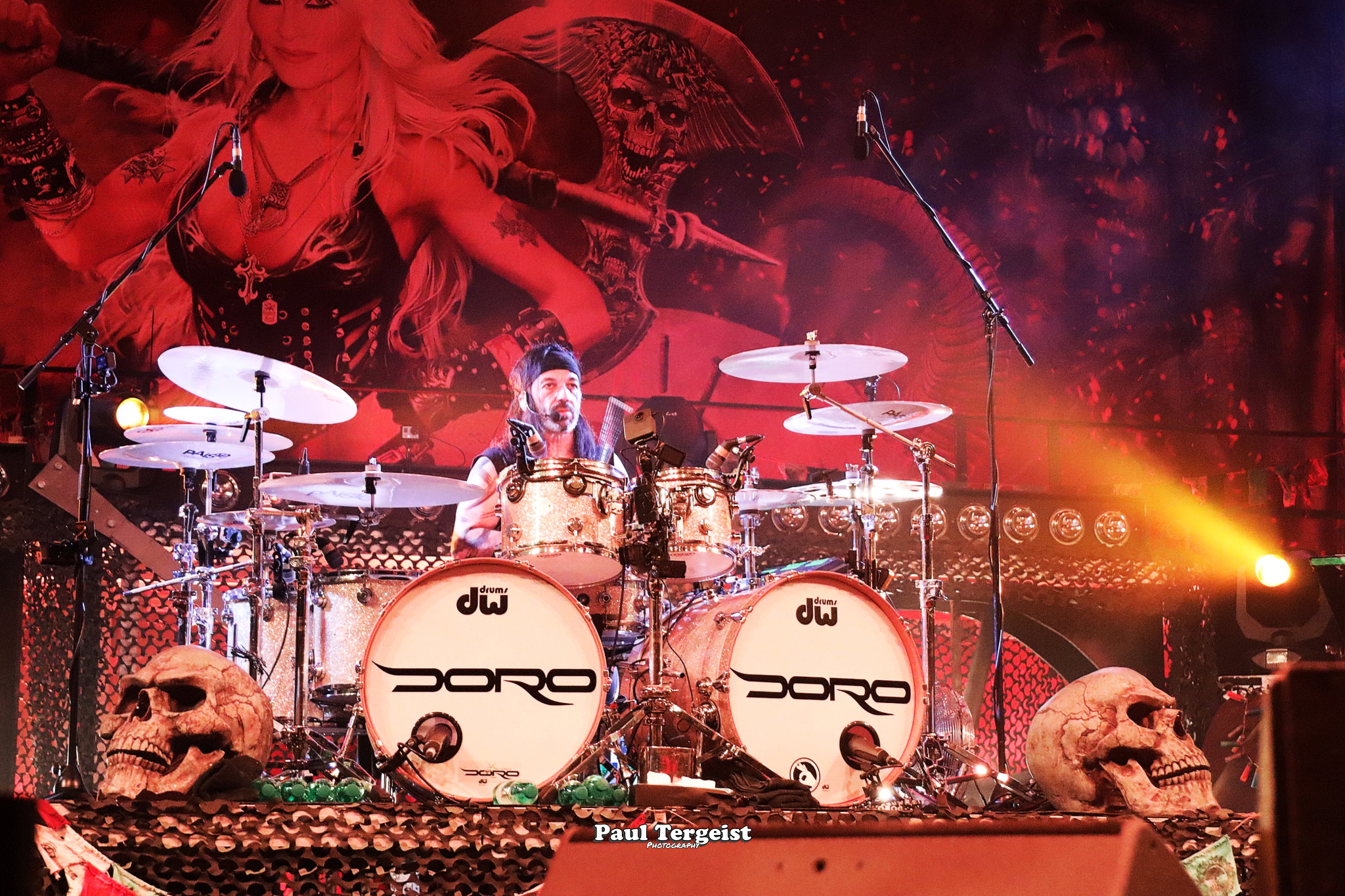 Aux environs de 20 h 35, les lumières s’éteignent, signe que les choses vraiment sérieuses vont commencer. Avant cela, en guise d’intro, des amis de Doro qui n’ont pu se joindre physiquement à la fête lui adressent leurs félicitations et autres congratulations méritées, diffusées sur les deux écrans géants qui bordent la scène. Parmi eux, citons Rob Halford (Judas Priest), Tommy Thayer (Kiss), Blind Guardian, Biff Byford (Saxon), Helloween, etc.