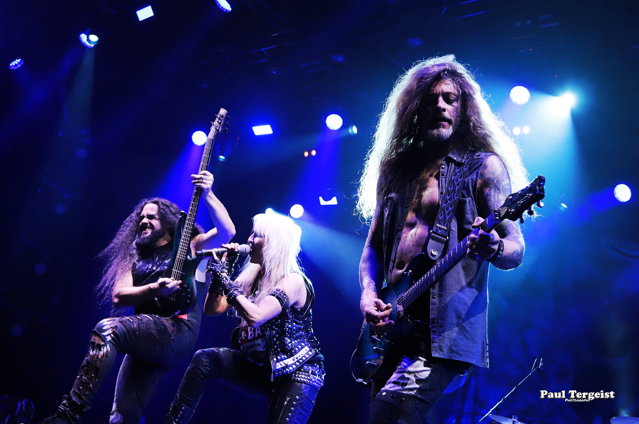 Comme d’habitude, I Rule the Ruins, de Warlock, lance le set, parfait pour remplir cet office avec son riff agressif qui galvanise immédiatement la foule et son refrain bien senti. Trois autres titres de l’ancien groupe de Doro arrivent à la suite, dont Burning the Witches, « par lequel tout a commencé« , déclare Doro, puisqu’il s’agit du morceau titre du premier album de Warlock, devenu depuis longtemps un classique du heavy metal. Children of the Dawn sera le premier extrait du nouvel album, Conqueress – Forever Strong and Proud, qui sortait la veille, à être joué. Révélateur de la très bonne qualité de ce dernier, il s’agit d’un titre heavy et mid-tempo, relevé par des chœurs masculins épiques. Pour l’occasion, des figurants grimés en guerriers se postent en fond de scène. De la Guerre du feu à une sorte de Terminator post-apocalyptique, il y en a pour tous les goûts. Visuellement, ça le fait, et tel est le but. Time for Justice, le premier single du nouvel opus à avoir été révélé, s’ensuit et confirme la bonne impression quant à la teneur de la galette. Touch of Evil, titre tonitruant et speed de Warlock, sera l’occasion de voir apparaître la première invitée de la soirée, Alissa White-Gluz (Arch Enemy) qui, comme les autres prestataires, chantera seule certains passages, en alternance avec Doro, et la rejoindra en duo à d’autres moments et pour les refrains. Walking with the Angels est issu de l’album Fear No Evil (2009) et était co-interprété, dans sa version studio, par Tarja Turunen… qui a aussi fait le déplacement pour assurer ses parties vocales ce soir. Plus tard, Love Me Forever, reprise de Motörhead apparaissant sur Calling the Wild (2000), sera l’occasion pour Jennifer Haben (Beyond the Black) de poser sa voix sur ce superbe morceau. Plus surprenante, en tout cas si l’on n’est pas allemand, est l’intervention de Sammy Amara, chanteur et guitariste du groupe punk rock de Düsseldorf The Broilers, sur Bond Unending, extrait du nouveau Doro.