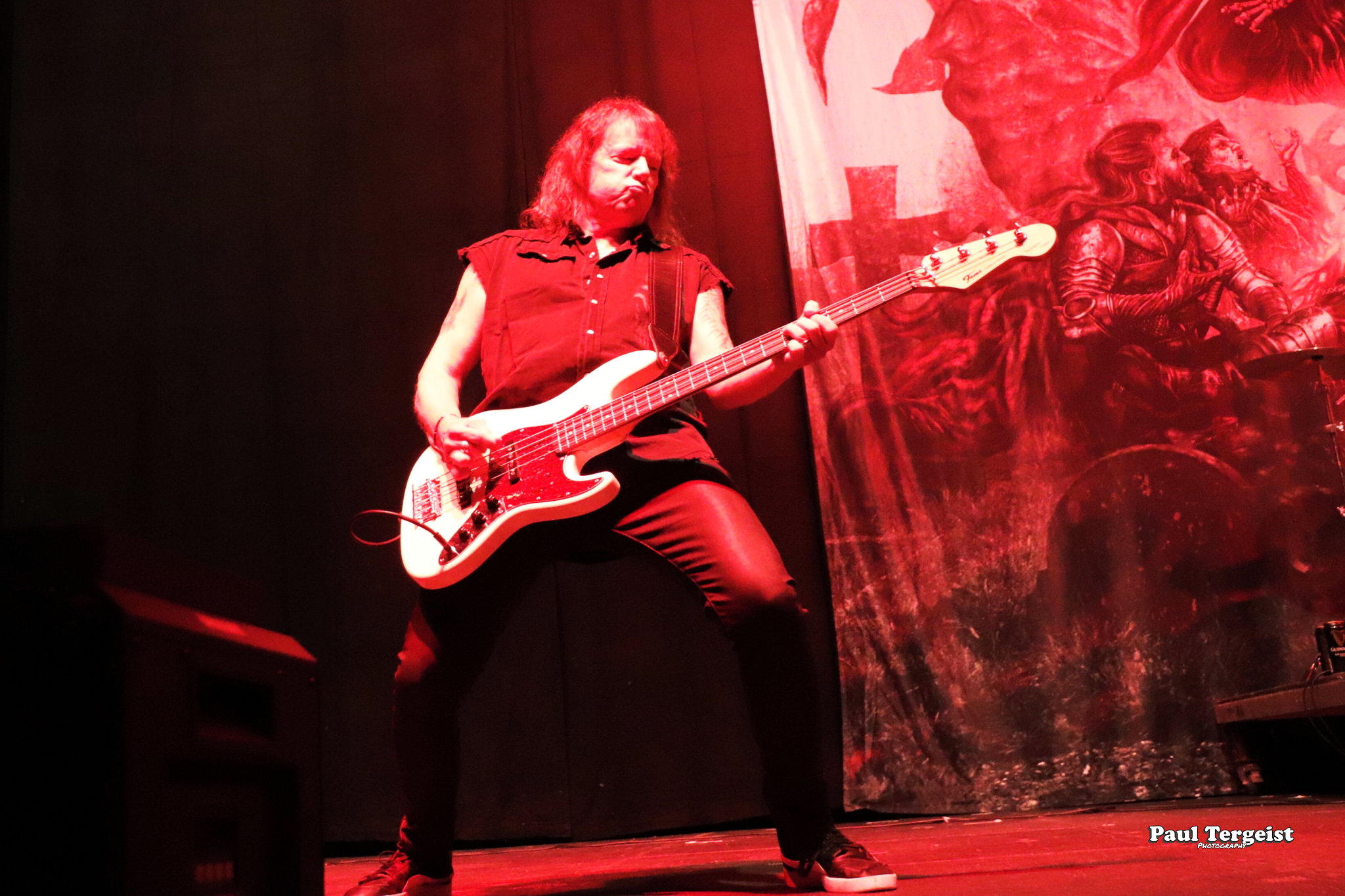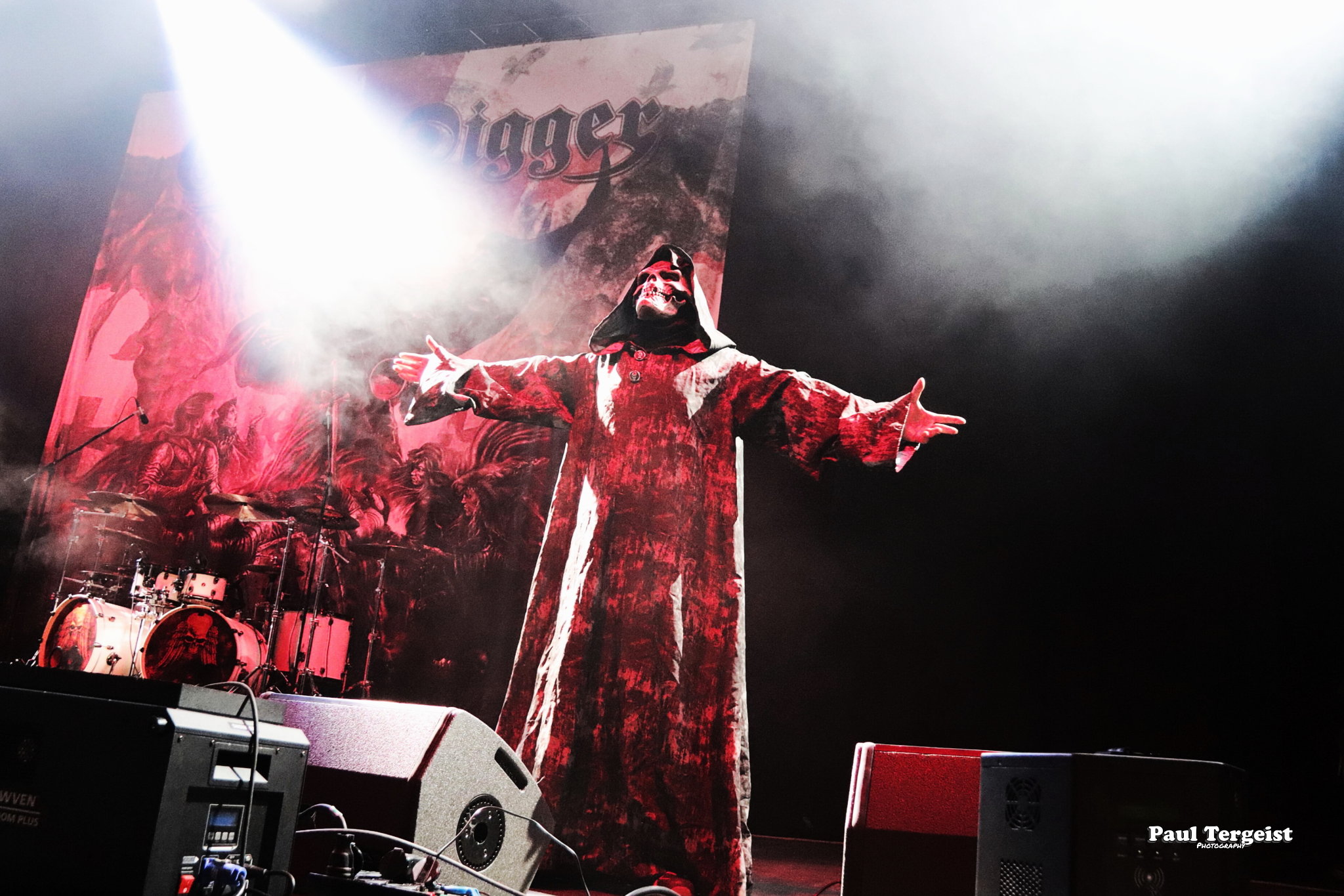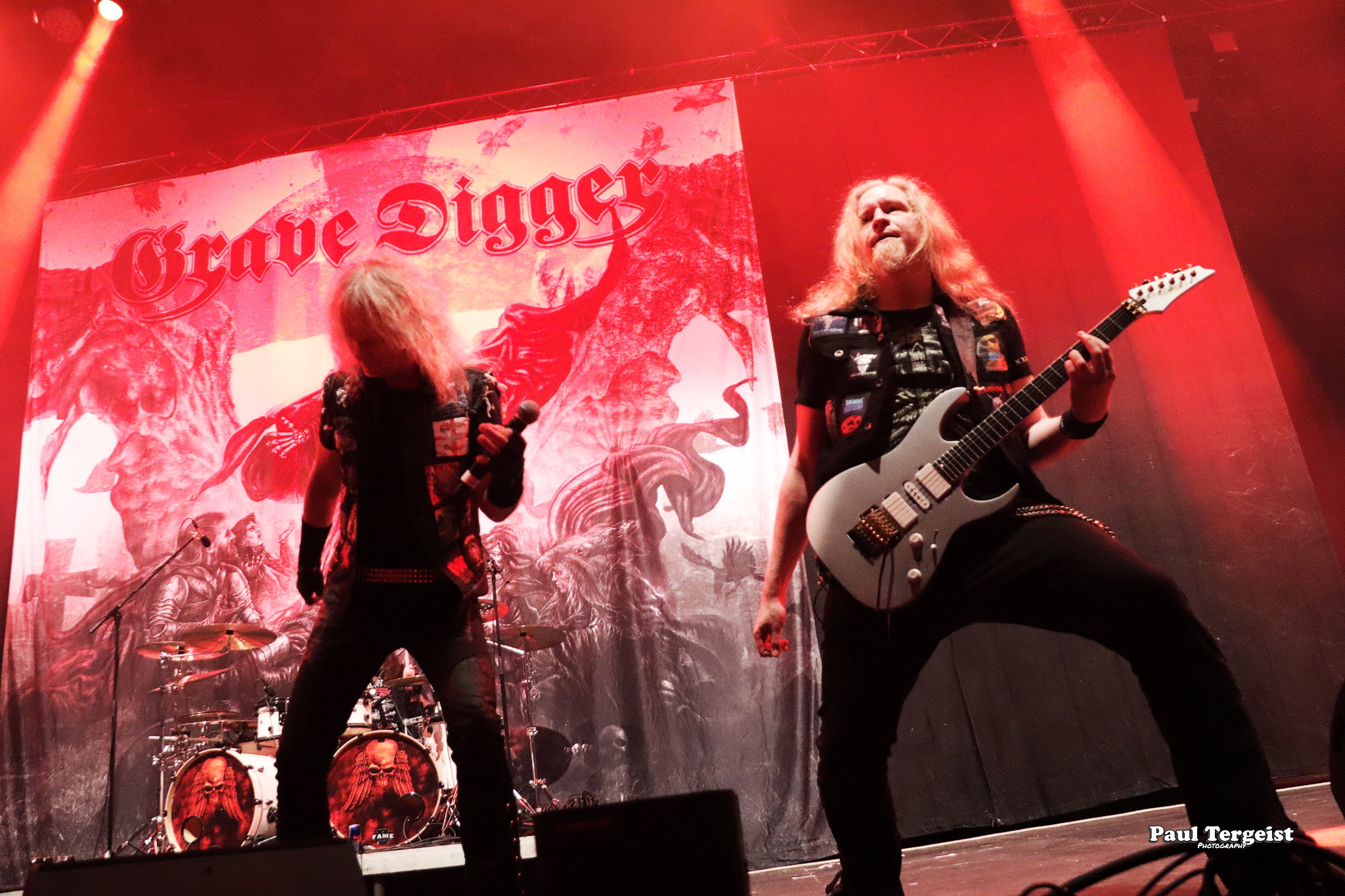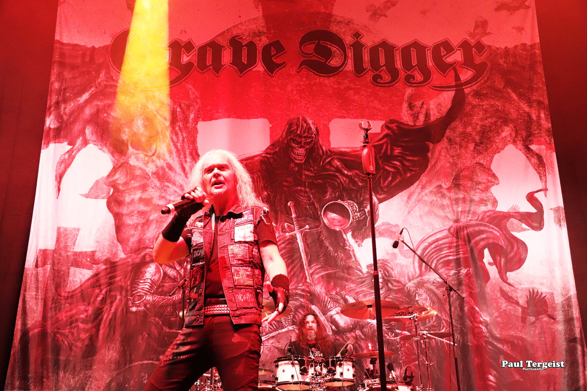 Toutefois, commençons par nous pencher sur la première partie de luxe : honneur à d’autres légendes du metal germanique, Grave Digger, dont le premier album, Heavy Metal Breakdown, devrait, espérons-le, lui aussi donner lieu à du happening en 2024, puisqu’il marquera à son tour les quarante ans de carrière discographique du groupe. En attendant, nous constatons, ceci dès le début du set, que le quatuor bénéficie d’un son impeccable, rond, équilibré, clair et au volume optimal — ce qui est rare pour un groupe d’ouverture. Doro respecte ses premières parties et cela s’entend ! Le guitariste Axel Ritt, pourtant en poste depuis 2009, ne fait plus partie de l’aventure et est désormais remplacé par Tobias Kersting, membre d’Orden Ogan de 2008 à 2017. La première moitié du set met l’accent sur le répertoire le plus récent. Véritable festival de riffs bien carrés, cette première demi-heure démontre que si Grave Digger a pu sortir quelques albums peu marquants durant la dernière décennie, ceux-ci comportent néanmoins leur lot de titres efficaces. La seconde demi-heure verra s’enchaîner les classiques, dont The Round Table (Forever), Excalibur, The Dark of the Sun et, évidemment, Rebellion (The Clans Are Marching) et Heavy Metal Breakdown. Une heure de concert en tout, pour un public qui se montre réceptif, sans plus au début, puis qui s’échauffe progressivement.