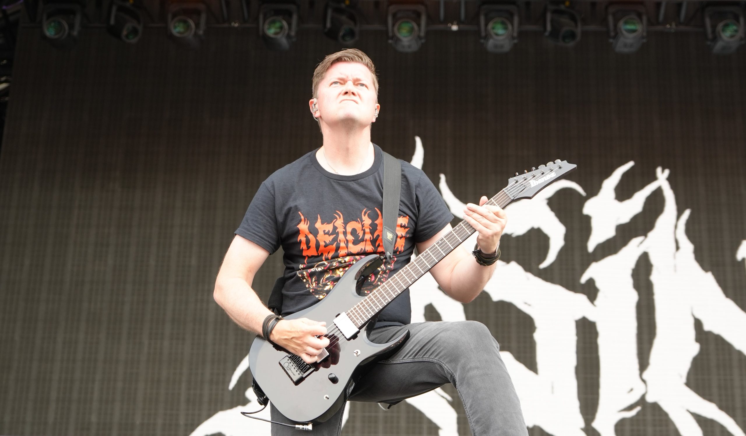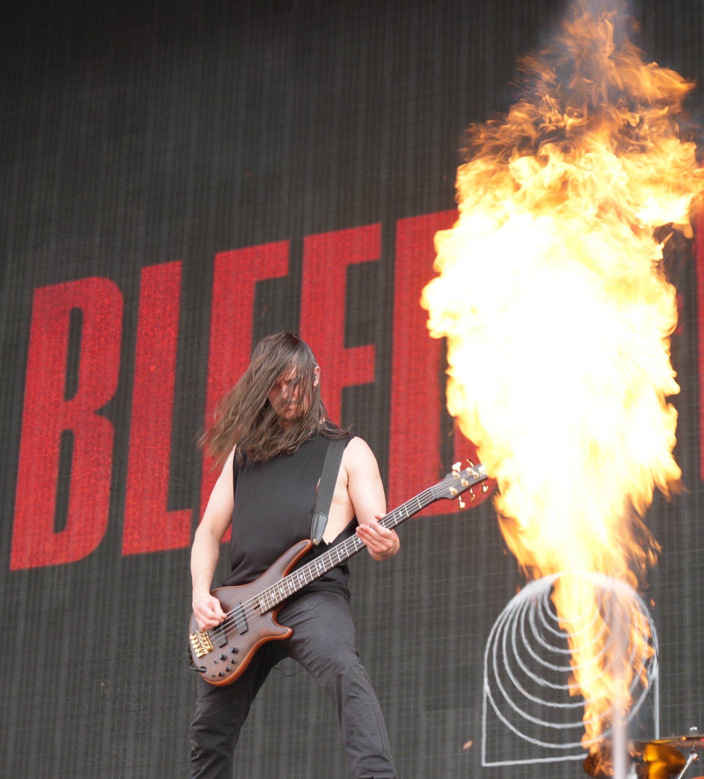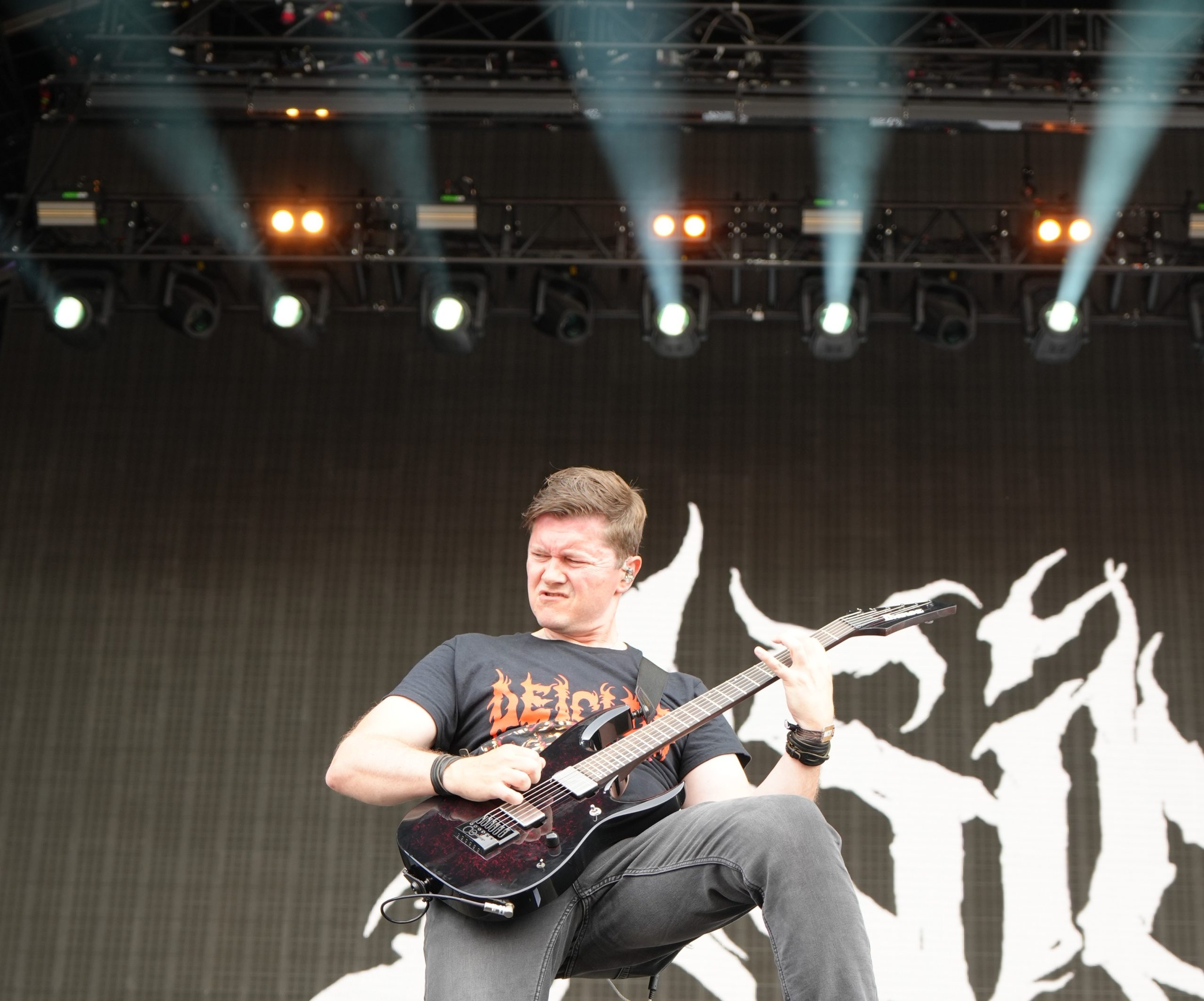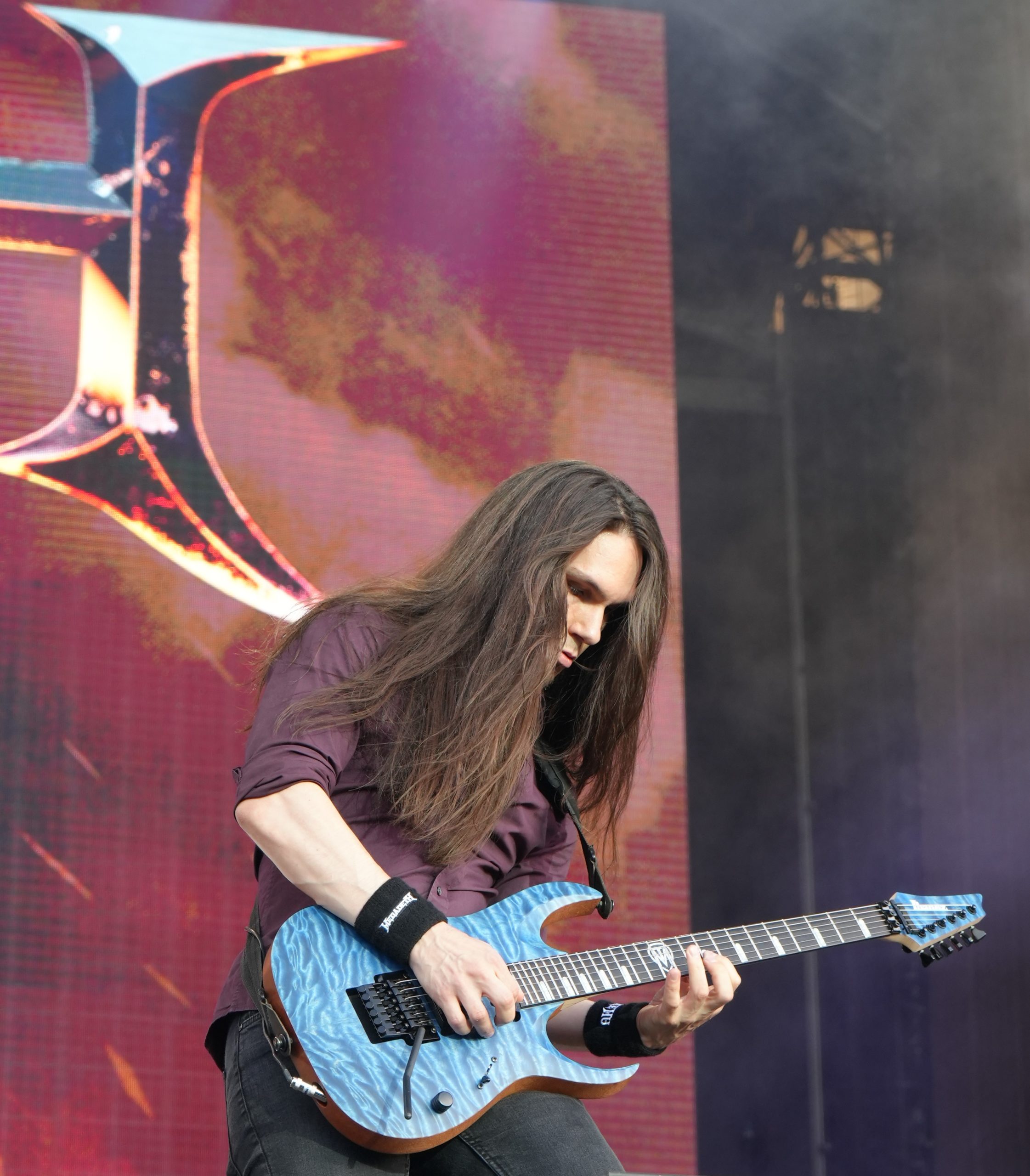 Ensuite, direction la zone de guerre pour la prestation de Dying Wish. A 19 h 06, un air frais commence enfin à souffler après la chaleur écrasante présente depuis le matin (spoiler alert bis : vous verrez qu’il y a aussi de la pluie. Beaucoup de pluie…) La puissance féminine de la voix d’Emma Boster, qui passe de la voix de tête au growl, est appréciable. Son accent particulièrement marqué quand elle chante en voix de tête est appuyé par Sam Reynolds, qui ajoute sa voix basse et résonnante pour donner une profondeur supplémentaire au chant. Les musiciens de Dying Wish nous offrent un morceau spécial Hellfest. De la zone PMR, on entend mal le moulinage à la guitare ; en s’approchant, le son est plus agréable. Un petit bémol pour les claviers qui sont enregistrés ; bon point, cependant, pour le bassiste qui tabasse dans les règles. C’est validé !