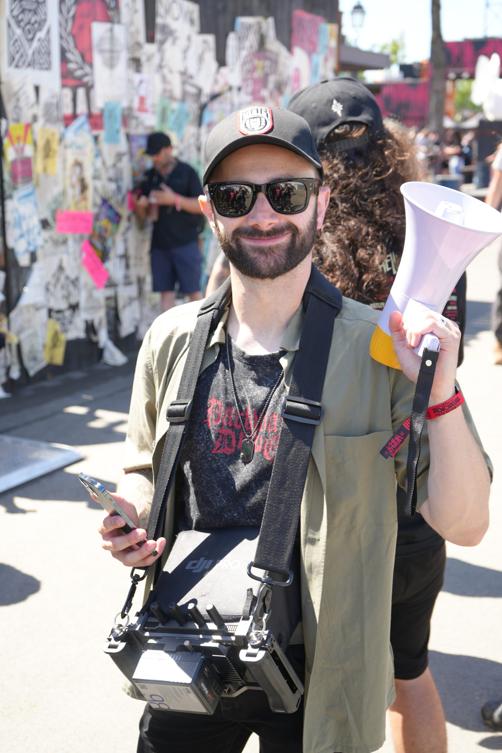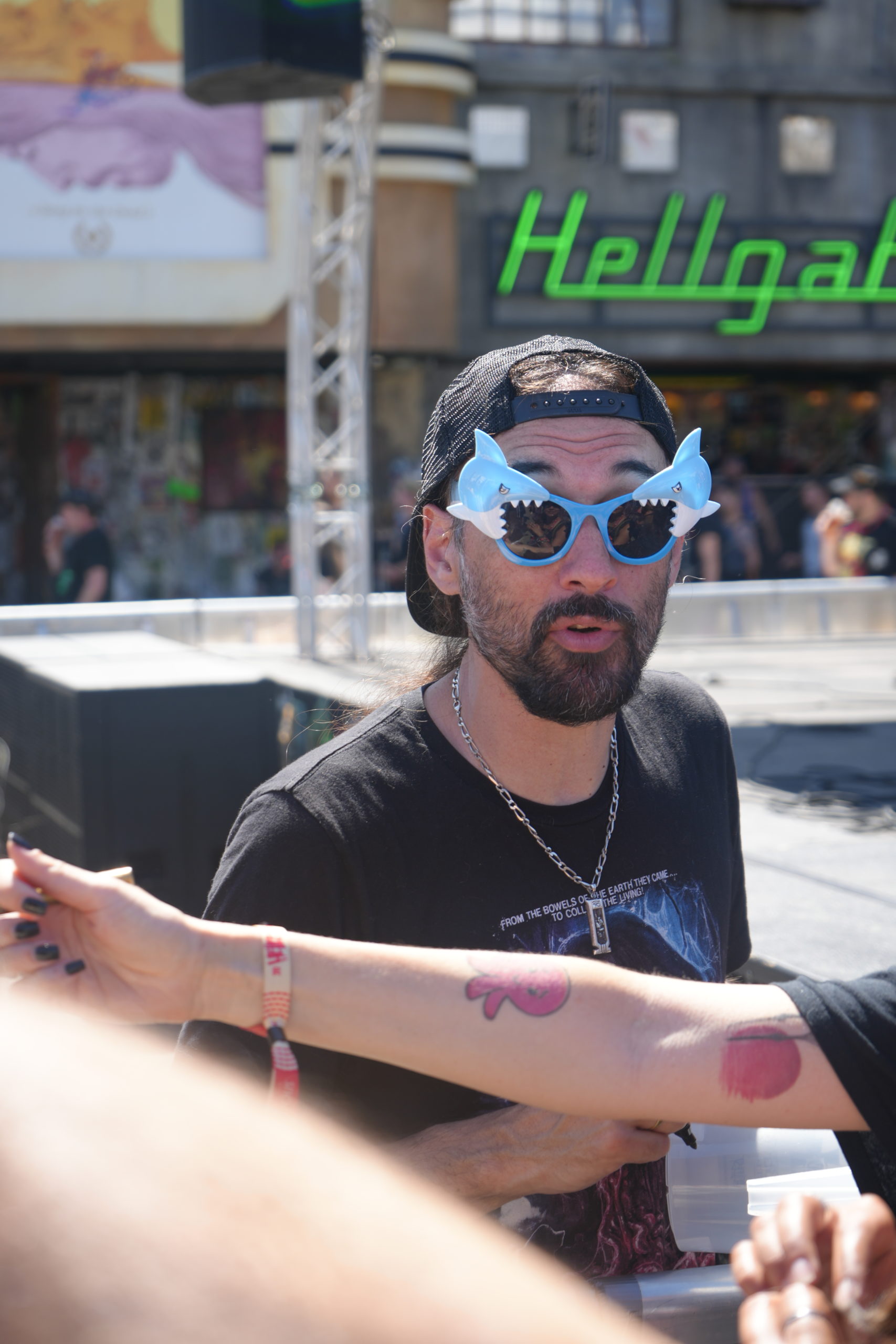 En ce dimanche matin, Emy s’est en premier dirigée vers la Hellstage, priant le dieu soleil (Hélios, Râ ou qui vous voulez) pour que la météo permette le tournage du clip d’Ultra Vomit et… c’est gagné ! Comme la veille, les figurants sont répartis en petits groupes. L’idée est de filmer une scène générale devant la cathédrale — attention spoiler ! Pour le clip de (on suppose) Doigts de Metal, une scène avec l’ensemble des figurants a donc été tournée en plein devant l’entrée du festival. Le groupe des « déguisés » — si vous ne comprenez pas, allez donc lire le live report du troisième jour — a formé une haie devant une petite tente Quechua de laquelle sort Fetus en chantonnant. Nous autres figurants faisons ensuite un wall of death géant sur l’ensemble du groupe qui attendait Fetus au bout du tunnel de gens déguisés. Pour les plus vaillants, dont Emy, d’autres scènes ont été tournées devant la Hellstage ; mais on ne vous en dit pas plus : vous verrez tout cela en septembre ! On a hâte de voir le résultat — et si Emy sera coupée au montage ou non. Dans tous les cas, il faut noter la gentillesse, la bonne humeur et la bienveillance de l’ensemble des figurants, d’Ultra Vomit et de l’équipe de réalisation et de tournage. Big up à Julien Josselin.
