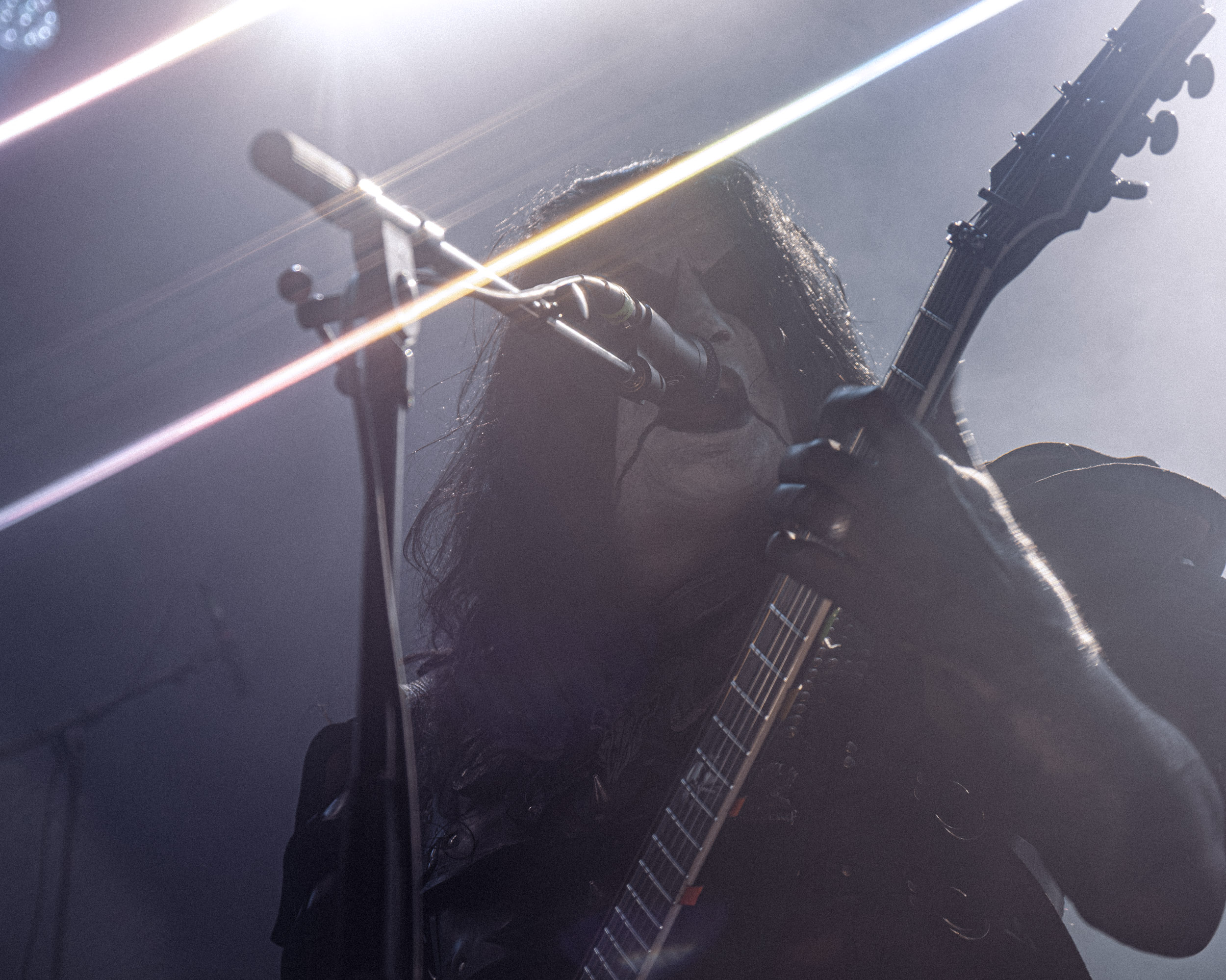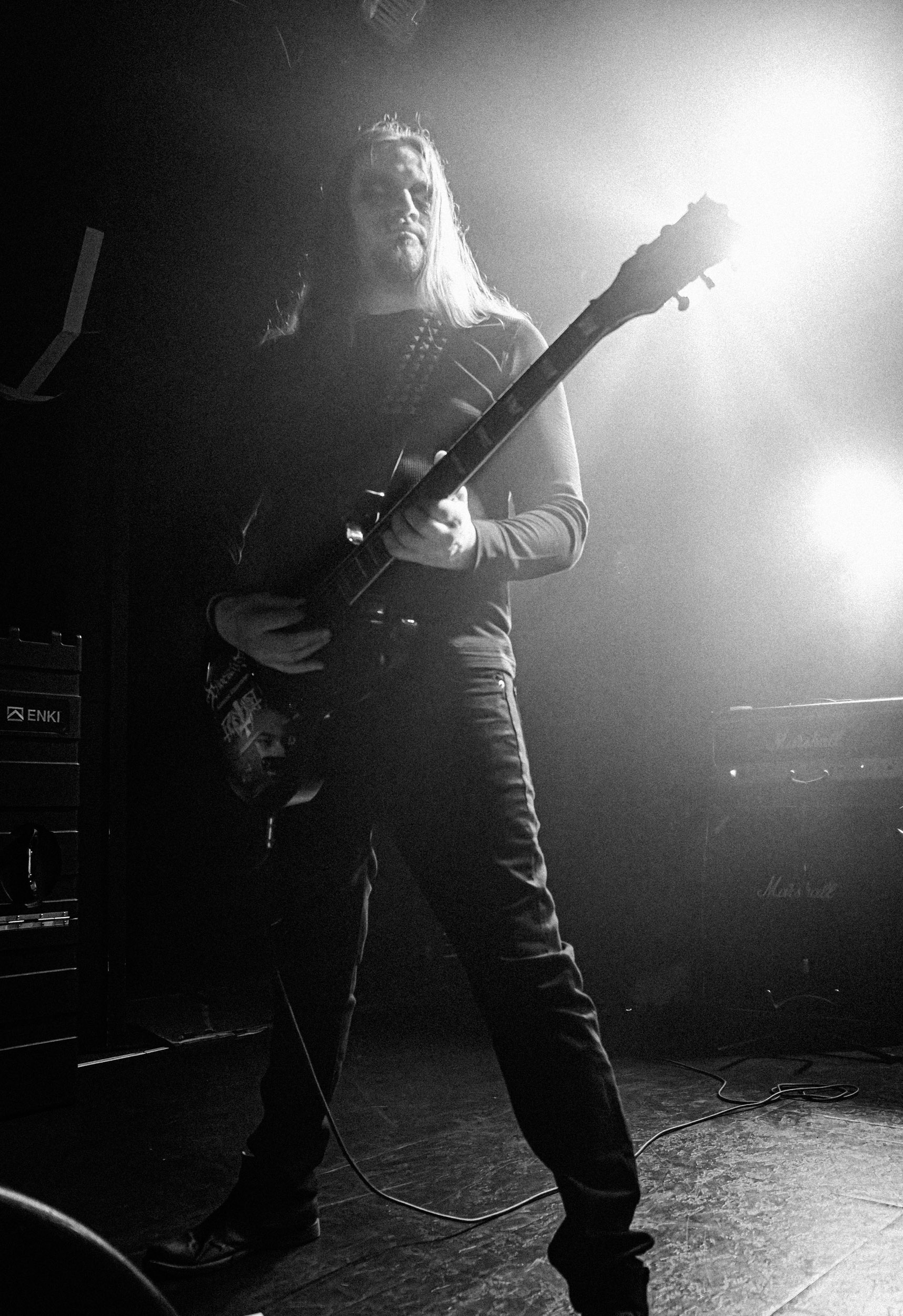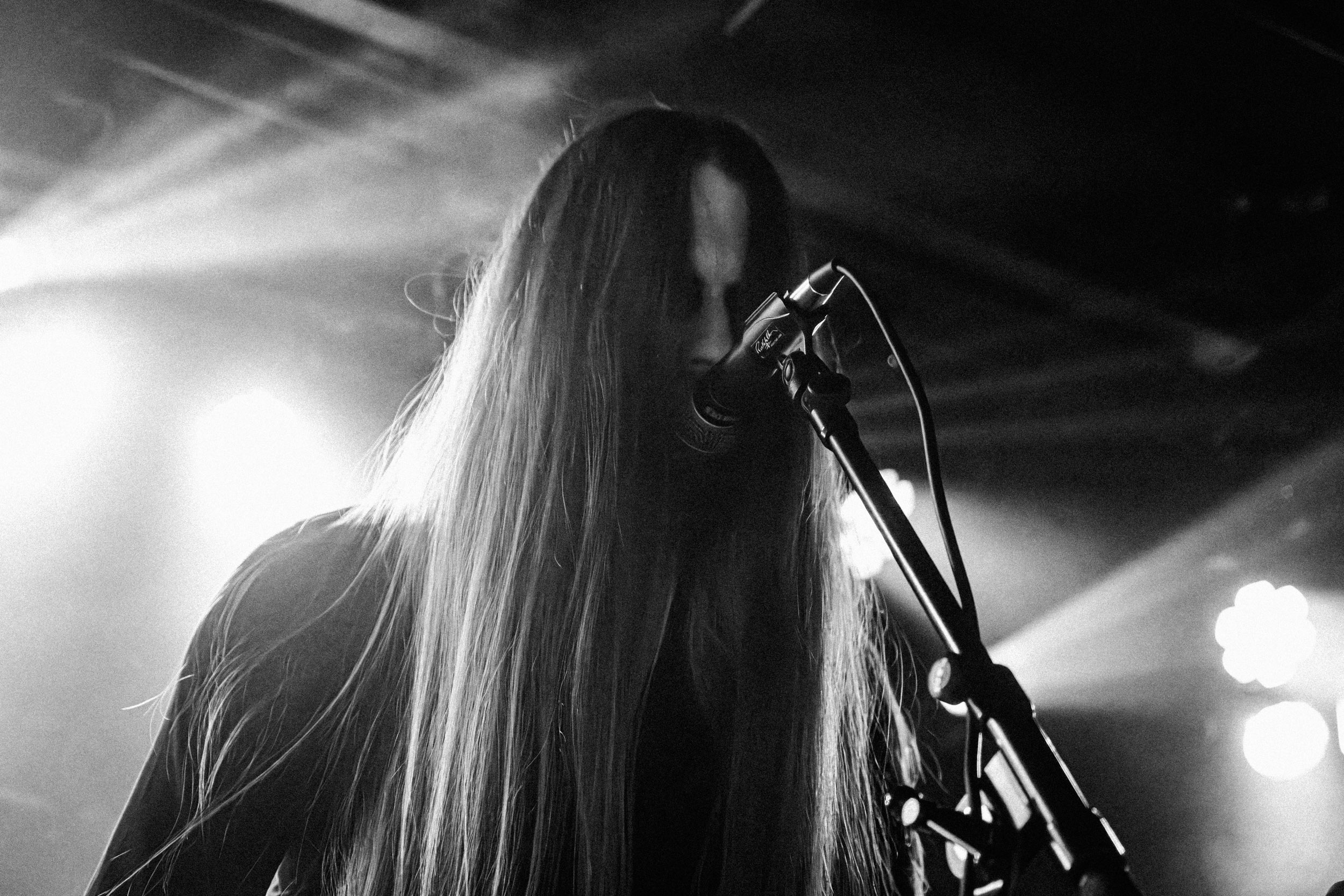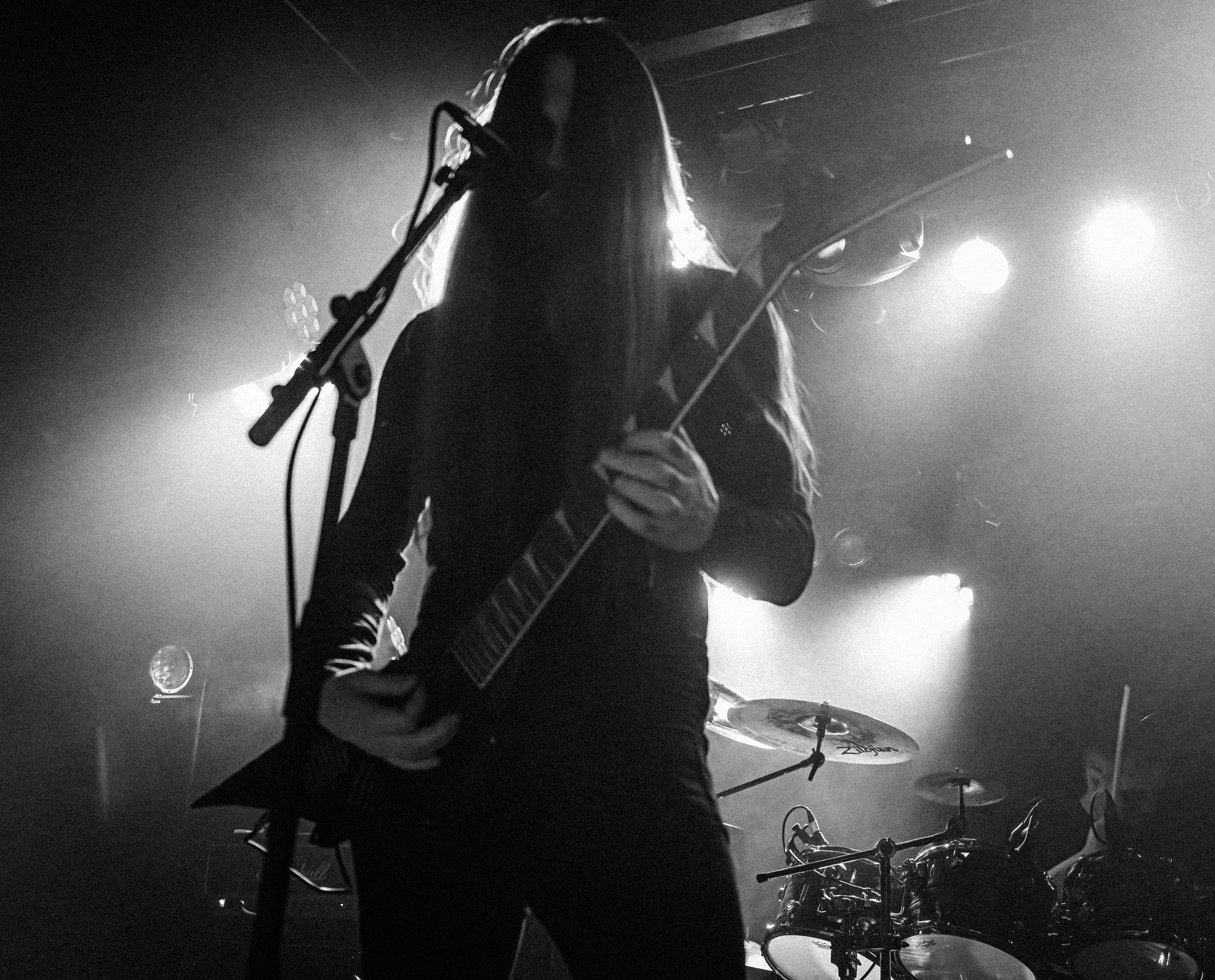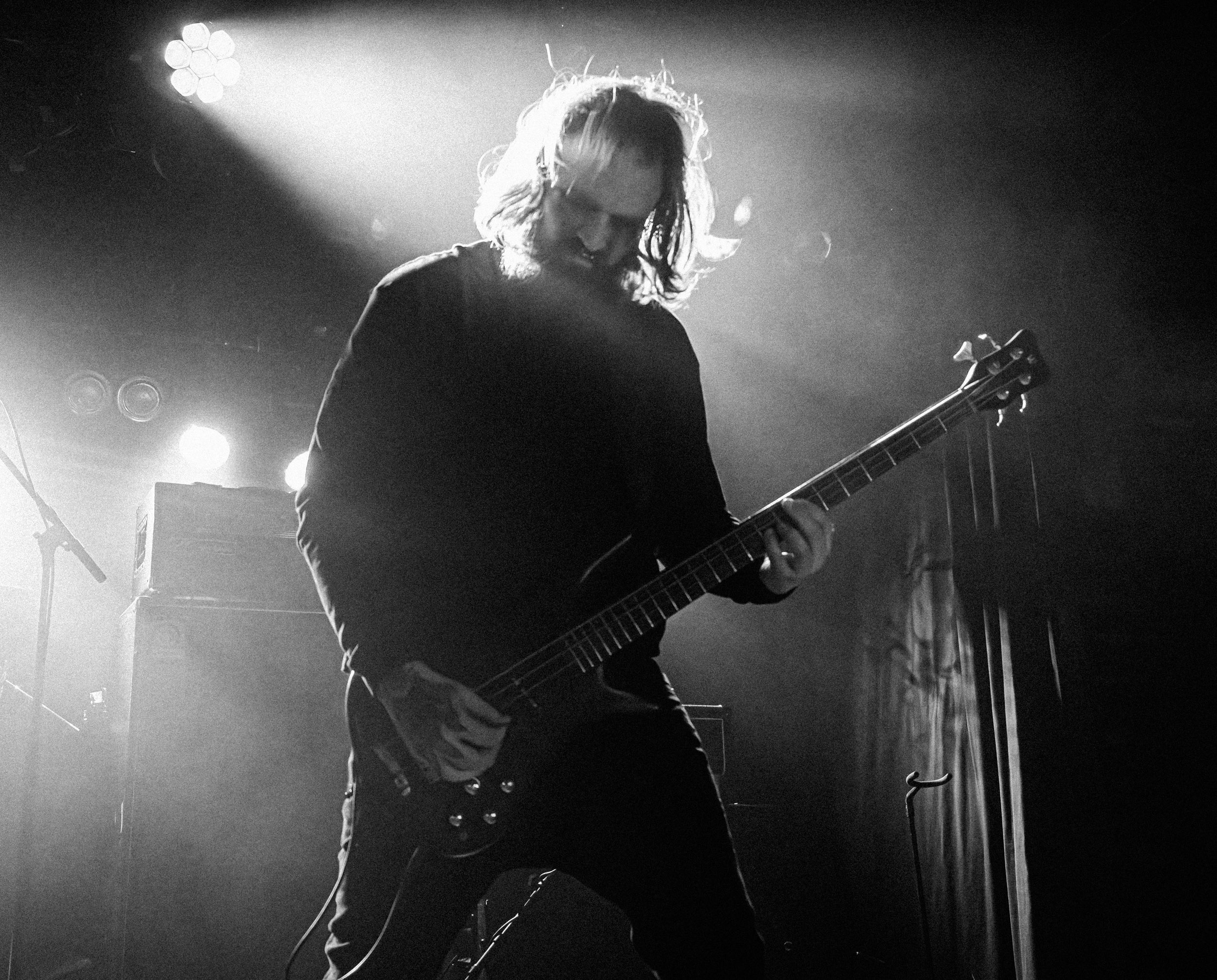 Udåd : Si Udåd vient tout juste d’émerger avec la sortie de son premier album éponyme en 2024, son fondateur, lui, est loin d’être un inconnu. Pour cause : il s’agit de Thomas Eriksen, l’homme derrière la valeur sûre Mork. Ce nouveau projet se distingue toutefois de son grand frère de par son approche très brute et dépouillée, aussi bien au niveau de l’écriture et de la musicalité que du mixage sonore. Le rythme de l’ensemble oscille entre lent et mid, porté par des morceaux au rythme ternaire leur donnant des airs de valse mortuaire. En résulte une ambiance froide et austère, renforcée par la distance dont font montre les musiciens, qui ne répondent que par le son de leurs instruments aux injonctions des spectateurs. Thomas Eriksen, dans son rôle de frontman, paraît comme une présence fantomatique, le visage caché derrière ses cheveux, le reverb sur sa voix — unique effet sonore que se permet le mixage — renforçant d’autant plus cette apparence surnaturelle. L’éclairage monochrome rouge, qui ne change pas ou alors très peu, couplé à l’absence de lumières de face, ajoute la touche finale à cette atmosphère d’un autre monde. En tout cas, le stoïcisme et la dévotion des membres d’Udåd imposent respect et admiration ; de même, les morceaux ont quelque chose d’à la fois entêtant et envoûtant, pesant sur l’esprit aussi… L’un de ceux joués en dernier met en avant un petit passage en guitare lead au son grinçant et plaintif. [Ségolène]