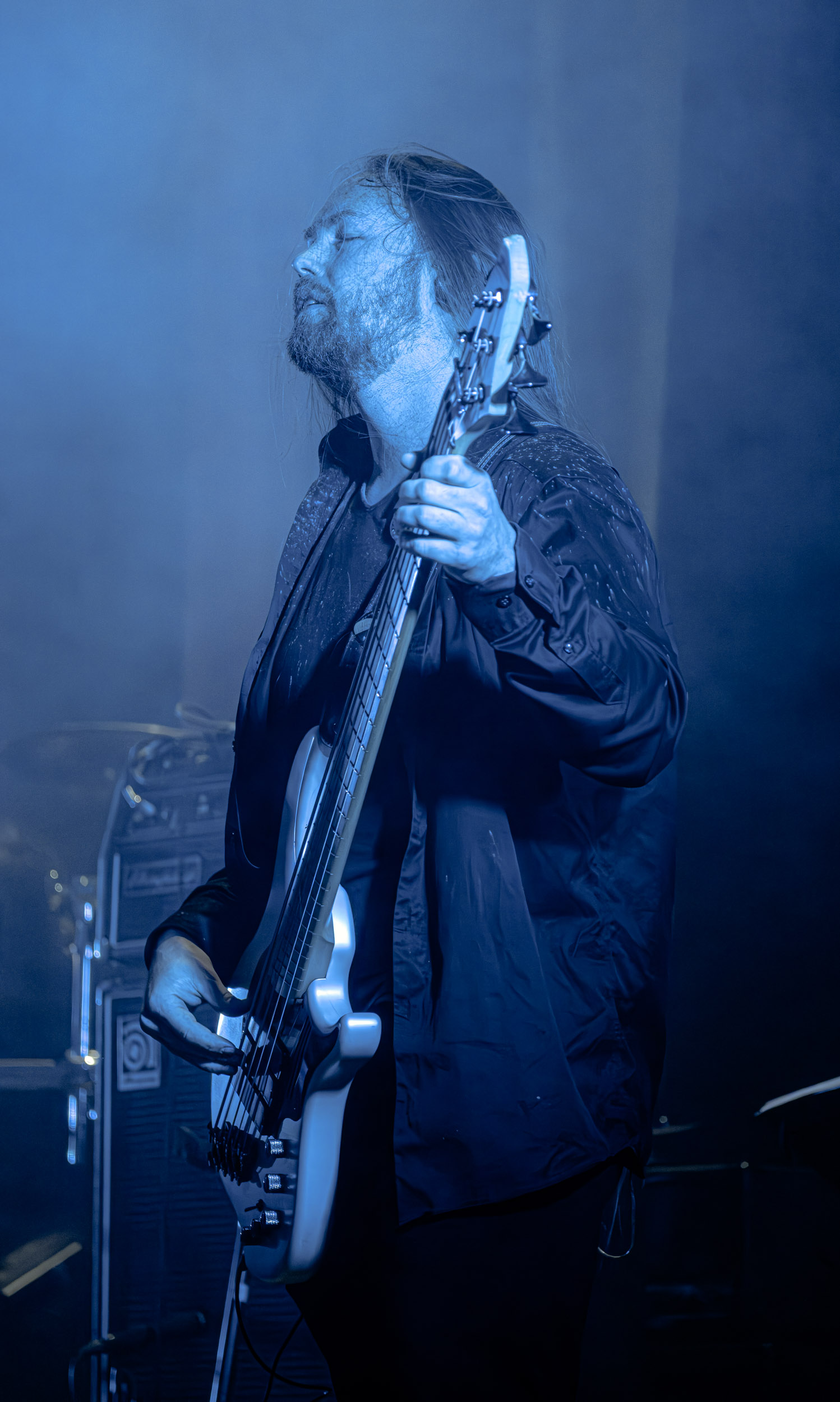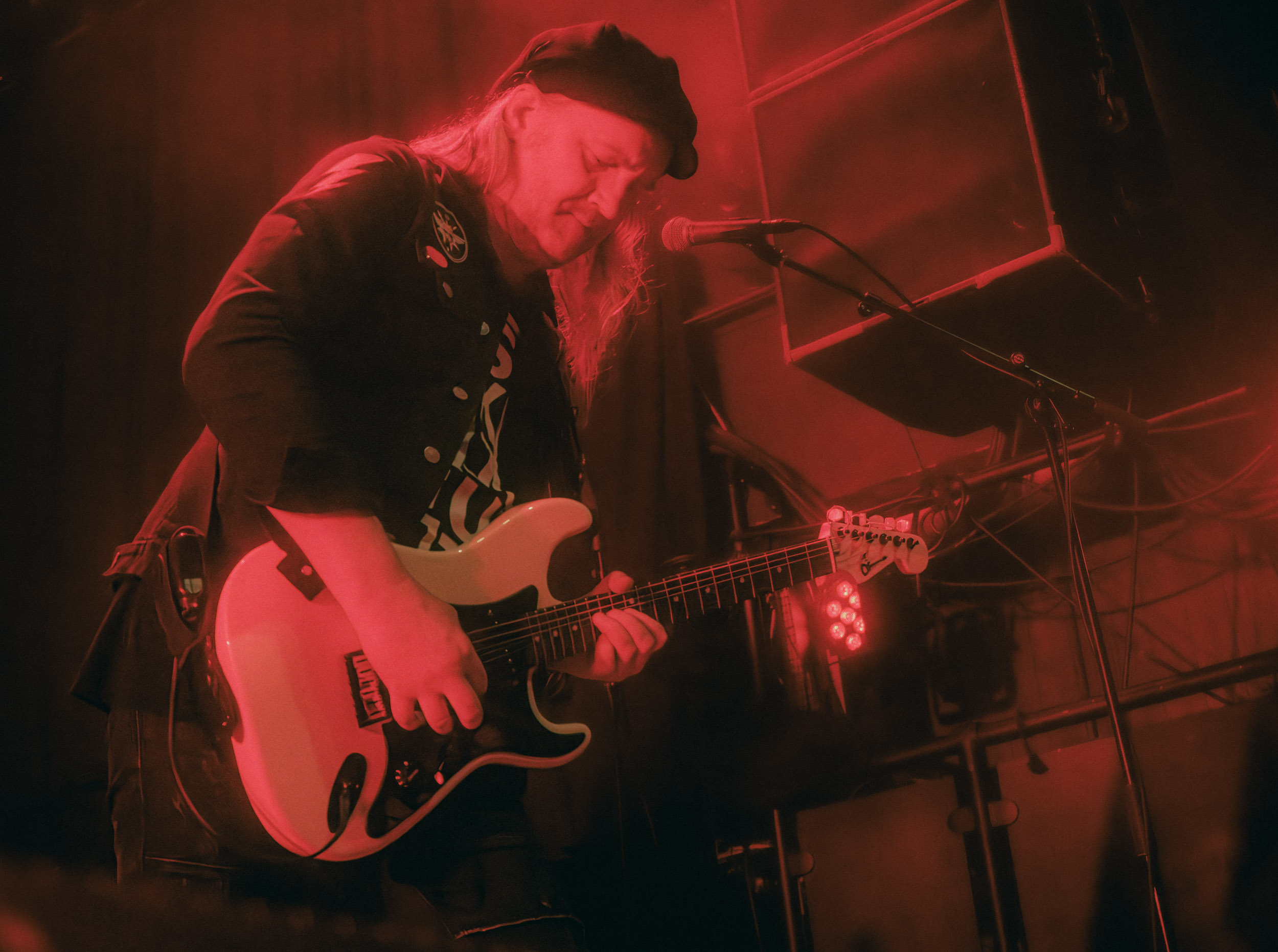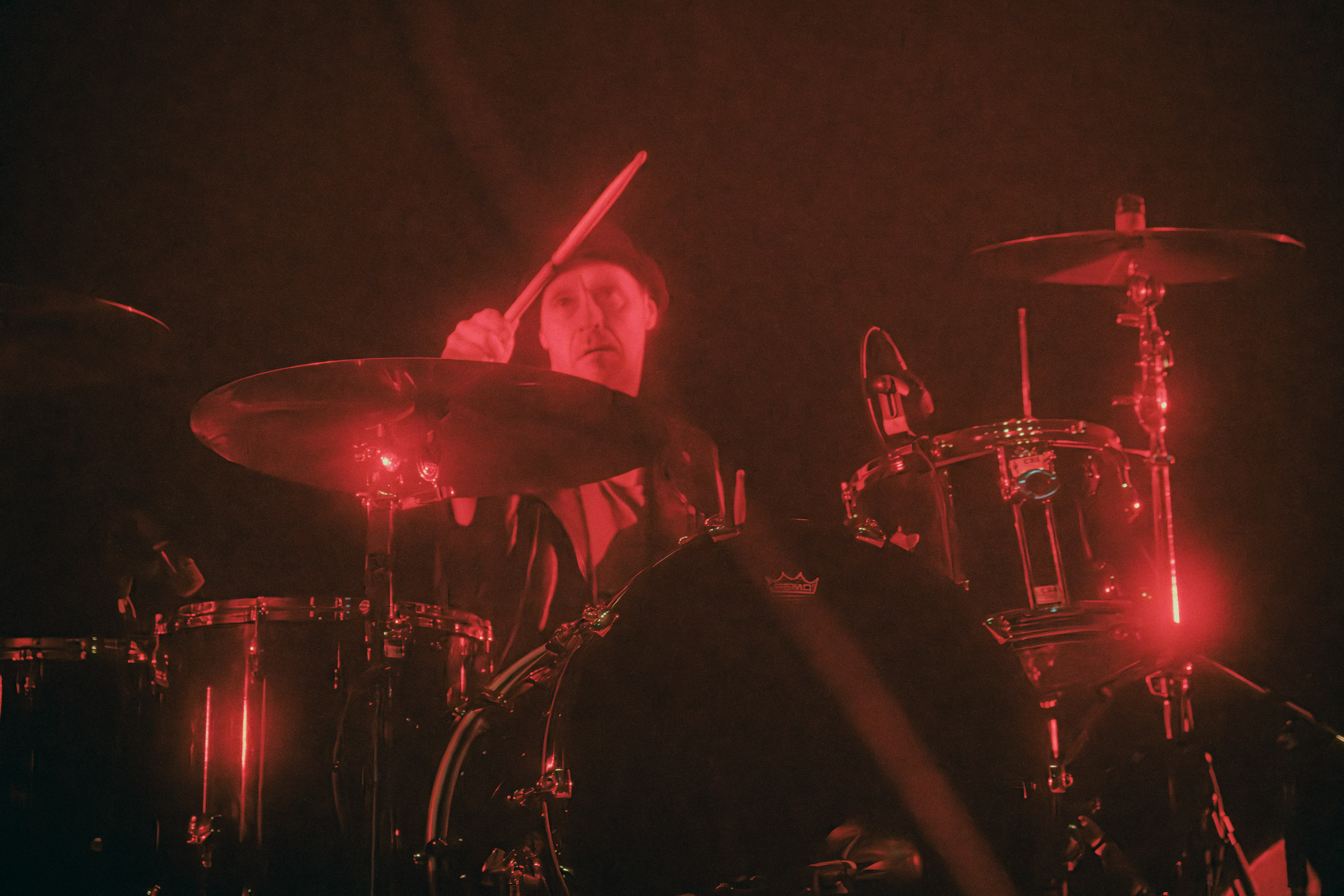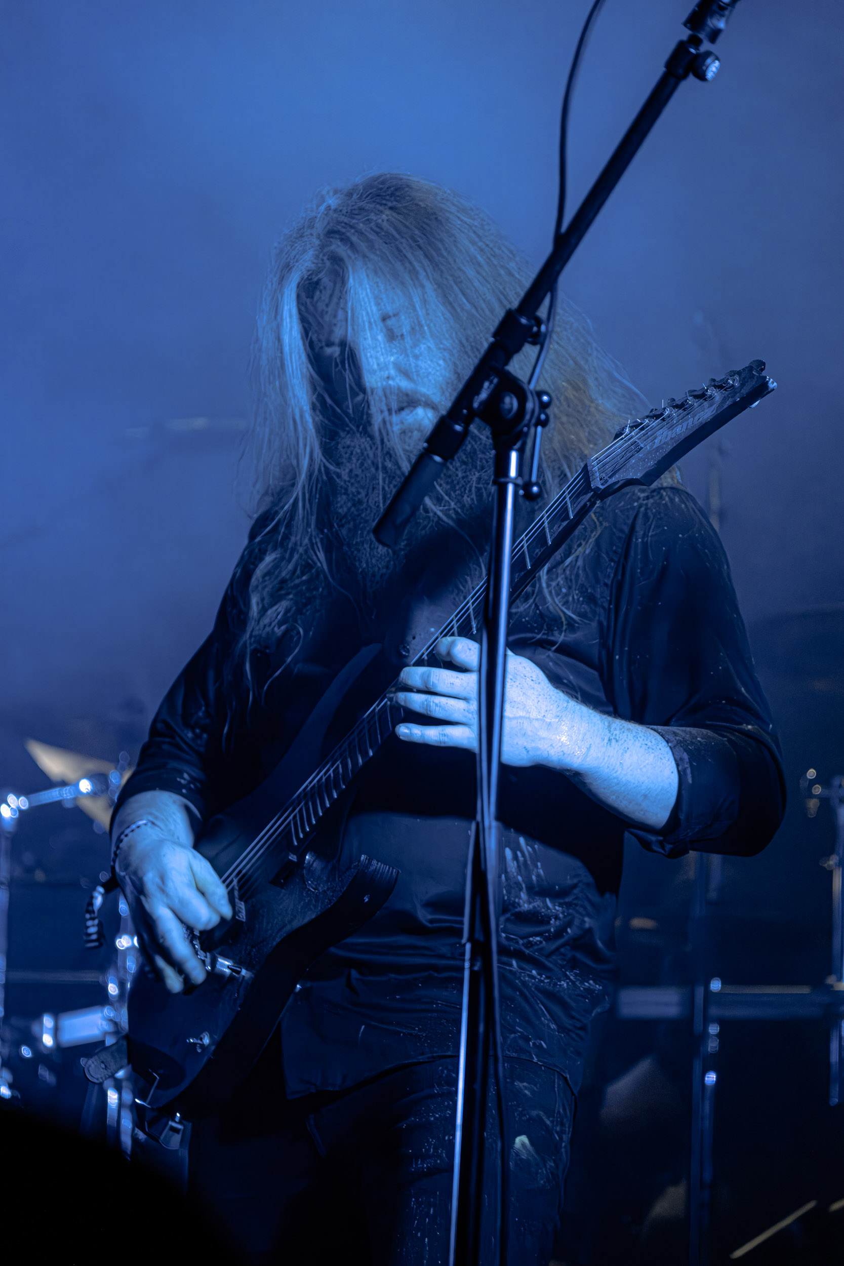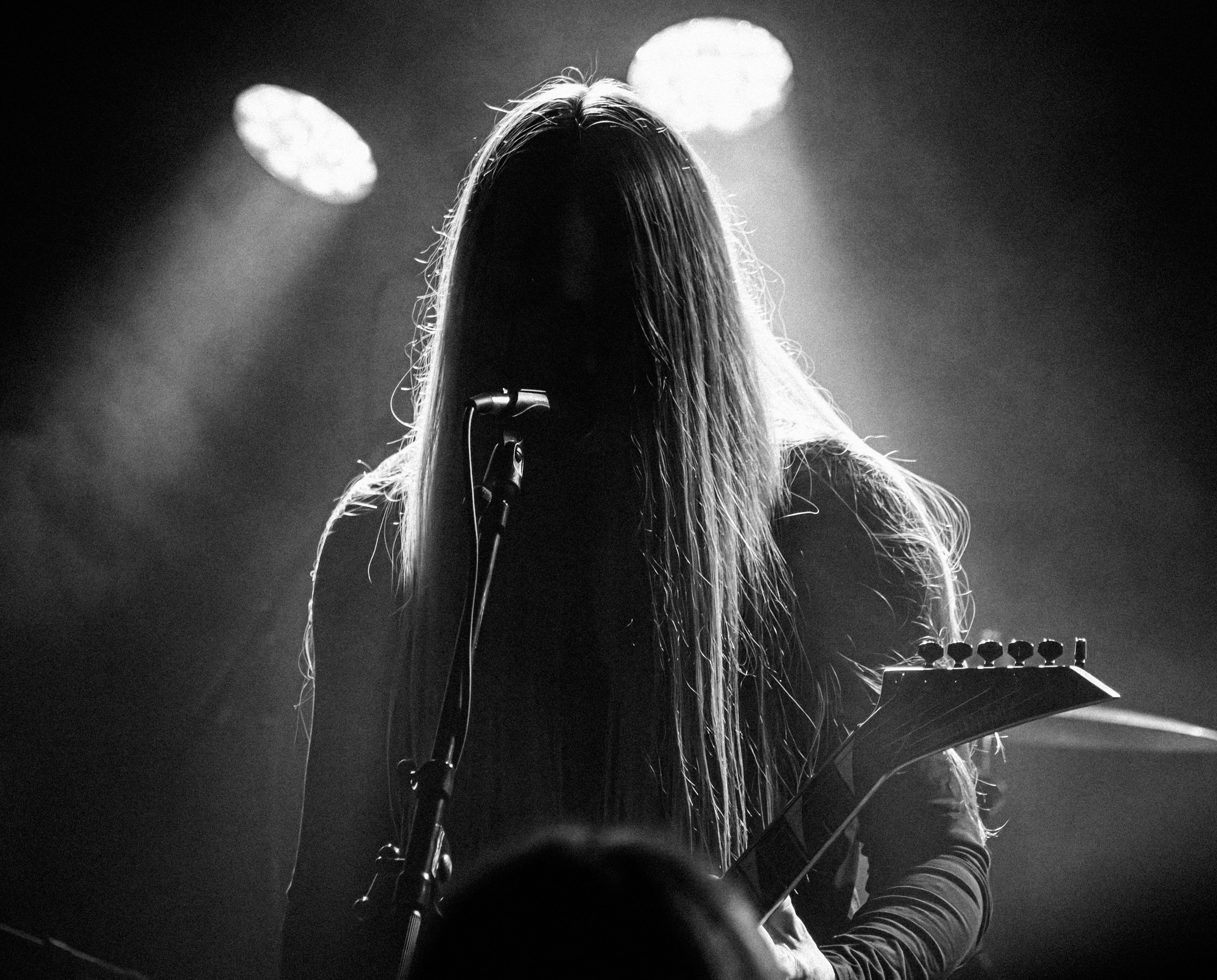 Udåd : Si Udåd vient tout juste d’émerger avec la sortie de son premier album éponyme en 2024, son fondateur, lui, est loin d’être un inconnu. Pour cause : il s’agit de Thomas Eriksen, l’homme derrière la valeur sûre Mork. Ce nouveau projet se distingue toutefois de son grand frère de par son approche très brute et dépouillée, aussi bien au niveau de l’écriture et de la musicalité que du mixage sonore. Le rythme de l’ensemble oscille entre lent et mid, porté par des morceaux au rythme ternaire leur donnant des airs de valse mortuaire. En résulte une ambiance froide et austère, renforcée par la distance dont font montre les musiciens, qui ne répondent que par le son de leurs instruments aux injonctions des spectateurs. Thomas Eriksen, dans son rôle de frontman, paraît comme une présence fantomatique, le visage caché derrière ses cheveux, le reverb sur sa voix — unique effet sonore que se permet le mixage — renforçant d’autant plus cette apparence surnaturelle. L’éclairage monochrome rouge, qui ne change pas ou alors très peu, couplé à l’absence de lumières de face, ajoute la touche finale à cette atmosphère d’un autre monde. En tout cas, le stoïcisme et la dévotion des membres d’Udåd imposent respect et admiration ; de même, les morceaux ont quelque chose d’à la fois entêtant et envoûtant, pesant sur l’esprit aussi… L’un de ceux joués en dernier met en avant un petit passage en guitare lead au son grinçant et plaintif. [Ségolène]