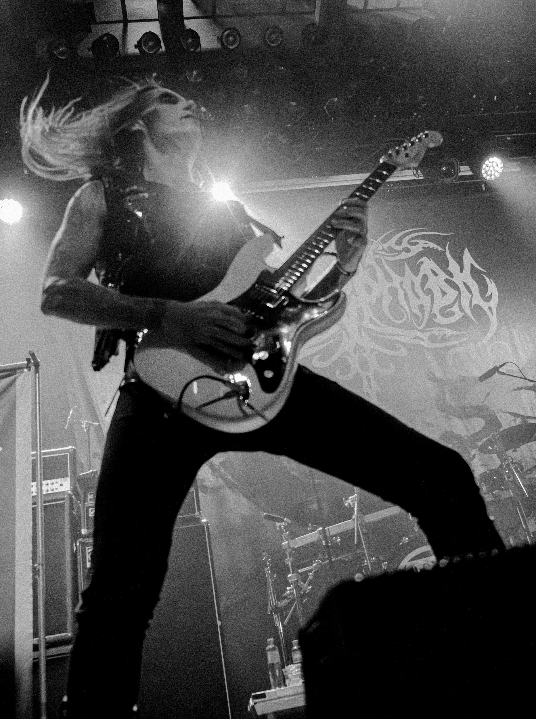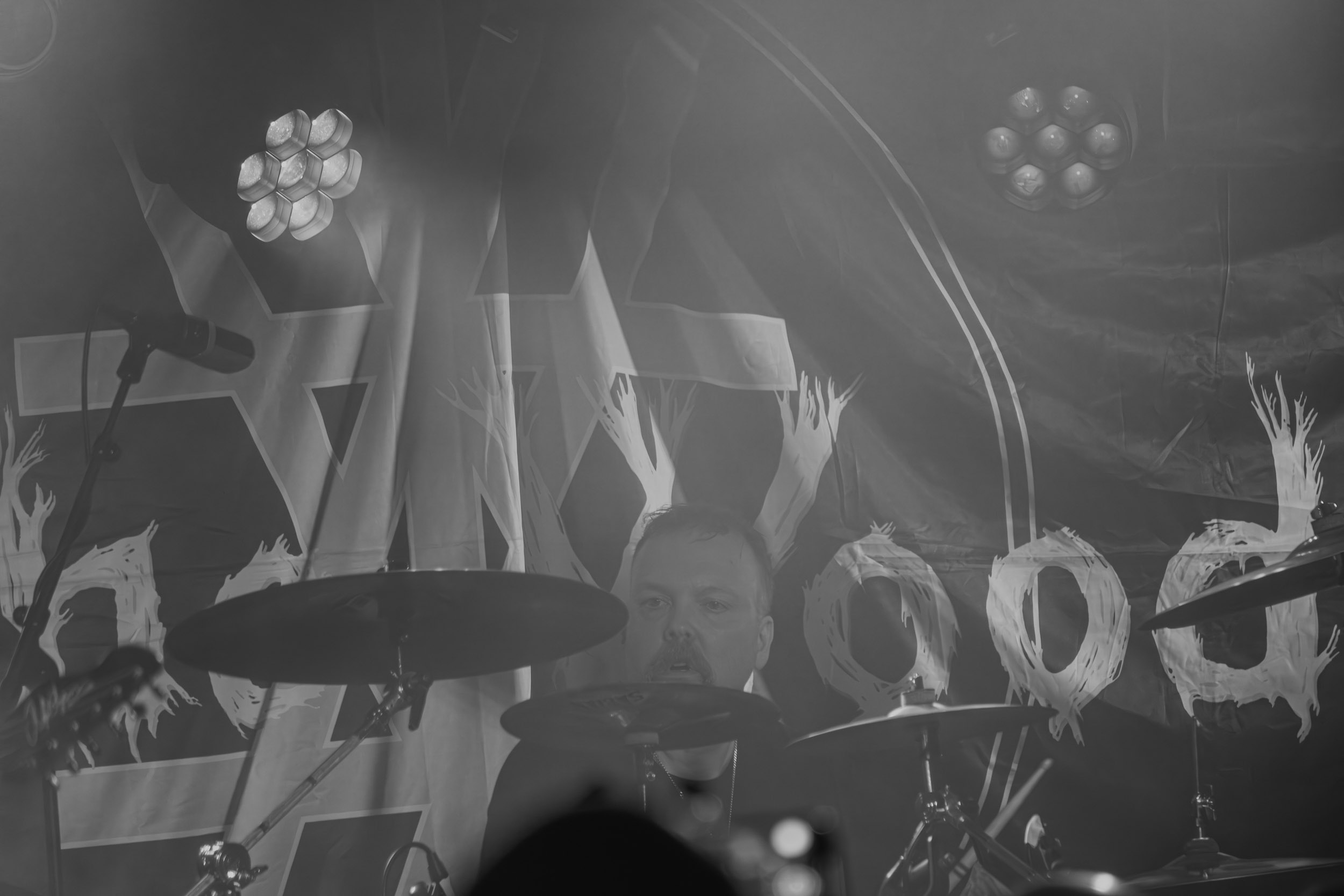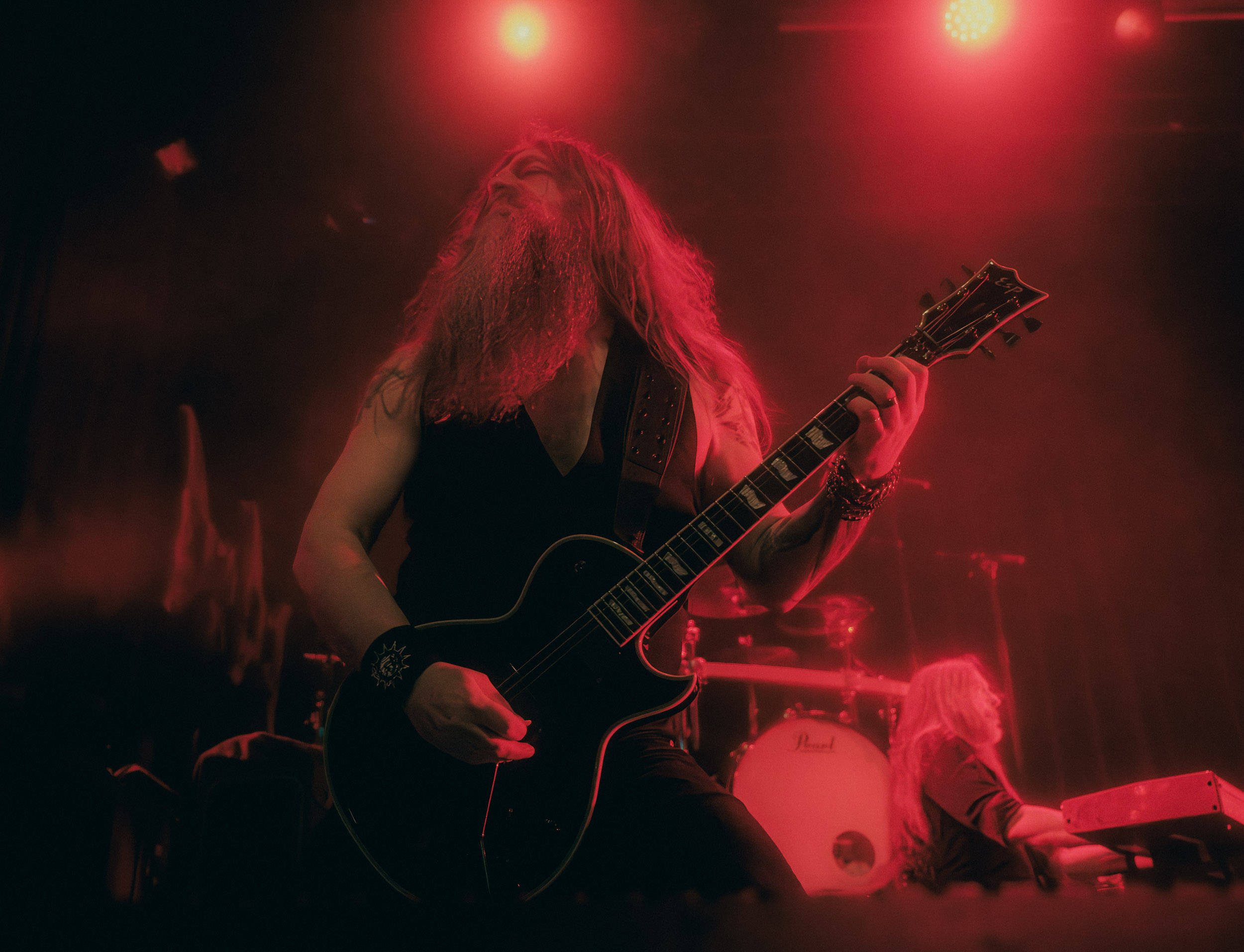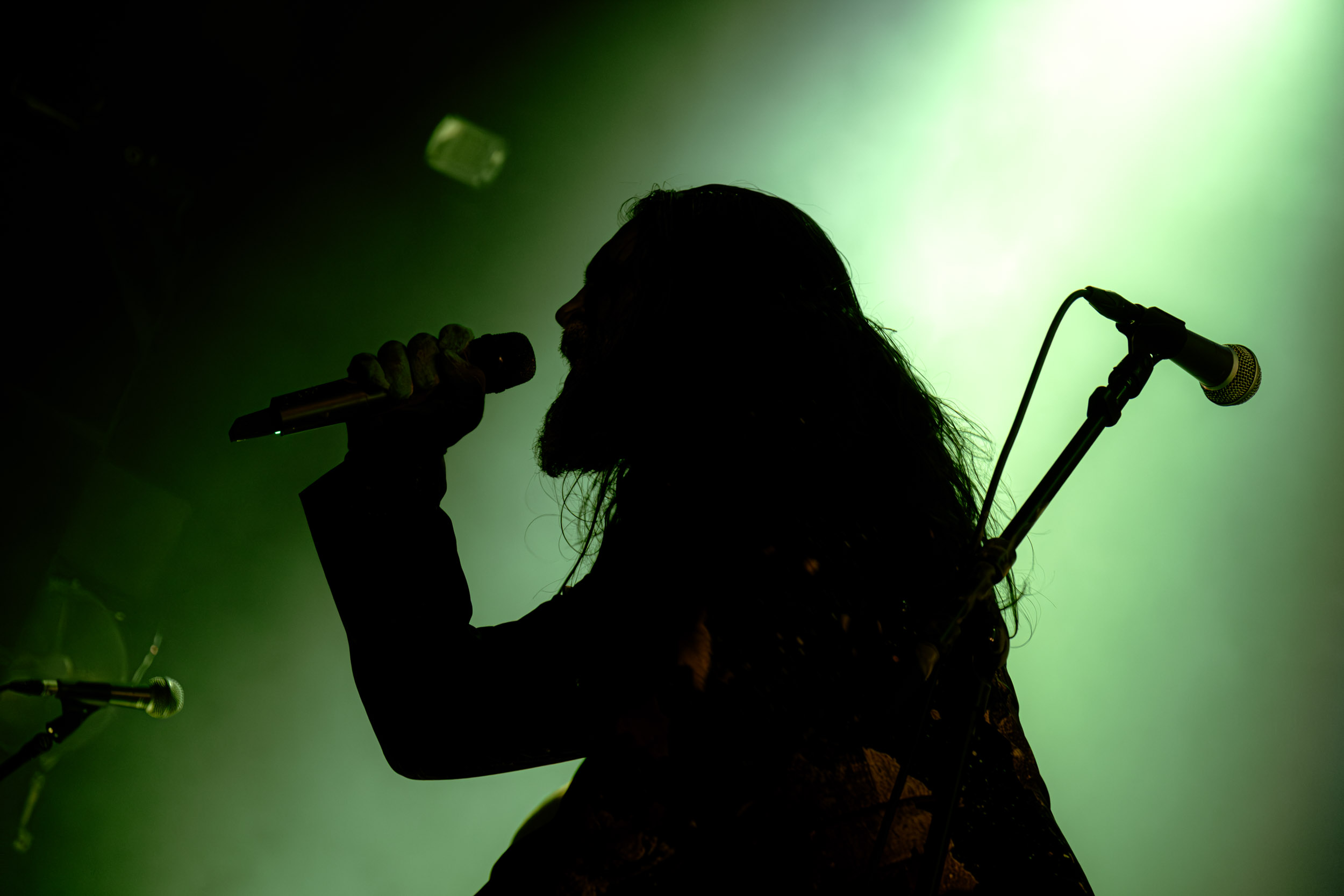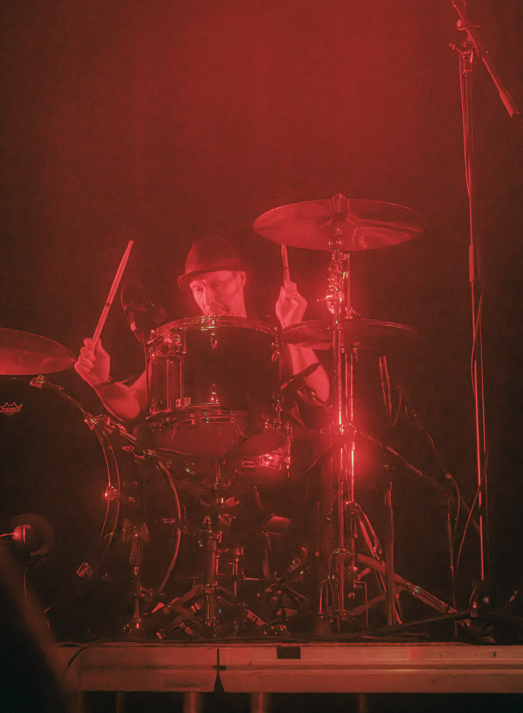 Udåd : Si Udåd vient tout juste d’émerger avec la sortie de son premier album éponyme en 2024, son fondateur, lui, est loin d’être un inconnu. Pour cause : il s’agit de Thomas Eriksen, l’homme derrière la valeur sûre Mork. Ce nouveau projet se distingue toutefois de son grand frère de par son approche très brute et dépouillée, aussi bien au niveau de l’écriture et de la musicalité que du mixage sonore. Le rythme de l’ensemble oscille entre lent et mid, porté par des morceaux au rythme ternaire leur donnant des airs de valse mortuaire. En résulte une ambiance froide et austère, renforcée par la distance dont font montre les musiciens, qui ne répondent que par le son de leurs instruments aux injonctions des spectateurs. Thomas Eriksen, dans son rôle de frontman, paraît comme une présence fantomatique, le visage caché derrière ses cheveux, le reverb sur sa voix — unique effet sonore que se permet le mixage — renforçant d’autant plus cette apparence surnaturelle. L’éclairage monochrome rouge, qui ne change pas ou alors très peu, couplé à l’absence de lumières de face, ajoute la touche finale à cette atmosphère d’un autre monde. En tout cas, le stoïcisme et la dévotion des membres d’Udåd imposent respect et admiration ; de même, les morceaux ont quelque chose d’à la fois entêtant et envoûtant, pesant sur l’esprit aussi… L’un de ceux joués en dernier met en avant un petit passage en guitare lead au son grinçant et plaintif. [Ségolène]