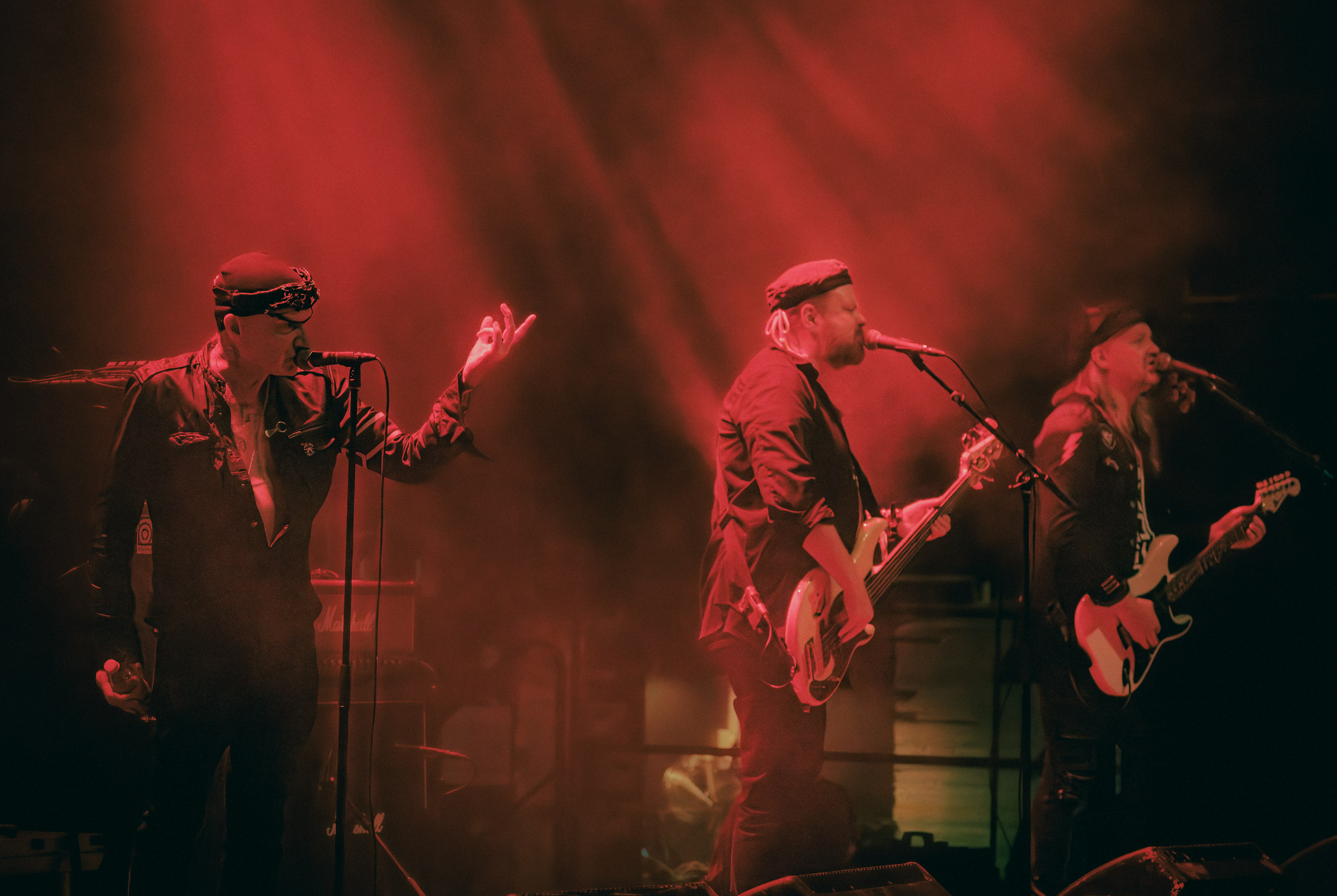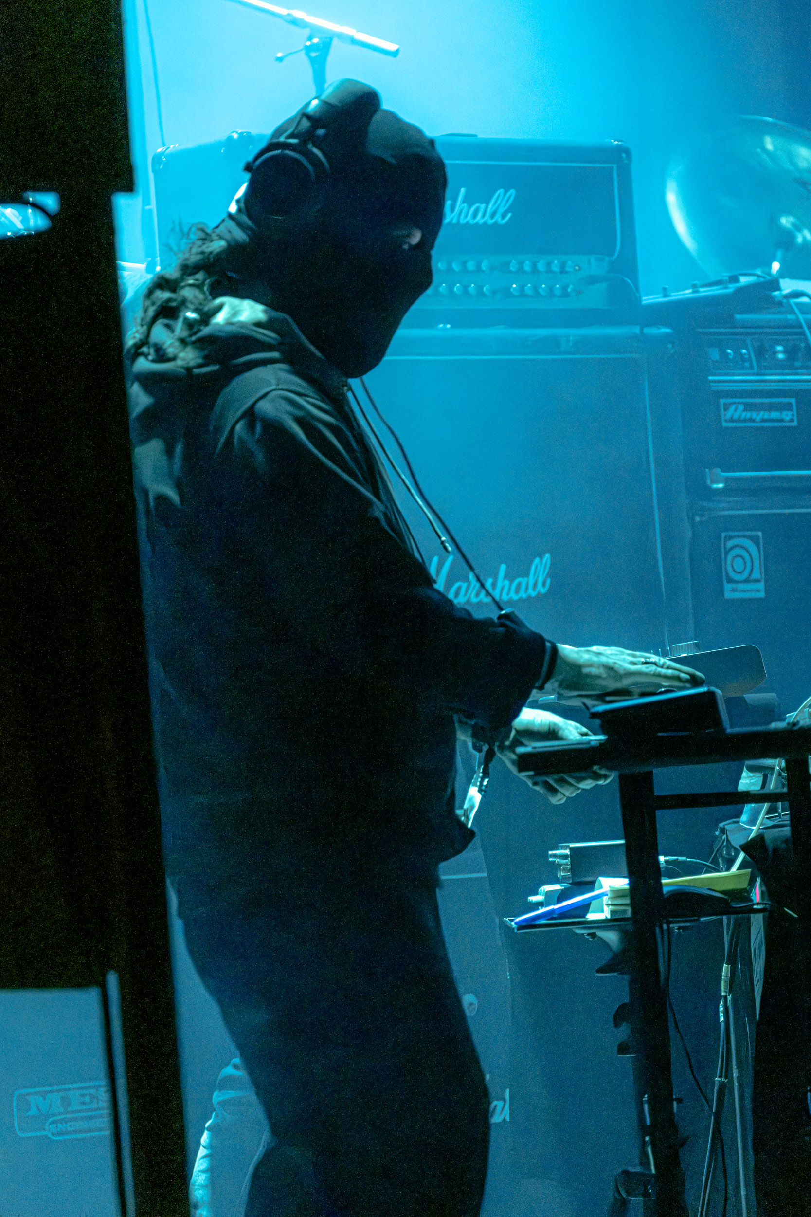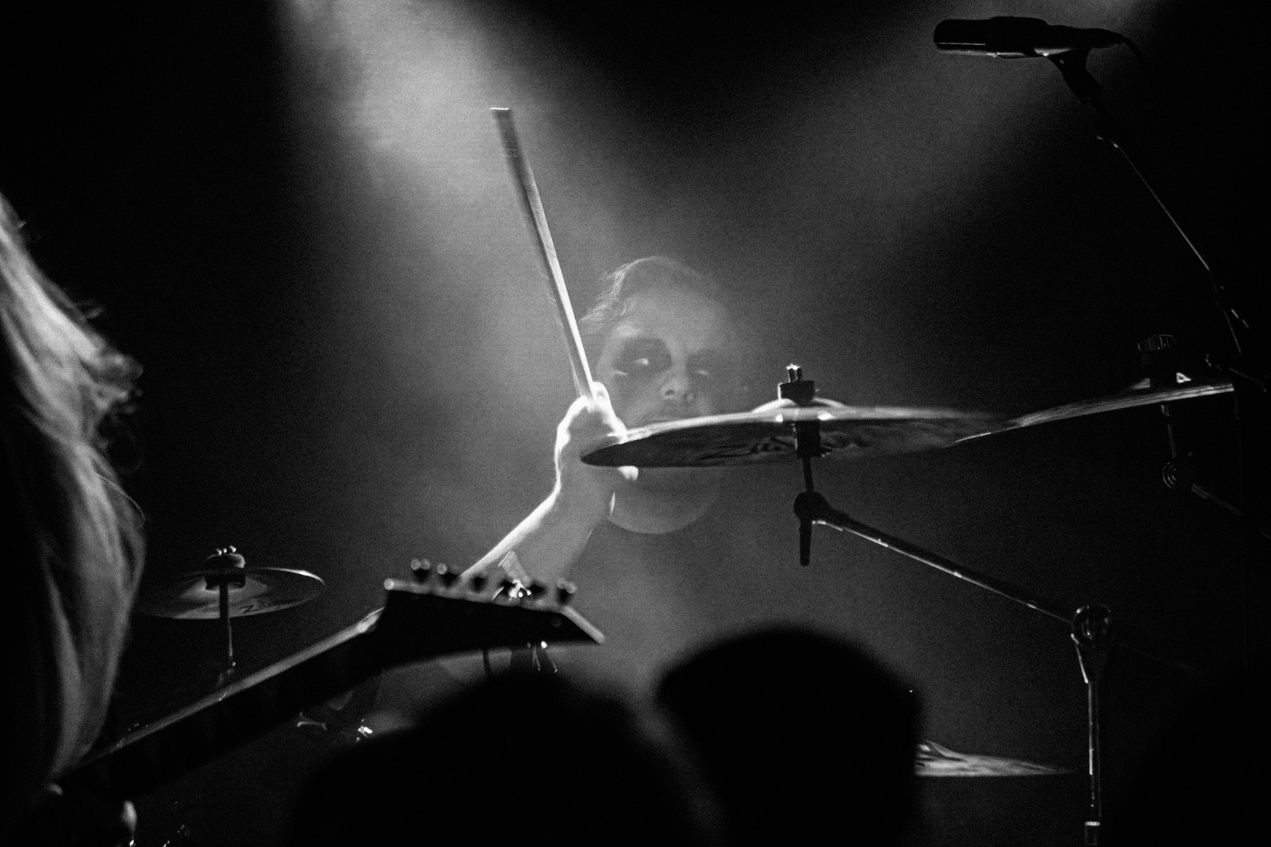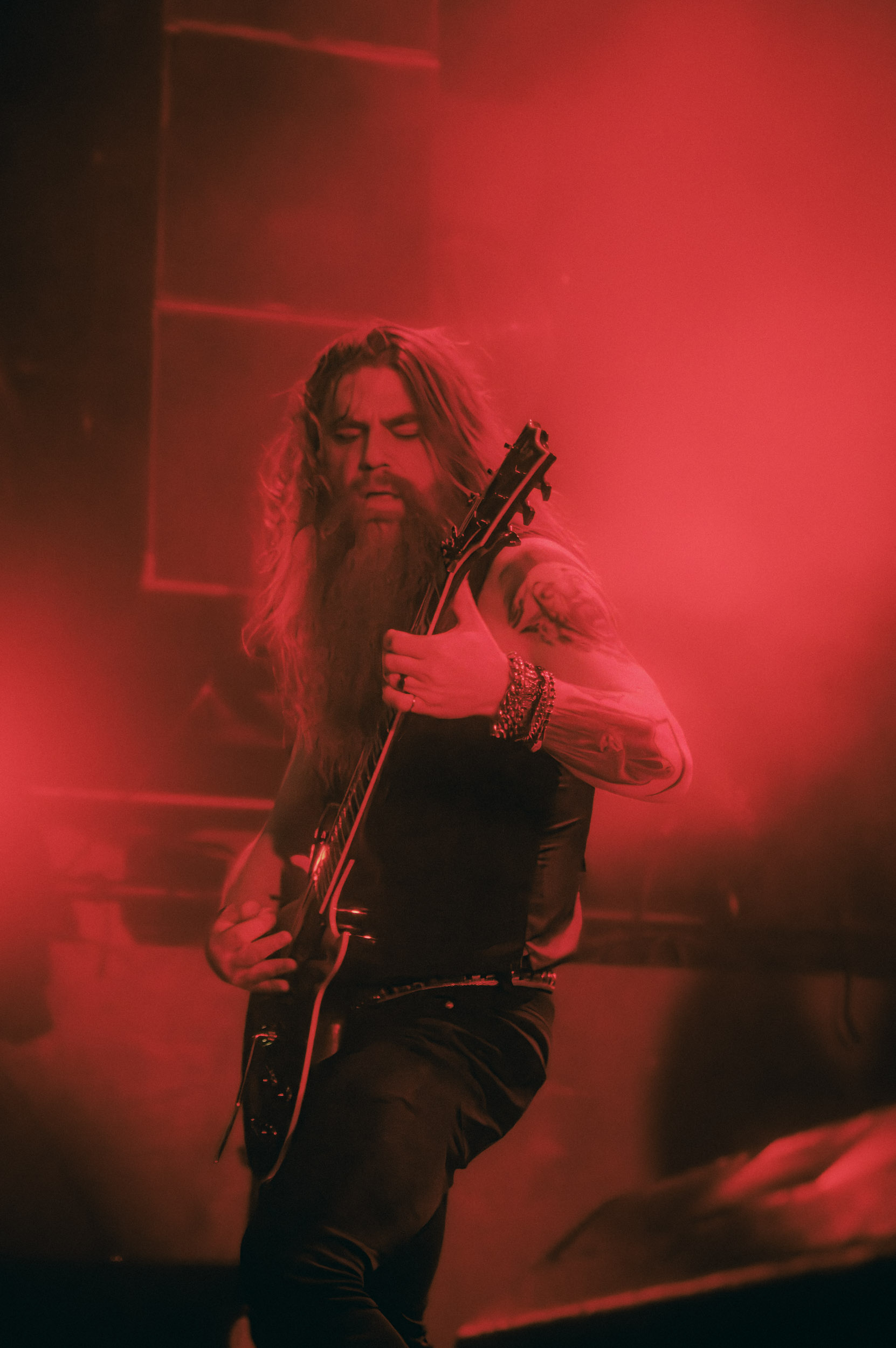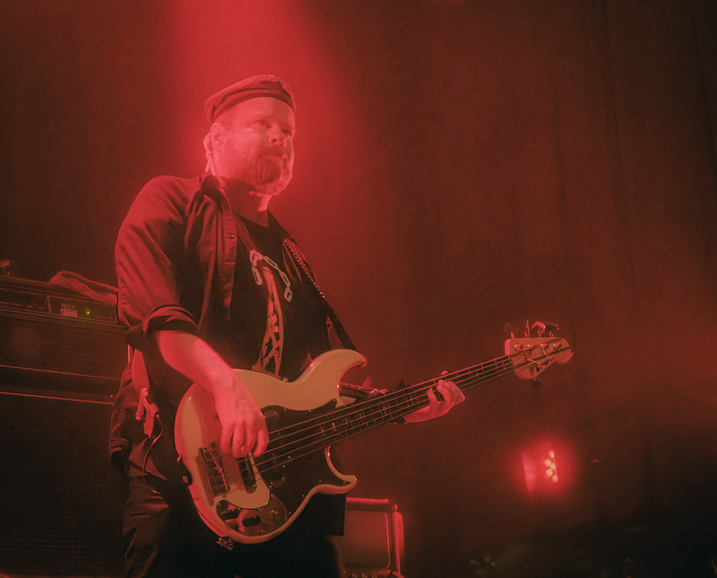 Udåd : Si Udåd vient tout juste d’émerger avec la sortie de son premier album éponyme en 2024, son fondateur, lui, est loin d’être un inconnu. Pour cause : il s’agit de Thomas Eriksen, l’homme derrière la valeur sûre Mork. Ce nouveau projet se distingue toutefois de son grand frère de par son approche très brute et dépouillée, aussi bien au niveau de l’écriture et de la musicalité que du mixage sonore. Le rythme de l’ensemble oscille entre lent et mid, porté par des morceaux au rythme ternaire leur donnant des airs de valse mortuaire. En résulte une ambiance froide et austère, renforcée par la distance dont font montre les musiciens, qui ne répondent que par le son de leurs instruments aux injonctions des spectateurs. Thomas Eriksen, dans son rôle de frontman, paraît comme une présence fantomatique, le visage caché derrière ses cheveux, le reverb sur sa voix — unique effet sonore que se permet le mixage — renforçant d’autant plus cette apparence surnaturelle. L’éclairage monochrome rouge, qui ne change pas ou alors très peu, couplé à l’absence de lumières de face, ajoute la touche finale à cette atmosphère d’un autre monde. En tout cas, le stoïcisme et la dévotion des membres d’Udåd imposent respect et admiration ; de même, les morceaux ont quelque chose d’à la fois entêtant et envoûtant, pesant sur l’esprit aussi… L’un de ceux joués en dernier met en avant un petit passage en guitare lead au son grinçant et plaintif. [Ségolène]