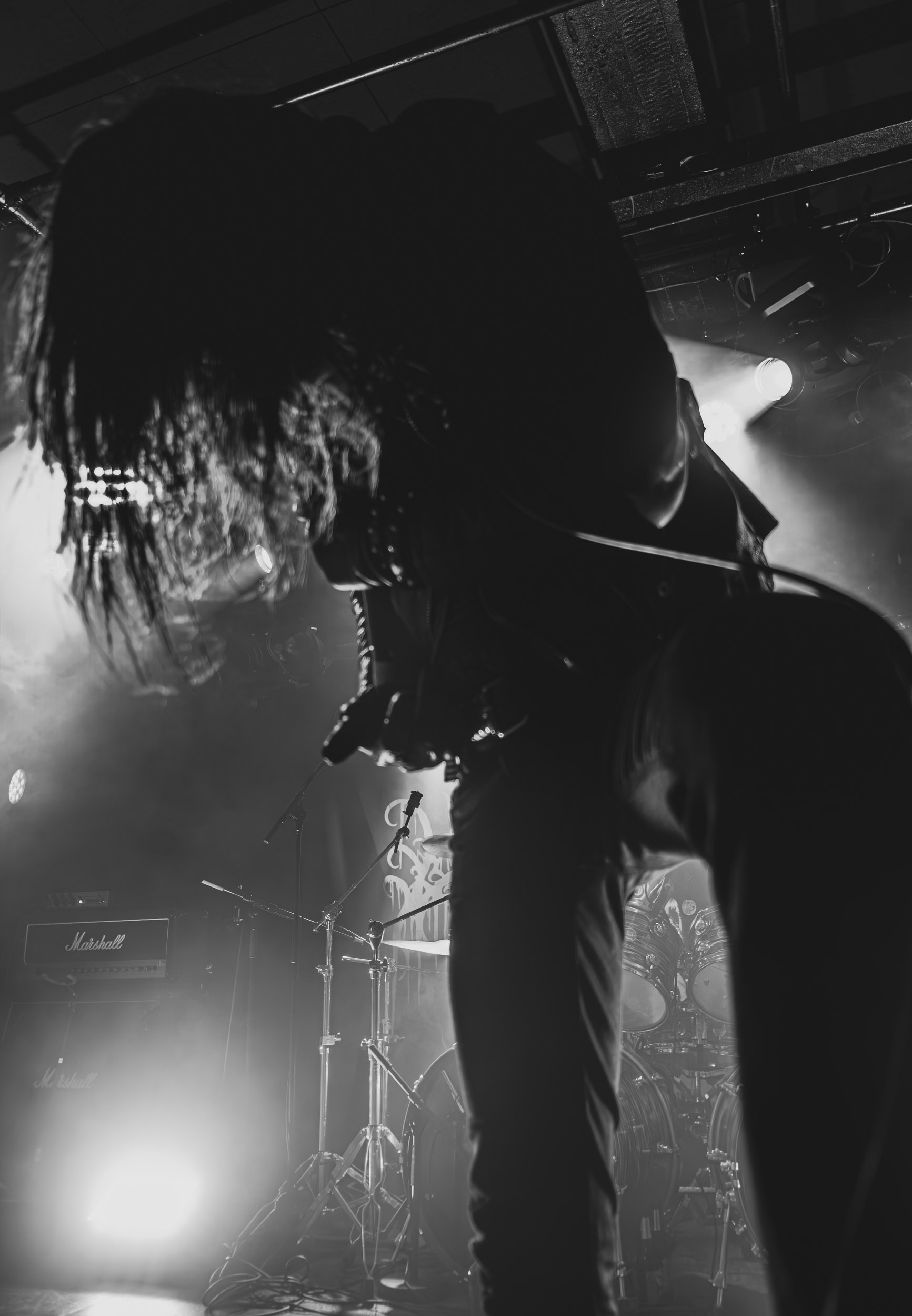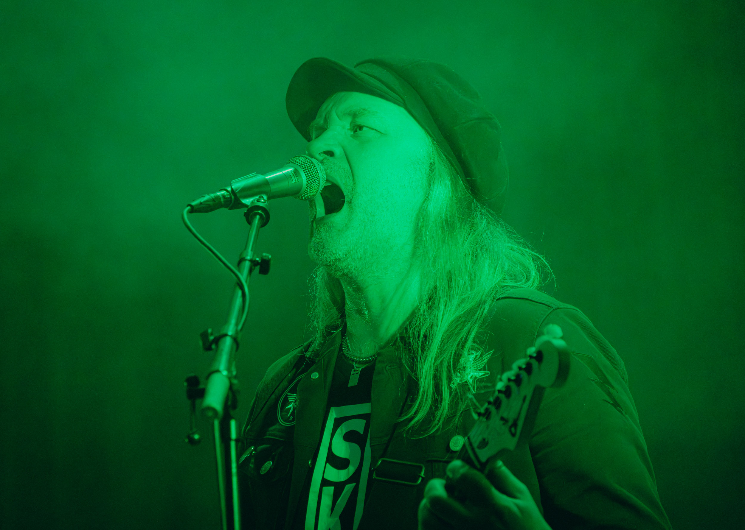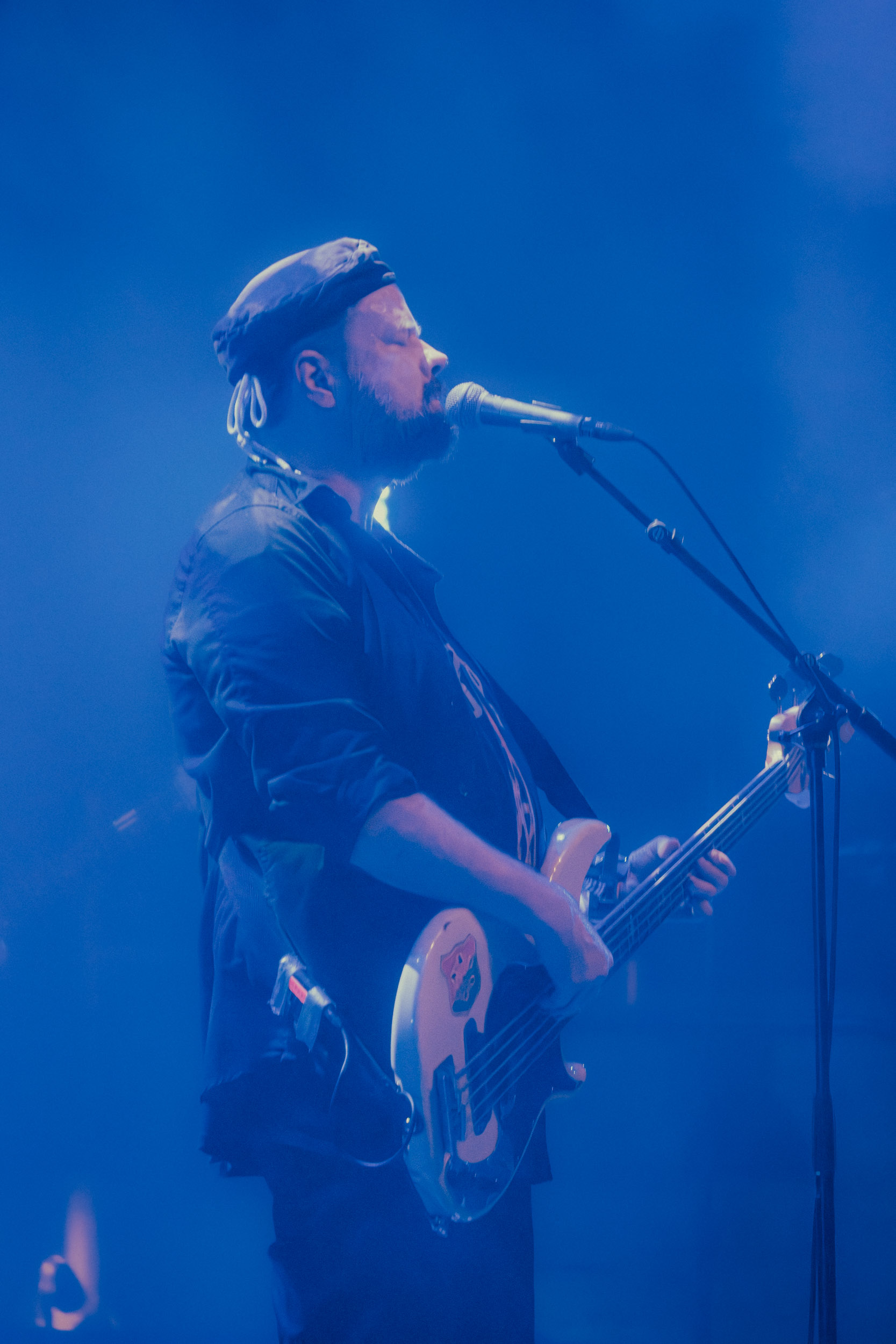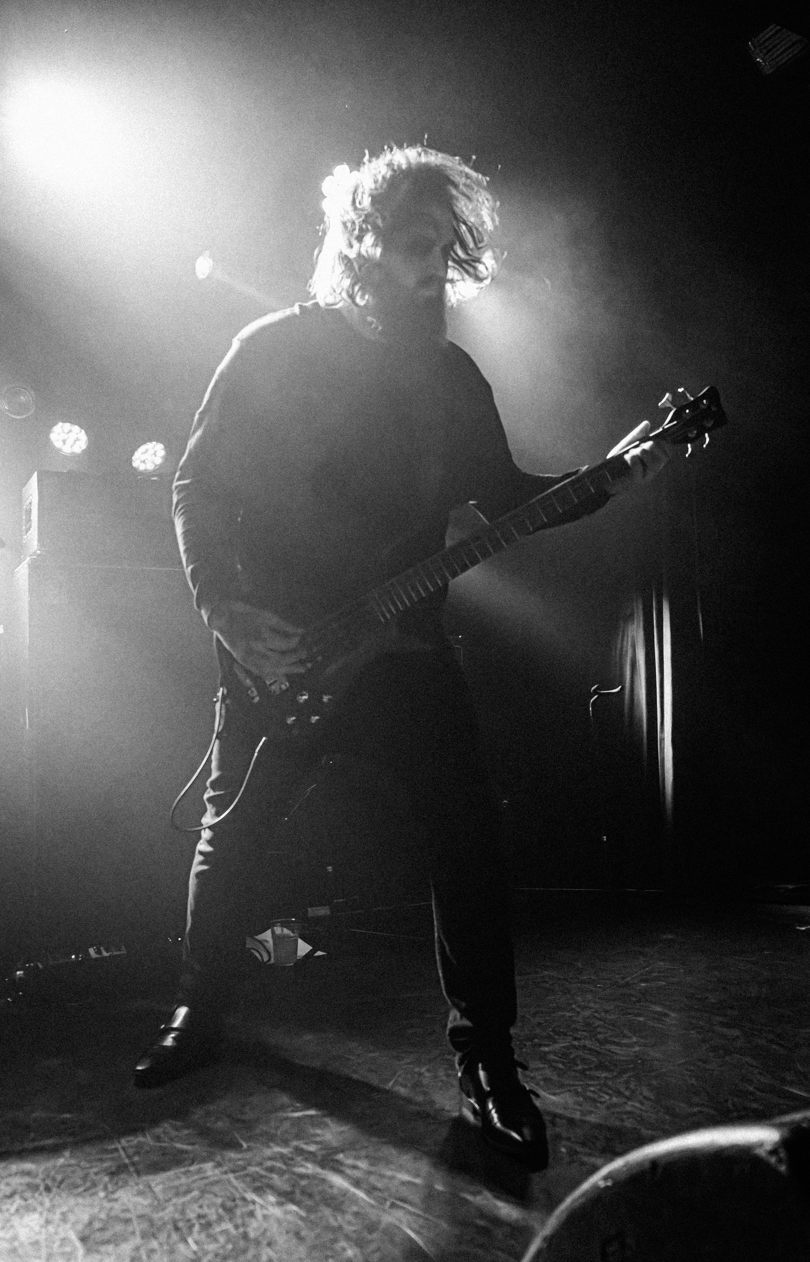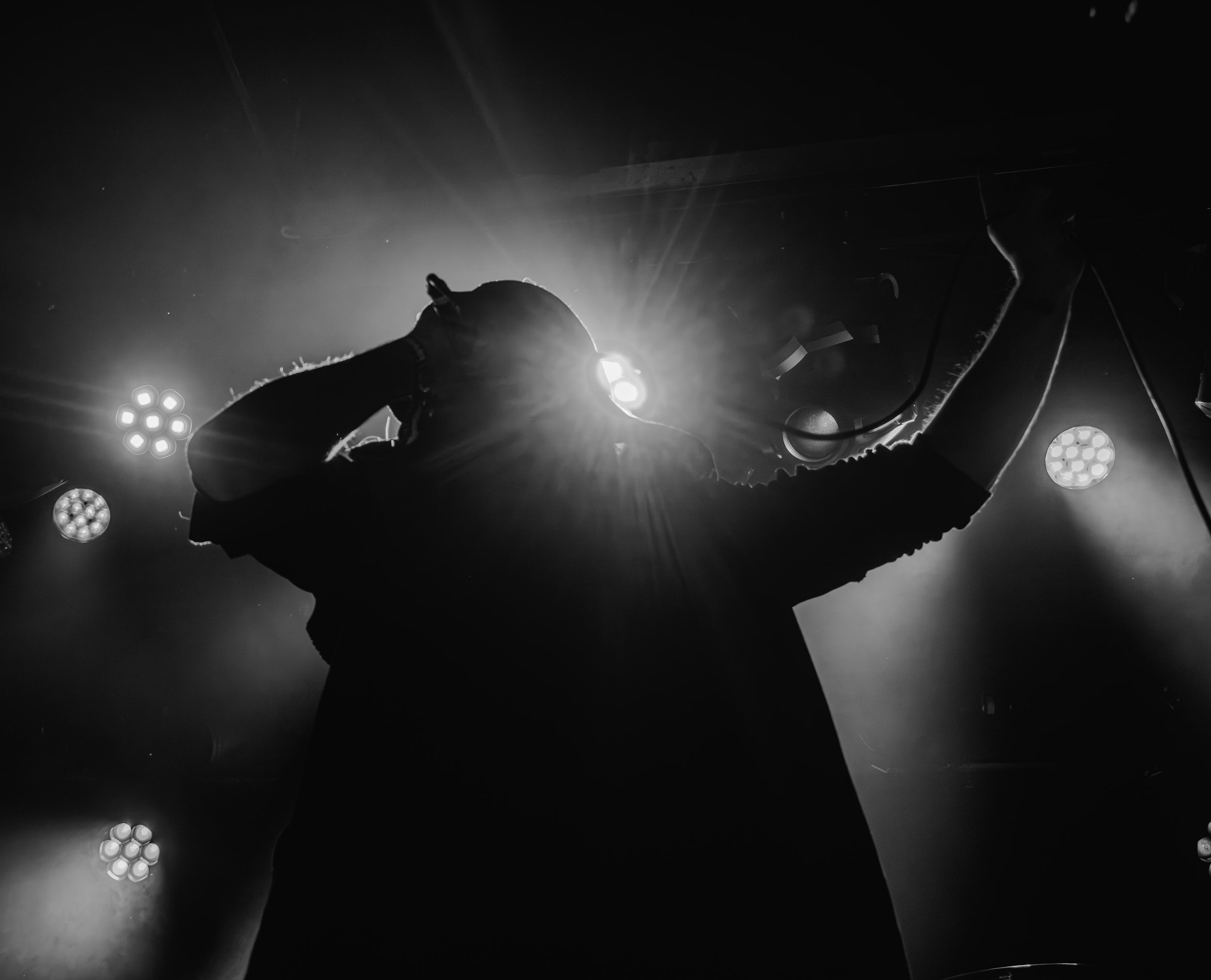 Udåd : Si Udåd vient tout juste d’émerger avec la sortie de son premier album éponyme en 2024, son fondateur, lui, est loin d’être un inconnu. Pour cause : il s’agit de Thomas Eriksen, l’homme derrière la valeur sûre Mork. Ce nouveau projet se distingue toutefois de son grand frère de par son approche très brute et dépouillée, aussi bien au niveau de l’écriture et de la musicalité que du mixage sonore. Le rythme de l’ensemble oscille entre lent et mid, porté par des morceaux au rythme ternaire leur donnant des airs de valse mortuaire. En résulte une ambiance froide et austère, renforcée par la distance dont font montre les musiciens, qui ne répondent que par le son de leurs instruments aux injonctions des spectateurs. Thomas Eriksen, dans son rôle de frontman, paraît comme une présence fantomatique, le visage caché derrière ses cheveux, le reverb sur sa voix — unique effet sonore que se permet le mixage — renforçant d’autant plus cette apparence surnaturelle. L’éclairage monochrome rouge, qui ne change pas ou alors très peu, couplé à l’absence de lumières de face, ajoute la touche finale à cette atmosphère d’un autre monde. En tout cas, le stoïcisme et la dévotion des membres d’Udåd imposent respect et admiration ; de même, les morceaux ont quelque chose d’à la fois entêtant et envoûtant, pesant sur l’esprit aussi… L’un de ceux joués en dernier met en avant un petit passage en guitare lead au son grinçant et plaintif. [Ségolène]