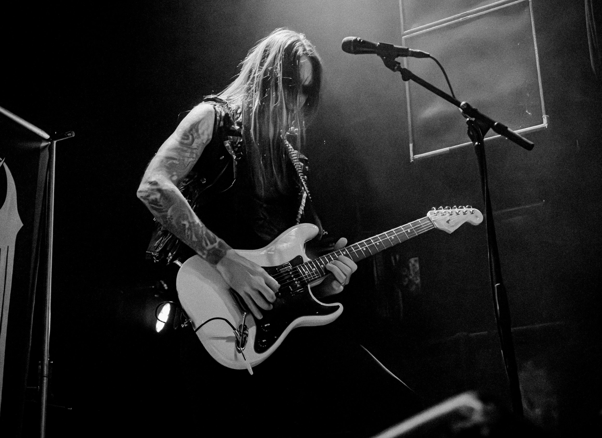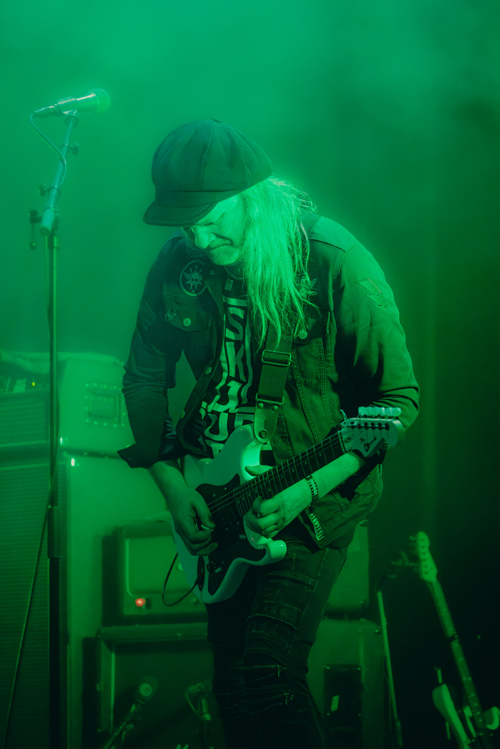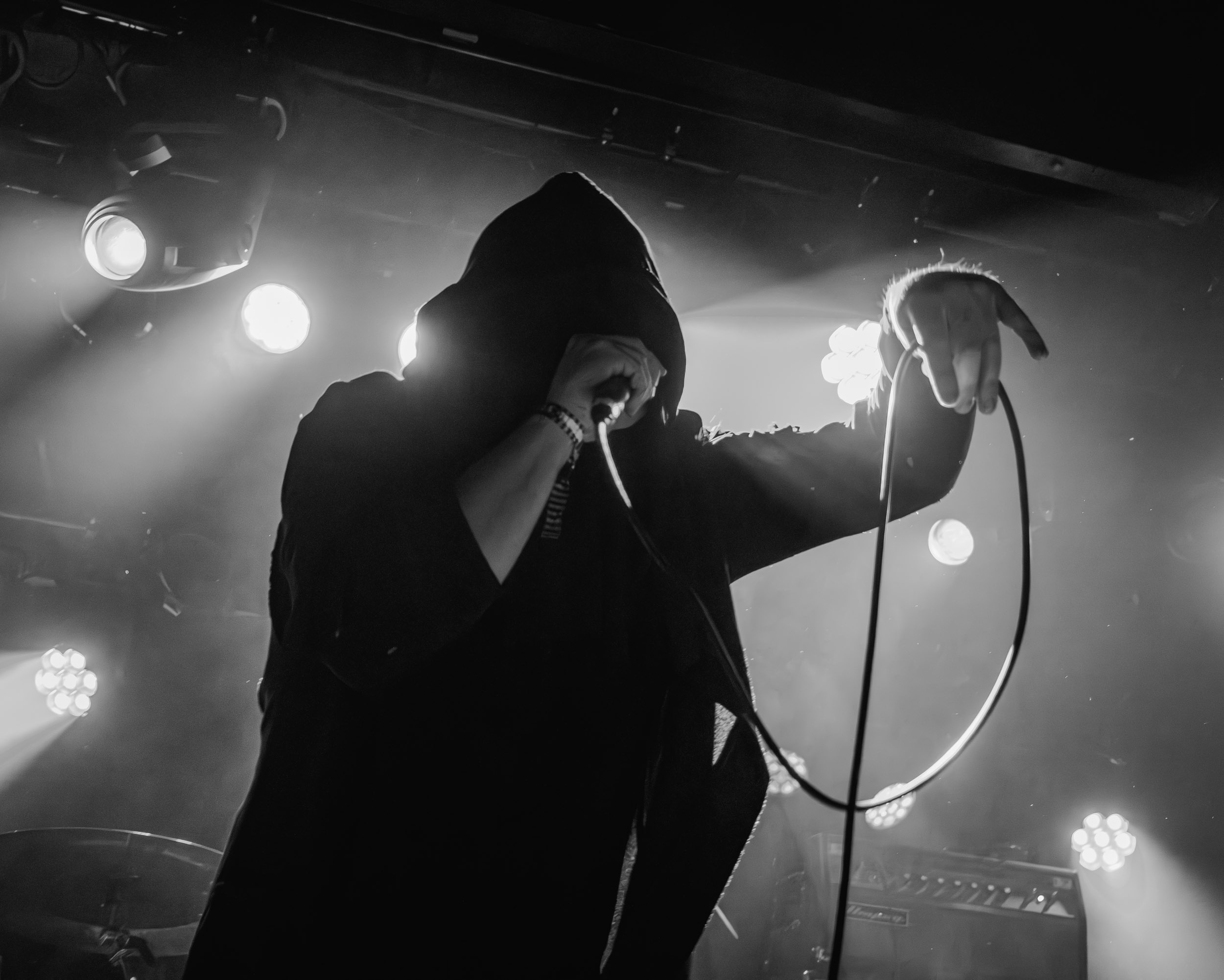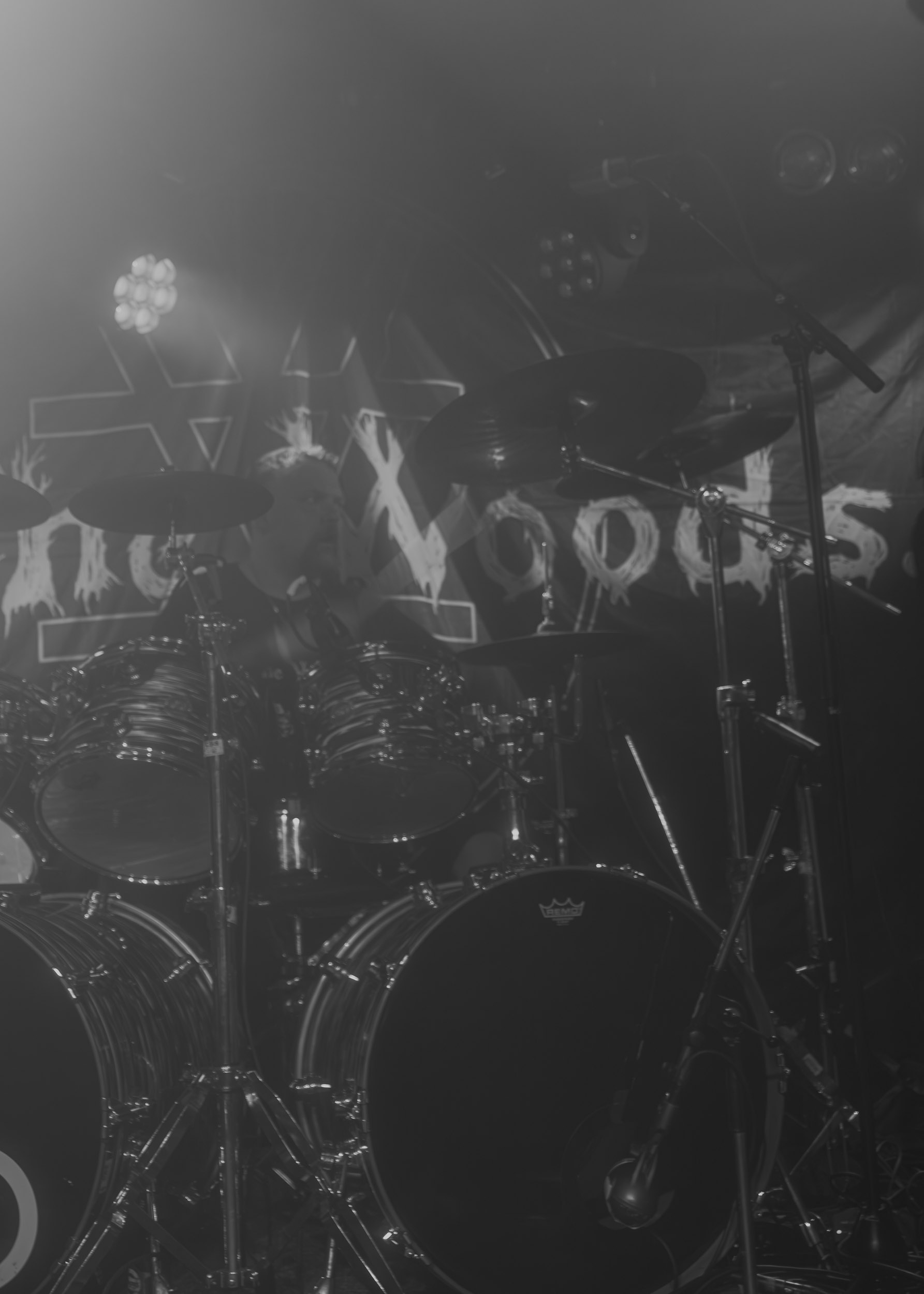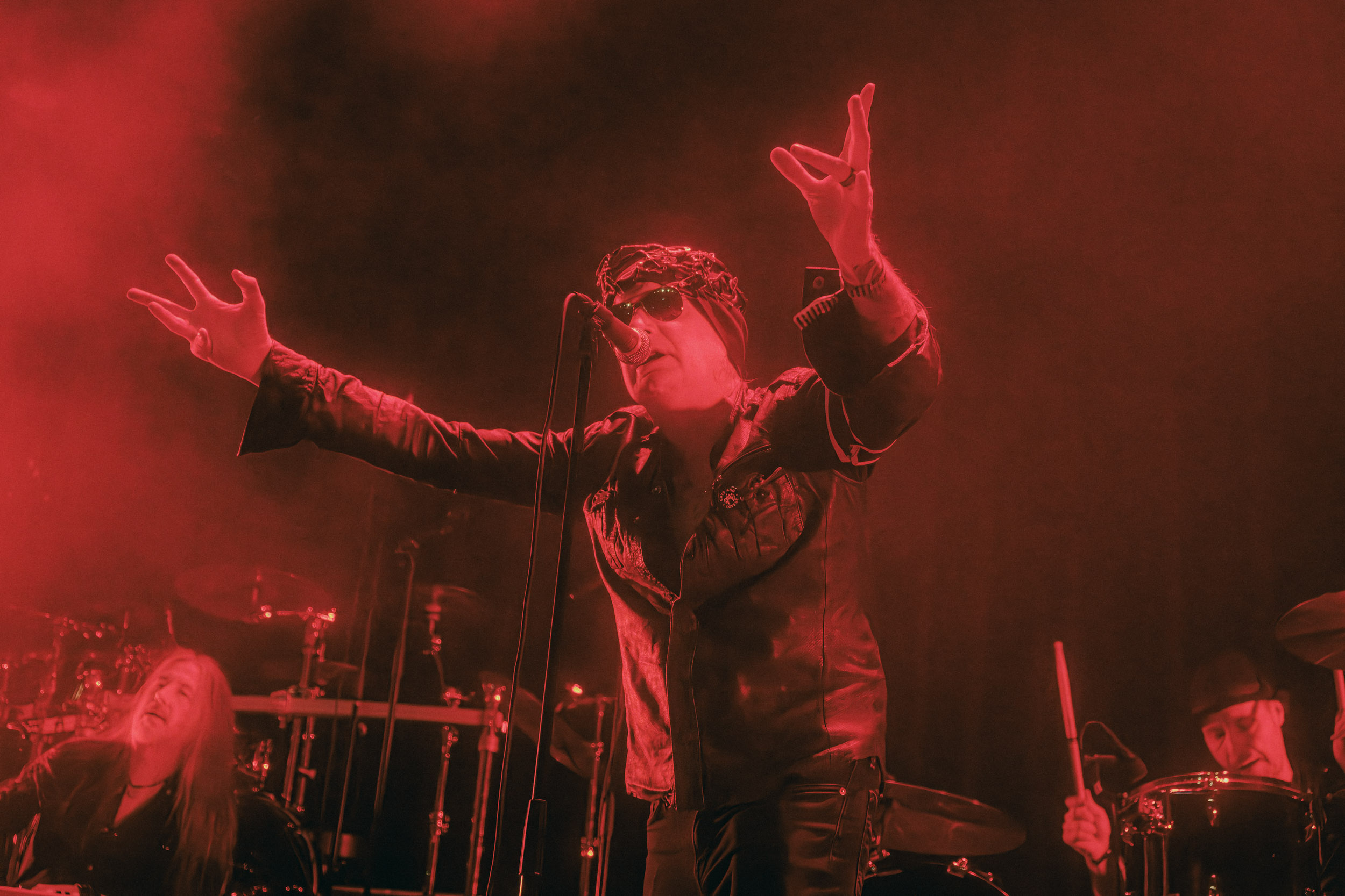 Udåd : Si Udåd vient tout juste d’émerger avec la sortie de son premier album éponyme en 2024, son fondateur, lui, est loin d’être un inconnu. Pour cause : il s’agit de Thomas Eriksen, l’homme derrière la valeur sûre Mork. Ce nouveau projet se distingue toutefois de son grand frère de par son approche très brute et dépouillée, aussi bien au niveau de l’écriture et de la musicalité que du mixage sonore. Le rythme de l’ensemble oscille entre lent et mid, porté par des morceaux au rythme ternaire leur donnant des airs de valse mortuaire. En résulte une ambiance froide et austère, renforcée par la distance dont font montre les musiciens, qui ne répondent que par le son de leurs instruments aux injonctions des spectateurs. Thomas Eriksen, dans son rôle de frontman, paraît comme une présence fantomatique, le visage caché derrière ses cheveux, le reverb sur sa voix — unique effet sonore que se permet le mixage — renforçant d’autant plus cette apparence surnaturelle. L’éclairage monochrome rouge, qui ne change pas ou alors très peu, couplé à l’absence de lumières de face, ajoute la touche finale à cette atmosphère d’un autre monde. En tout cas, le stoïcisme et la dévotion des membres d’Udåd imposent respect et admiration ; de même, les morceaux ont quelque chose d’à la fois entêtant et envoûtant, pesant sur l’esprit aussi… L’un de ceux joués en dernier met en avant un petit passage en guitare lead au son grinçant et plaintif. [Ségolène]