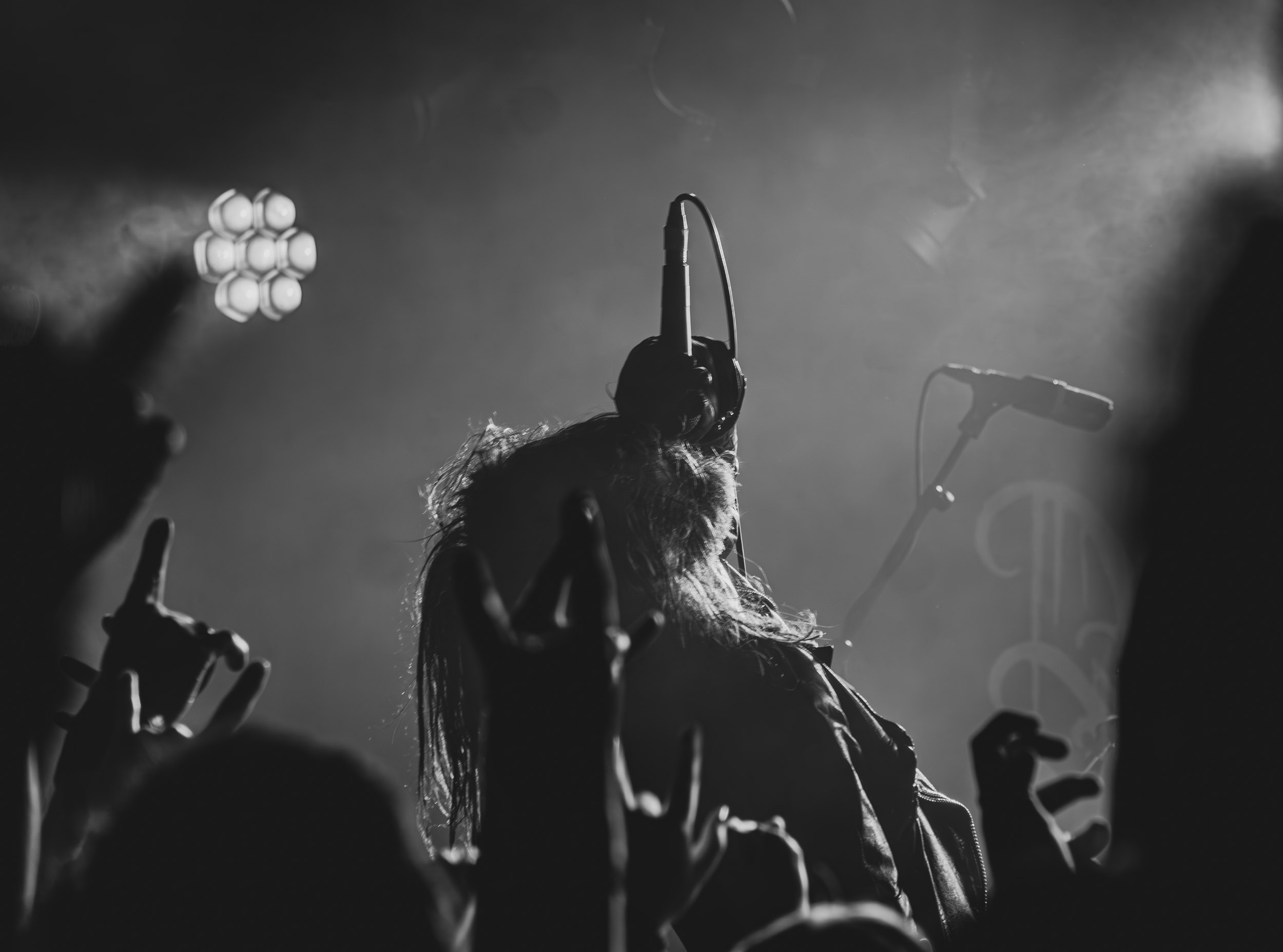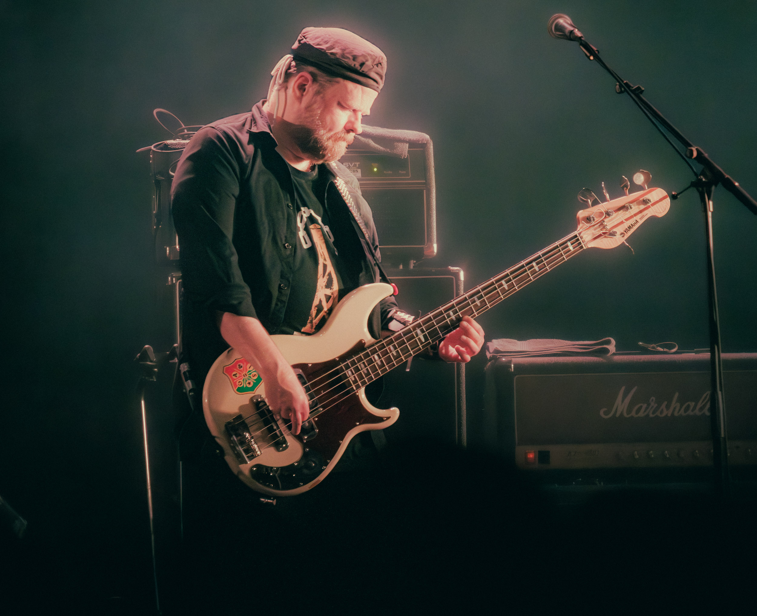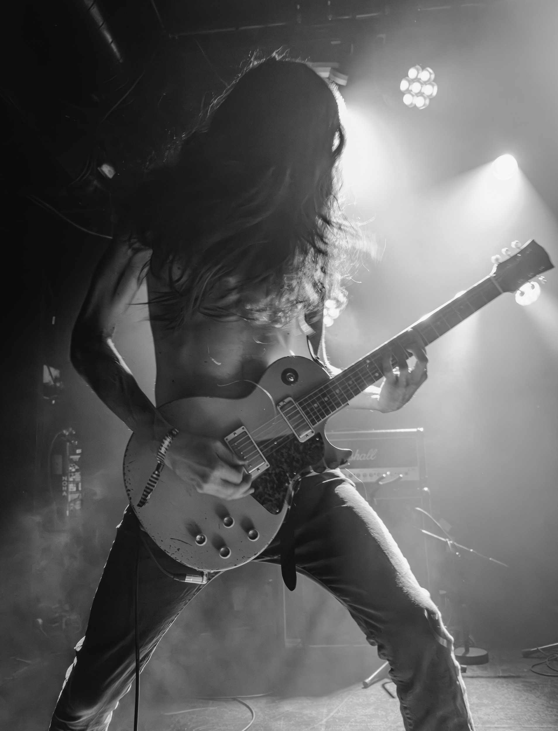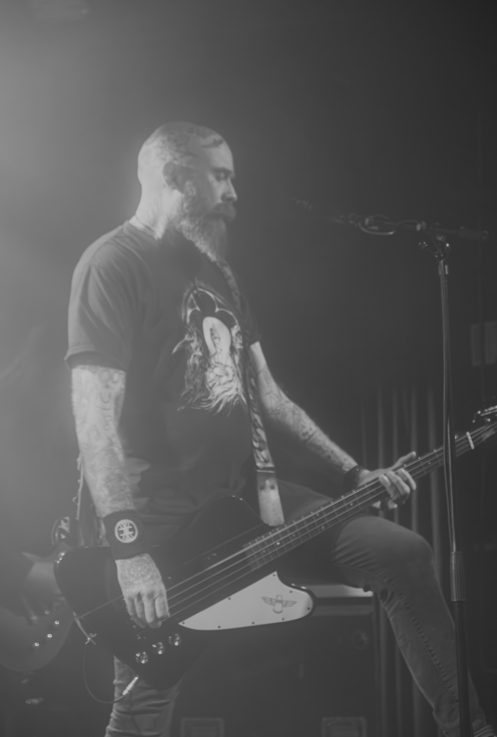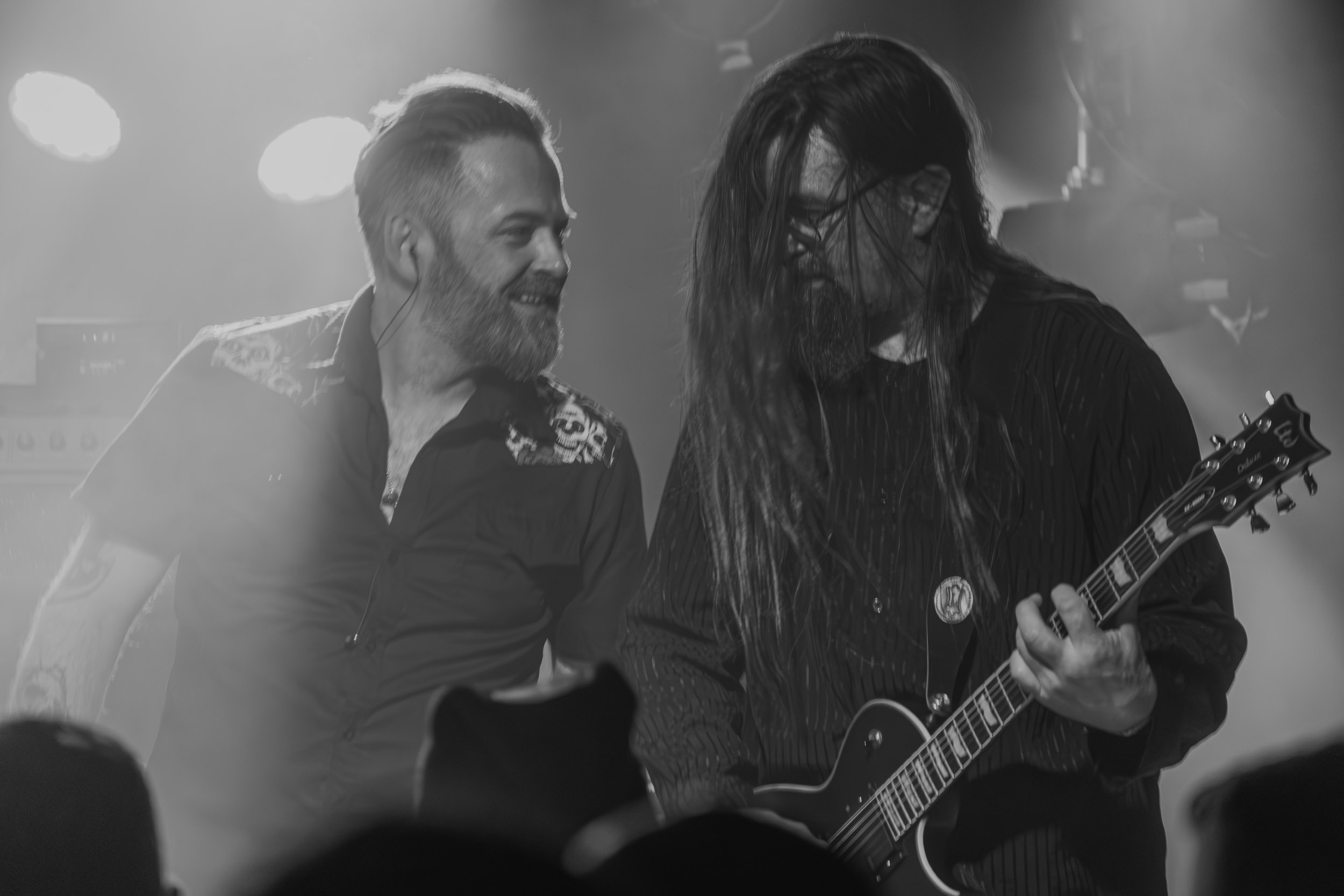 Udåd : Si Udåd vient tout juste d’émerger avec la sortie de son premier album éponyme en 2024, son fondateur, lui, est loin d’être un inconnu. Pour cause : il s’agit de Thomas Eriksen, l’homme derrière la valeur sûre Mork. Ce nouveau projet se distingue toutefois de son grand frère de par son approche très brute et dépouillée, aussi bien au niveau de l’écriture et de la musicalité que du mixage sonore. Le rythme de l’ensemble oscille entre lent et mid, porté par des morceaux au rythme ternaire leur donnant des airs de valse mortuaire. En résulte une ambiance froide et austère, renforcée par la distance dont font montre les musiciens, qui ne répondent que par le son de leurs instruments aux injonctions des spectateurs. Thomas Eriksen, dans son rôle de frontman, paraît comme une présence fantomatique, le visage caché derrière ses cheveux, le reverb sur sa voix — unique effet sonore que se permet le mixage — renforçant d’autant plus cette apparence surnaturelle. L’éclairage monochrome rouge, qui ne change pas ou alors très peu, couplé à l’absence de lumières de face, ajoute la touche finale à cette atmosphère d’un autre monde. En tout cas, le stoïcisme et la dévotion des membres d’Udåd imposent respect et admiration ; de même, les morceaux ont quelque chose d’à la fois entêtant et envoûtant, pesant sur l’esprit aussi… L’un de ceux joués en dernier met en avant un petit passage en guitare lead au son grinçant et plaintif. [Ségolène]