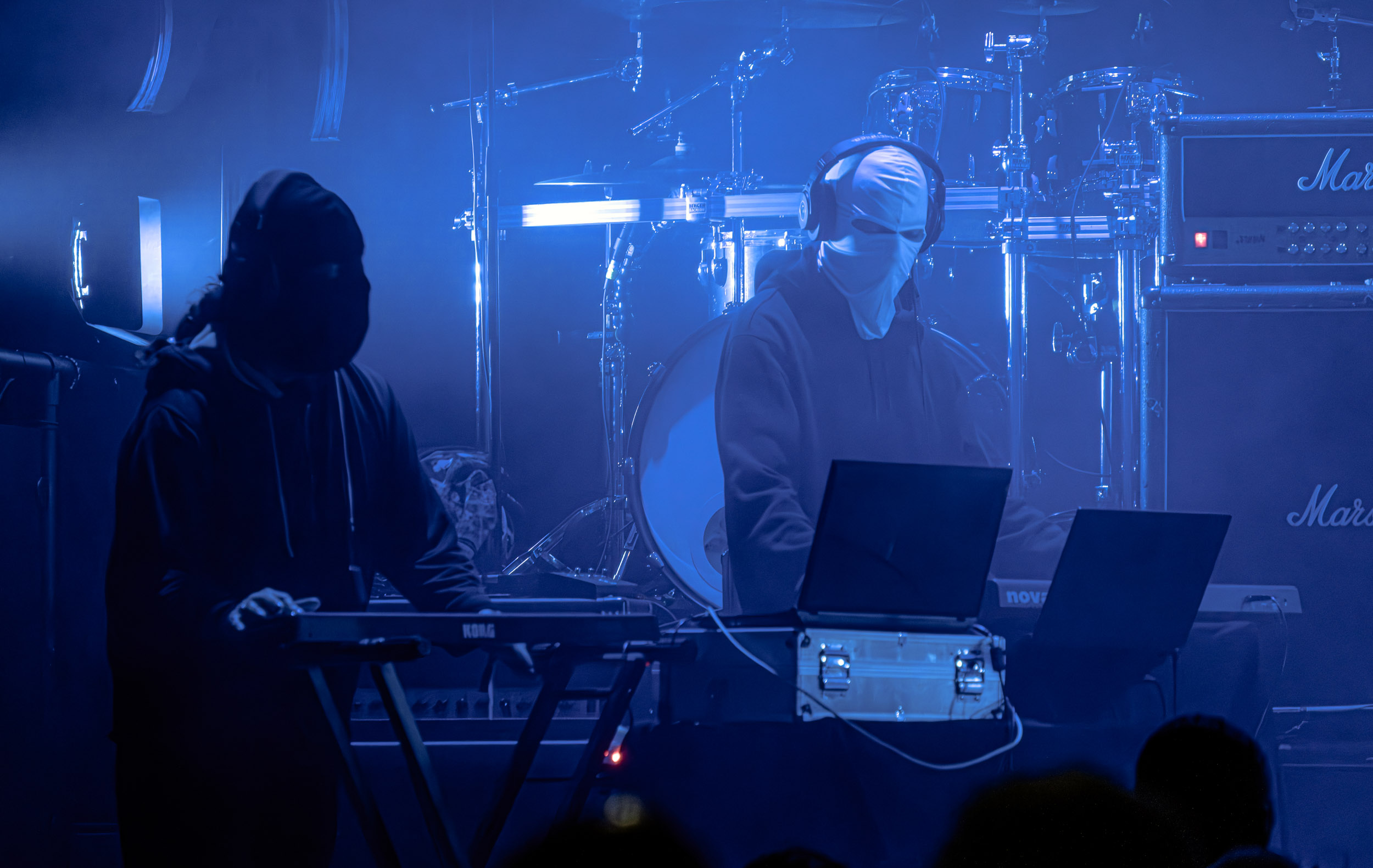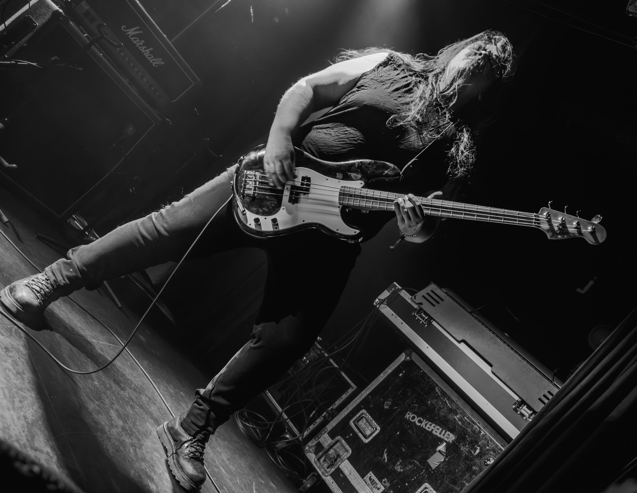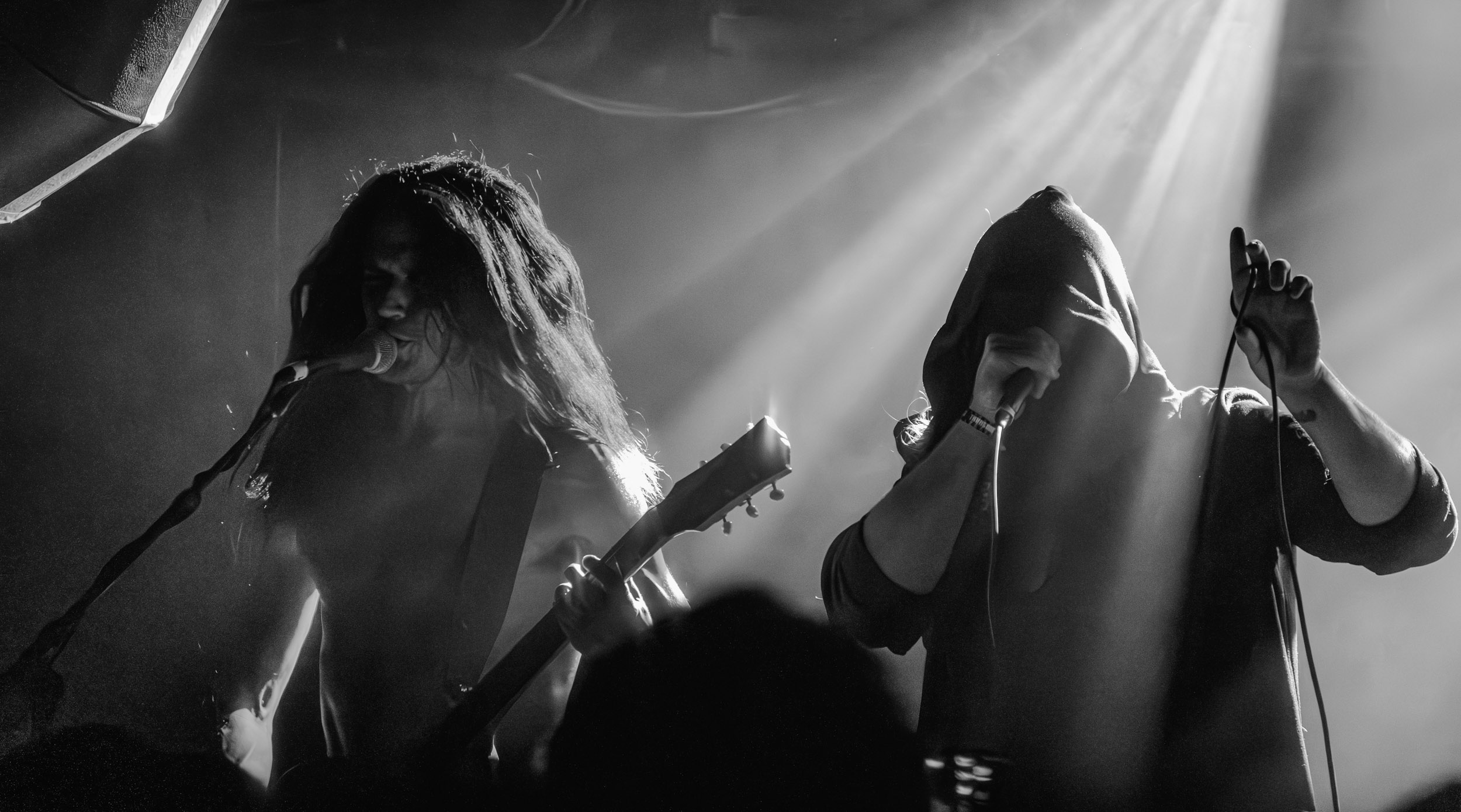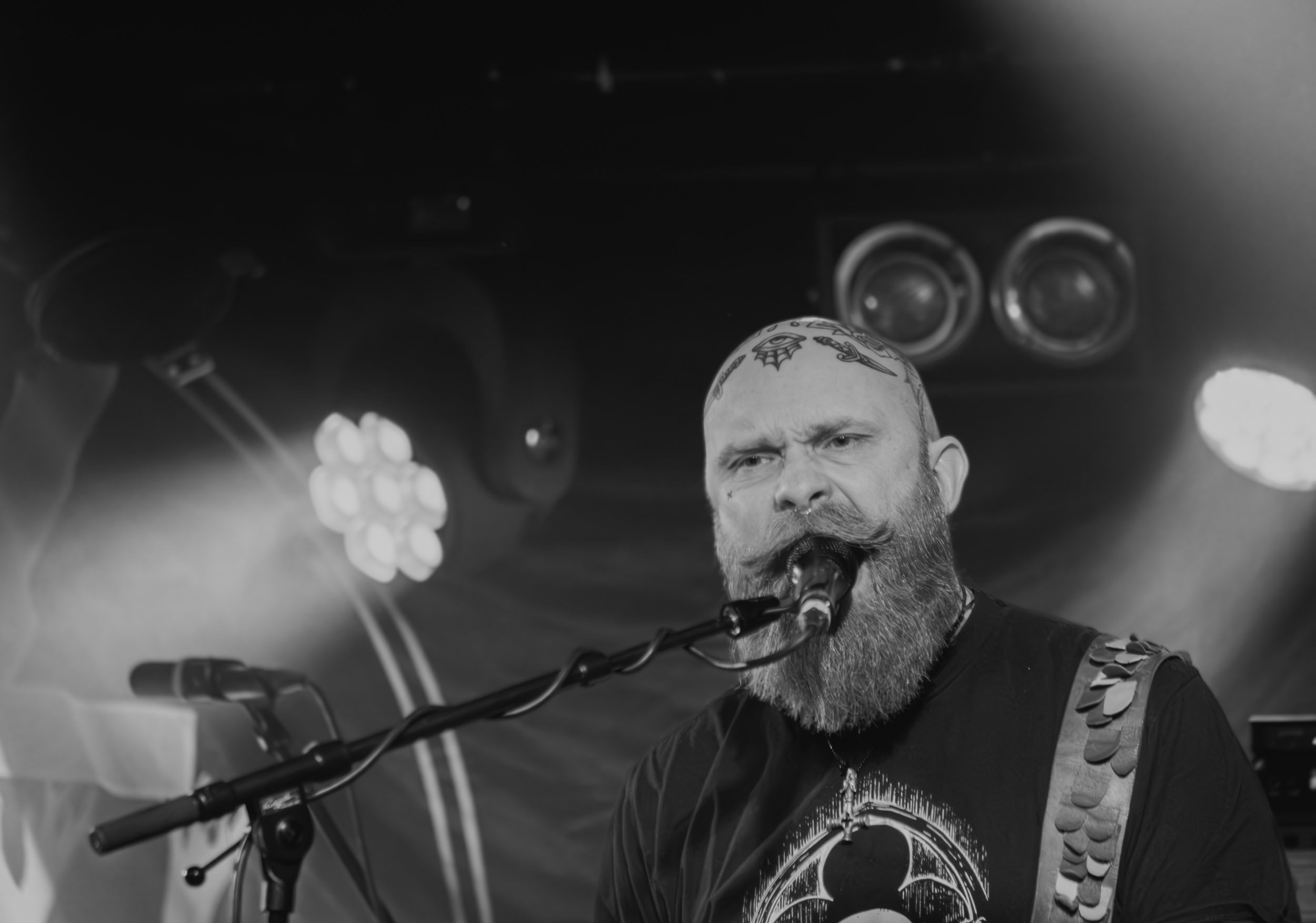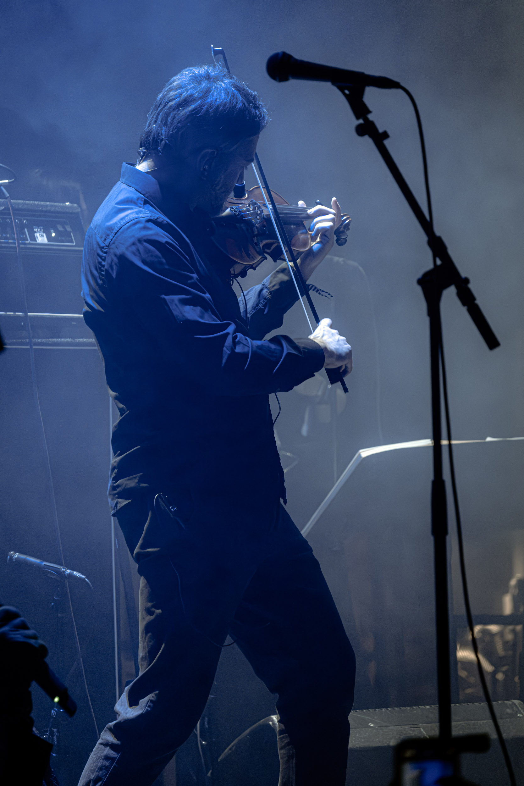 Udåd : Si Udåd vient tout juste d’émerger avec la sortie de son premier album éponyme en 2024, son fondateur, lui, est loin d’être un inconnu. Pour cause : il s’agit de Thomas Eriksen, l’homme derrière la valeur sûre Mork. Ce nouveau projet se distingue toutefois de son grand frère de par son approche très brute et dépouillée, aussi bien au niveau de l’écriture et de la musicalité que du mixage sonore. Le rythme de l’ensemble oscille entre lent et mid, porté par des morceaux au rythme ternaire leur donnant des airs de valse mortuaire. En résulte une ambiance froide et austère, renforcée par la distance dont font montre les musiciens, qui ne répondent que par le son de leurs instruments aux injonctions des spectateurs. Thomas Eriksen, dans son rôle de frontman, paraît comme une présence fantomatique, le visage caché derrière ses cheveux, le reverb sur sa voix — unique effet sonore que se permet le mixage — renforçant d’autant plus cette apparence surnaturelle. L’éclairage monochrome rouge, qui ne change pas ou alors très peu, couplé à l’absence de lumières de face, ajoute la touche finale à cette atmosphère d’un autre monde. En tout cas, le stoïcisme et la dévotion des membres d’Udåd imposent respect et admiration ; de même, les morceaux ont quelque chose d’à la fois entêtant et envoûtant, pesant sur l’esprit aussi… L’un de ceux joués en dernier met en avant un petit passage en guitare lead au son grinçant et plaintif. [Ségolène]