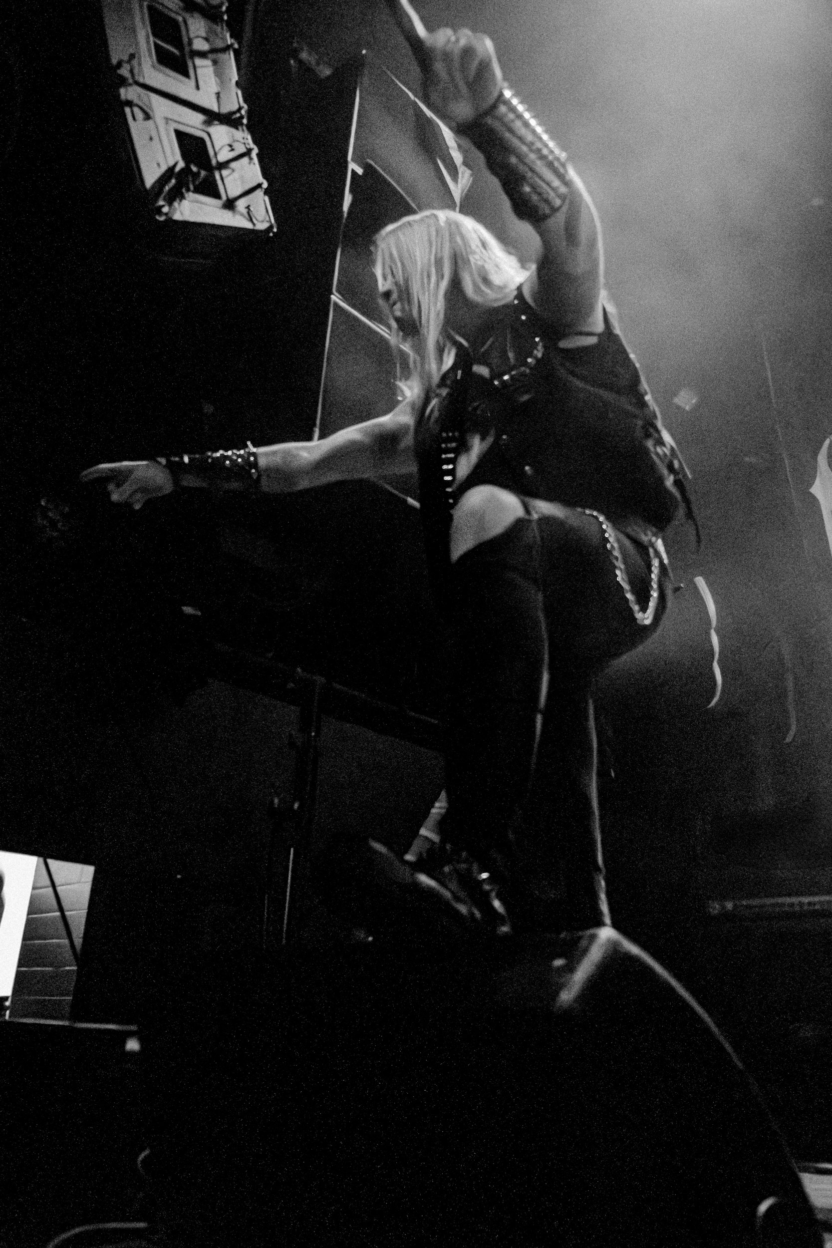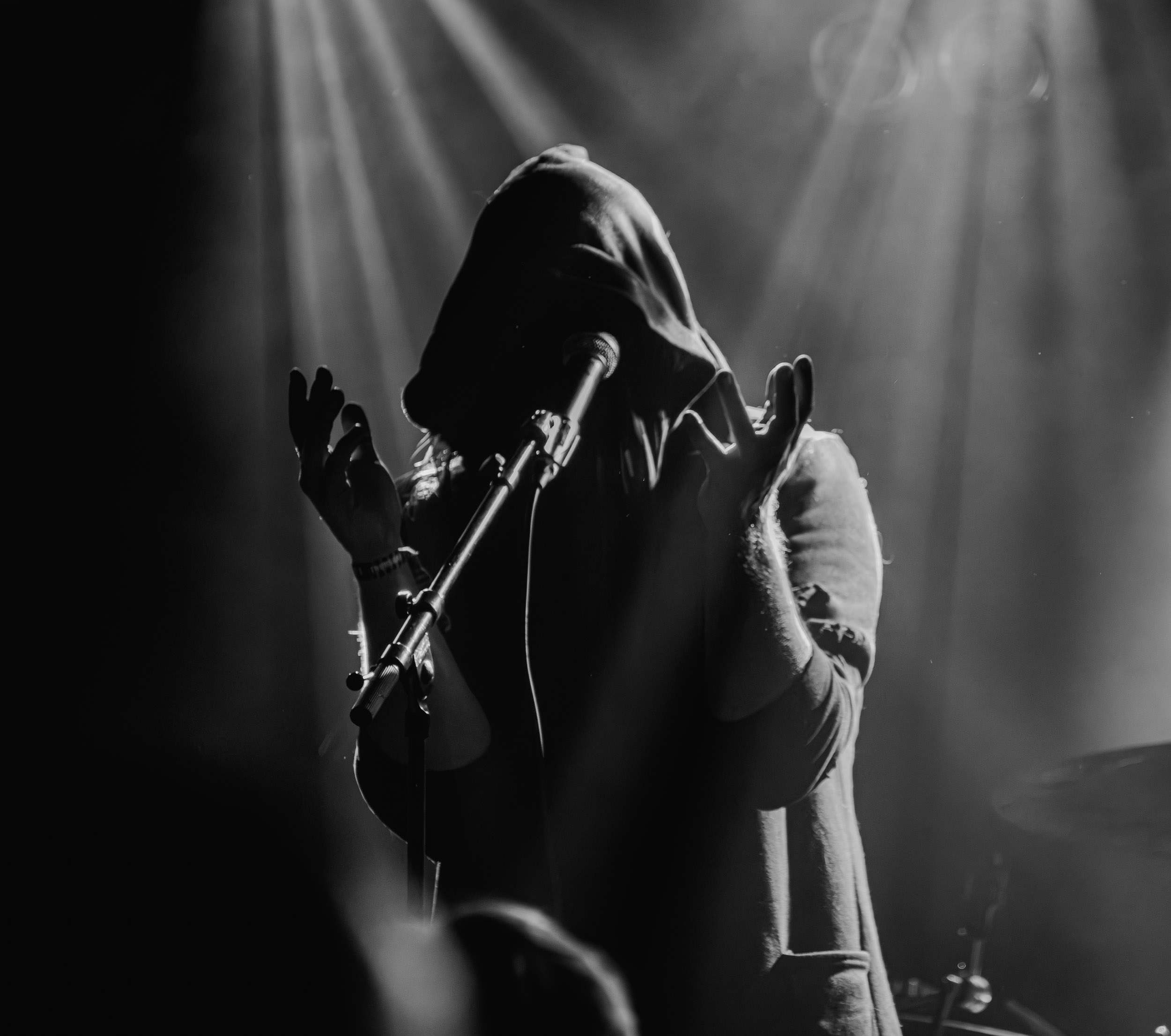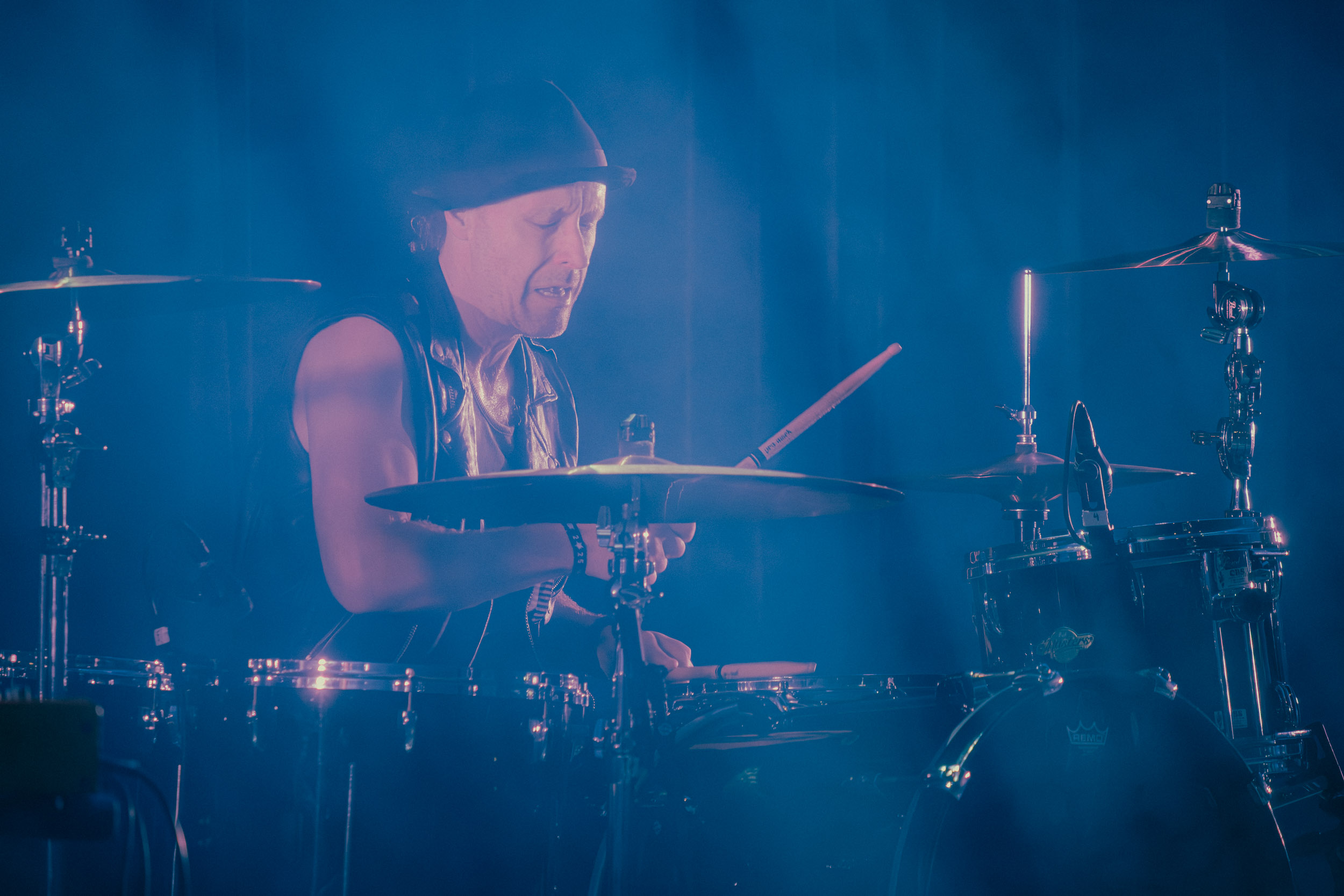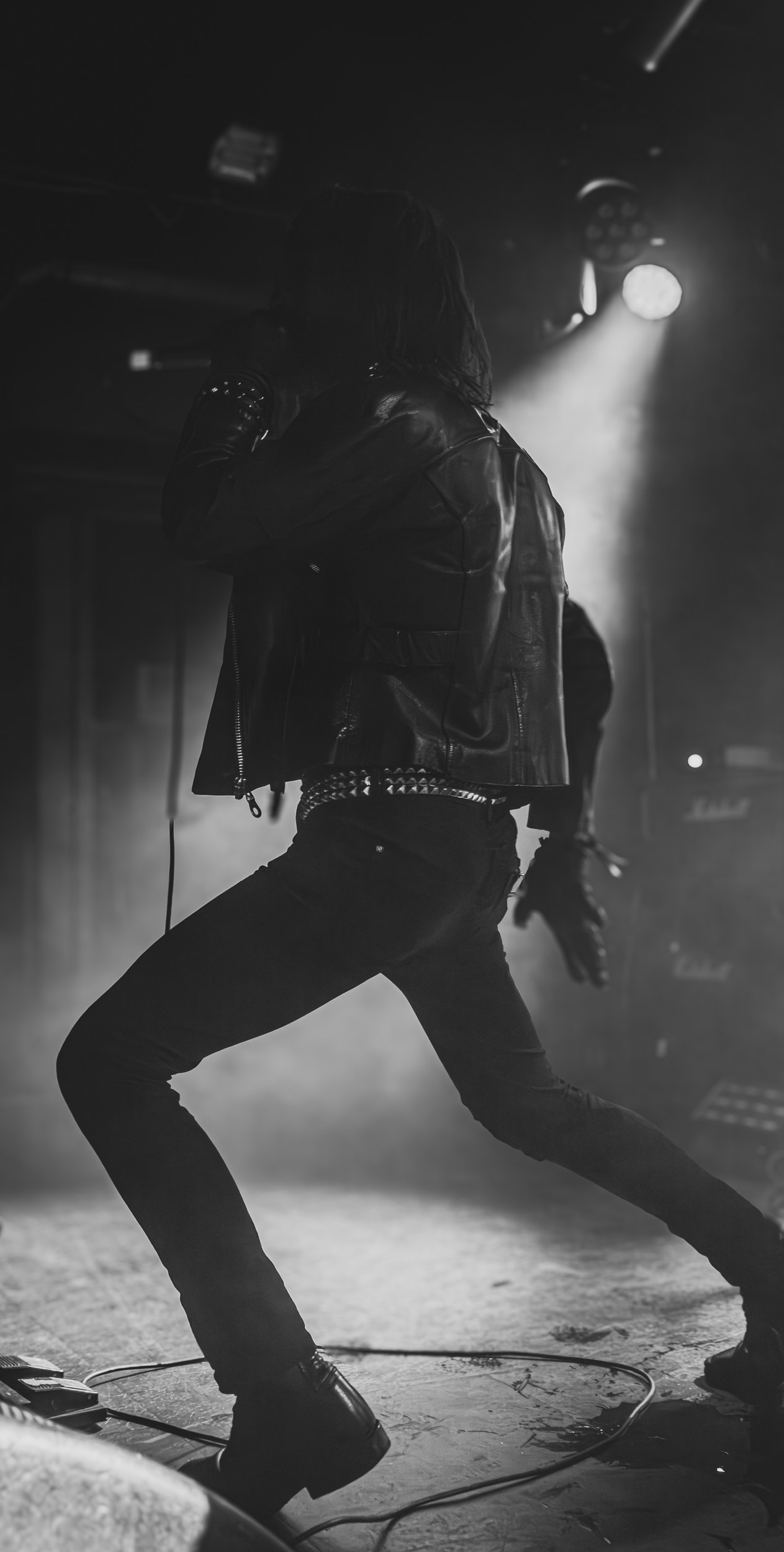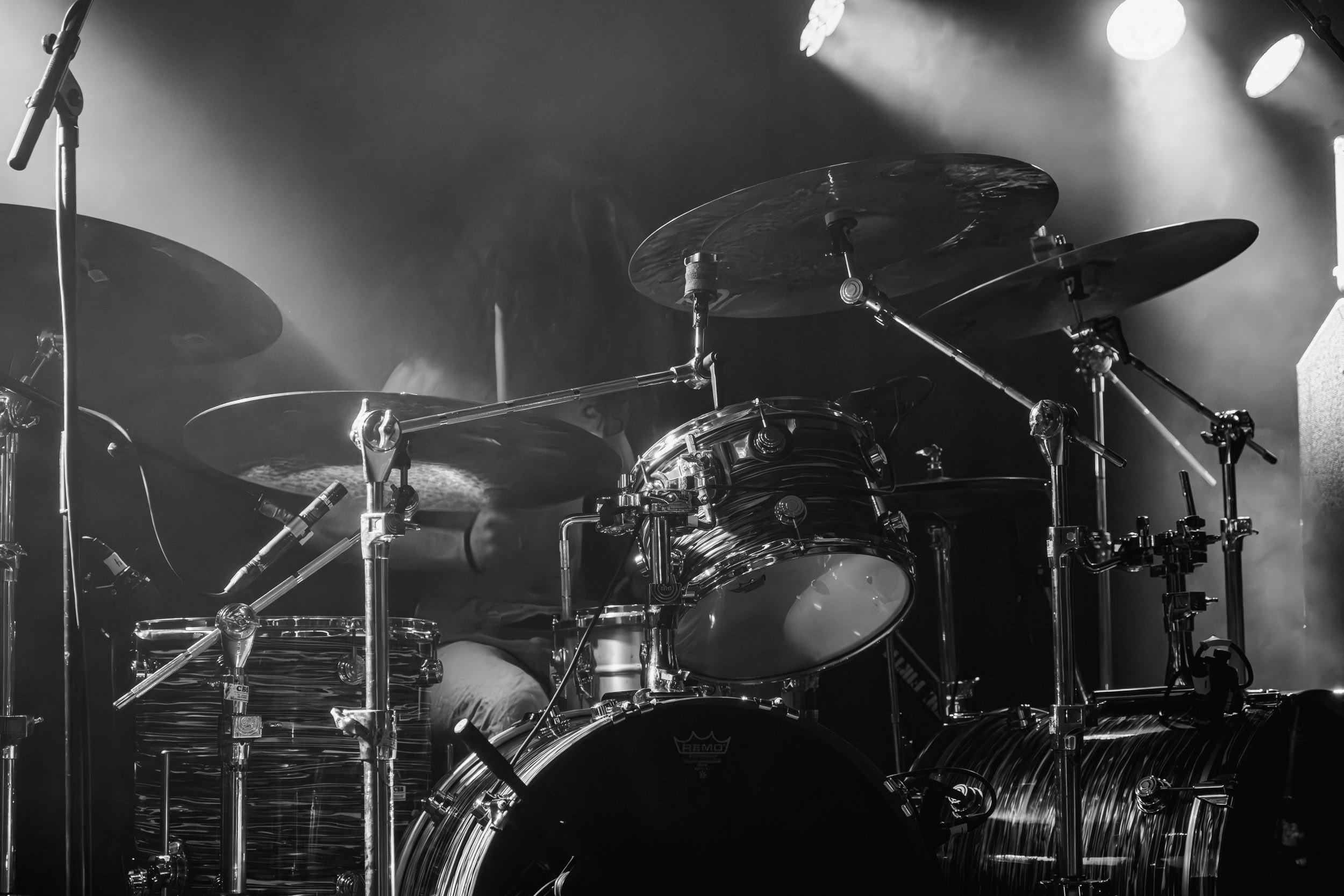 Udåd : Si Udåd vient tout juste d’émerger avec la sortie de son premier album éponyme en 2024, son fondateur, lui, est loin d’être un inconnu. Pour cause : il s’agit de Thomas Eriksen, l’homme derrière la valeur sûre Mork. Ce nouveau projet se distingue toutefois de son grand frère de par son approche très brute et dépouillée, aussi bien au niveau de l’écriture et de la musicalité que du mixage sonore. Le rythme de l’ensemble oscille entre lent et mid, porté par des morceaux au rythme ternaire leur donnant des airs de valse mortuaire. En résulte une ambiance froide et austère, renforcée par la distance dont font montre les musiciens, qui ne répondent que par le son de leurs instruments aux injonctions des spectateurs. Thomas Eriksen, dans son rôle de frontman, paraît comme une présence fantomatique, le visage caché derrière ses cheveux, le reverb sur sa voix — unique effet sonore que se permet le mixage — renforçant d’autant plus cette apparence surnaturelle. L’éclairage monochrome rouge, qui ne change pas ou alors très peu, couplé à l’absence de lumières de face, ajoute la touche finale à cette atmosphère d’un autre monde. En tout cas, le stoïcisme et la dévotion des membres d’Udåd imposent respect et admiration ; de même, les morceaux ont quelque chose d’à la fois entêtant et envoûtant, pesant sur l’esprit aussi… L’un de ceux joués en dernier met en avant un petit passage en guitare lead au son grinçant et plaintif. [Ségolène]