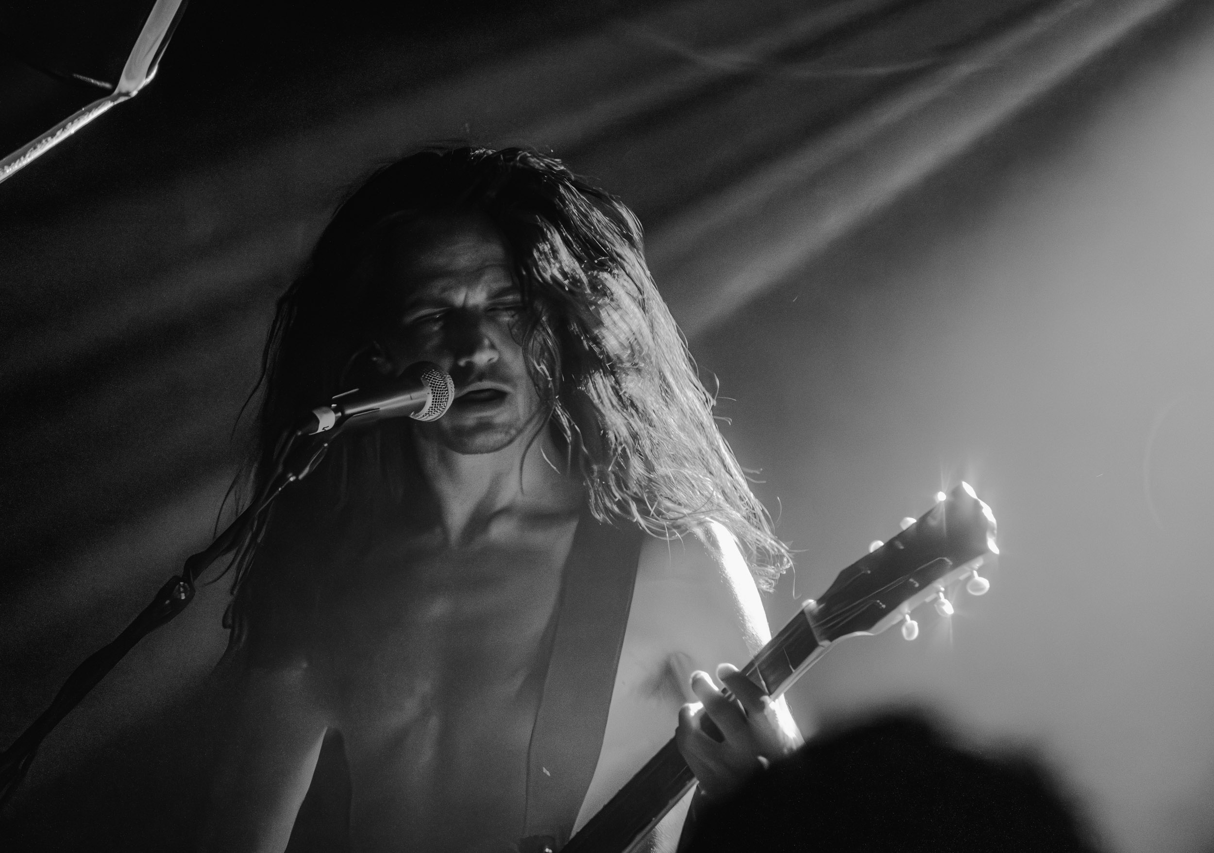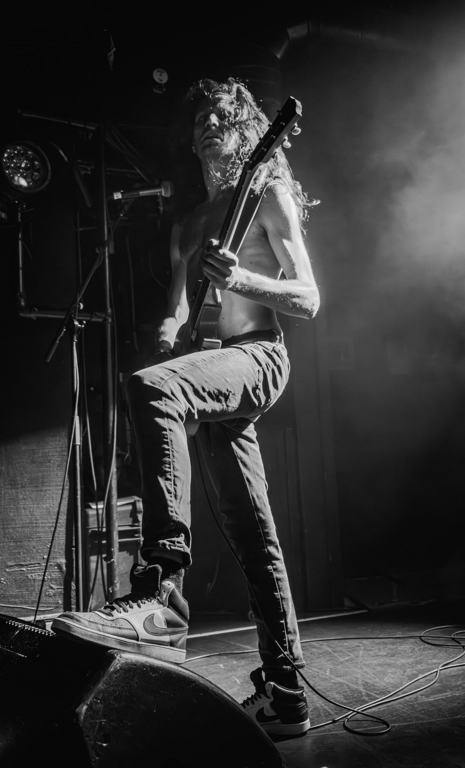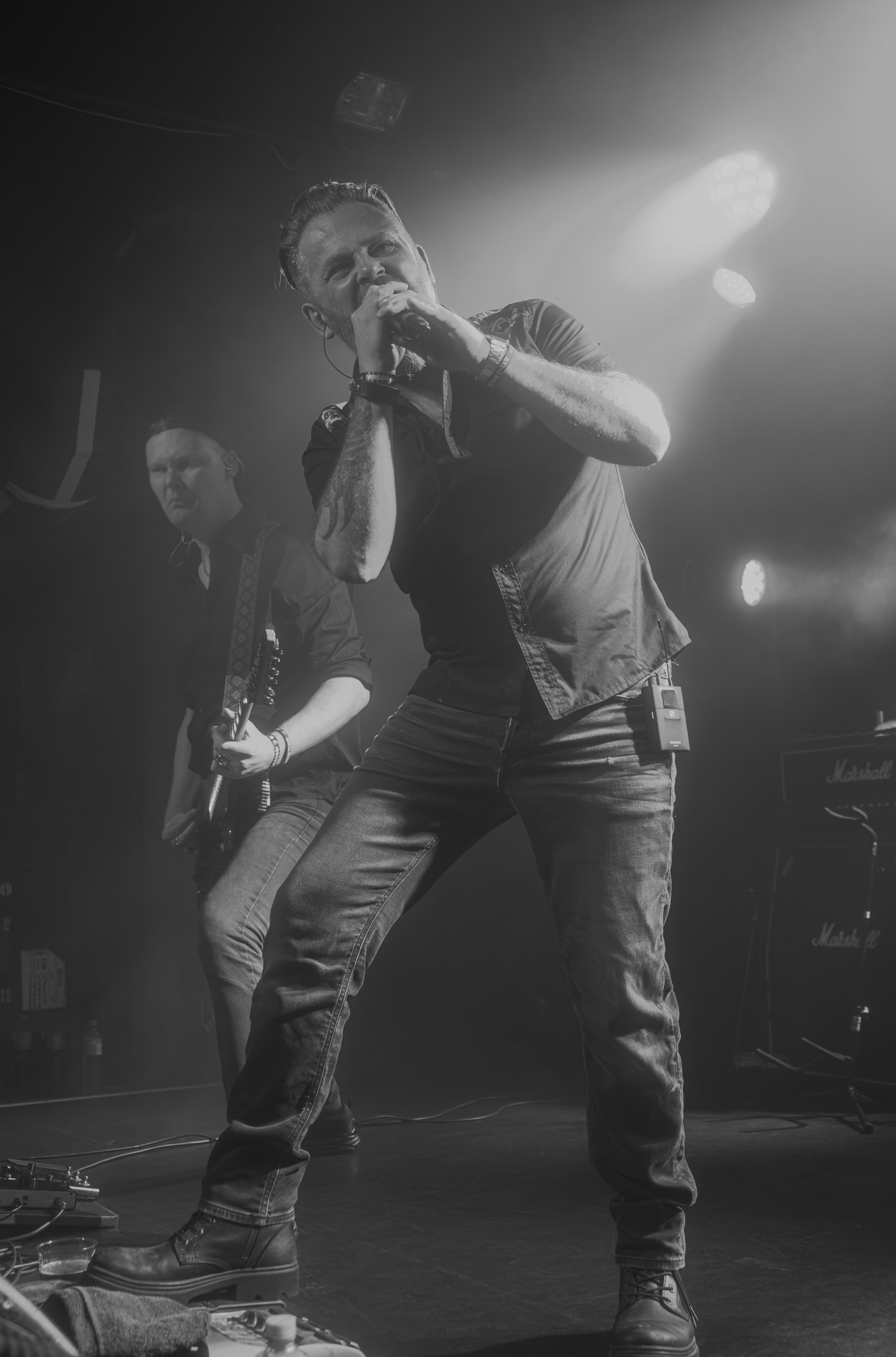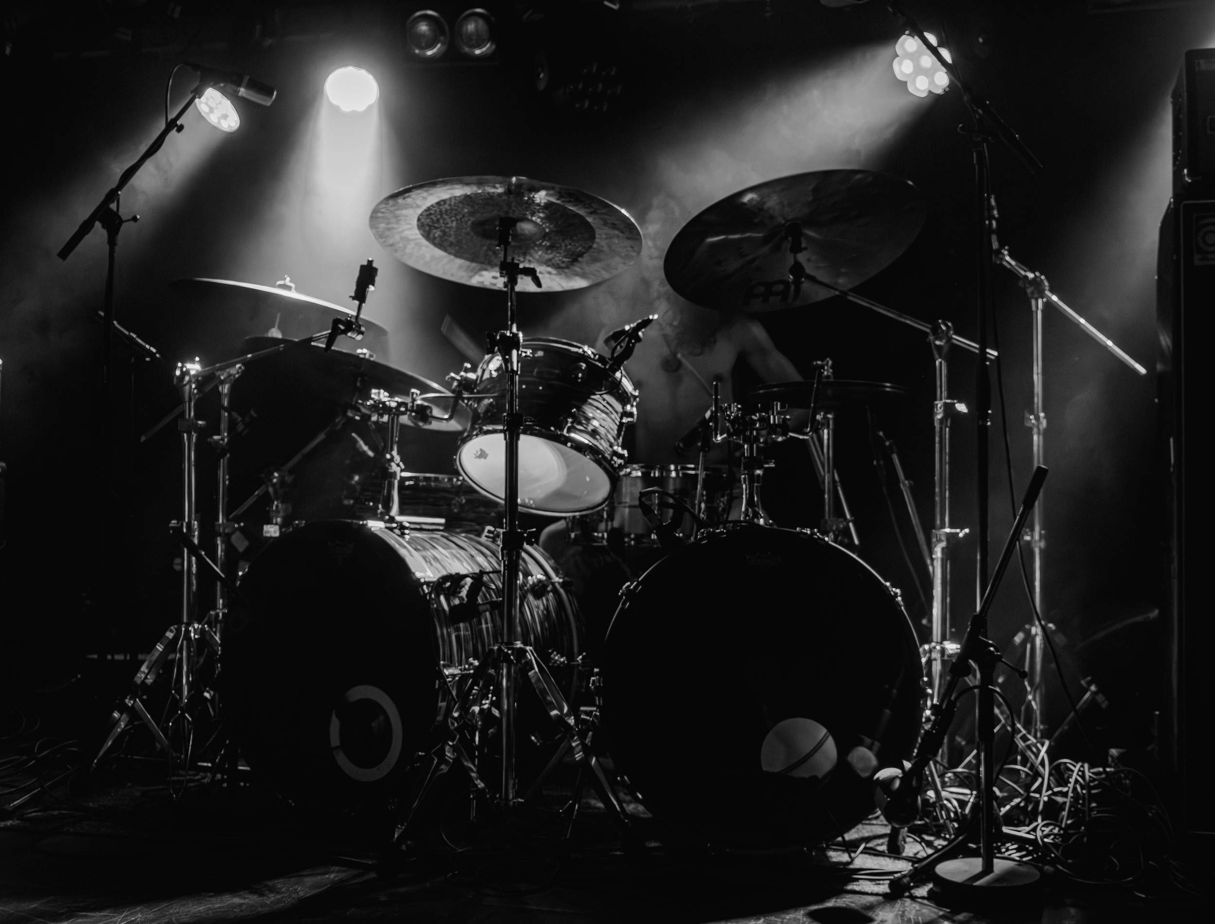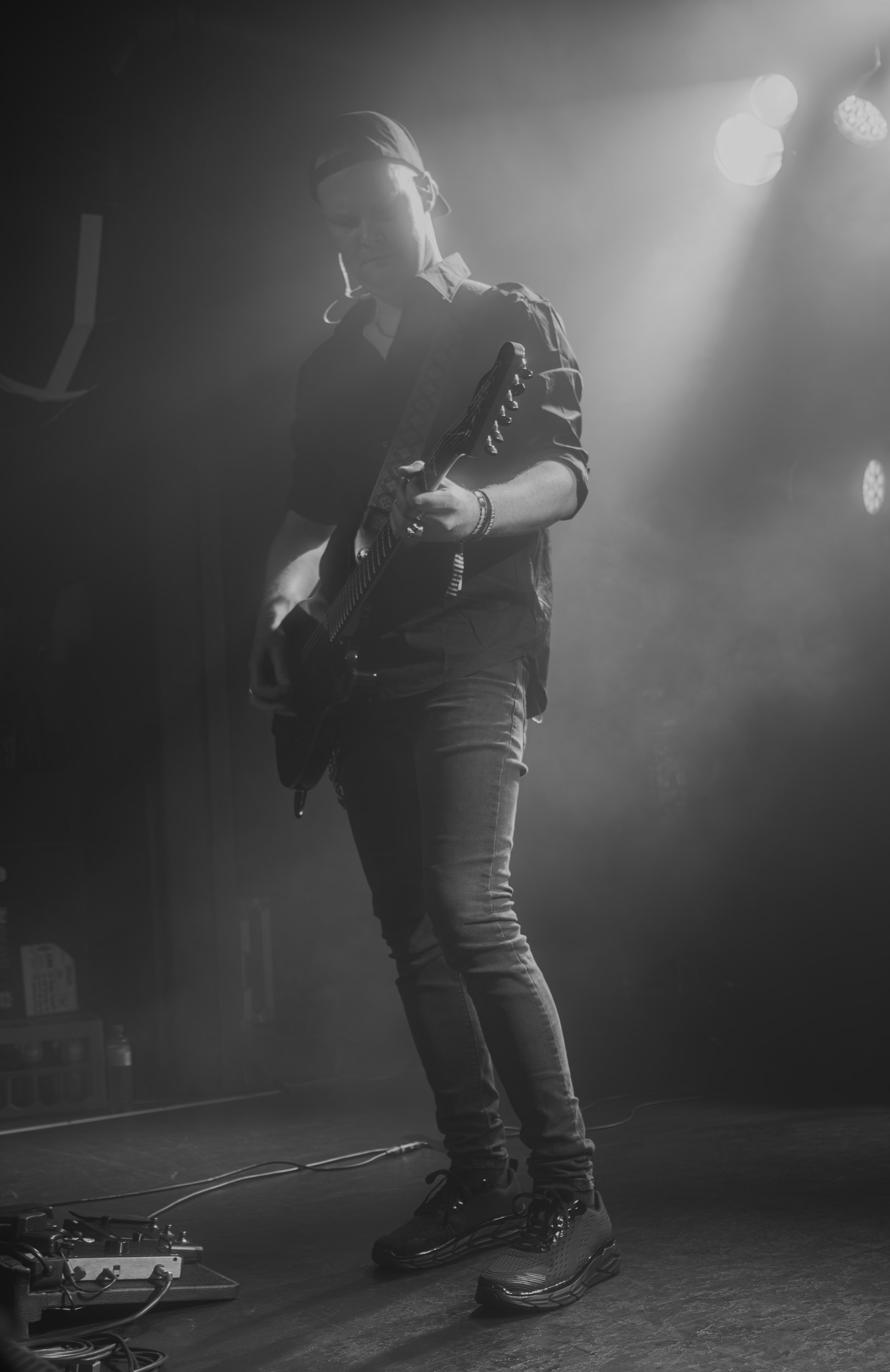 Udåd : Si Udåd vient tout juste d’émerger avec la sortie de son premier album éponyme en 2024, son fondateur, lui, est loin d’être un inconnu. Pour cause : il s’agit de Thomas Eriksen, l’homme derrière la valeur sûre Mork. Ce nouveau projet se distingue toutefois de son grand frère de par son approche très brute et dépouillée, aussi bien au niveau de l’écriture et de la musicalité que du mixage sonore. Le rythme de l’ensemble oscille entre lent et mid, porté par des morceaux au rythme ternaire leur donnant des airs de valse mortuaire. En résulte une ambiance froide et austère, renforcée par la distance dont font montre les musiciens, qui ne répondent que par le son de leurs instruments aux injonctions des spectateurs. Thomas Eriksen, dans son rôle de frontman, paraît comme une présence fantomatique, le visage caché derrière ses cheveux, le reverb sur sa voix — unique effet sonore que se permet le mixage — renforçant d’autant plus cette apparence surnaturelle. L’éclairage monochrome rouge, qui ne change pas ou alors très peu, couplé à l’absence de lumières de face, ajoute la touche finale à cette atmosphère d’un autre monde. En tout cas, le stoïcisme et la dévotion des membres d’Udåd imposent respect et admiration ; de même, les morceaux ont quelque chose d’à la fois entêtant et envoûtant, pesant sur l’esprit aussi… L’un de ceux joués en dernier met en avant un petit passage en guitare lead au son grinçant et plaintif. [Ségolène]