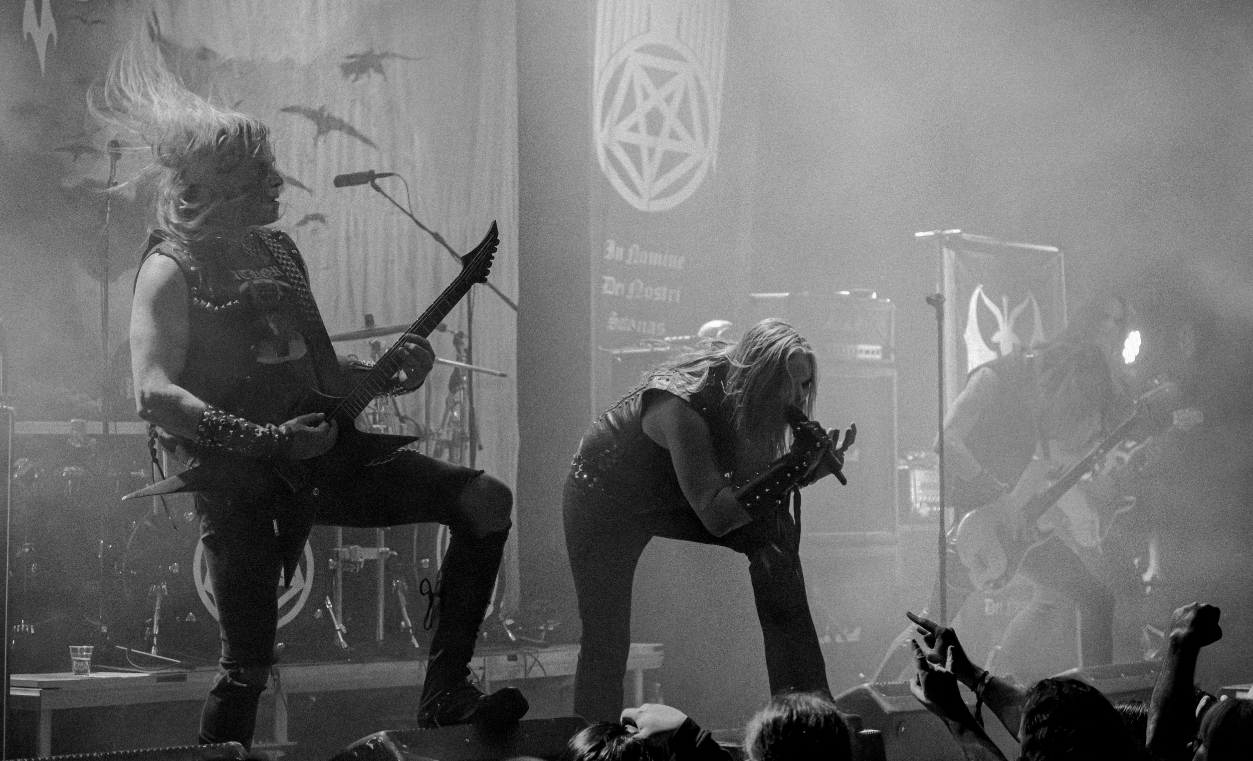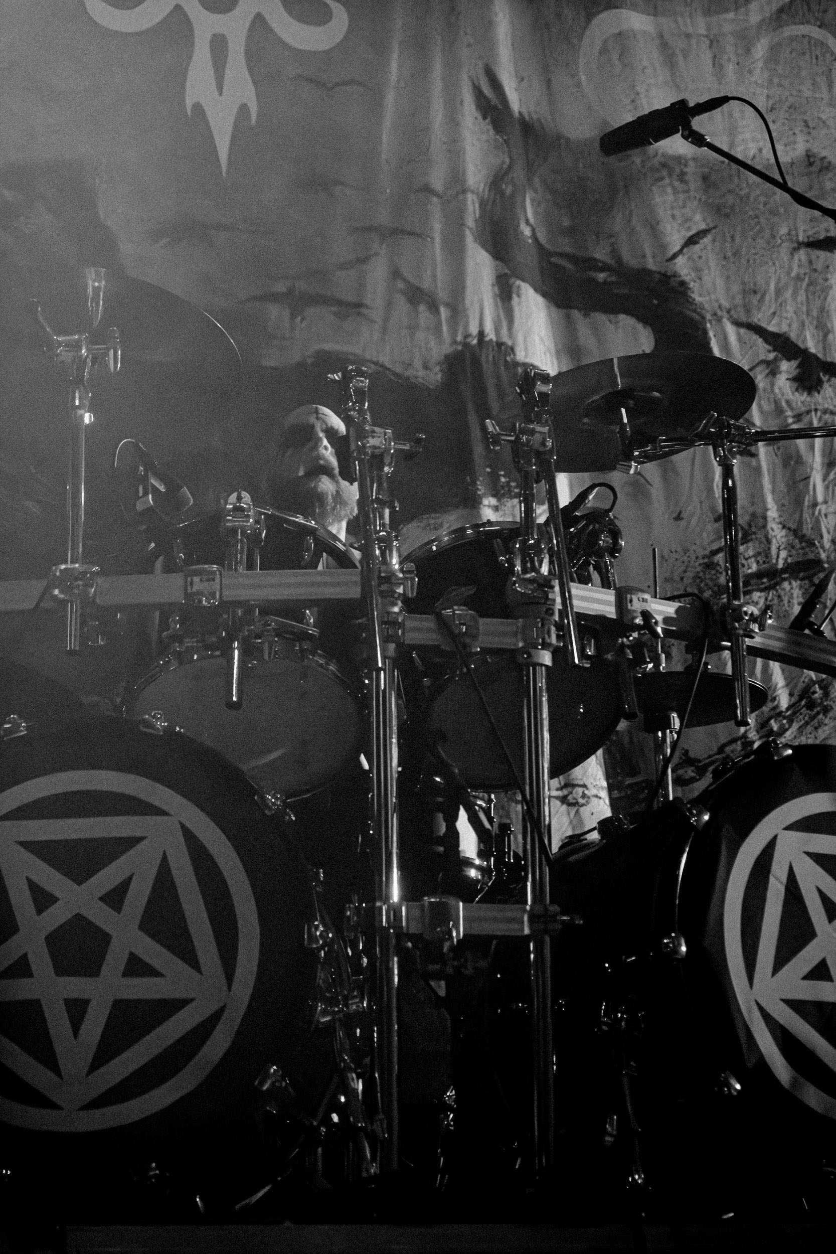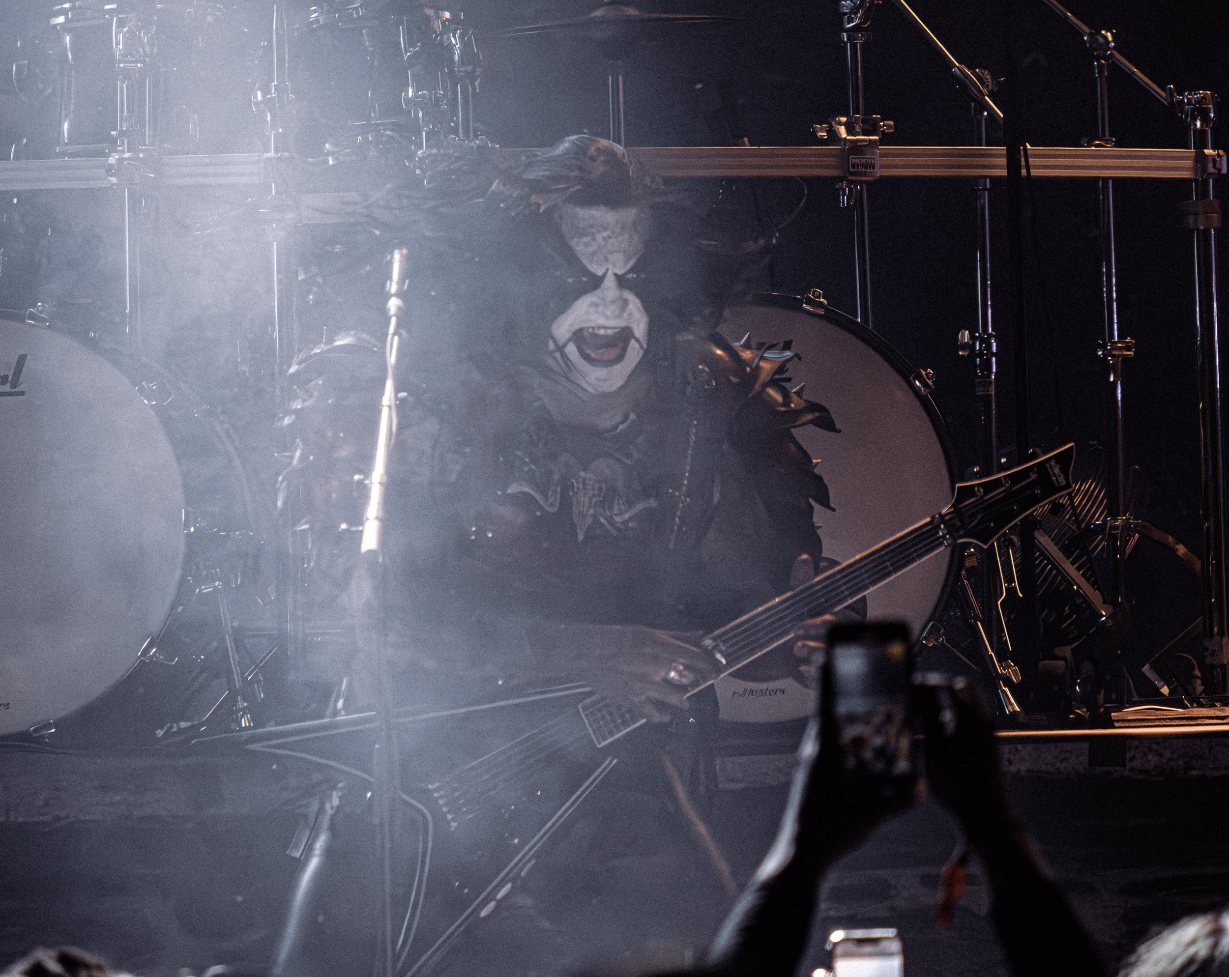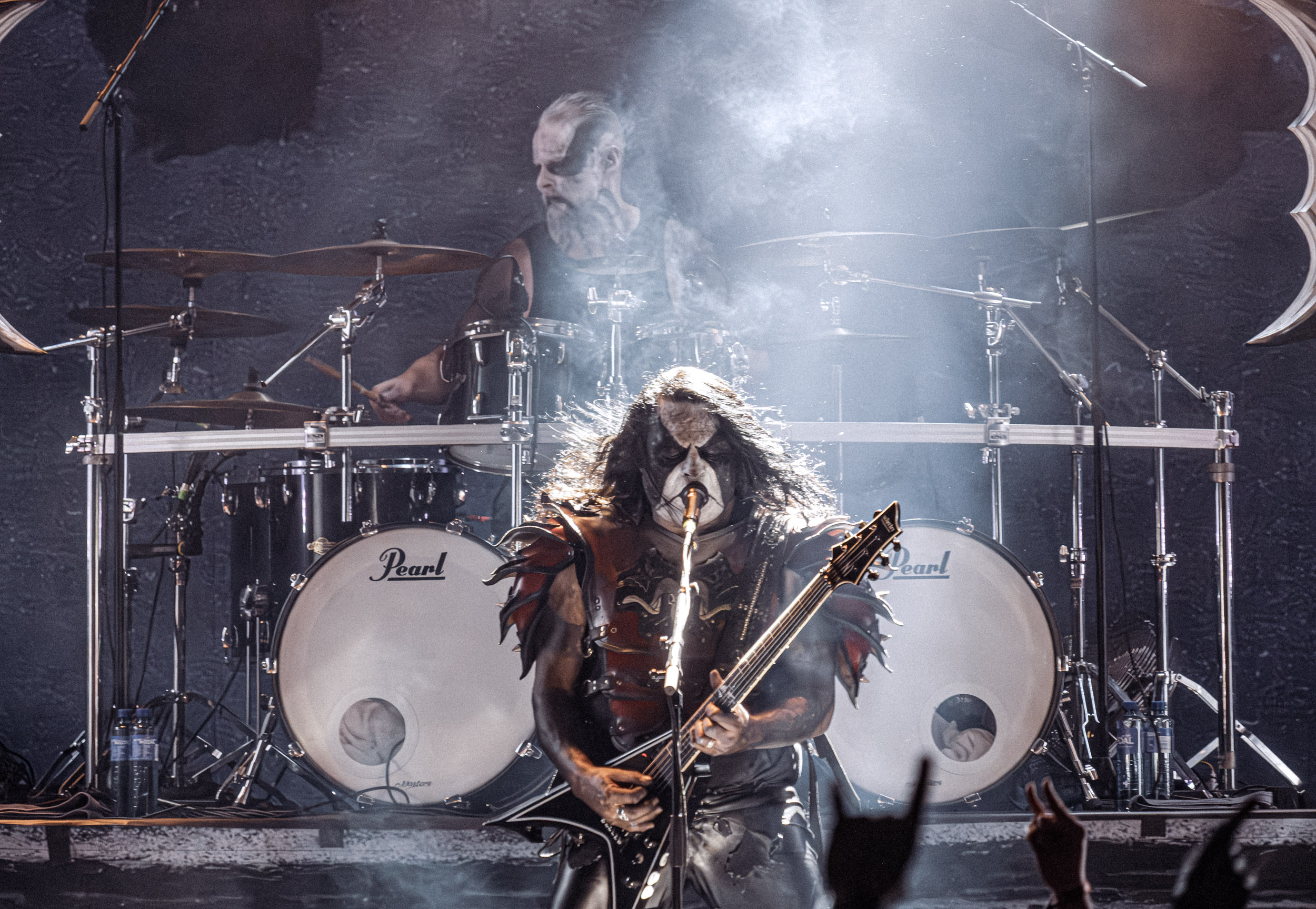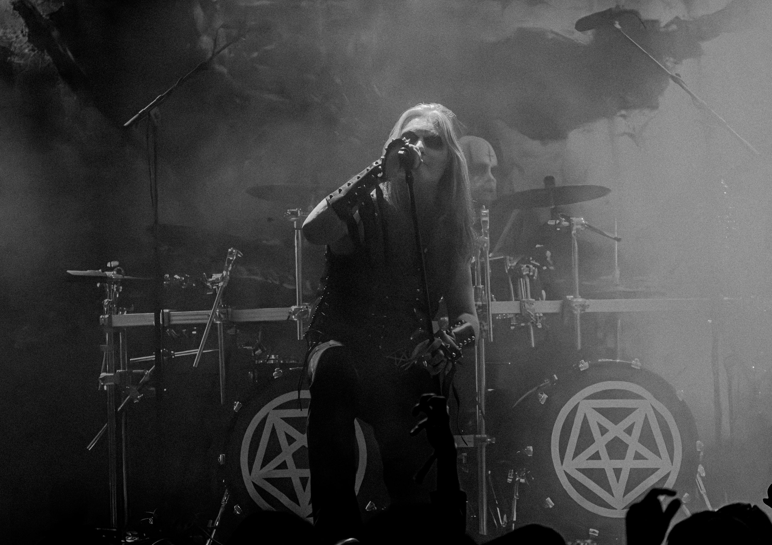 Les premiers moments forts du set ne tardent pas à arriver. Le groupe exhume notamment Regno Potiri, tiré de l’album culte 666 International, titre emblématique de sa période la plus expérimentale, dont la construction atypique et les textures électroniques contrastent avec la brutalité des passages black metal, illustrant parfaitement la singularité de DHG. Autre moment marquant : l’apparition surprise de Kvohst, ancien chanteur du groupe, venu interpréter All Is Not Self. La réaction du public ne se fait pas attendre : la salle accueille cette réunion inattendue avec une ovation nourrie, donnant à la performance une dimension presque historique.