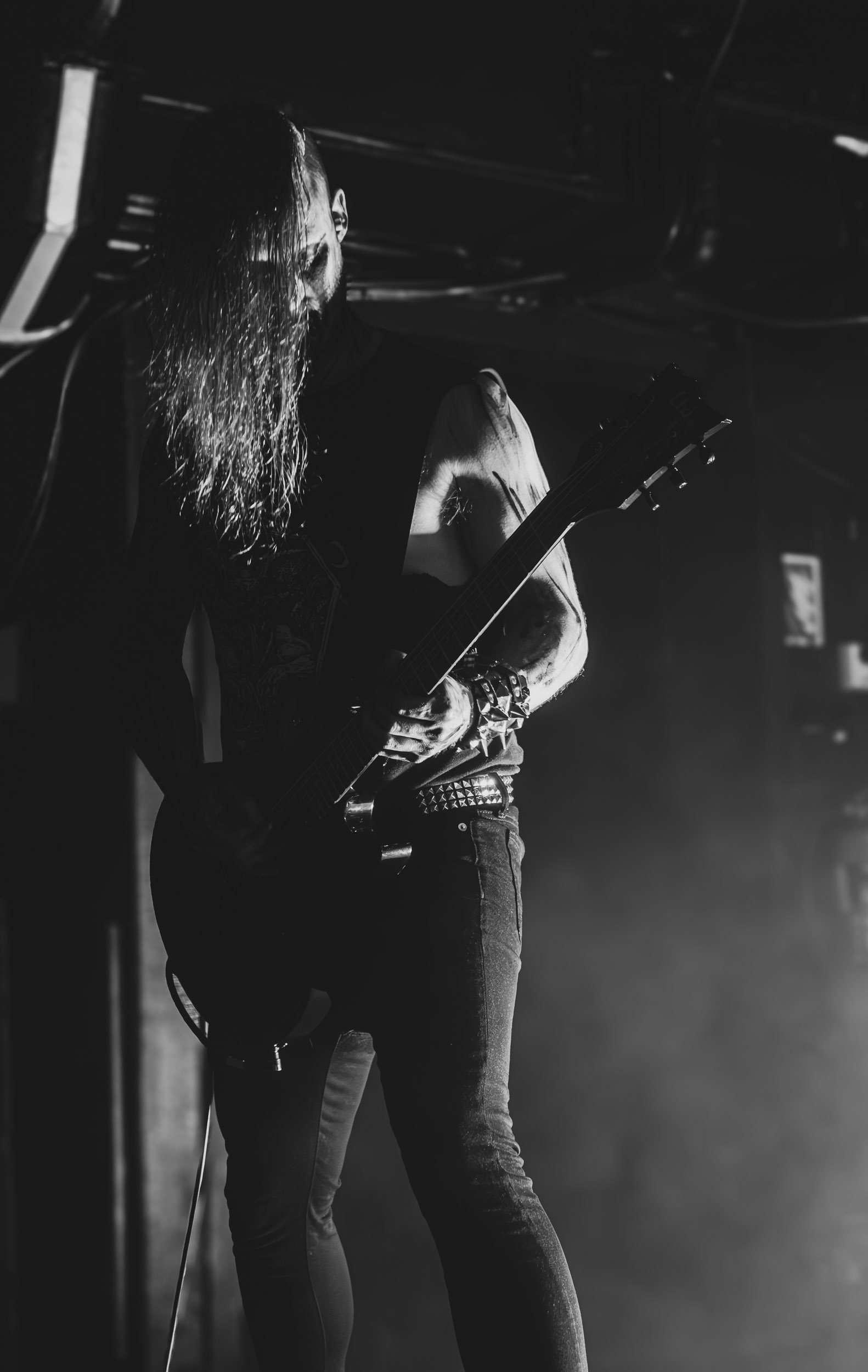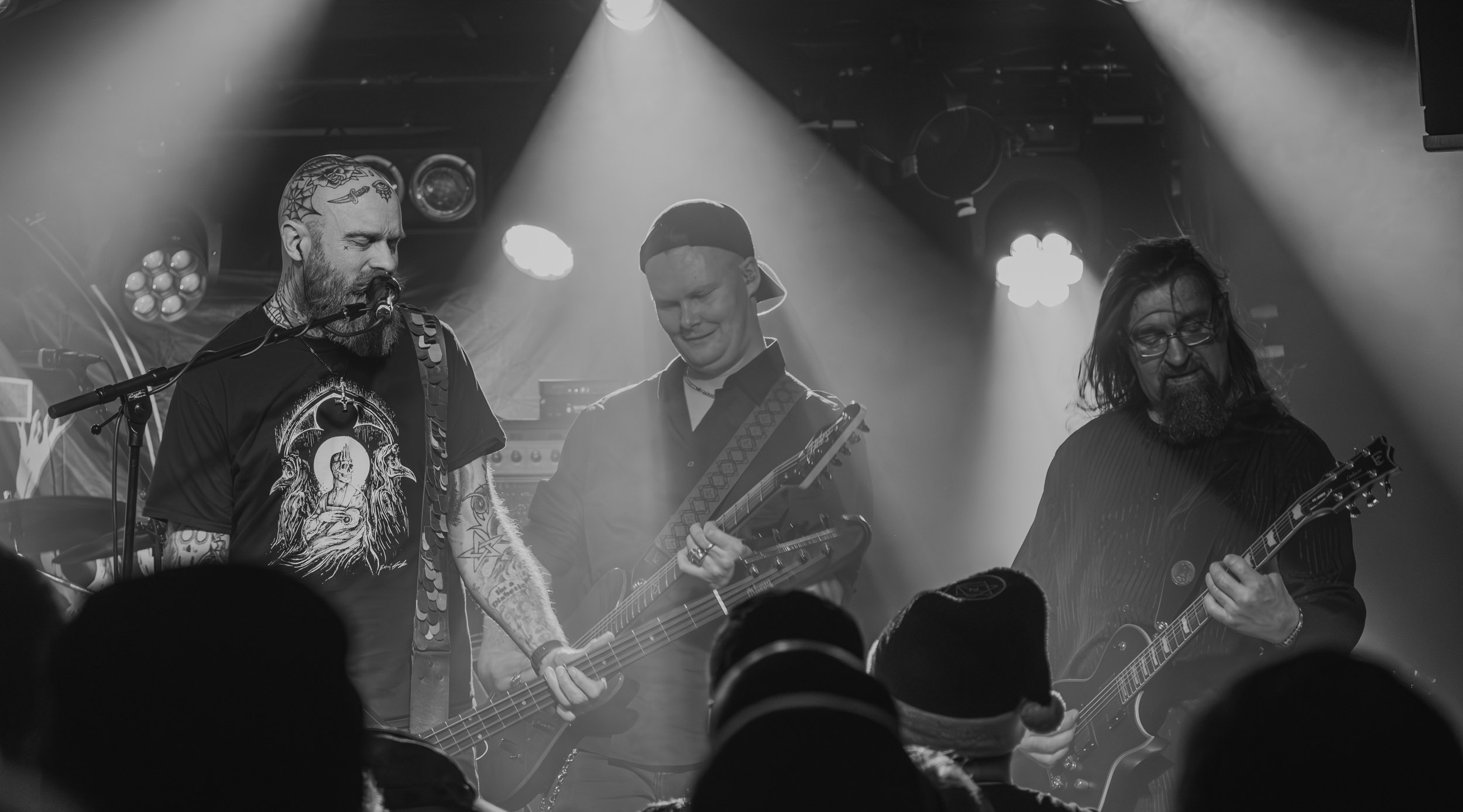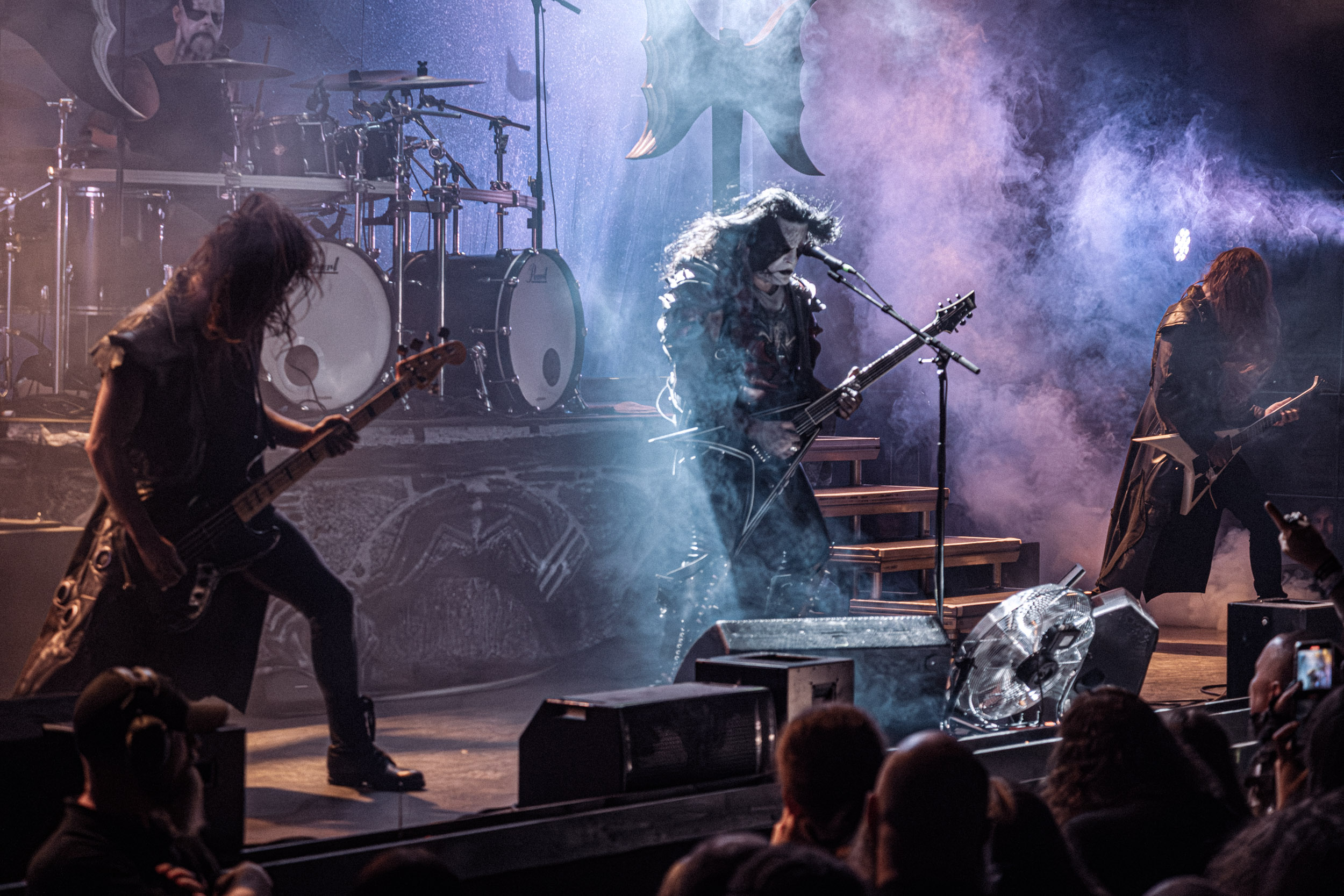 Spectral Wound : Spectral Wound, voici un nom qui commence en ce moment à se faire présent sur de multiples et diverses affiches, y compris celle du Hellfest ; autant dire que ce nouvel élan de popularité a de quoi susciter la curiosité chez certains, moi-même y compris… et au vu de ce à quoi je découvre avoir affaire ce soir, autant dire qu’il ne faut pas beaucoup de temps au groupe pour démontrer d’où lui vient ce mérite ! À se fier au titre d’un de ses morceaux, le quintet canadien pratique un « Aristocratic Suicidal Black Metal » ; en des termes moins abstraits, cela se traduit par un black metal rapide, incisif, précis et surtout très dense : rythmique tempétueuse, riffs frénétiques et mélodies ciselées, le tout accompagnant la voix spectrale de Jonah Campbell, en constituent les principaux ingrédients. Outre cela, sous les spotlights bleus clignotants, les cinq hommes prennent effectivement l’allure de spectres lamentant leur malheur dans la brume… autant dire que le groupe fait honneur à son nom ! Il fait aussi honneur à son excellent quatrième album sorti en 2024, Songs of Blood and Mire, qui occupe une bonne partie du set. Dans tous les cas, quel que soit le morceau joué, l’équilibre entre mélodie et agressivité est toujours présent, de même que la rage de vaincre, et je ne peux m’empêcher de me dire que les Canadiens feraient plus que bonne figure en ouverture de Marduk et autres consorts du genre… Bien joué Spectral Wound, bien joué Montréal ! [Ségolène]