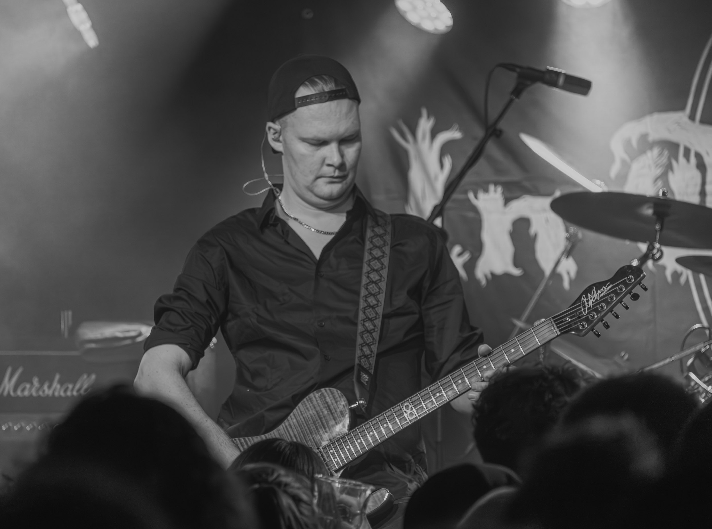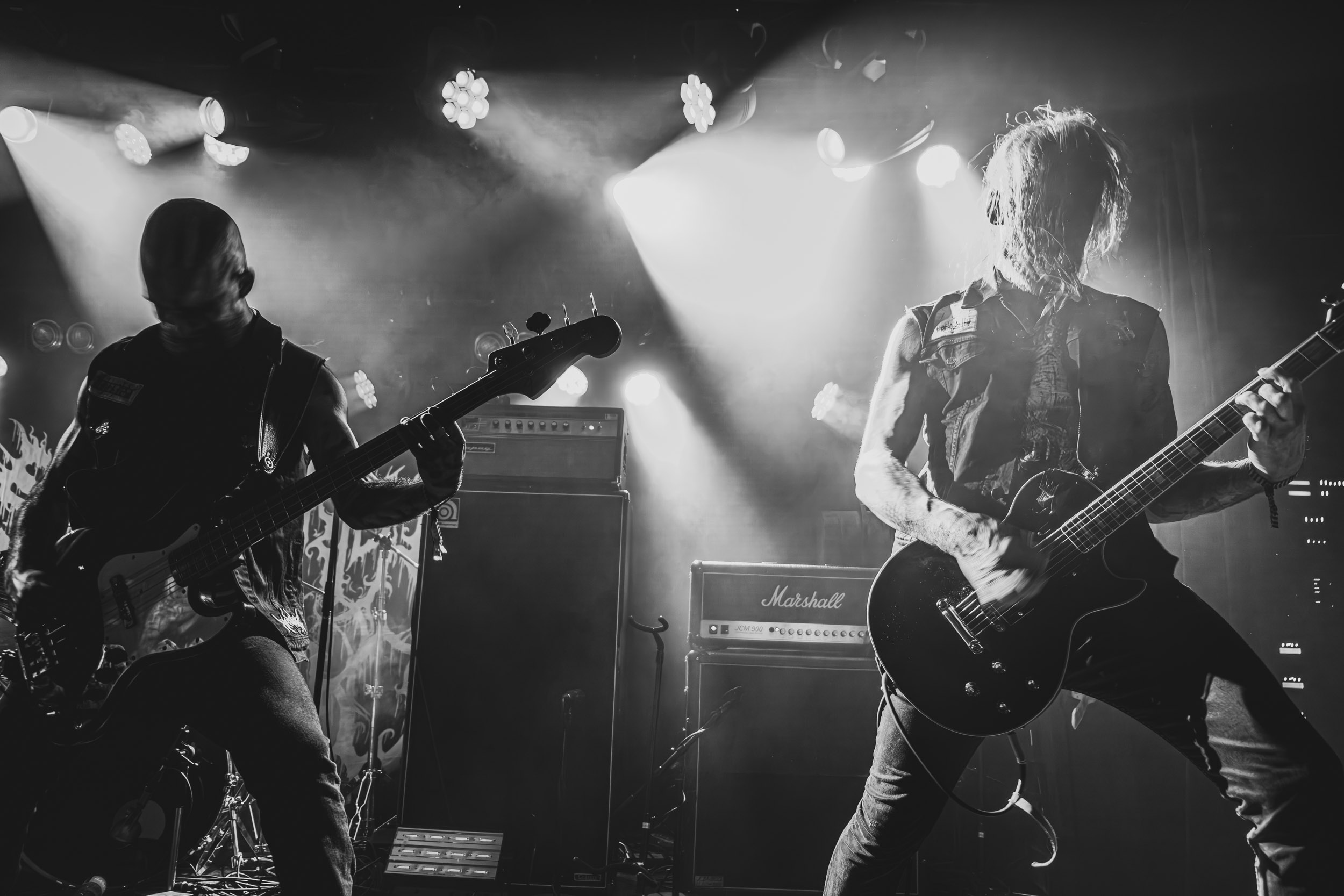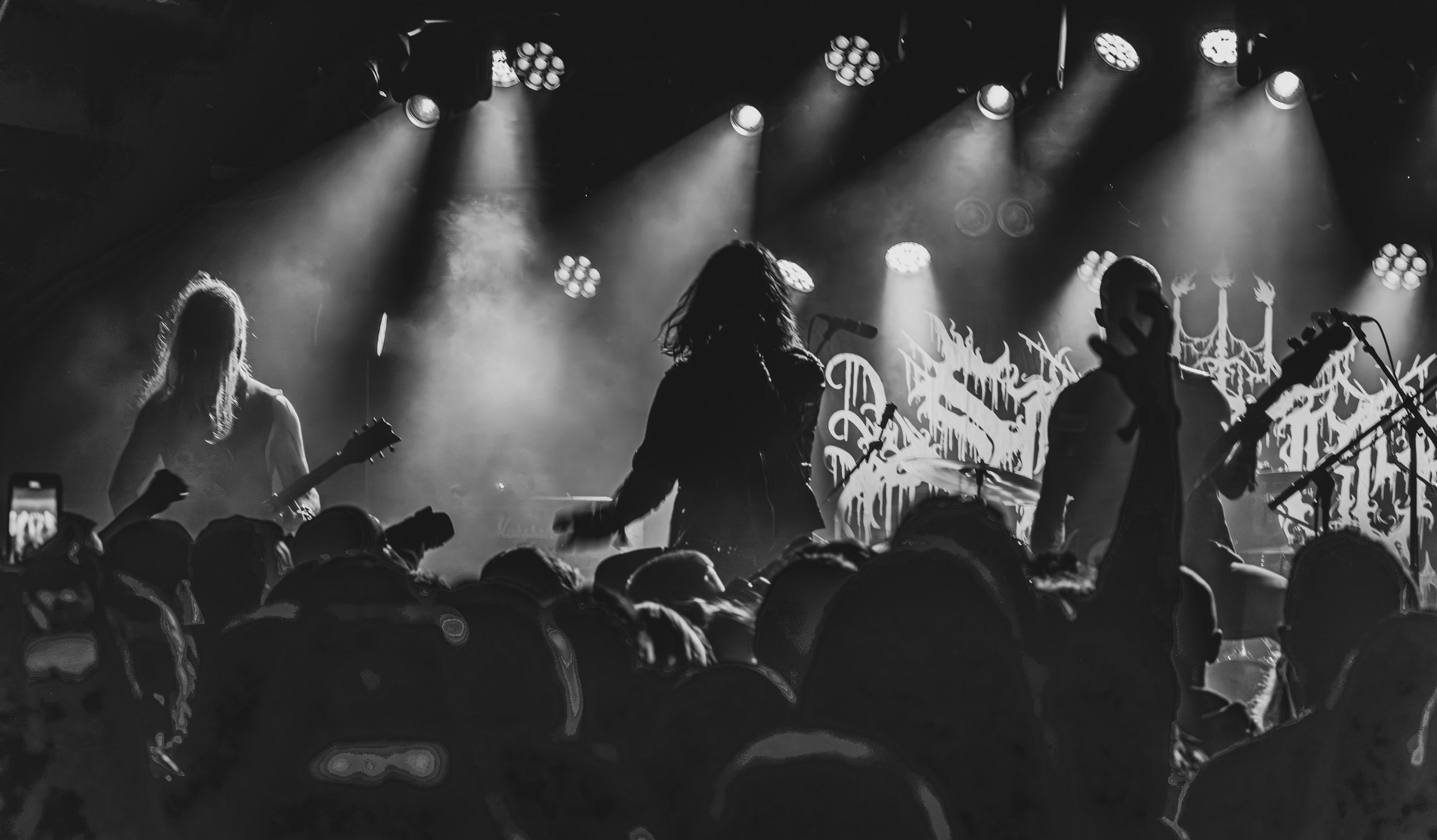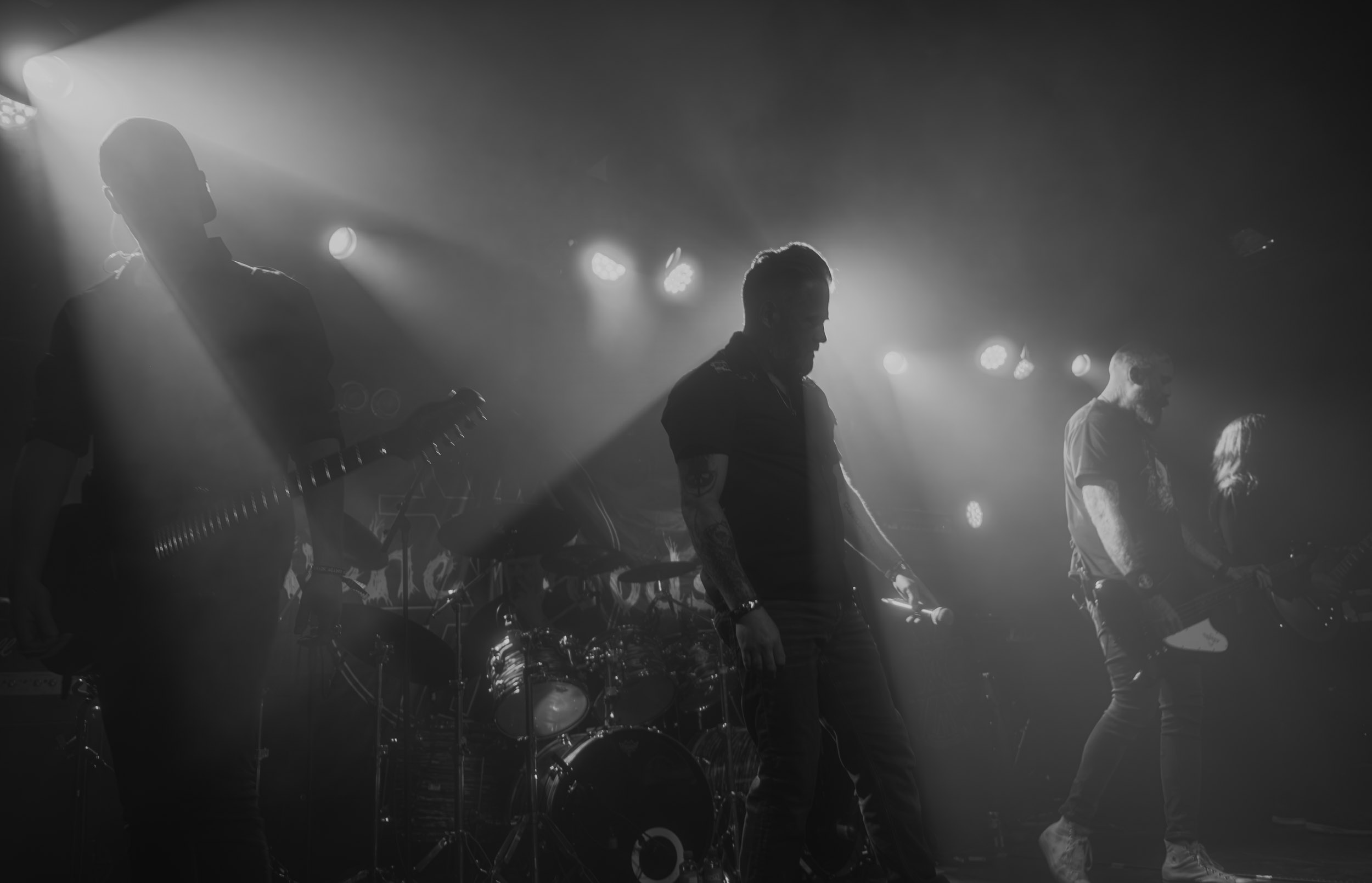 Spectral Wound : Spectral Wound, voici un nom qui commence en ce moment à se faire présent sur de multiples et diverses affiches, y compris celle du Hellfest ; autant dire que ce nouvel élan de popularité a de quoi susciter la curiosité chez certains, moi-même y compris… et au vu de ce à quoi je découvre avoir affaire ce soir, autant dire qu’il ne faut pas beaucoup de temps au groupe pour démontrer d’où lui vient ce mérite ! À se fier au titre d’un de ses morceaux, le quintet canadien pratique un « Aristocratic Suicidal Black Metal » ; en des termes moins abstraits, cela se traduit par un black metal rapide, incisif, précis et surtout très dense : rythmique tempétueuse, riffs frénétiques et mélodies ciselées, le tout accompagnant la voix spectrale de Jonah Campbell, en constituent les principaux ingrédients. Outre cela, sous les spotlights bleus clignotants, les cinq hommes prennent effectivement l’allure de spectres lamentant leur malheur dans la brume… autant dire que le groupe fait honneur à son nom ! Il fait aussi honneur à son excellent quatrième album sorti en 2024, Songs of Blood and Mire, qui occupe une bonne partie du set. Dans tous les cas, quel que soit le morceau joué, l’équilibre entre mélodie et agressivité est toujours présent, de même que la rage de vaincre, et je ne peux m’empêcher de me dire que les Canadiens feraient plus que bonne figure en ouverture de Marduk et autres consorts du genre… Bien joué Spectral Wound, bien joué Montréal ! [Ségolène]