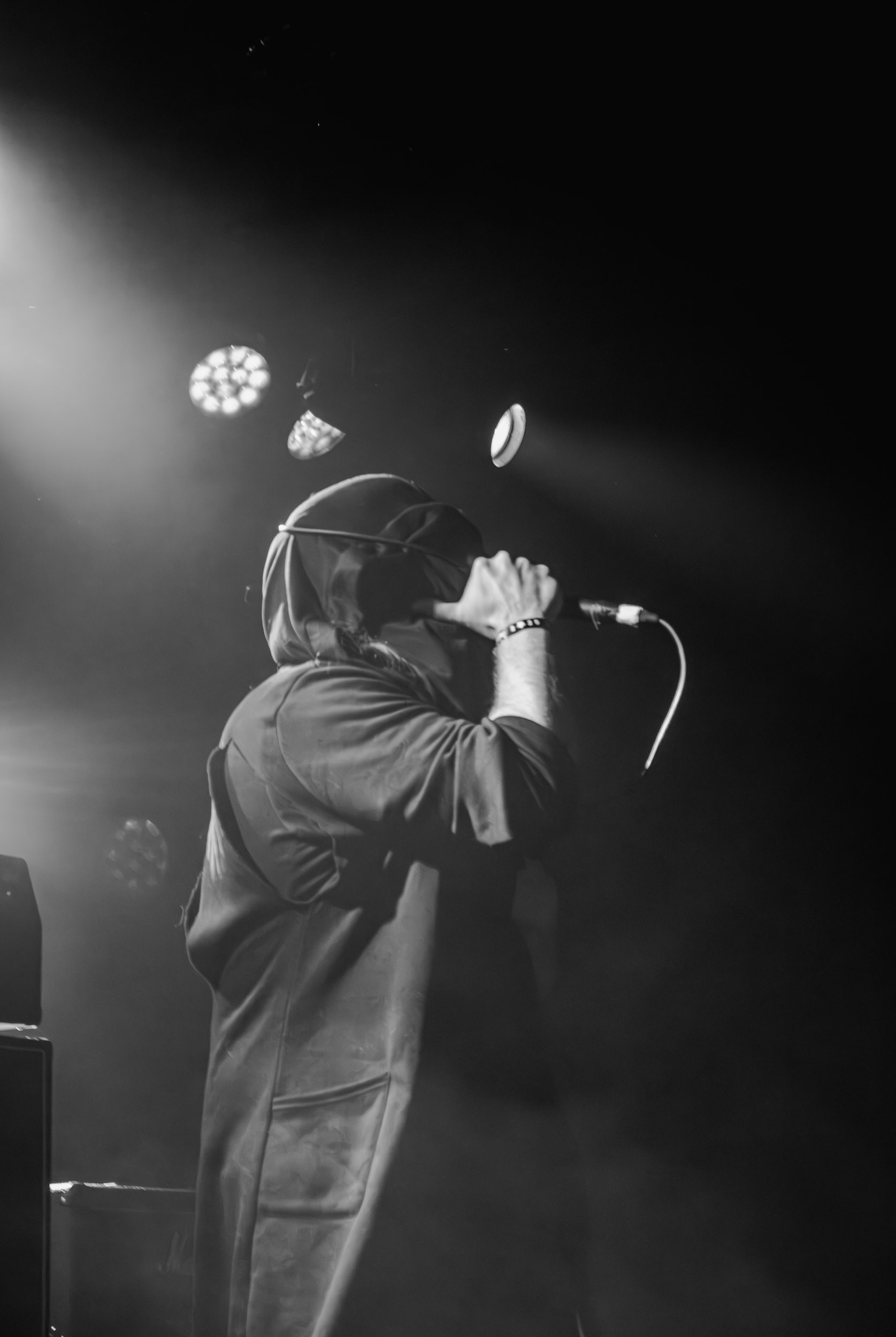 Syn : Scène underground au sens propre comme au figuré, John Dee offre à de nombreux groupes émergents l’occasion de se produire à un festival de grande ampleur, et aux spectateurs l’occasion de découvrir ces derniers. Des groupes à l’affiche de l’édition 2025 de l’Inferno, Syn est le premier à en fouler les planches. Formé en 2023, l’aura de mystère entourant ce jeune groupe est au moins égale à la simplicité de son nom, son fondateur, Vegard Liverød, ne comptant pas parmi les noms les plus connus du milieu, et ceux des membres de session live demeurant inconnus. Simple, la musique du groupe l’est tout autant, faite de riffs et blasts dans la plus pure tradition black metal que d’une atmosphère chargée en mélancolie désespérée. Au cœur de la prestation, le frontman véhicule ce torrent d’émotions par des hurlements d’oiseau nocturne et par un jeu de scène habité au point d’en être théâtral, se baissant jusqu’à se recroqueviller ou mimant une pendaison avec le câble de son micro. Un masque dissimule son visage et son identité, pour autant il ne fait nul doute que son regard doit être du même acabit. Plus morbide encore que le morceau de milieu de set, au cours duquel il mime une décapitation ! Vu sous cet angle, l’homme paraît intimidant, de même que la musique de Syn ; toutefois l’un comme l’autre se révèlent tout autant captivants et touchants, et j’y gagne par là mon premier coup de cœur de cette édition de l’Inferno Festival. Du côté des musiciens, ceux-ci mettent aussi beaucoup de cœur à la tâche ; mentions honorables au guitariste, lui aussi très expressif dans son jeu de scène, ainsi qu’au batteur, vraiment excellent ! [Ségolène]