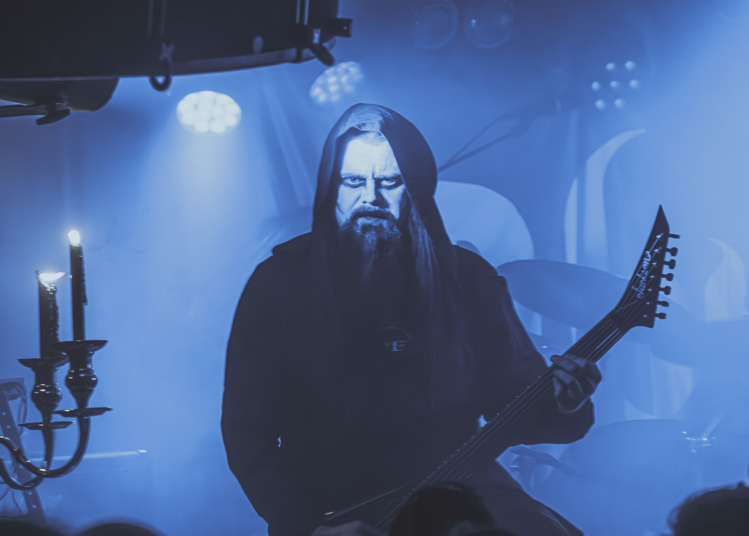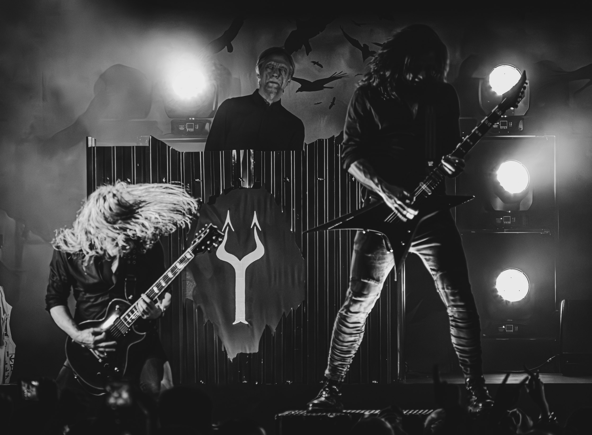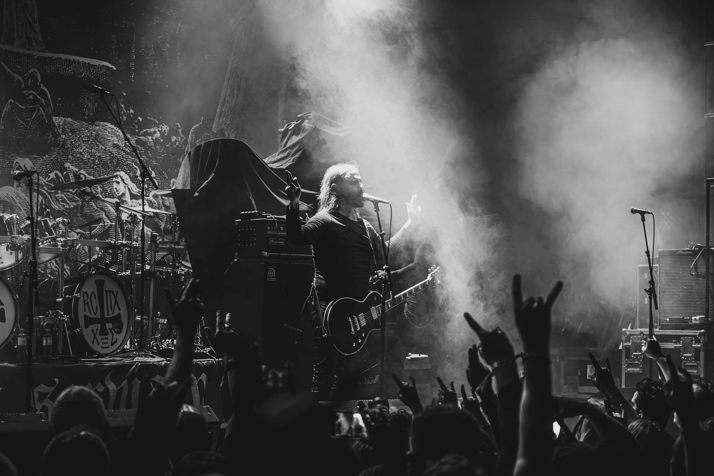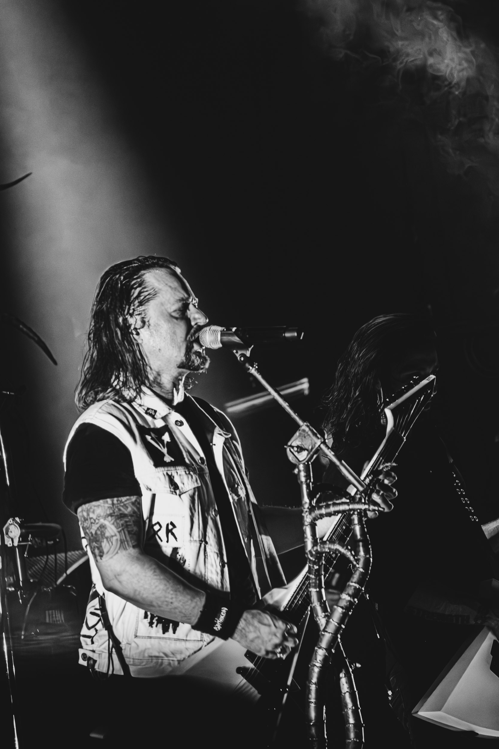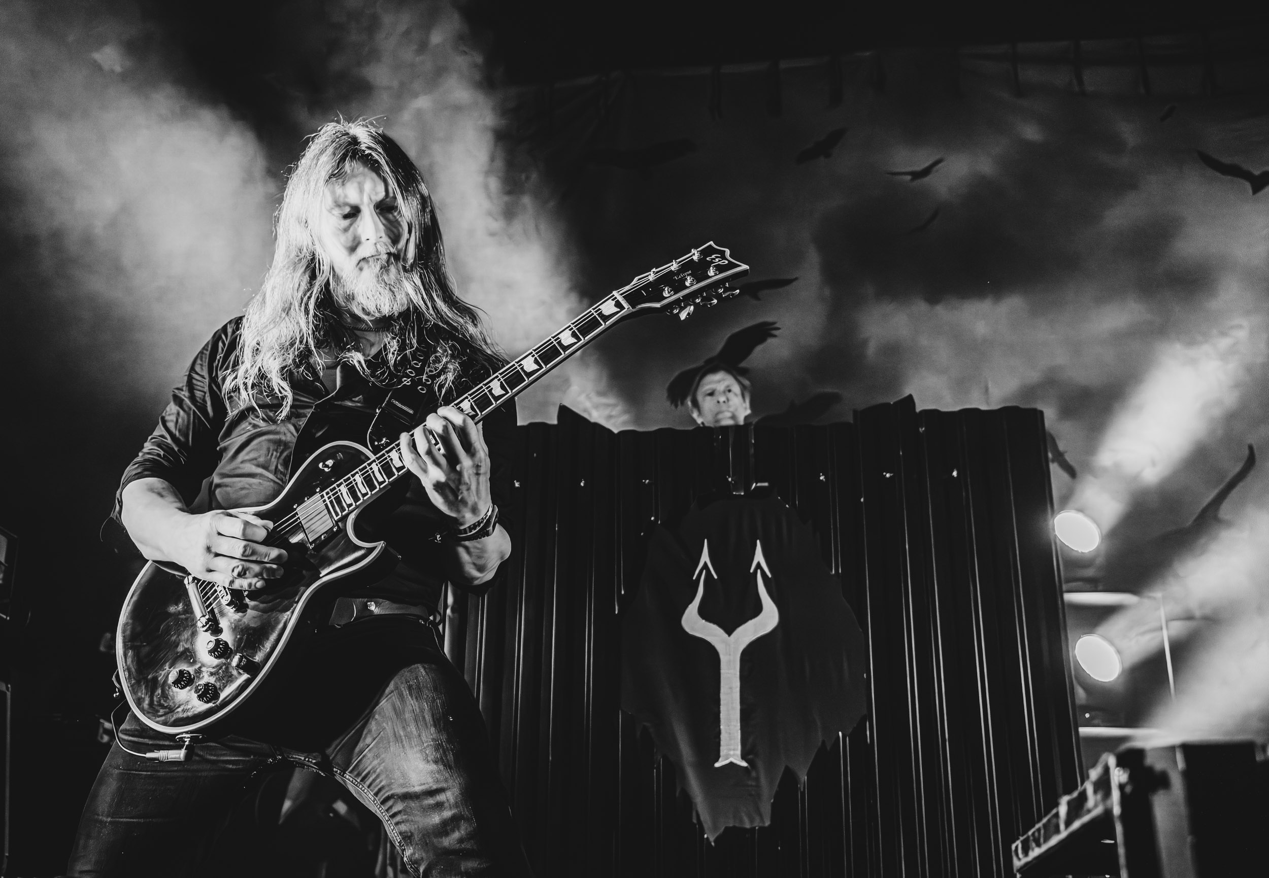 Satyricon : Deuxième représentant de la Unholy Trinity et non des moindres, c’est face à un public au taquet que Satyricon fait son entrée sur la scène Rockefeller. Now, Diabolical, classique parmi les classiques, accompagne mon passage dans le pit photo ; Our World, It Rumbles Tonight et Black Crow on a Tombstone, mon tour d’horizon des différents « spots photographiques » de la salle. Après cette entrée en matière, Satyr prend la parole pour raconter, en norvégien puis en anglais, ses souvenirs de jeunesse liés à cette salle, Rockefeller, où il a assisté à des concerts de Slayer et de Judas Priest, qu’il qualifie de « temple du heavy metal du pays ». Les termes ne pouvaient être mieux choisis, tant l’endroit est imprégné du genre et de son histoire… Le voyage dans le passé reprend par la suite, groupe et public côte à côte, dont la première étape nous mène en 2017 avec le morceau donnant son titre à l’album Deep Calleth Upon Deep. Les trois titres suivants nous font le plaisir d’un retour dans les années 90 et aux premiers albums du groupe ; d’abord à Dark Medieval Times (1993) avec Walk the Path of Sorrow, puis à Nemesis Divina (1996) et Shadowthrone (1994) avec deux titres dans la langue maternelle des musiciens. Ces derniers, comme les membres de Rotting Christ quelques heures plus tôt, apparaissent sobres dans leurs tenues noires et se donnent à fond dans leur performance. Satyr, de son côté, profite d’un intermède entre deux titres pour dégainer la veste à écussons — sa seule fantaisie vestimentaire — et la troisième guitare, qu’il garde toutes deux le temps de deux morceaux.