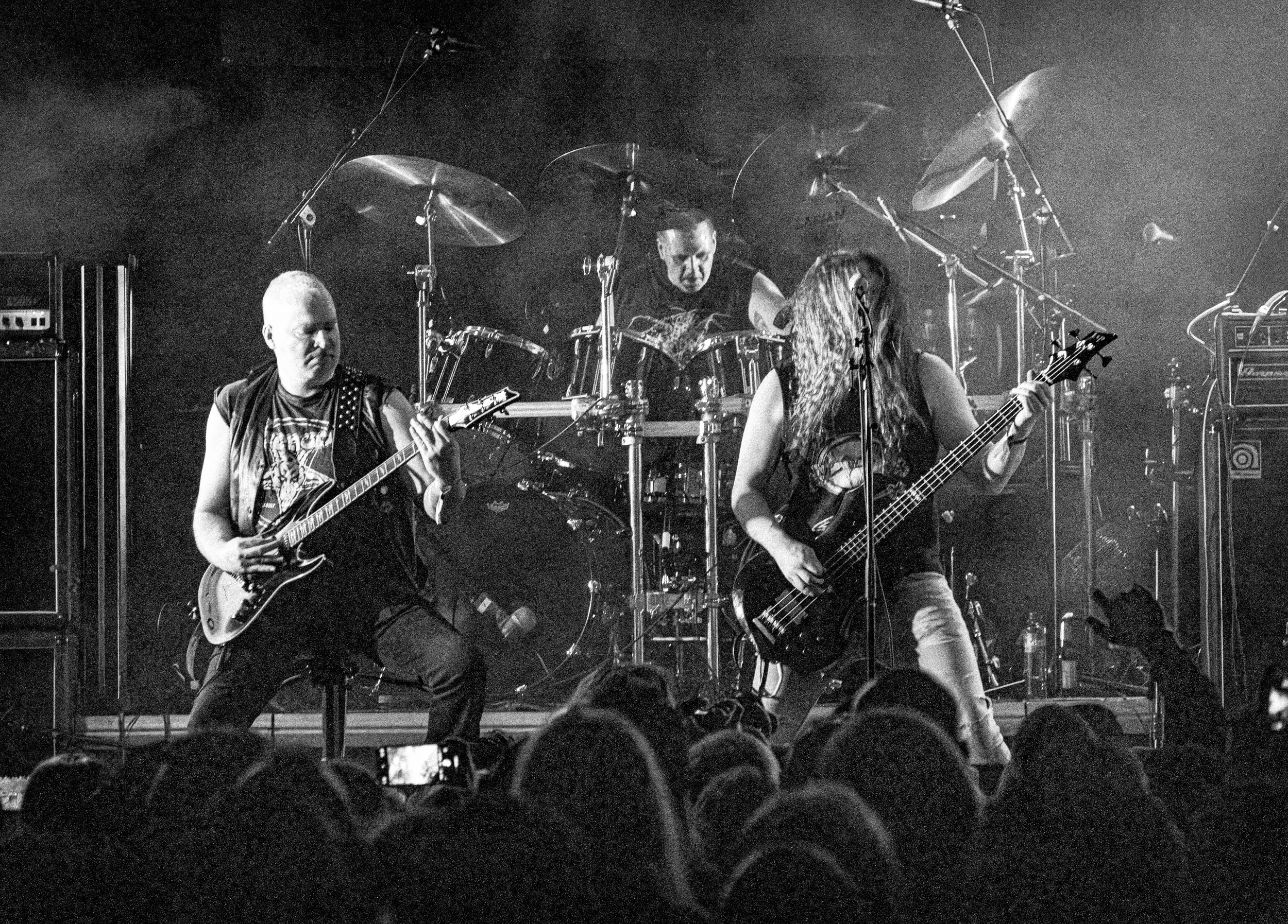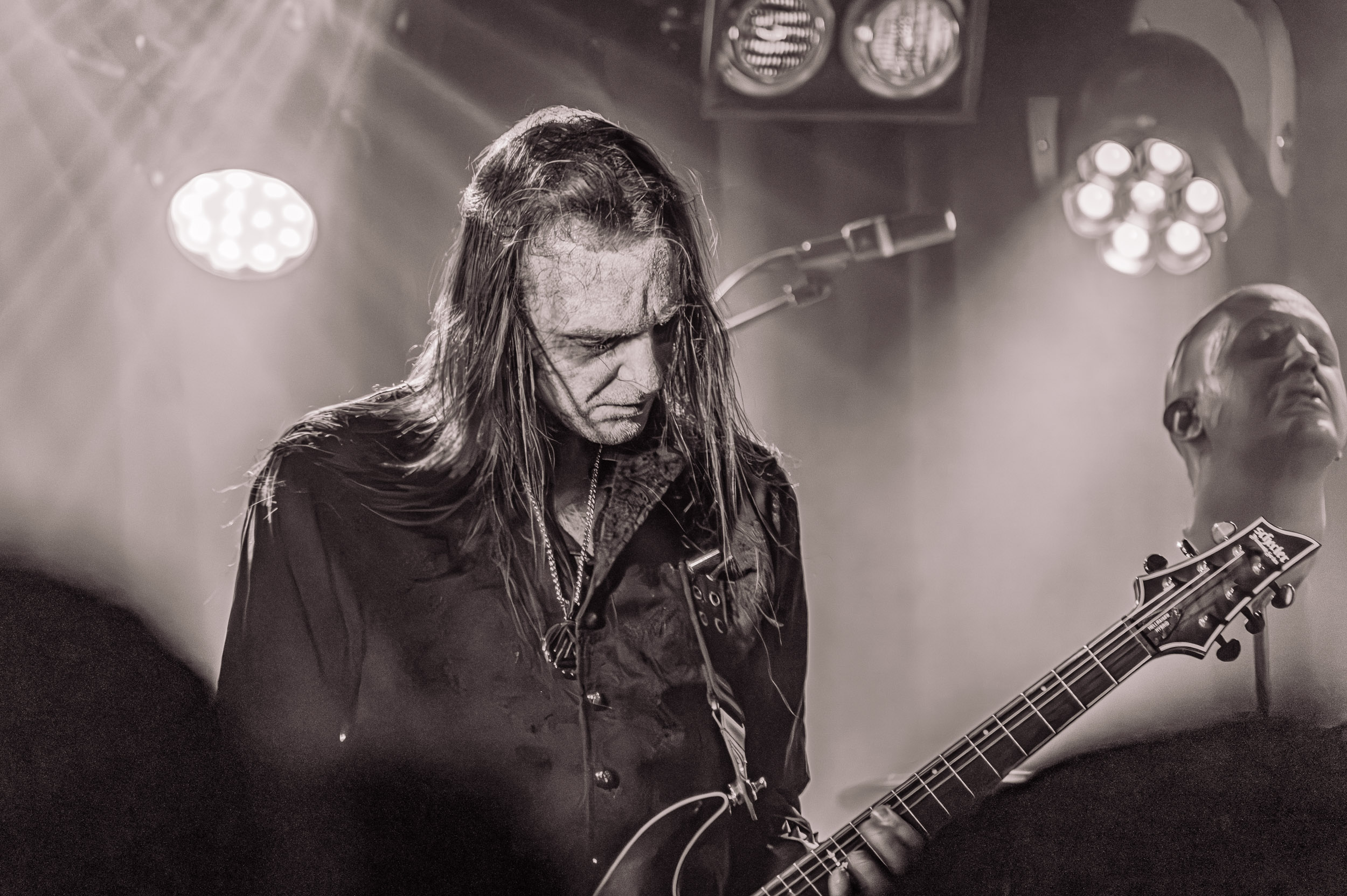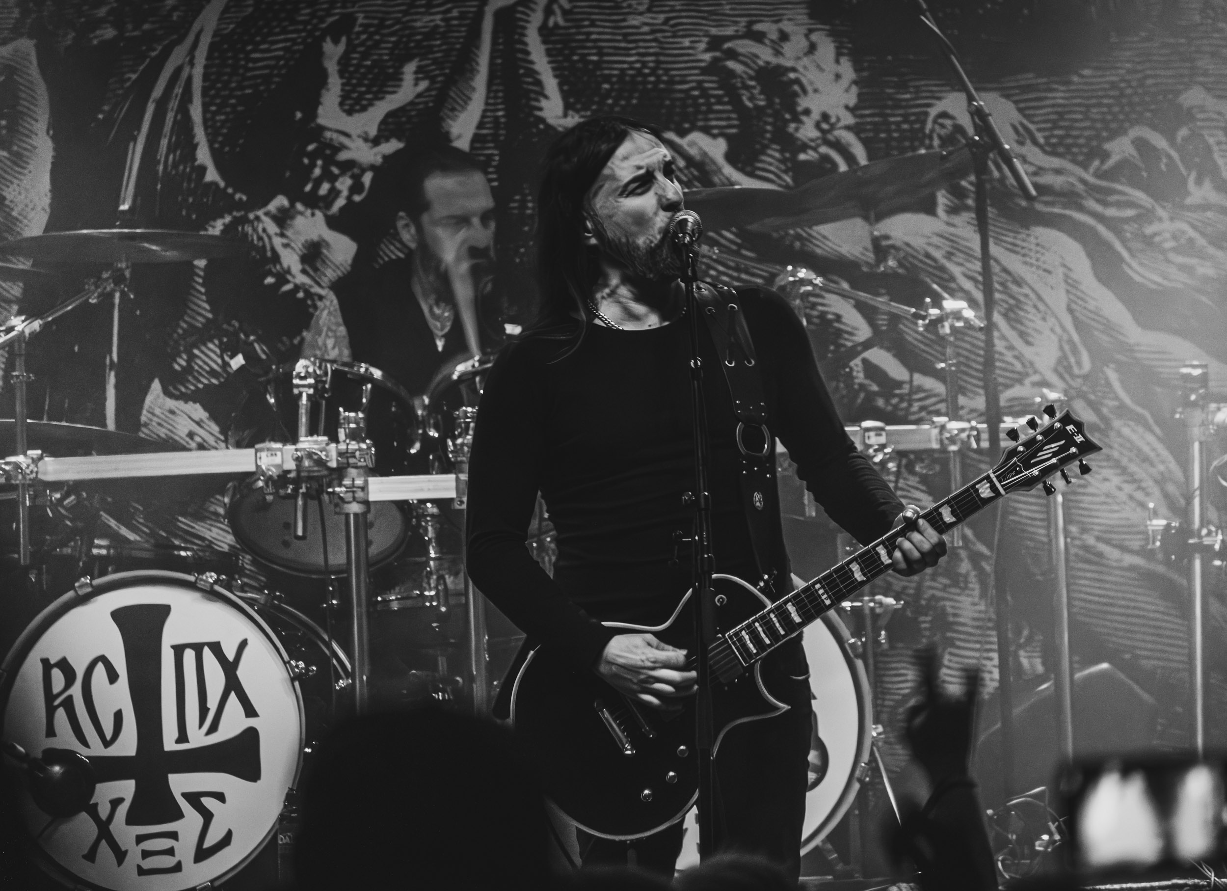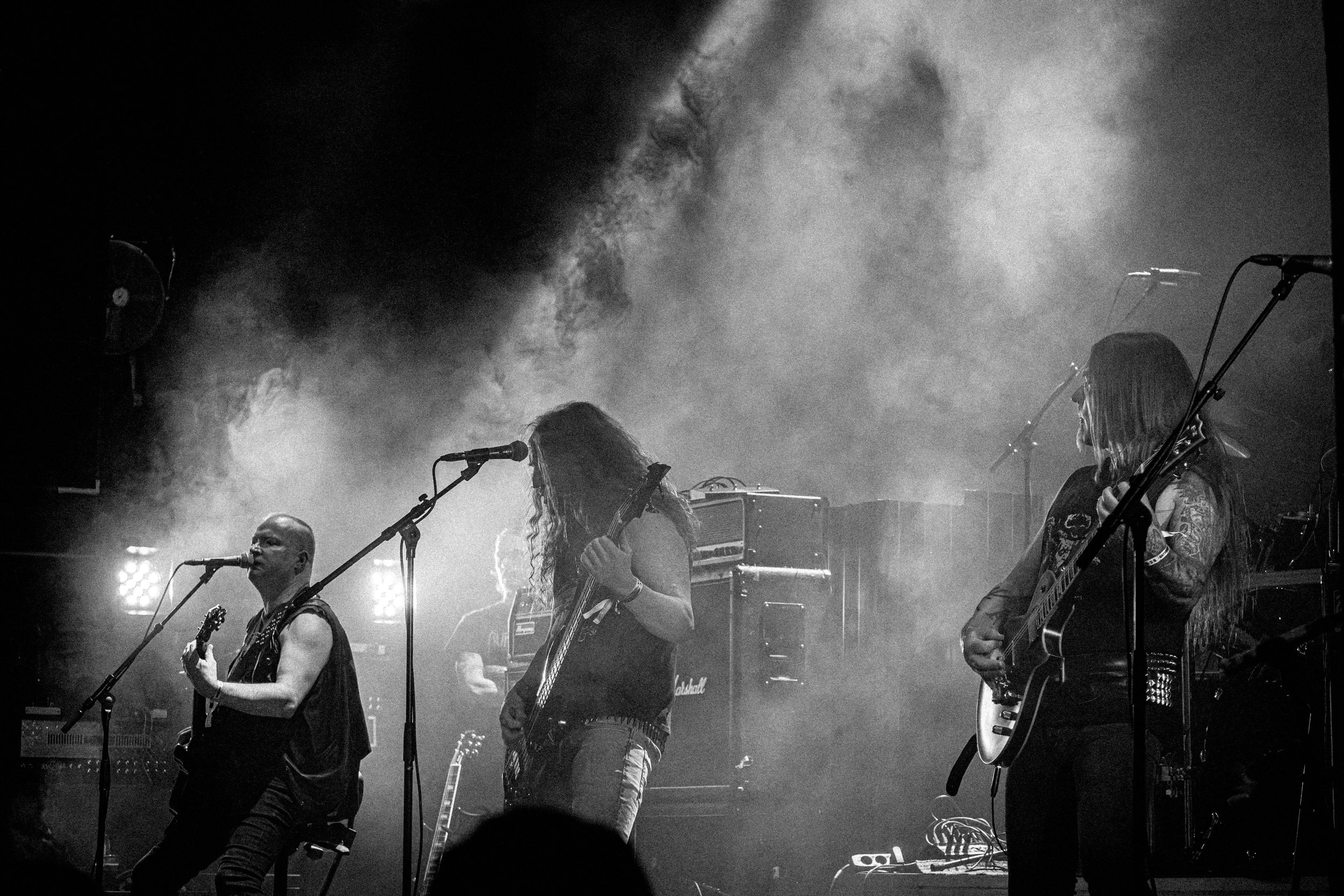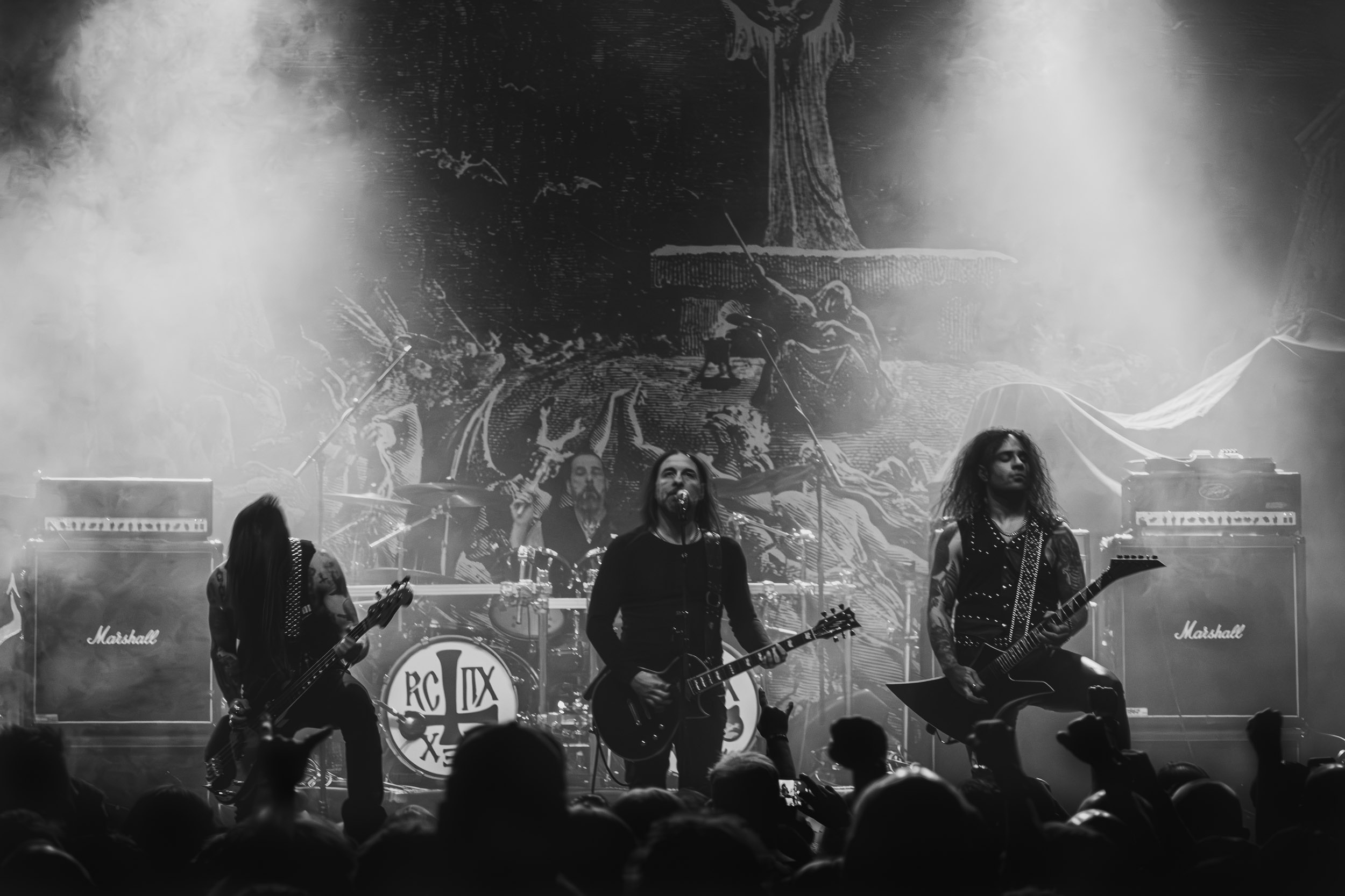 Satyricon : Deuxième représentant de la Unholy Trinity et non des moindres, c’est face à un public au taquet que Satyricon fait son entrée sur la scène Rockefeller. Now, Diabolical, classique parmi les classiques, accompagne mon passage dans le pit photo ; Our World, It Rumbles Tonight et Black Crow on a Tombstone, mon tour d’horizon des différents « spots photographiques » de la salle. Après cette entrée en matière, Satyr prend la parole pour raconter, en norvégien puis en anglais, ses souvenirs de jeunesse liés à cette salle, Rockefeller, où il a assisté à des concerts de Slayer et de Judas Priest, qu’il qualifie de « temple du heavy metal du pays ». Les termes ne pouvaient être mieux choisis, tant l’endroit est imprégné du genre et de son histoire… Le voyage dans le passé reprend par la suite, groupe et public côte à côte, dont la première étape nous mène en 2017 avec le morceau donnant son titre à l’album Deep Calleth Upon Deep. Les trois titres suivants nous font le plaisir d’un retour dans les années 90 et aux premiers albums du groupe ; d’abord à Dark Medieval Times (1993) avec Walk the Path of Sorrow, puis à Nemesis Divina (1996) et Shadowthrone (1994) avec deux titres dans la langue maternelle des musiciens. Ces derniers, comme les membres de Rotting Christ quelques heures plus tôt, apparaissent sobres dans leurs tenues noires et se donnent à fond dans leur performance. Satyr, de son côté, profite d’un intermède entre deux titres pour dégainer la veste à écussons — sa seule fantaisie vestimentaire — et la troisième guitare, qu’il garde toutes deux le temps de deux morceaux.