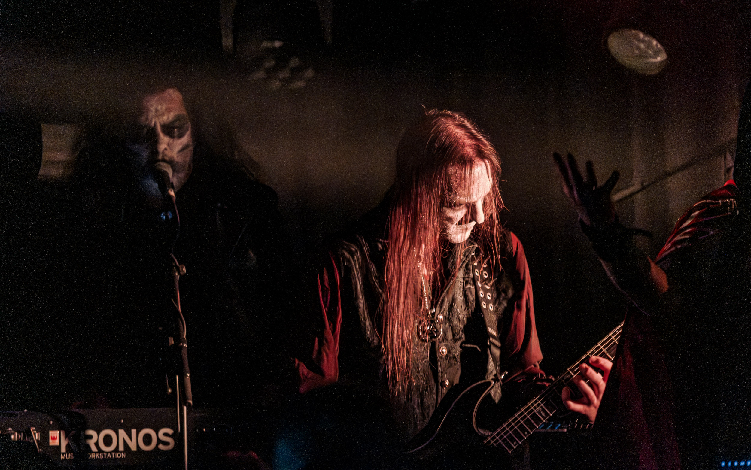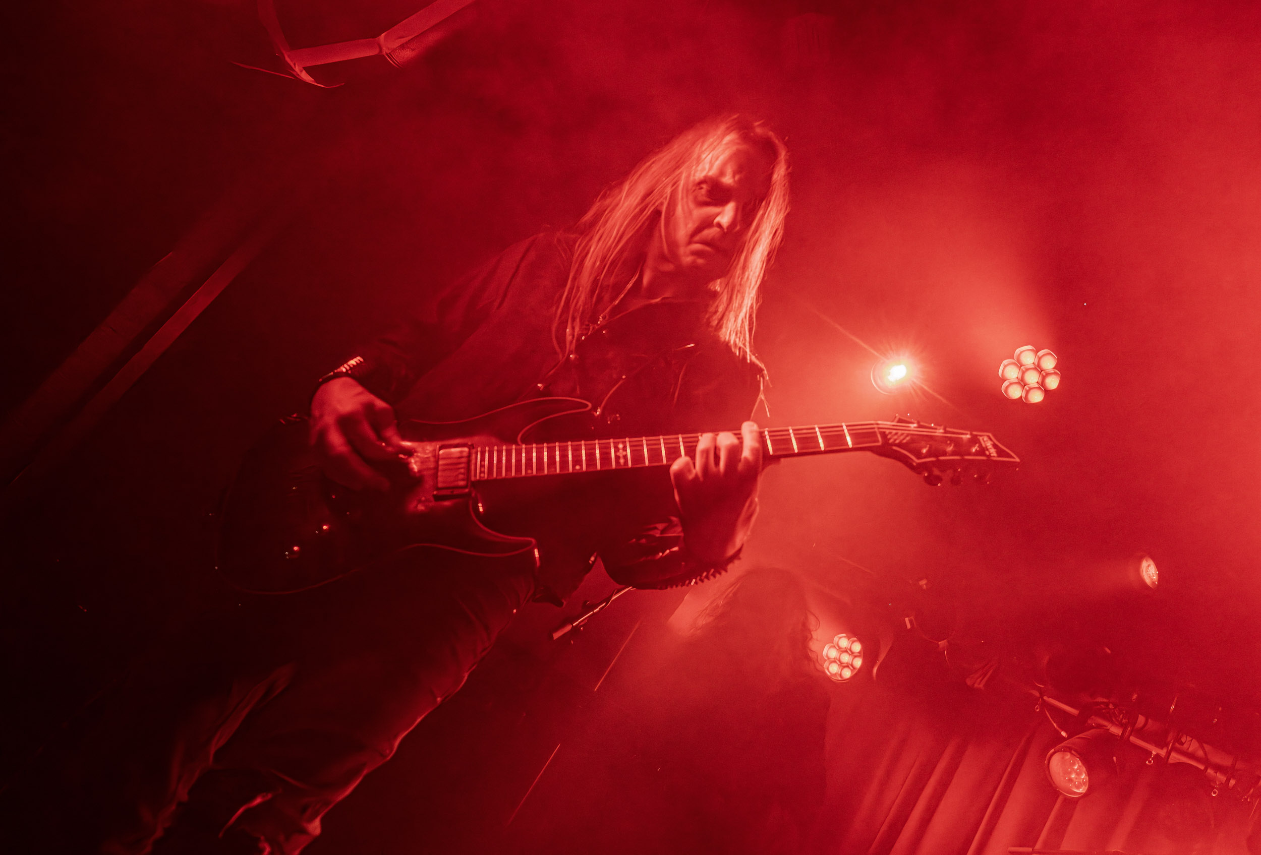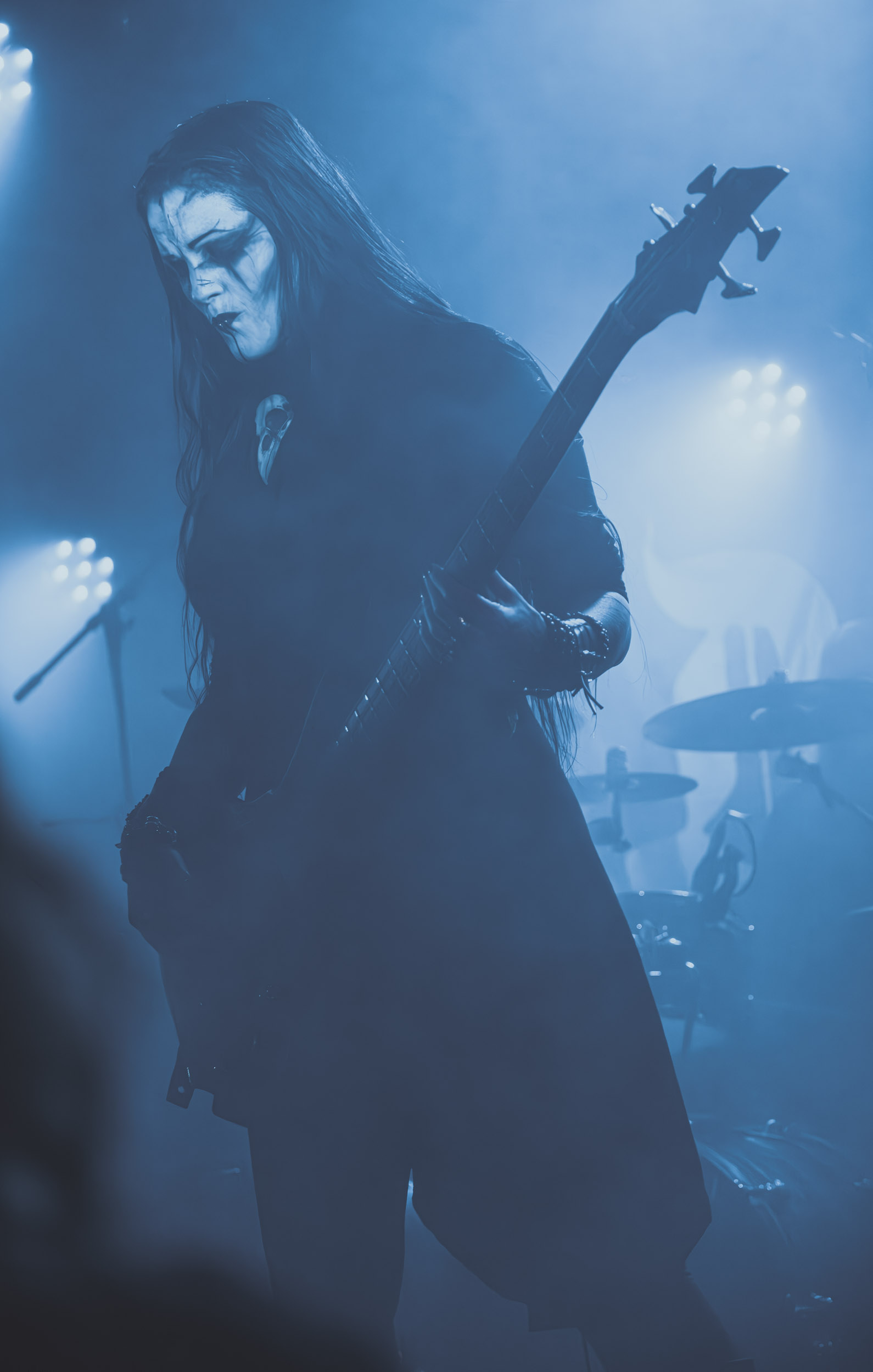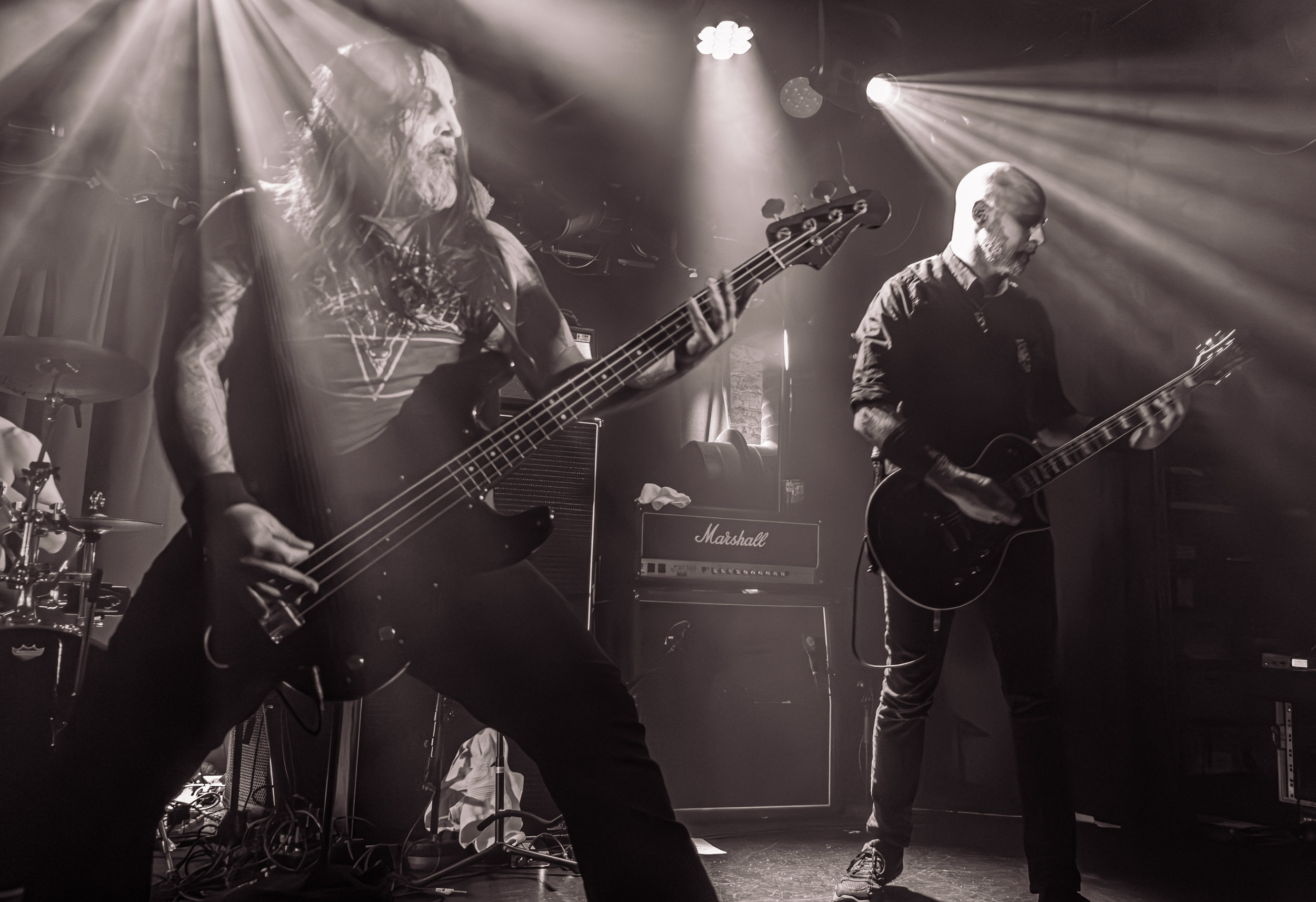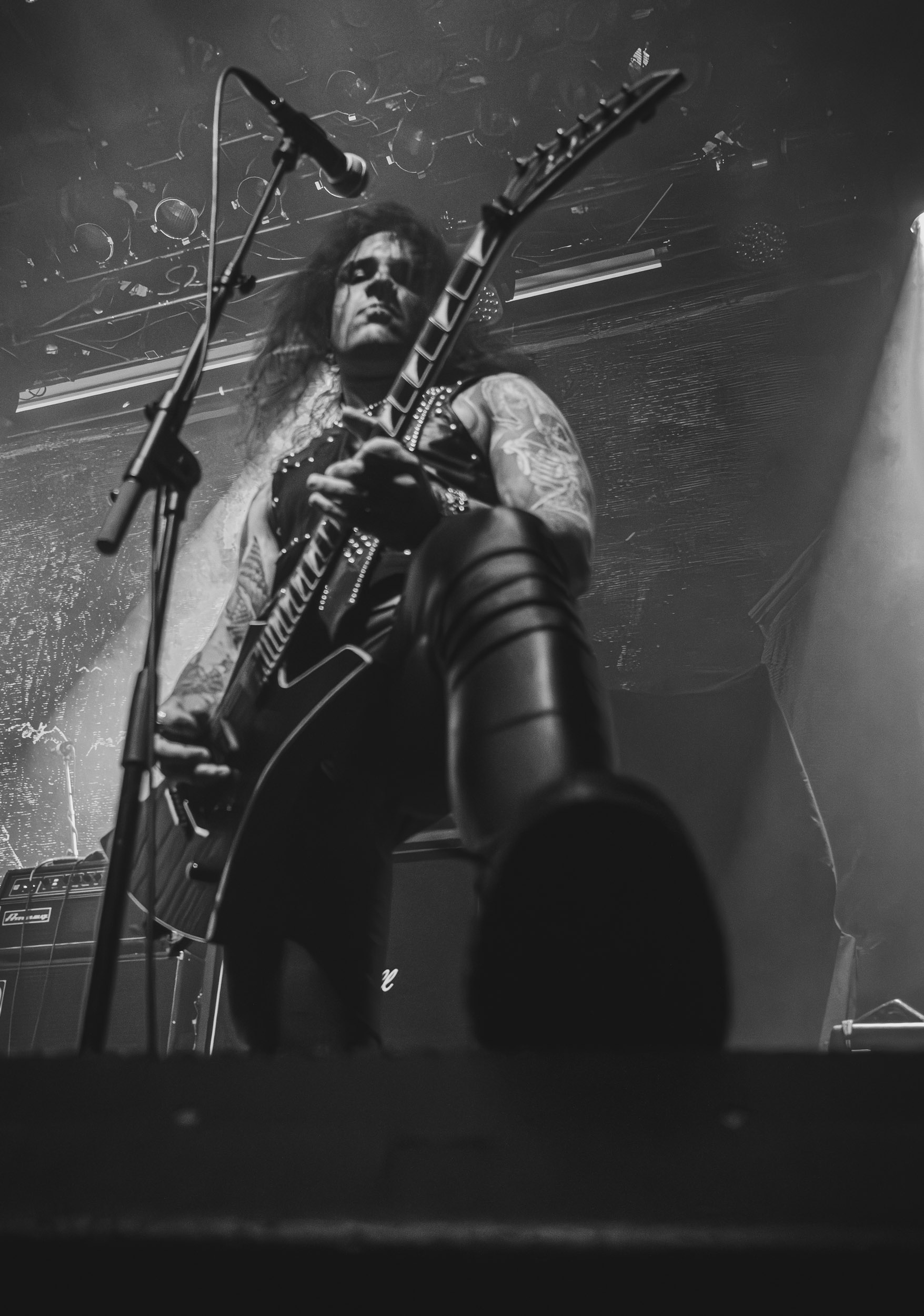 Satyricon : Deuxième représentant de la Unholy Trinity et non des moindres, c’est face à un public au taquet que Satyricon fait son entrée sur la scène Rockefeller. Now, Diabolical, classique parmi les classiques, accompagne mon passage dans le pit photo ; Our World, It Rumbles Tonight et Black Crow on a Tombstone, mon tour d’horizon des différents « spots photographiques » de la salle. Après cette entrée en matière, Satyr prend la parole pour raconter, en norvégien puis en anglais, ses souvenirs de jeunesse liés à cette salle, Rockefeller, où il a assisté à des concerts de Slayer et de Judas Priest, qu’il qualifie de « temple du heavy metal du pays ». Les termes ne pouvaient être mieux choisis, tant l’endroit est imprégné du genre et de son histoire… Le voyage dans le passé reprend par la suite, groupe et public côte à côte, dont la première étape nous mène en 2017 avec le morceau donnant son titre à l’album Deep Calleth Upon Deep. Les trois titres suivants nous font le plaisir d’un retour dans les années 90 et aux premiers albums du groupe ; d’abord à Dark Medieval Times (1993) avec Walk the Path of Sorrow, puis à Nemesis Divina (1996) et Shadowthrone (1994) avec deux titres dans la langue maternelle des musiciens. Ces derniers, comme les membres de Rotting Christ quelques heures plus tôt, apparaissent sobres dans leurs tenues noires et se donnent à fond dans leur performance. Satyr, de son côté, profite d’un intermède entre deux titres pour dégainer la veste à écussons — sa seule fantaisie vestimentaire — et la troisième guitare, qu’il garde toutes deux le temps de deux morceaux.