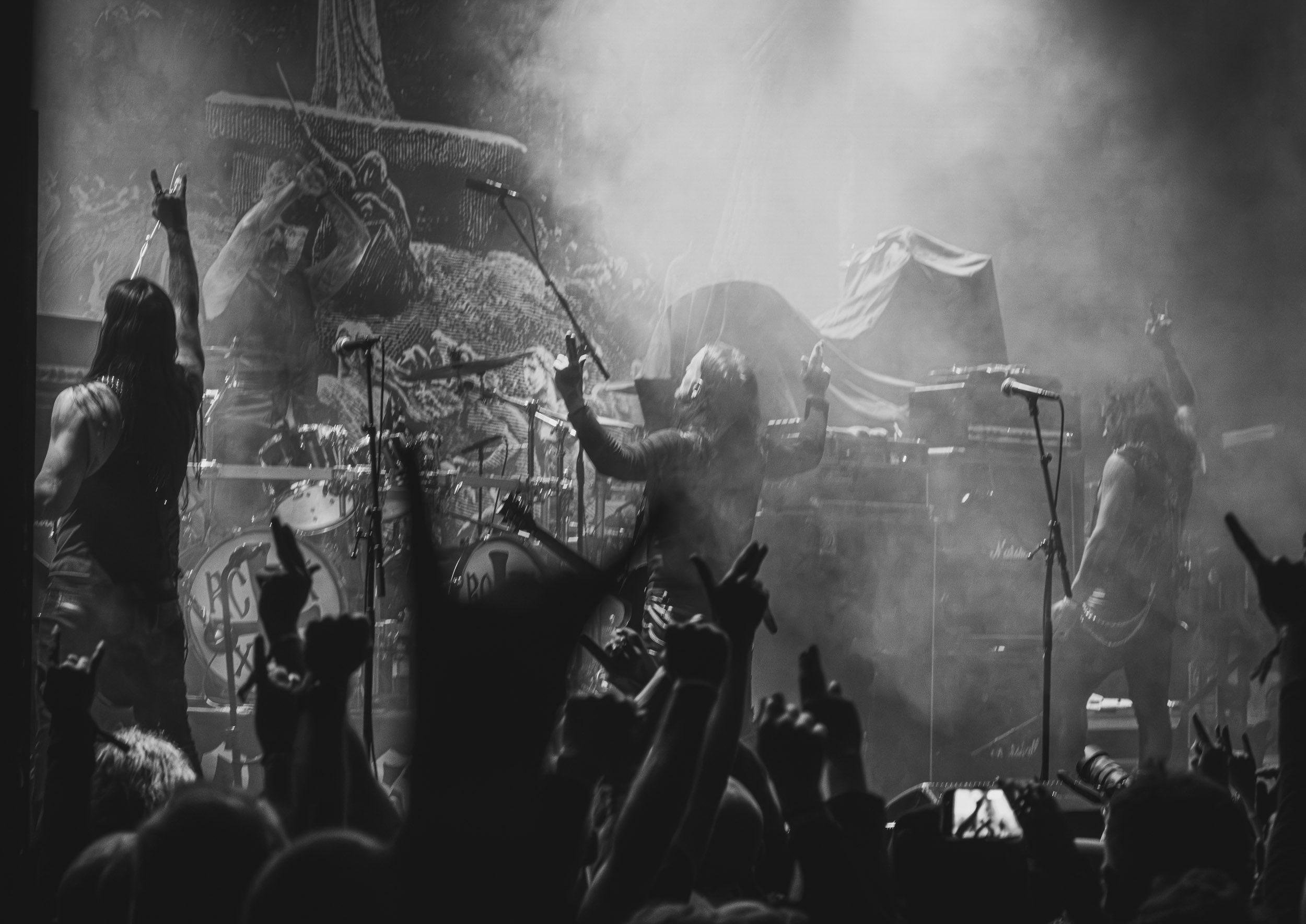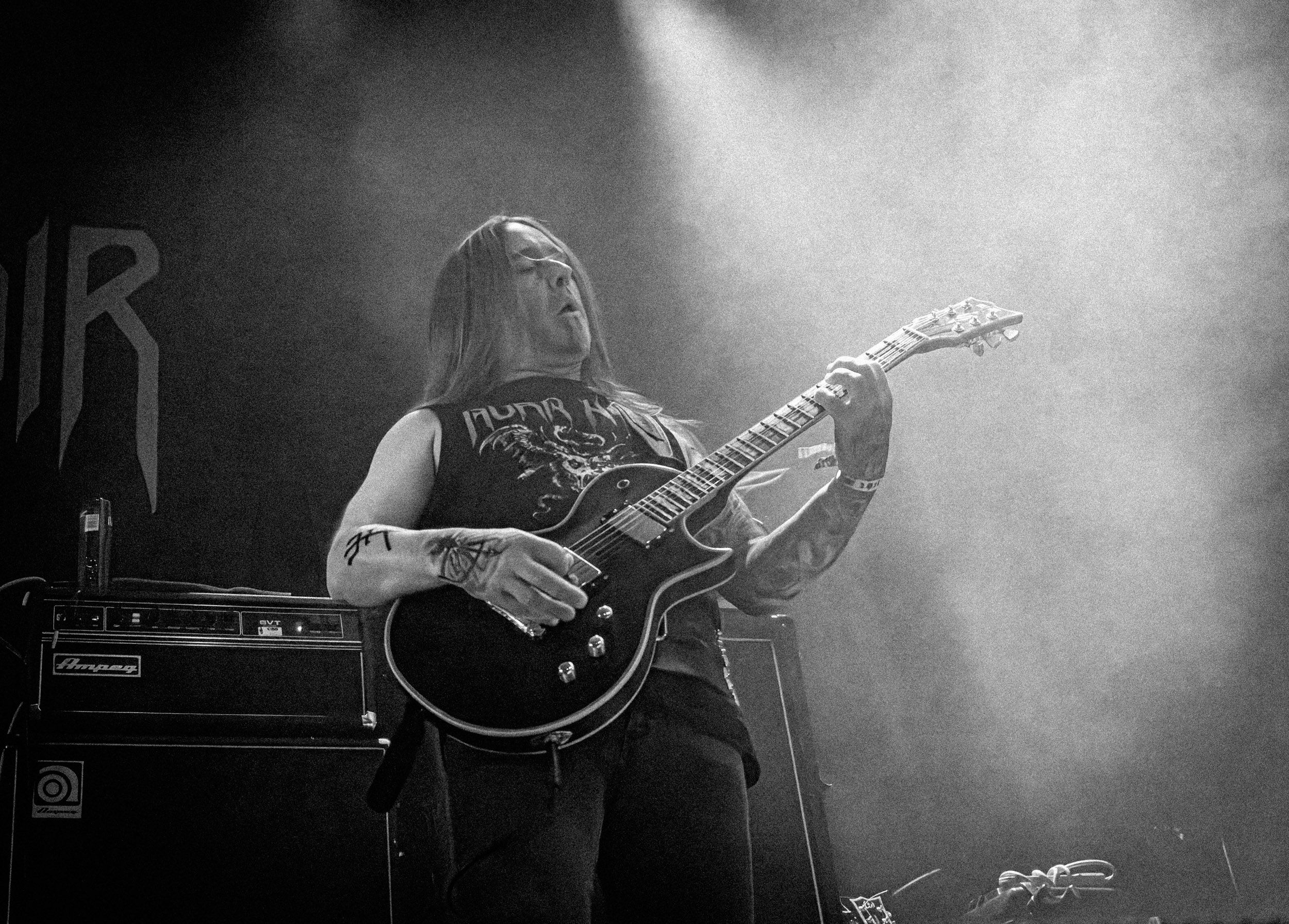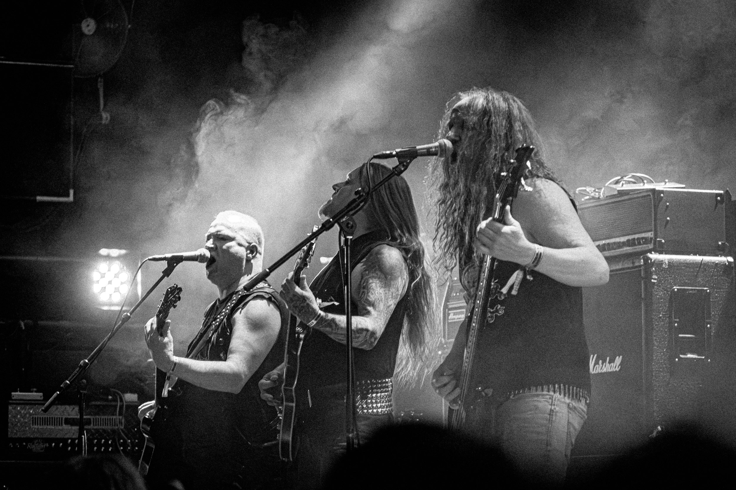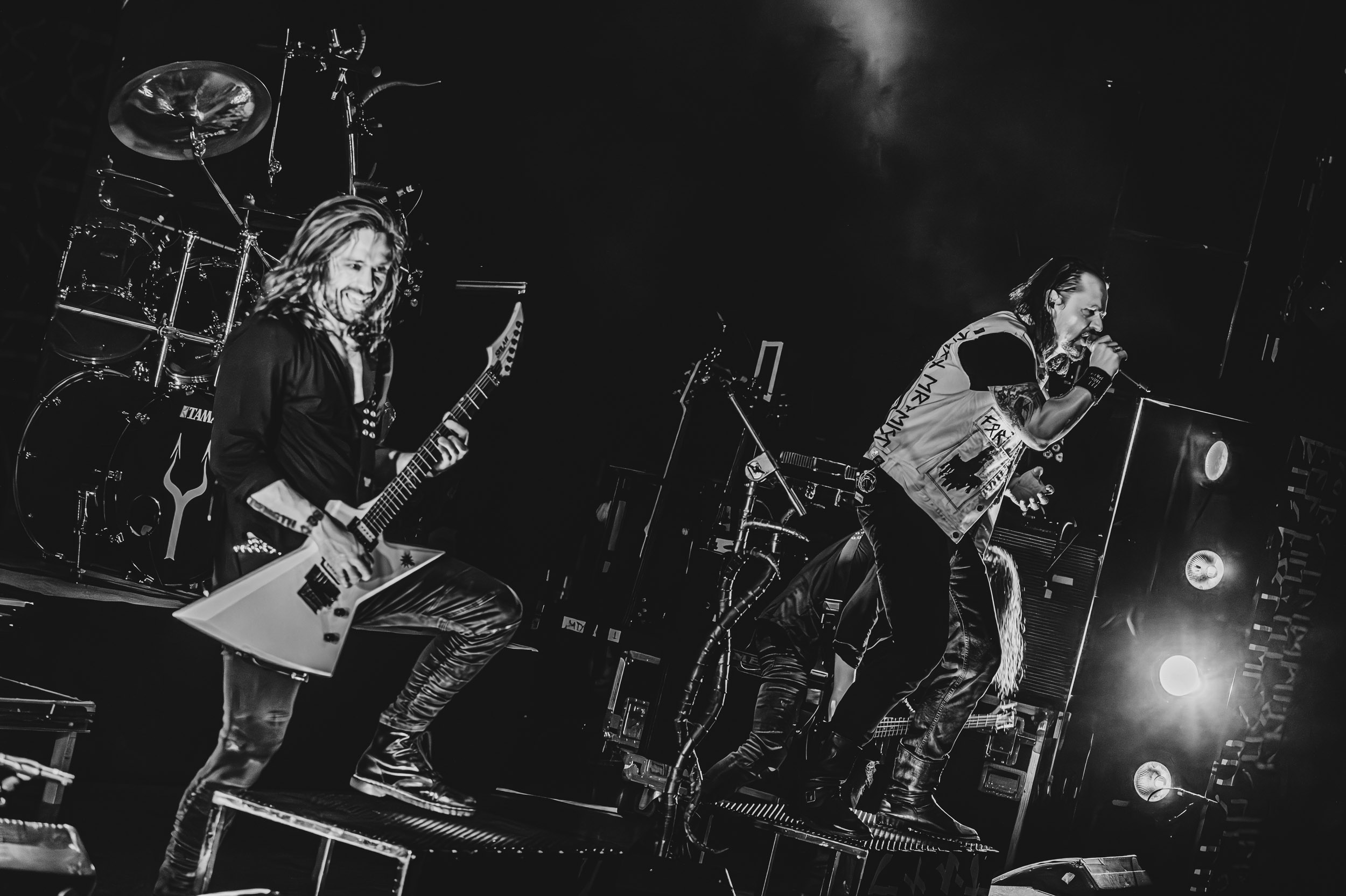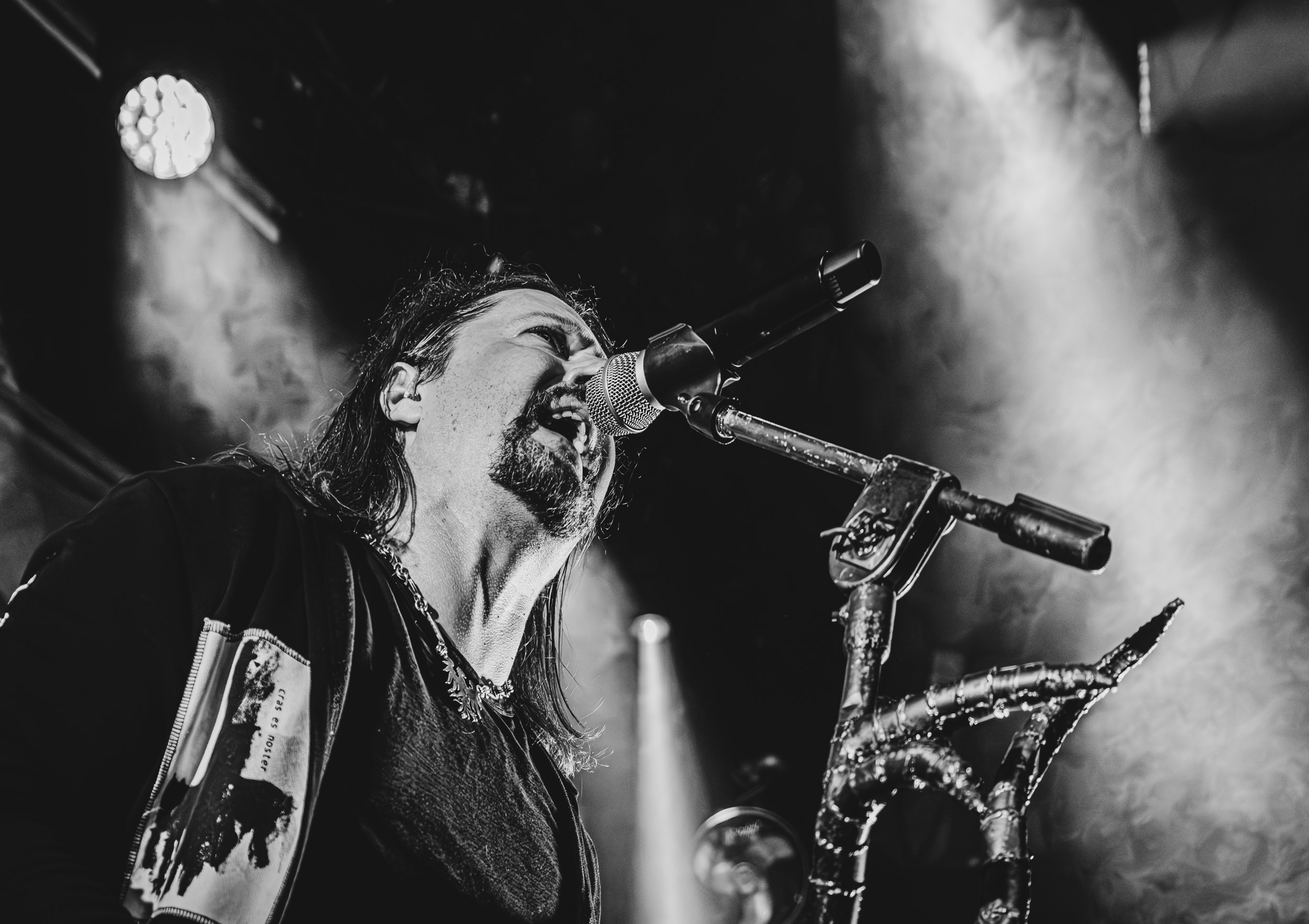 Satyricon : Deuxième représentant de la Unholy Trinity et non des moindres, c’est face à un public au taquet que Satyricon fait son entrée sur la scène Rockefeller. Now, Diabolical, classique parmi les classiques, accompagne mon passage dans le pit photo ; Our World, It Rumbles Tonight et Black Crow on a Tombstone, mon tour d’horizon des différents « spots photographiques » de la salle. Après cette entrée en matière, Satyr prend la parole pour raconter, en norvégien puis en anglais, ses souvenirs de jeunesse liés à cette salle, Rockefeller, où il a assisté à des concerts de Slayer et de Judas Priest, qu’il qualifie de « temple du heavy metal du pays ». Les termes ne pouvaient être mieux choisis, tant l’endroit est imprégné du genre et de son histoire… Le voyage dans le passé reprend par la suite, groupe et public côte à côte, dont la première étape nous mène en 2017 avec le morceau donnant son titre à l’album Deep Calleth Upon Deep. Les trois titres suivants nous font le plaisir d’un retour dans les années 90 et aux premiers albums du groupe ; d’abord à Dark Medieval Times (1993) avec Walk the Path of Sorrow, puis à Nemesis Divina (1996) et Shadowthrone (1994) avec deux titres dans la langue maternelle des musiciens. Ces derniers, comme les membres de Rotting Christ quelques heures plus tôt, apparaissent sobres dans leurs tenues noires et se donnent à fond dans leur performance. Satyr, de son côté, profite d’un intermède entre deux titres pour dégainer la veste à écussons — sa seule fantaisie vestimentaire — et la troisième guitare, qu’il garde toutes deux le temps de deux morceaux.