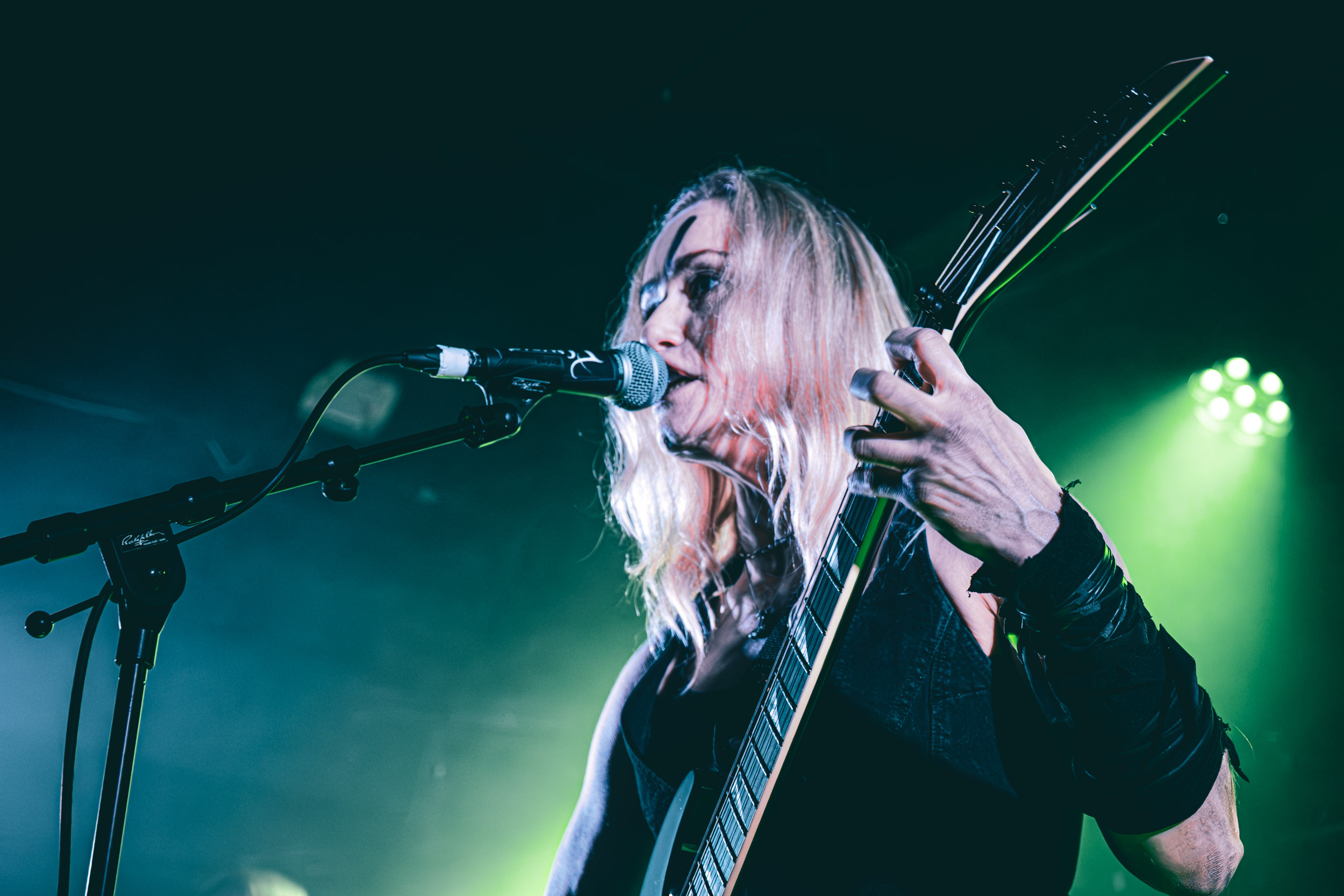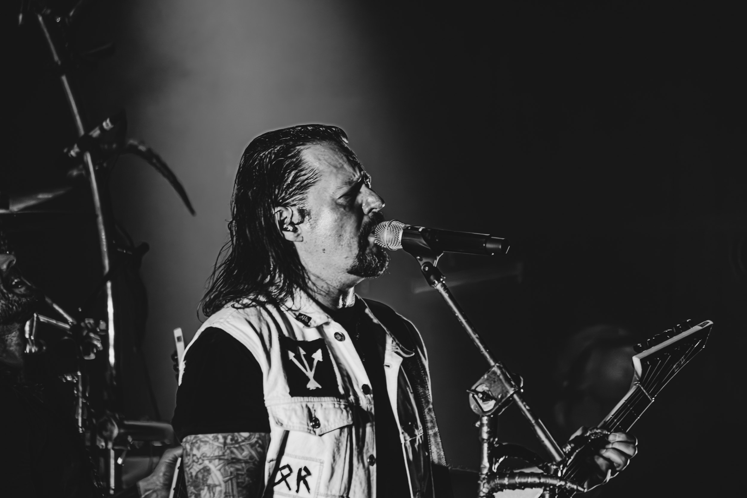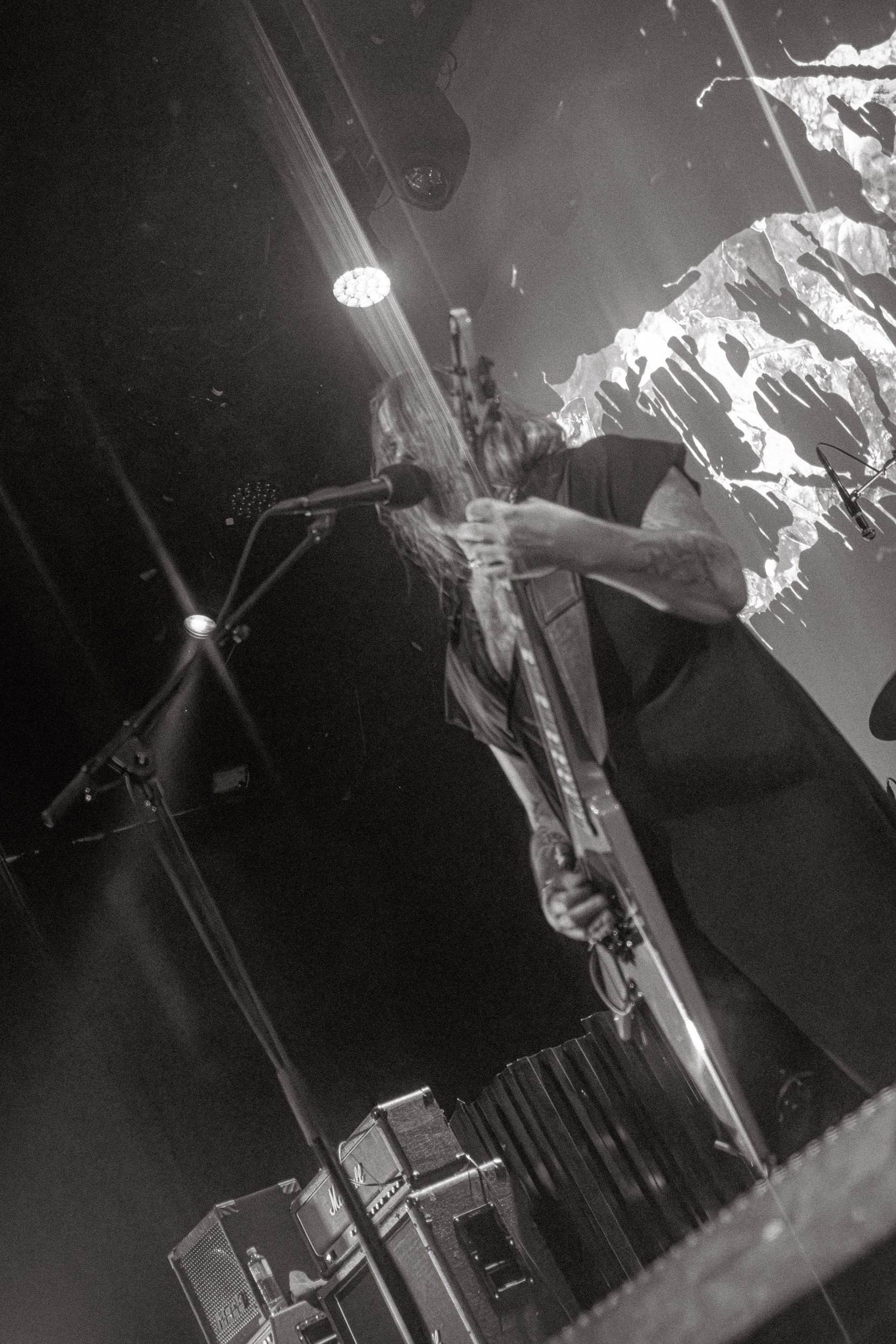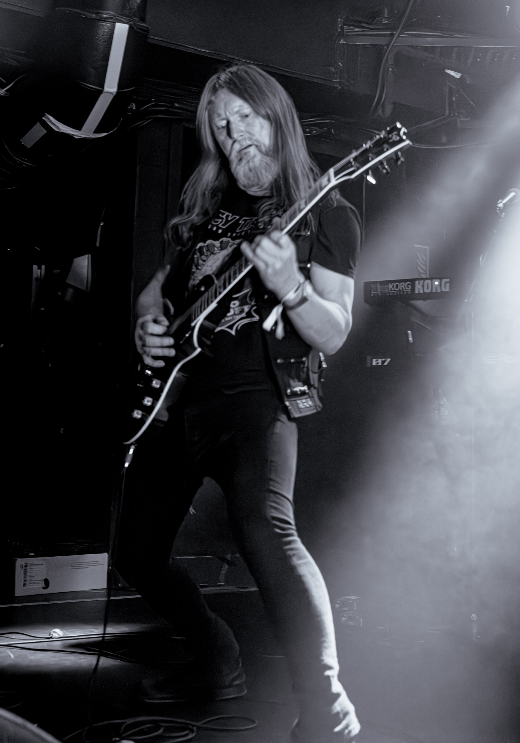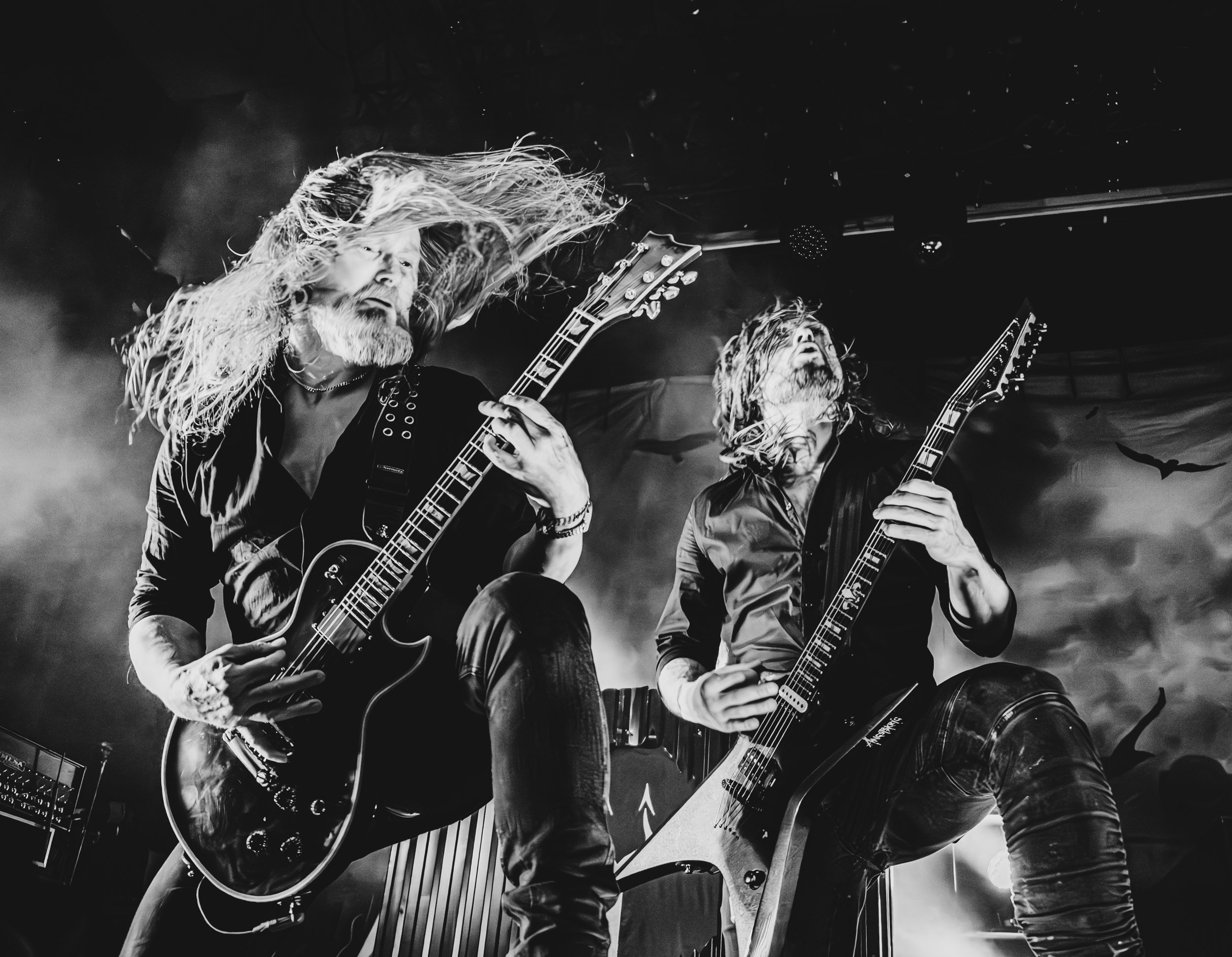 Satyricon : Deuxième représentant de la Unholy Trinity et non des moindres, c’est face à un public au taquet que Satyricon fait son entrée sur la scène Rockefeller. Now, Diabolical, classique parmi les classiques, accompagne mon passage dans le pit photo ; Our World, It Rumbles Tonight et Black Crow on a Tombstone, mon tour d’horizon des différents « spots photographiques » de la salle. Après cette entrée en matière, Satyr prend la parole pour raconter, en norvégien puis en anglais, ses souvenirs de jeunesse liés à cette salle, Rockefeller, où il a assisté à des concerts de Slayer et de Judas Priest, qu’il qualifie de « temple du heavy metal du pays ». Les termes ne pouvaient être mieux choisis, tant l’endroit est imprégné du genre et de son histoire… Le voyage dans le passé reprend par la suite, groupe et public côte à côte, dont la première étape nous mène en 2017 avec le morceau donnant son titre à l’album Deep Calleth Upon Deep. Les trois titres suivants nous font le plaisir d’un retour dans les années 90 et aux premiers albums du groupe ; d’abord à Dark Medieval Times (1993) avec Walk the Path of Sorrow, puis à Nemesis Divina (1996) et Shadowthrone (1994) avec deux titres dans la langue maternelle des musiciens. Ces derniers, comme les membres de Rotting Christ quelques heures plus tôt, apparaissent sobres dans leurs tenues noires et se donnent à fond dans leur performance. Satyr, de son côté, profite d’un intermède entre deux titres pour dégainer la veste à écussons — sa seule fantaisie vestimentaire — et la troisième guitare, qu’il garde toutes deux le temps de deux morceaux.