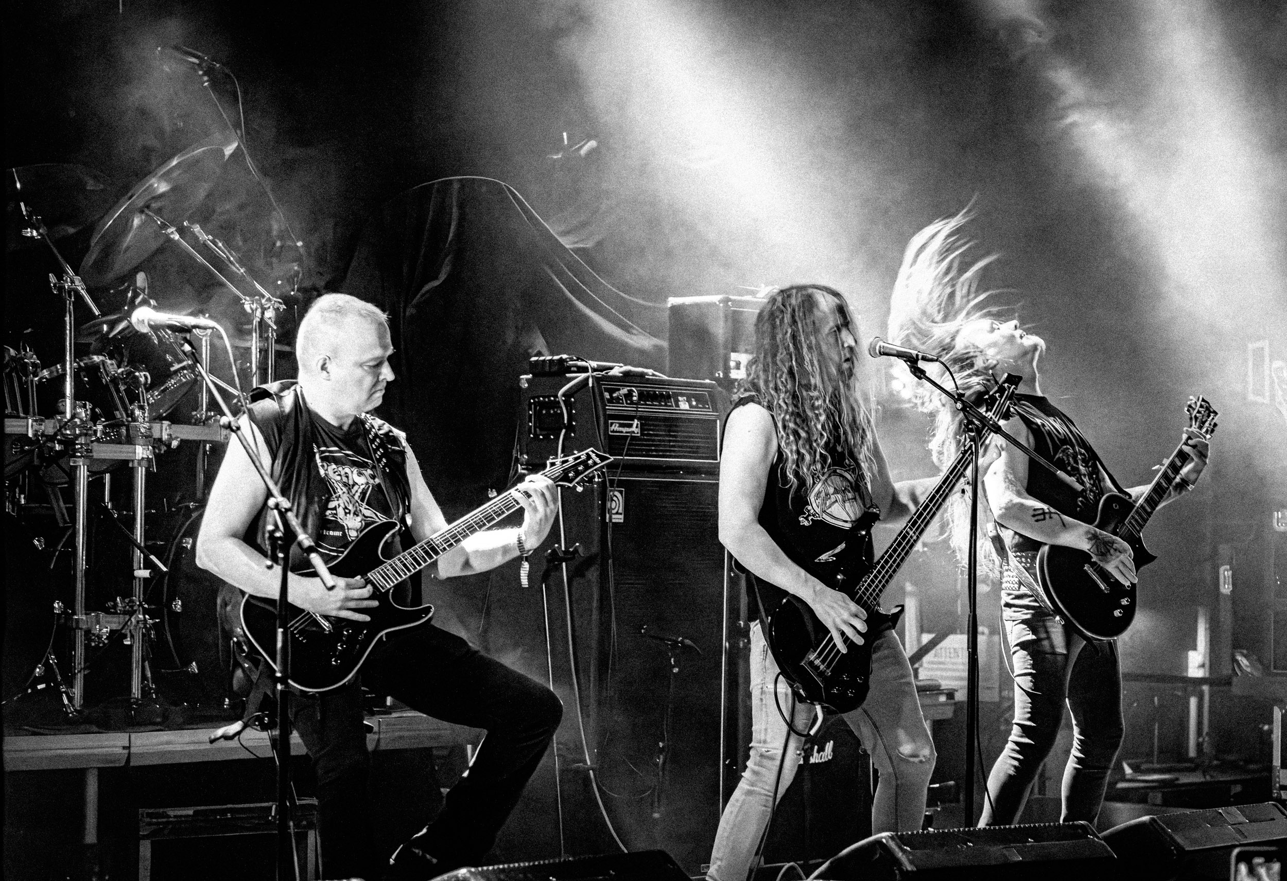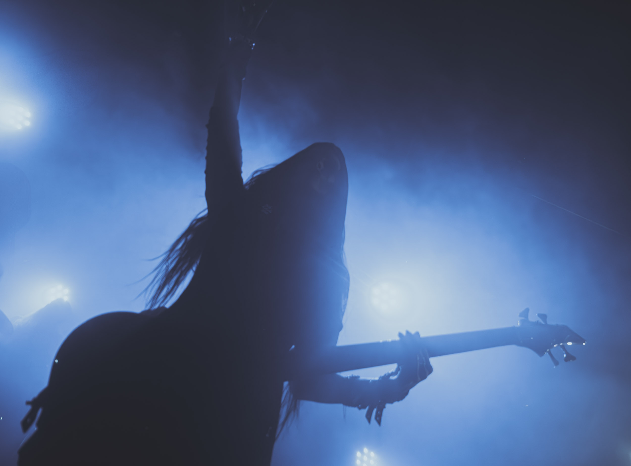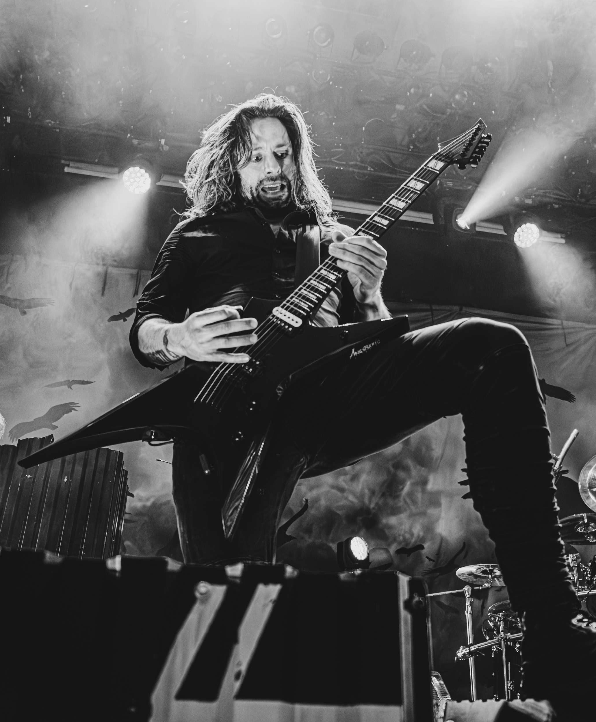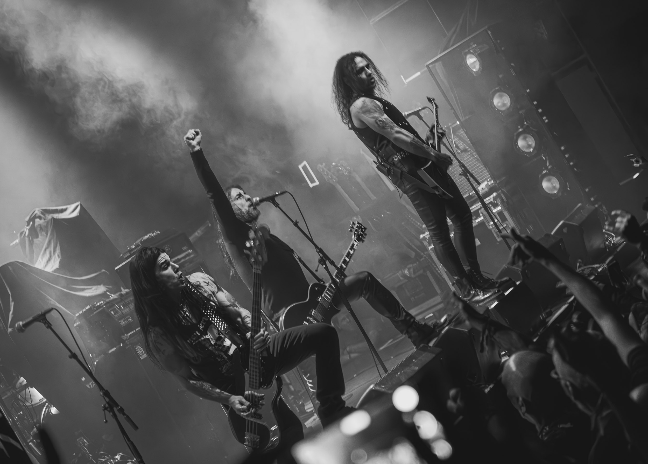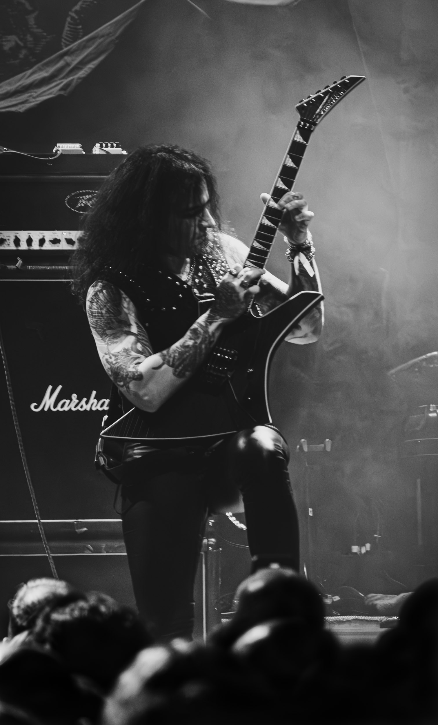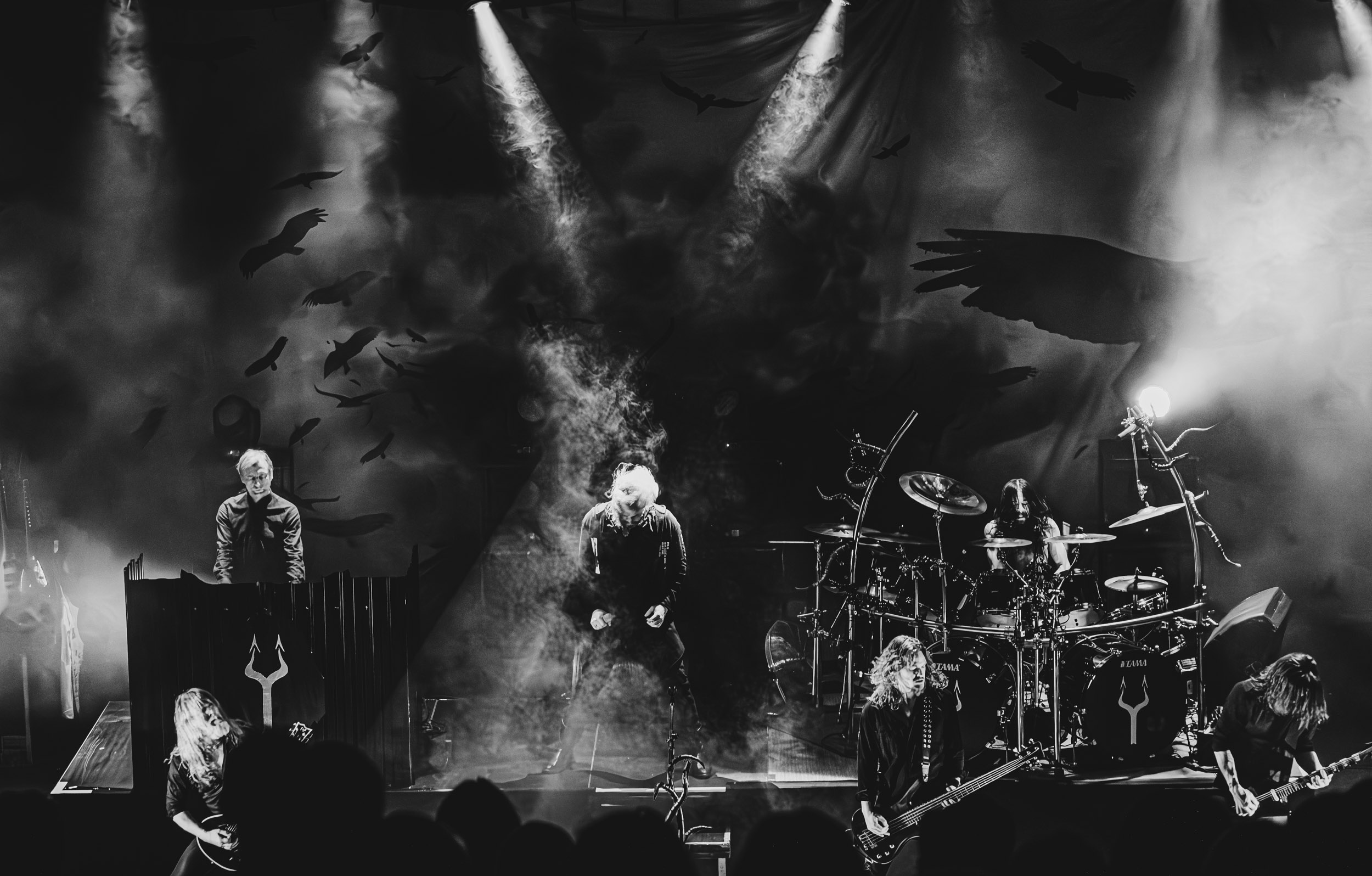 Satyricon : Deuxième représentant de la Unholy Trinity et non des moindres, c’est face à un public au taquet que Satyricon fait son entrée sur la scène Rockefeller. Now, Diabolical, classique parmi les classiques, accompagne mon passage dans le pit photo ; Our World, It Rumbles Tonight et Black Crow on a Tombstone, mon tour d’horizon des différents « spots photographiques » de la salle. Après cette entrée en matière, Satyr prend la parole pour raconter, en norvégien puis en anglais, ses souvenirs de jeunesse liés à cette salle, Rockefeller, où il a assisté à des concerts de Slayer et de Judas Priest, qu’il qualifie de « temple du heavy metal du pays ». Les termes ne pouvaient être mieux choisis, tant l’endroit est imprégné du genre et de son histoire… Le voyage dans le passé reprend par la suite, groupe et public côte à côte, dont la première étape nous mène en 2017 avec le morceau donnant son titre à l’album Deep Calleth Upon Deep. Les trois titres suivants nous font le plaisir d’un retour dans les années 90 et aux premiers albums du groupe ; d’abord à Dark Medieval Times (1993) avec Walk the Path of Sorrow, puis à Nemesis Divina (1996) et Shadowthrone (1994) avec deux titres dans la langue maternelle des musiciens. Ces derniers, comme les membres de Rotting Christ quelques heures plus tôt, apparaissent sobres dans leurs tenues noires et se donnent à fond dans leur performance. Satyr, de son côté, profite d’un intermède entre deux titres pour dégainer la veste à écussons — sa seule fantaisie vestimentaire — et la troisième guitare, qu’il garde toutes deux le temps de deux morceaux.