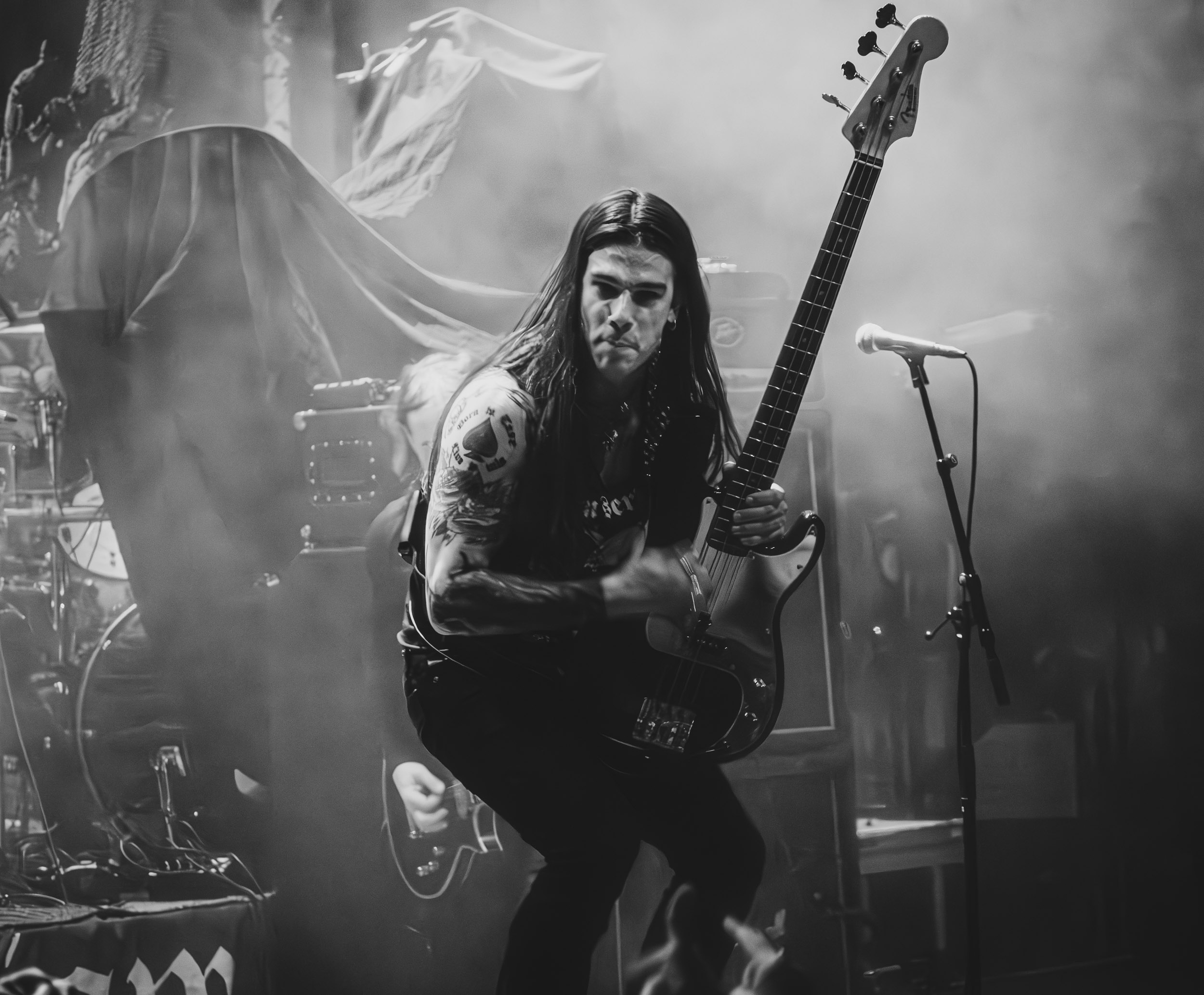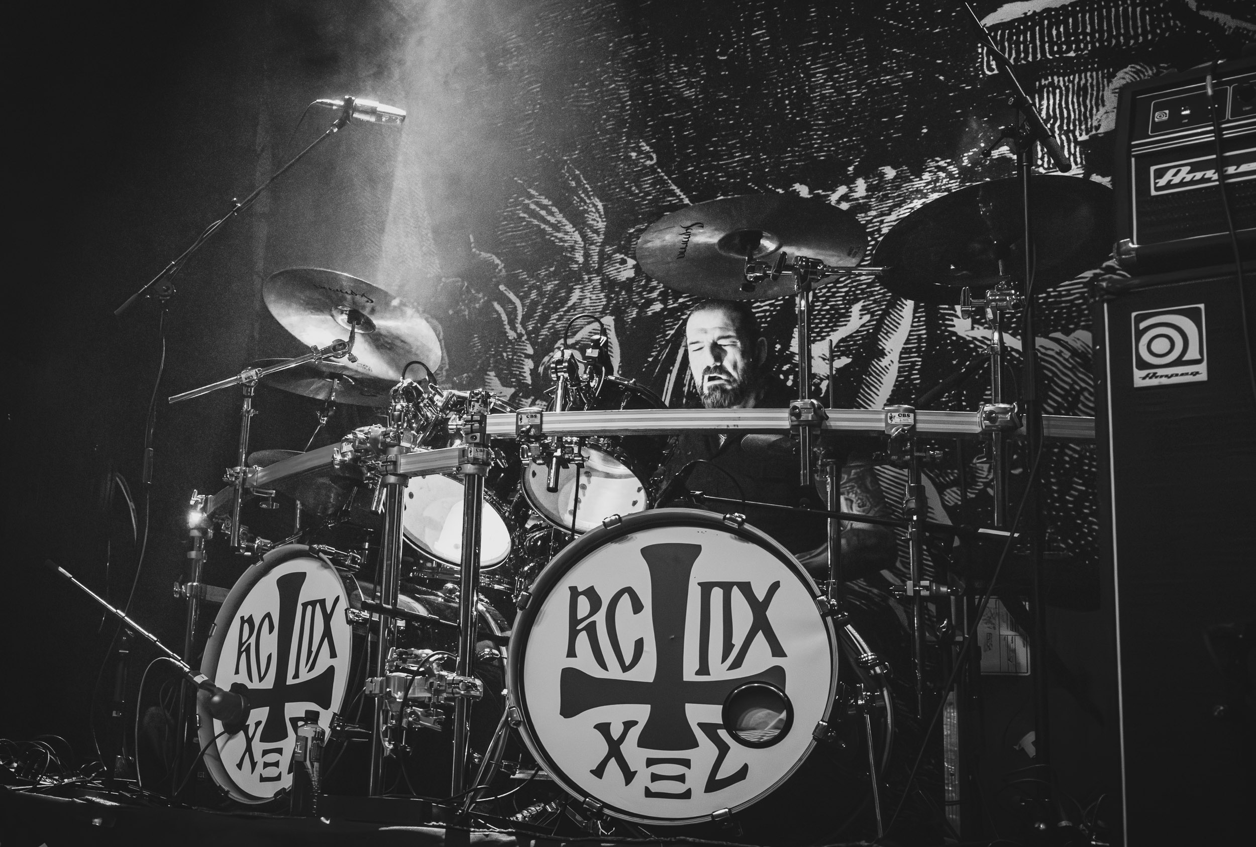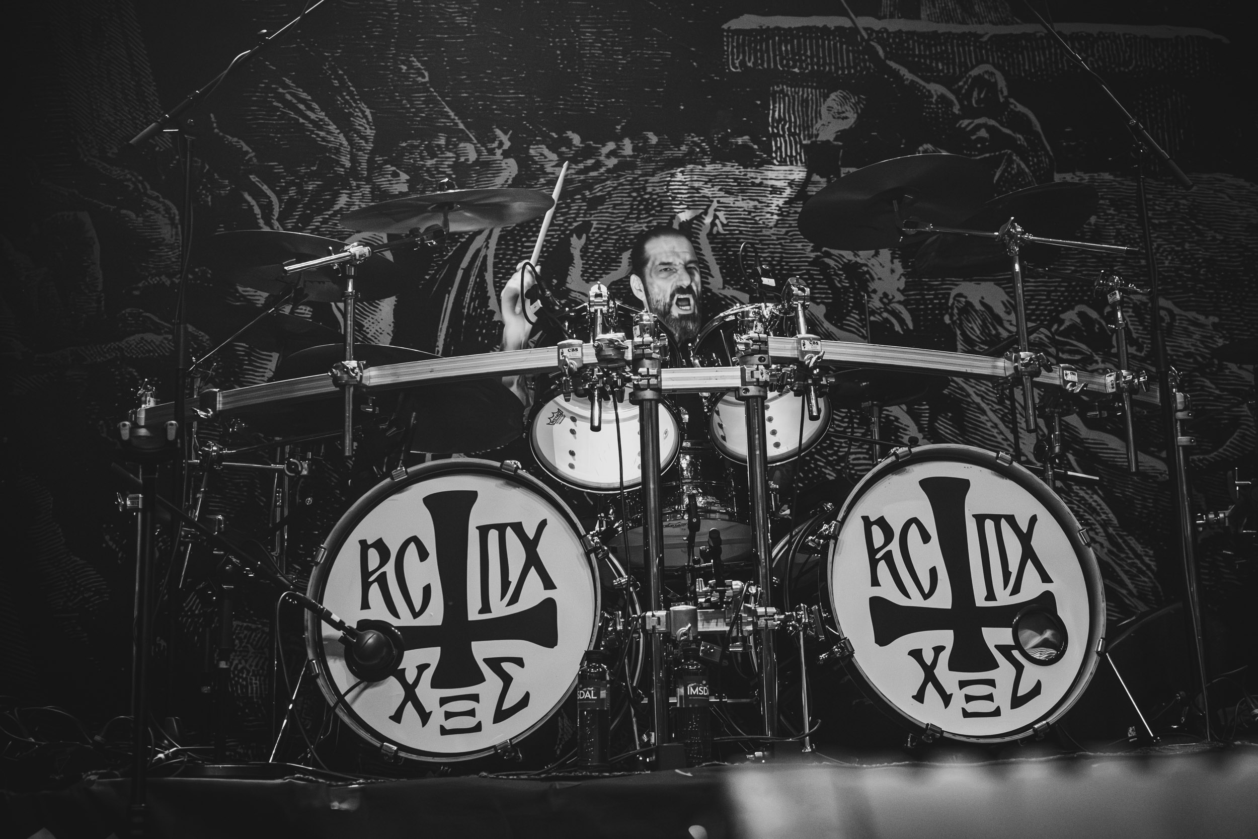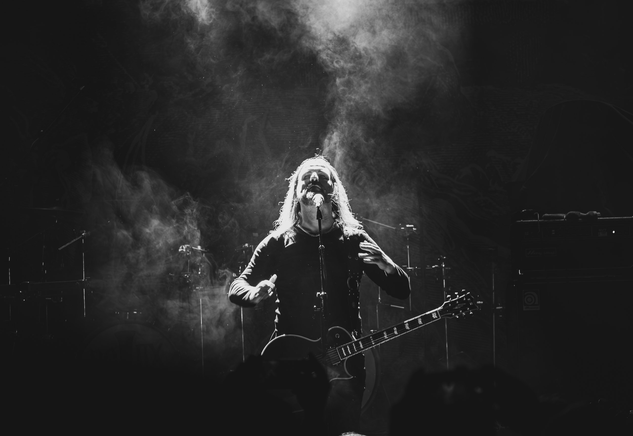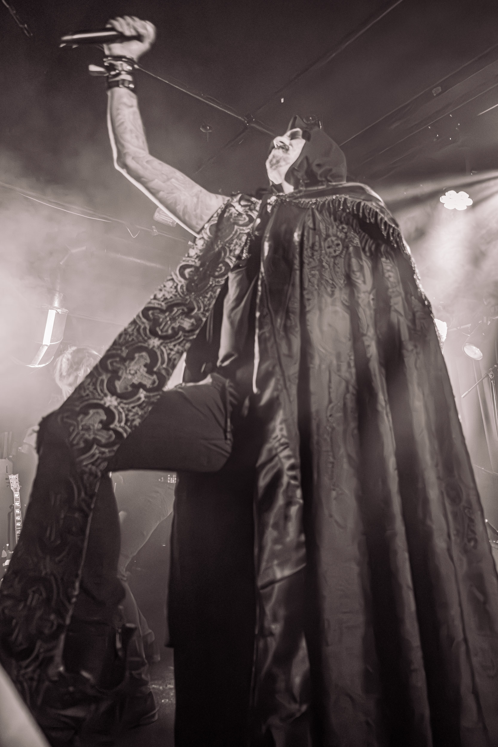 Satyricon : Deuxième représentant de la Unholy Trinity et non des moindres, c’est face à un public au taquet que Satyricon fait son entrée sur la scène Rockefeller. Now, Diabolical, classique parmi les classiques, accompagne mon passage dans le pit photo ; Our World, It Rumbles Tonight et Black Crow on a Tombstone, mon tour d’horizon des différents « spots photographiques » de la salle. Après cette entrée en matière, Satyr prend la parole pour raconter, en norvégien puis en anglais, ses souvenirs de jeunesse liés à cette salle, Rockefeller, où il a assisté à des concerts de Slayer et de Judas Priest, qu’il qualifie de « temple du heavy metal du pays ». Les termes ne pouvaient être mieux choisis, tant l’endroit est imprégné du genre et de son histoire… Le voyage dans le passé reprend par la suite, groupe et public côte à côte, dont la première étape nous mène en 2017 avec le morceau donnant son titre à l’album Deep Calleth Upon Deep. Les trois titres suivants nous font le plaisir d’un retour dans les années 90 et aux premiers albums du groupe ; d’abord à Dark Medieval Times (1993) avec Walk the Path of Sorrow, puis à Nemesis Divina (1996) et Shadowthrone (1994) avec deux titres dans la langue maternelle des musiciens. Ces derniers, comme les membres de Rotting Christ quelques heures plus tôt, apparaissent sobres dans leurs tenues noires et se donnent à fond dans leur performance. Satyr, de son côté, profite d’un intermède entre deux titres pour dégainer la veste à écussons — sa seule fantaisie vestimentaire — et la troisième guitare, qu’il garde toutes deux le temps de deux morceaux.