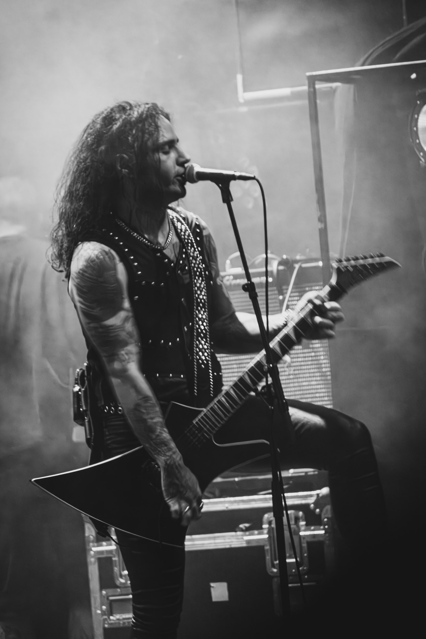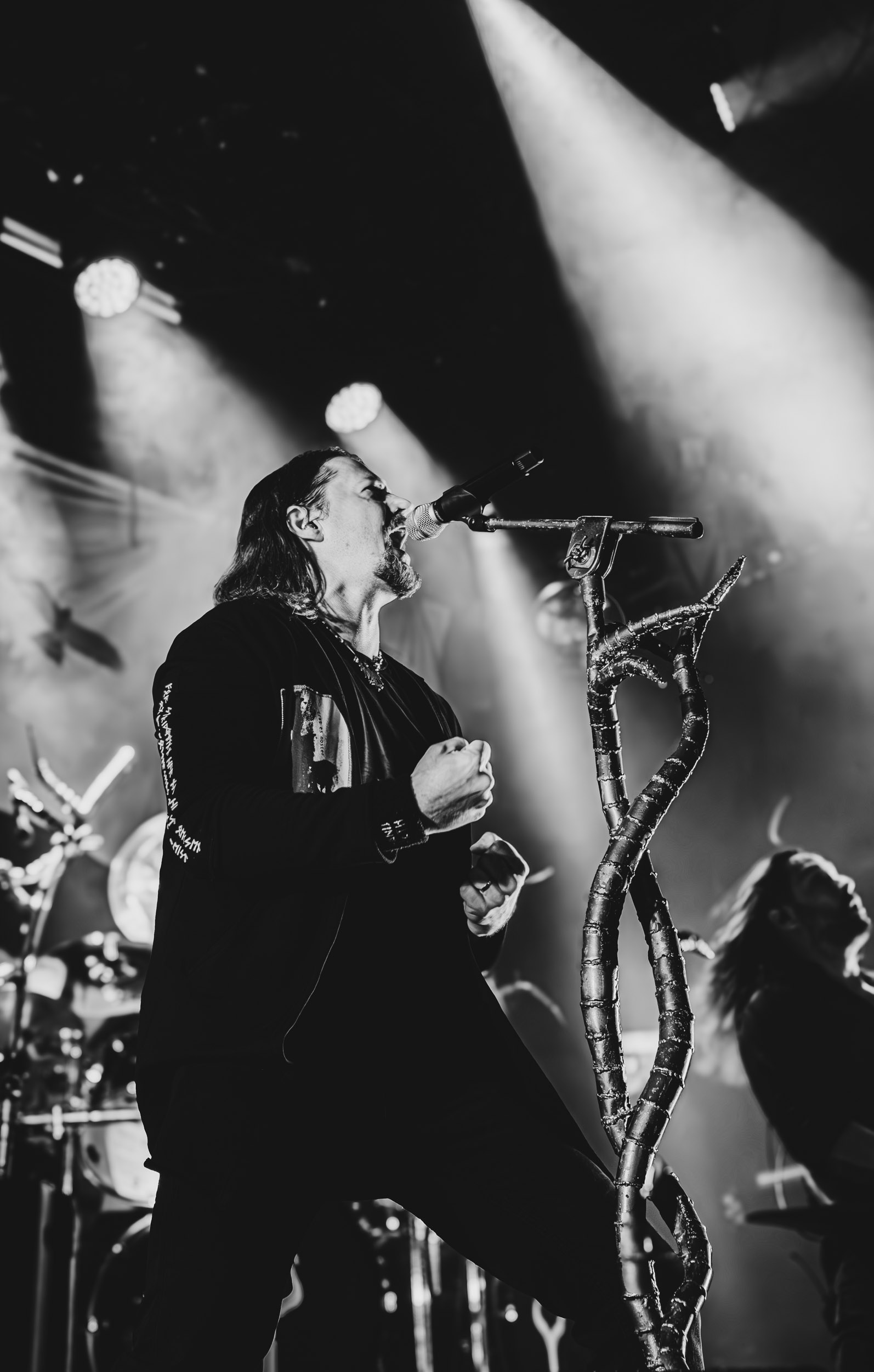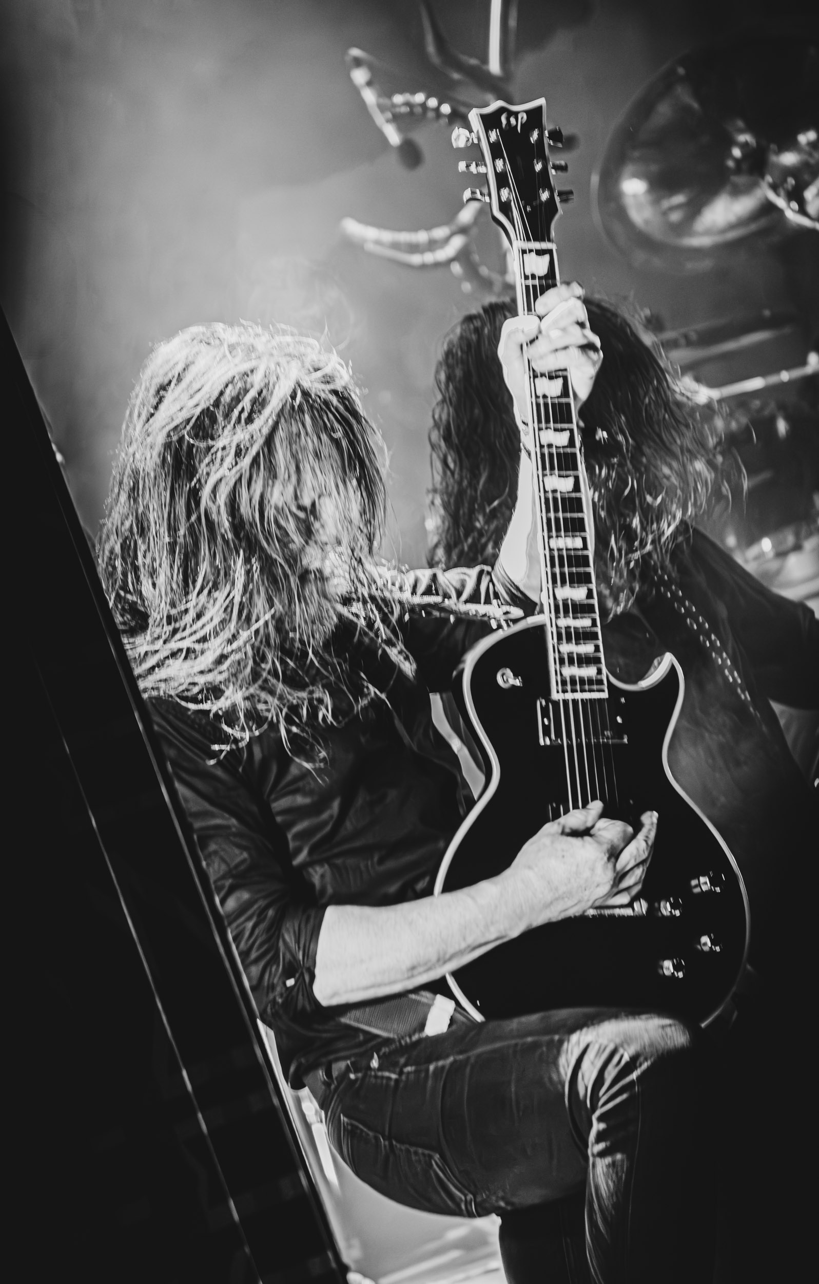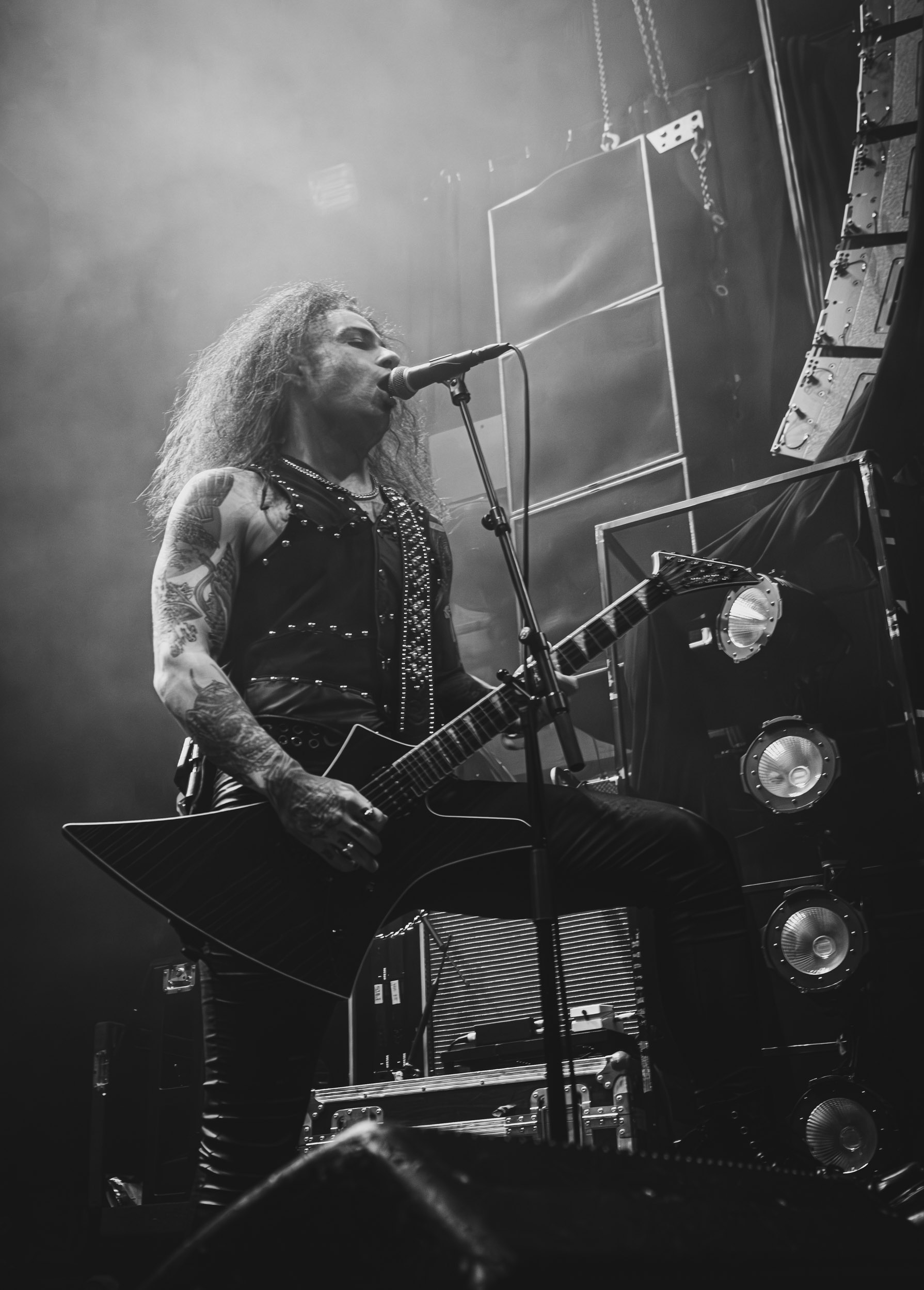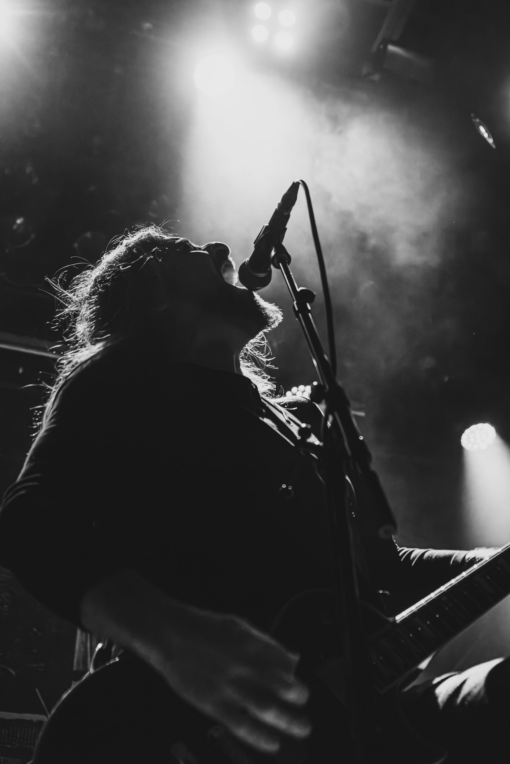 Satyricon : Deuxième représentant de la Unholy Trinity et non des moindres, c’est face à un public au taquet que Satyricon fait son entrée sur la scène Rockefeller. Now, Diabolical, classique parmi les classiques, accompagne mon passage dans le pit photo ; Our World, It Rumbles Tonight et Black Crow on a Tombstone, mon tour d’horizon des différents « spots photographiques » de la salle. Après cette entrée en matière, Satyr prend la parole pour raconter, en norvégien puis en anglais, ses souvenirs de jeunesse liés à cette salle, Rockefeller, où il a assisté à des concerts de Slayer et de Judas Priest, qu’il qualifie de « temple du heavy metal du pays ». Les termes ne pouvaient être mieux choisis, tant l’endroit est imprégné du genre et de son histoire… Le voyage dans le passé reprend par la suite, groupe et public côte à côte, dont la première étape nous mène en 2017 avec le morceau donnant son titre à l’album Deep Calleth Upon Deep. Les trois titres suivants nous font le plaisir d’un retour dans les années 90 et aux premiers albums du groupe ; d’abord à Dark Medieval Times (1993) avec Walk the Path of Sorrow, puis à Nemesis Divina (1996) et Shadowthrone (1994) avec deux titres dans la langue maternelle des musiciens. Ces derniers, comme les membres de Rotting Christ quelques heures plus tôt, apparaissent sobres dans leurs tenues noires et se donnent à fond dans leur performance. Satyr, de son côté, profite d’un intermède entre deux titres pour dégainer la veste à écussons — sa seule fantaisie vestimentaire — et la troisième guitare, qu’il garde toutes deux le temps de deux morceaux.