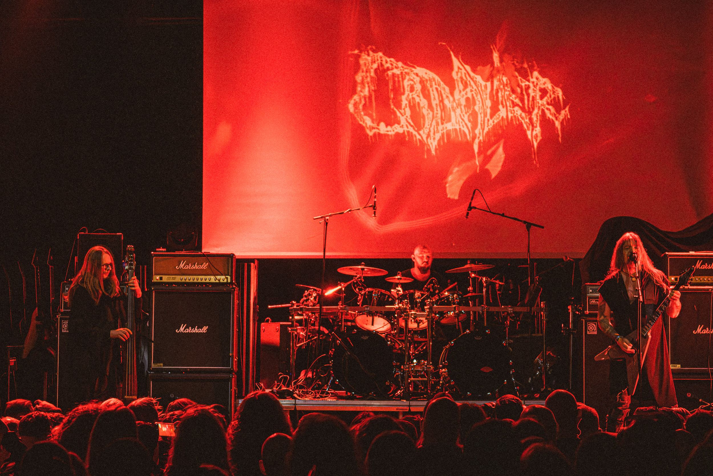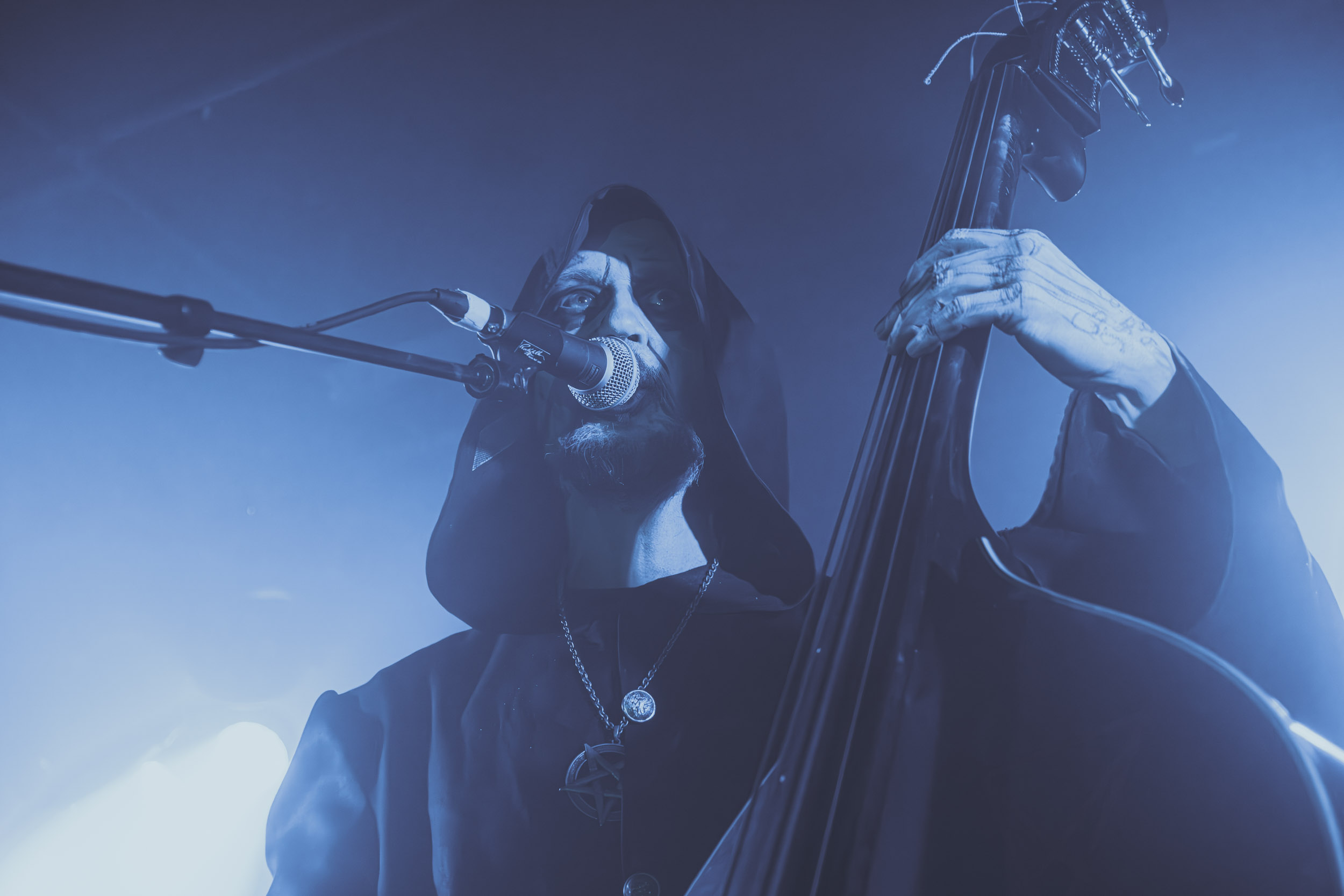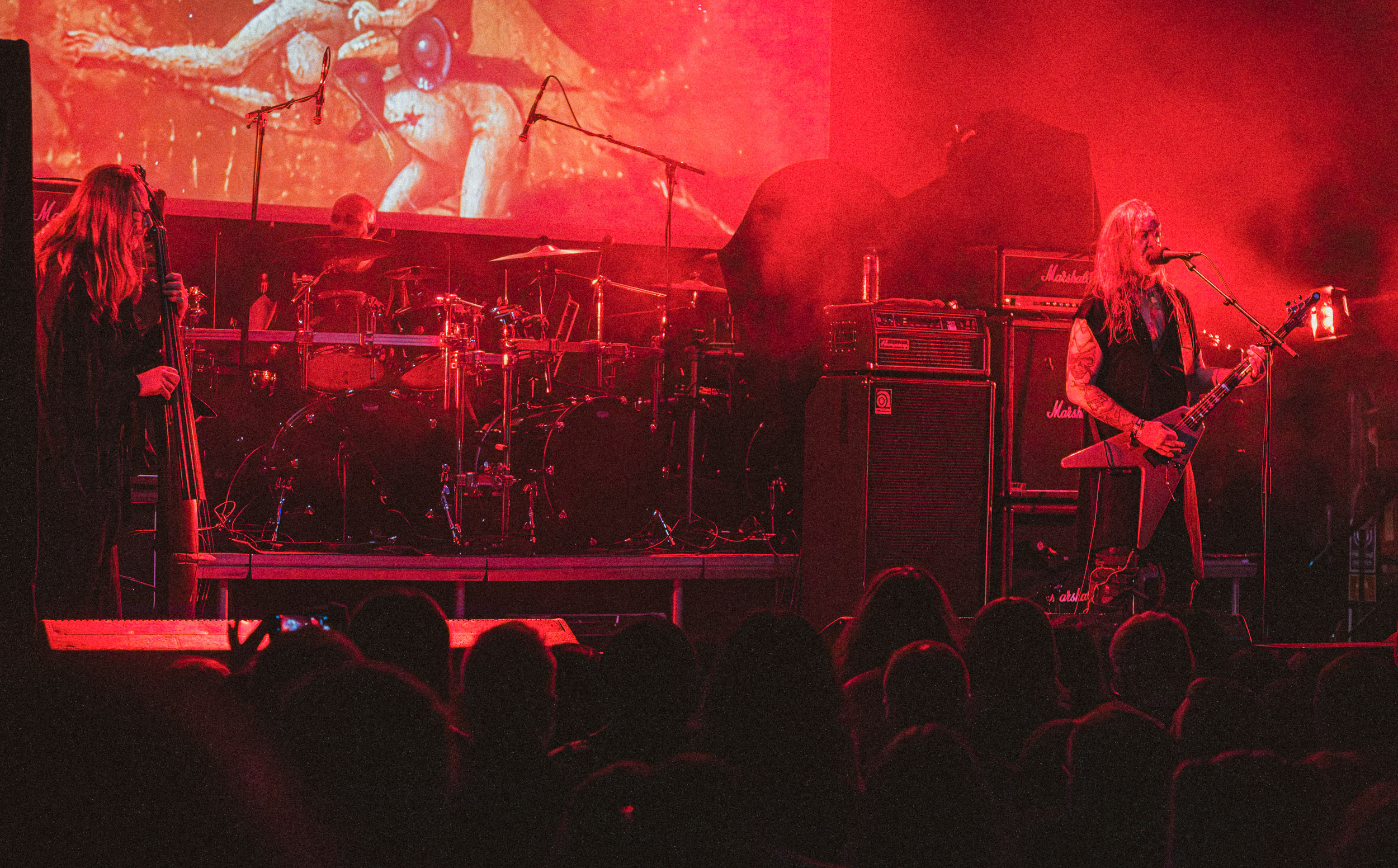 Simple et efficace également que la configuration « power trio » que prend Cadaver, son fondateur étant ce soir accompagné des deux gars sûrs que sont le contrebassiste Eilert Solstad et Bjørn Dugstad Rønnow, que nous avons vu sur cette même scène en 2024 à son poste de batteur de Borknagar. Du haut de ses 34 ans, il est le plus jeune des trois, ce qui lui vaut une petite taquinerie de la part d’Anders Odden comme quoi « « il a le même âge qu’Innominate », joué juste après. Tout au long du set, Neddo prend le temps d’échanger avec son public, tantôt avec humour (demandant en anglais combien de gens n’ont pas compris ce qu’il vient de dire juste avant en norvégien), tantôt avec sérieux, notamment lorsqu’il évoque le souvenir de Jan-Martin Jansen, décédé des suites d’un cancer ; un sujet qui le tient particulièrement à cœur, ayant lui-même survécu à cette maladie, comme il le rappelle l’émotion dans la voix. « Ça tombe bien, le prochain morceau parle de buter le cancer ! » ; il s’agit de Mr Tumor’s Misery. Enfin, le dernier titre, et le groupe avec, encourage les gens à « don’t give a fuck », ou D.G.A.F pour les non-initiés, extrait de l’EP du même titre ! Au final, à l’image du Black Metal Tour Bus, Anders Odden et Cadaver renvoient l’image d’un groupe et de musiciens accessibles avec qui l’on passe de bons moments, sur scène comme en dehors et, pour cela, je les salue bien bas. [Ségolène]